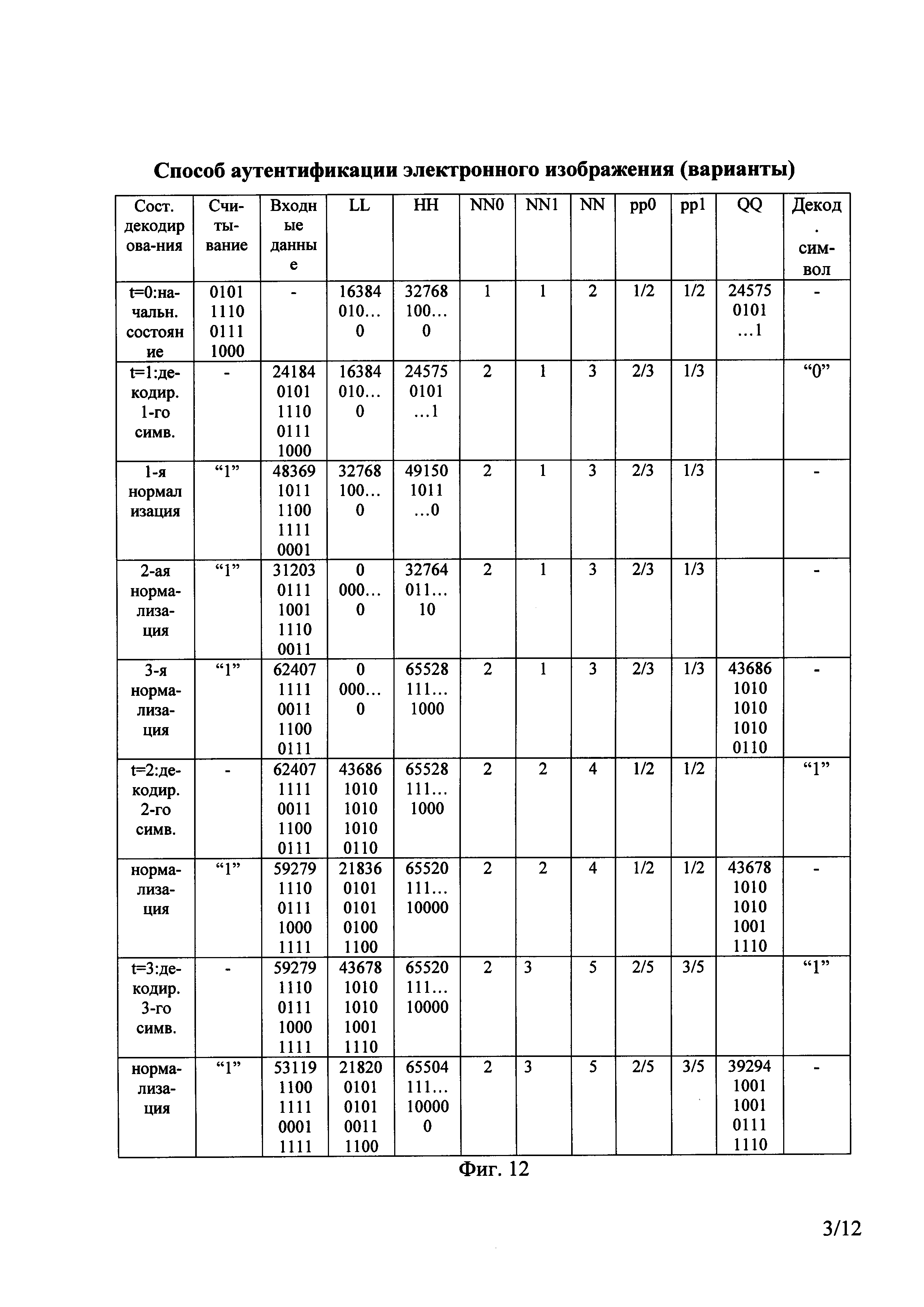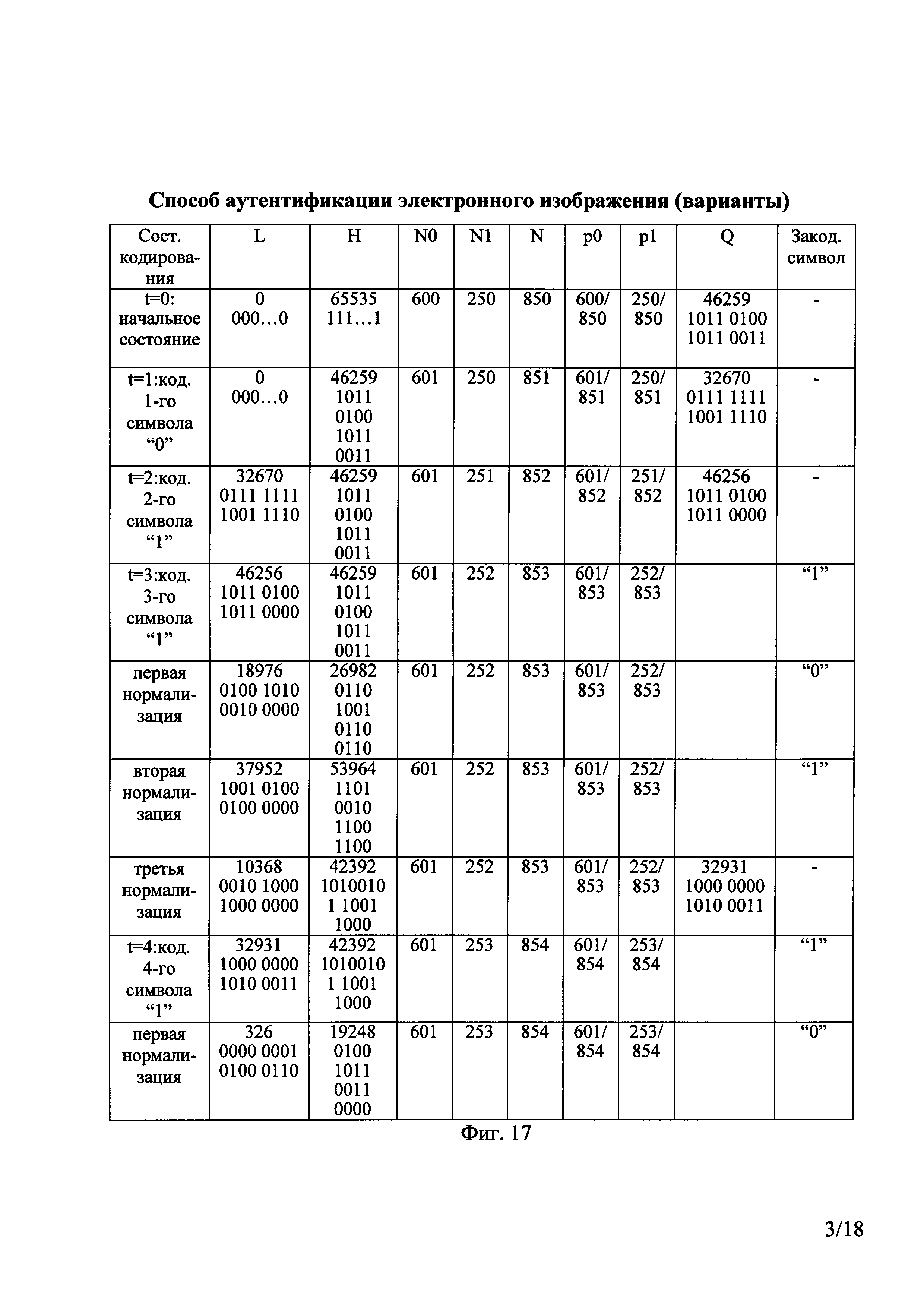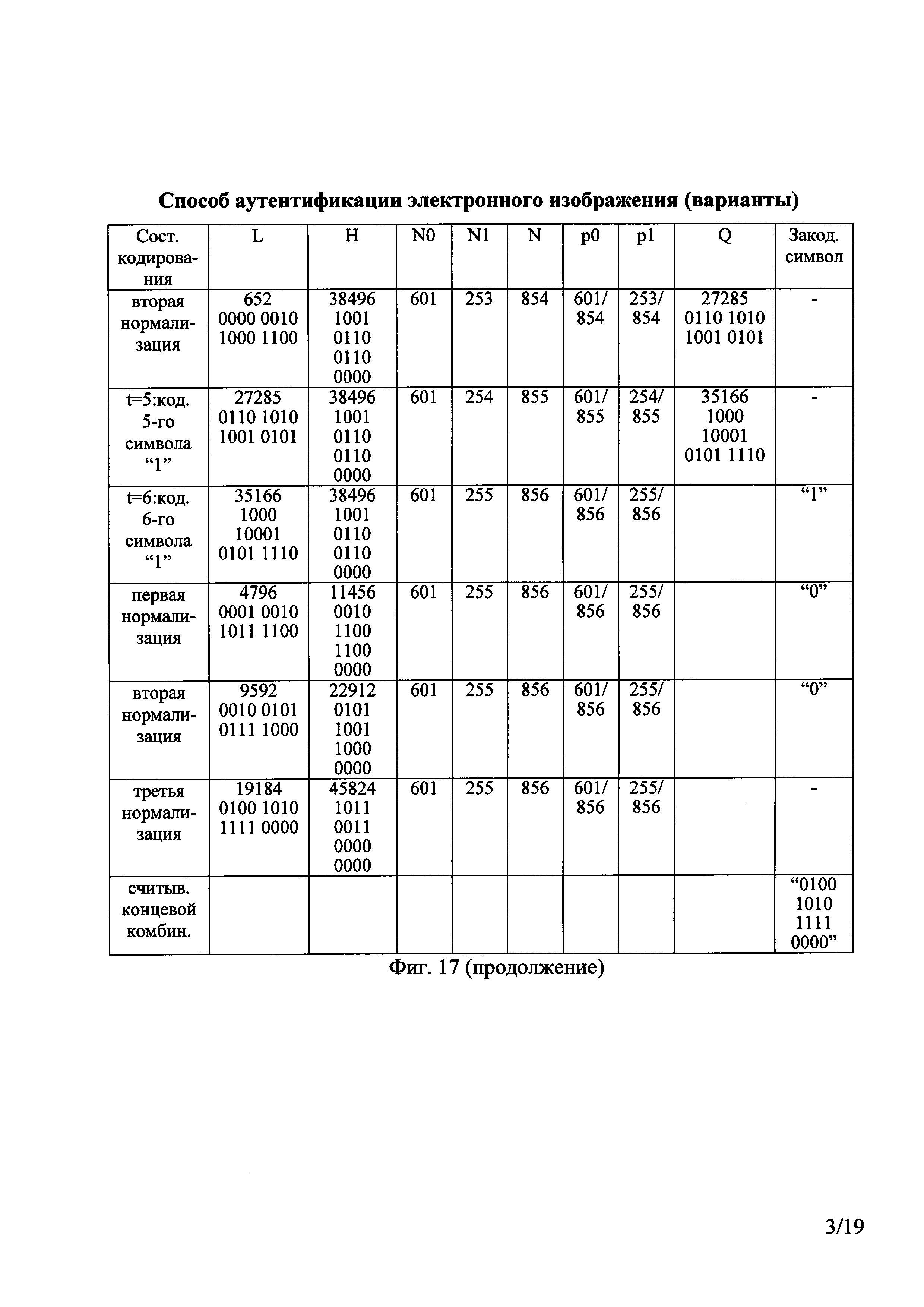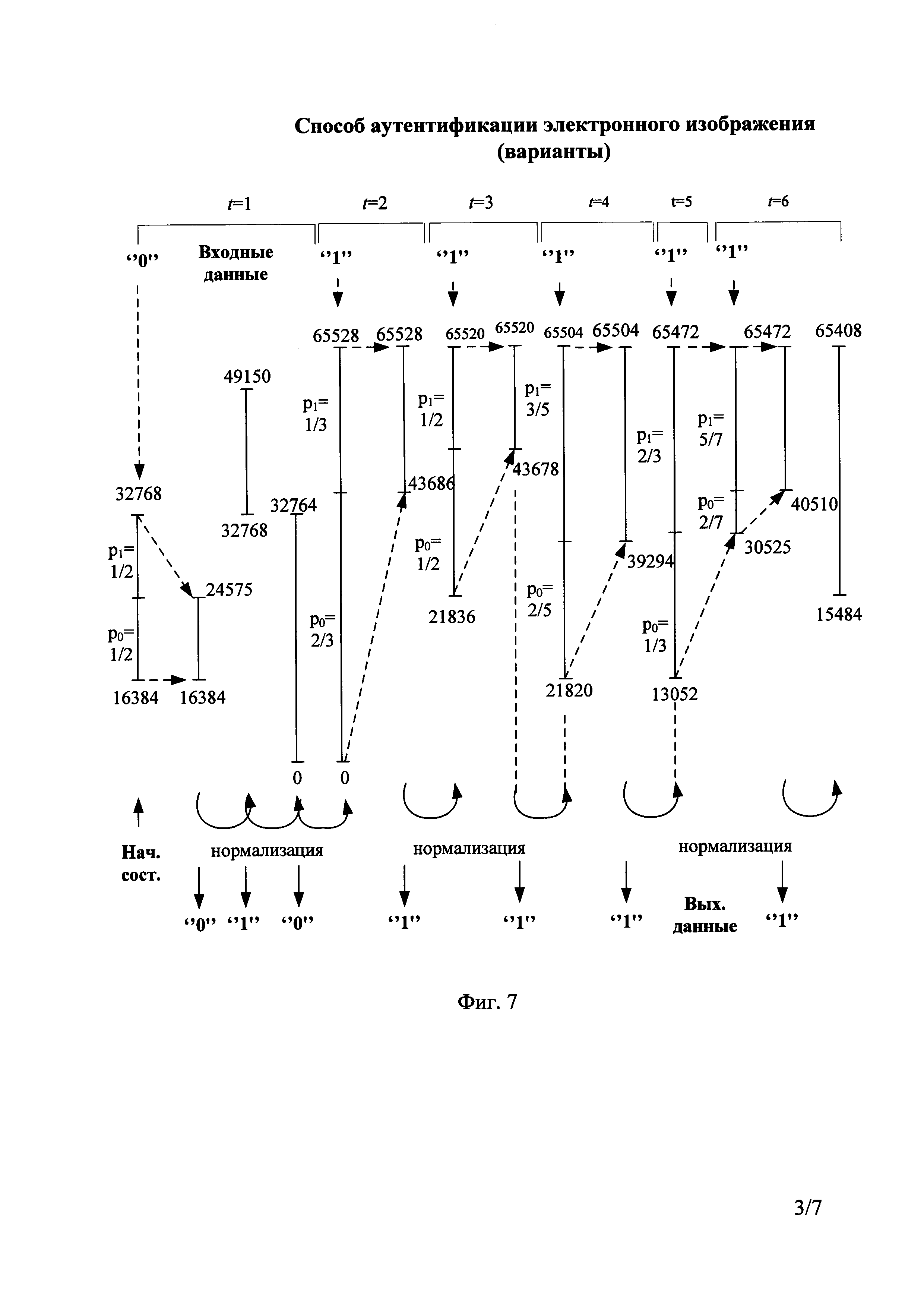 Заявленные технические решения объединены единым изобретательским замыслом и относятся к области электросвязи и информационных технологий, а именно к технике защиты подлинности электронных изображений (ЭИ), сжимаемых алгоритмами сжатия ЭИ, такими как JPEG2000, Н.264 и т.п., передаваемых отправителем получателю по общедоступным каналам передачи, в которых нарушитель может осуществлять действия по навязыванию получателю неподлинных ЭИ. Заявленные объекты изобретения могут быть использованы для обеспечения подлинности ЭИ, передаваемых в современных информационно-телекоммуникационных системах. Известны способы аутентификации ЭИ на основе вычисления отправителем и проверки получателем имитовставки двоичной последовательности (ДП) этого изображения. Эти способы относятся к криптографическим способам контроля подлинности ЭИ и описаны, например, в государственном стандарте 28147-89. Системы обработки информации. Защита криптографическая. Алгоритм криптографического преобразования. - М.: Госстандарт СССР. 1989, стр. 9-14. В данных способах ЭИ сжимают в соответствии с алгоритмом JPEG2000, предписанным международным стандартом ISO/IES 15444. Двоичную последовательность сжатого электронного изображения JPEG разделяют у отправителя на последовательные блоки длиной n бит, где обычно n=64. По криптографической функции формирования имитовставки с использованием заранее сформированной для отправителя и получателя двоичной последовательности (ДП) секретного ключа (СК) последовательно от каждого блока с учетом предыдущего зашифрованного блока формируют зашифрованный текущий блок до тех пор, пока поступает ДП ЭИ. Из последнего зашифрованного блока выделяют ДП имитовставки ЭИ длиной l<n бит.Затем ДП ЭИ и ДП имитовставки передают по каналу связи или записывают на электронные носители, например, CD или DVD диски. Принятое получателем ЭИ проверяют, для чего заново разделяют его ДП на последовательные принятые блоки длиной n бит, по криптографической функции формирования имитовставки с использованием ДПСК последовательно от каждого принятого блока с учетом предыдущего зашифрованного принятого блока формируют очередной зашифрованный принятый блок до тех пор, пока поступает ДП принятого ЭИ. Из последнего зашифрованного принятого блока выделяют длиной l<n бит ДП имитовставки принятого ЭИ и при полном совпадении заново сформированной и принятой имитовставок принятое ЭИ считают подлинным. Недостатками указанных аналогов являются: - невозможность проверки подлинности части аутентифицированного с использованием имитовставки ЭИ; - уменьшение пропускной способности каналов передачи или необходимость использования запоминающих устройств большой емкости из-за включения и последующей передачи по каналу связи имитовставки электронного изображения. Известны также способы аутентификации ЭИ на основе вычисления и встраивания цифровых водяных знаков (ЦВЗ) в электронное изображение. Эти способы относятся к стеганографическим способам контроля подлинности ЭИ и описаны, например, в способе аутентификации ЭИ по патенту США 7313696 МПК H04L 9/00 (2006.01) от 25.12.07. Данный способ аутентификации ЭИ заключается в предварительном формировании для отправителя и получателя ДП СК, криптографической функции хэширования и криптографической функции шифрования. У отправител