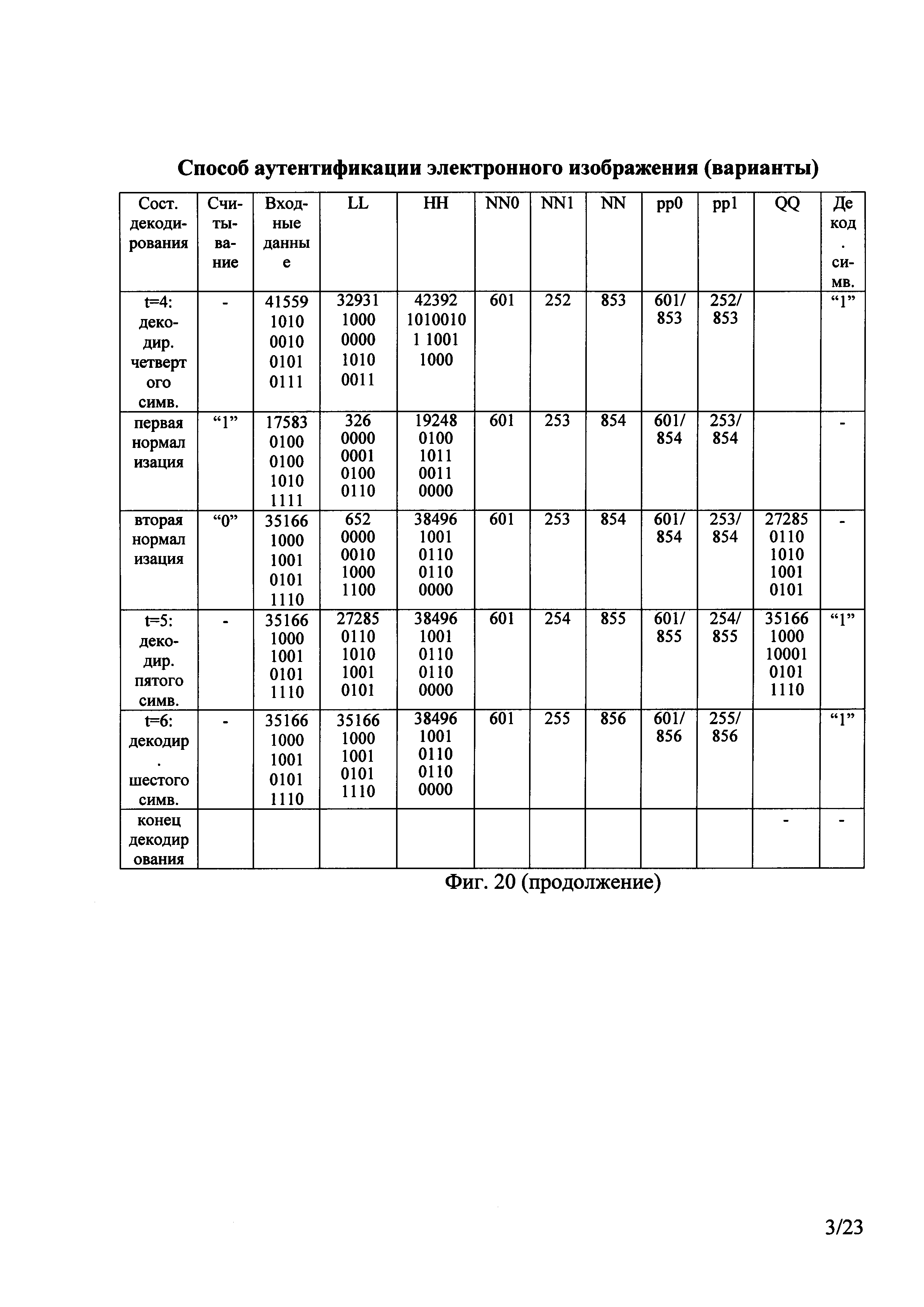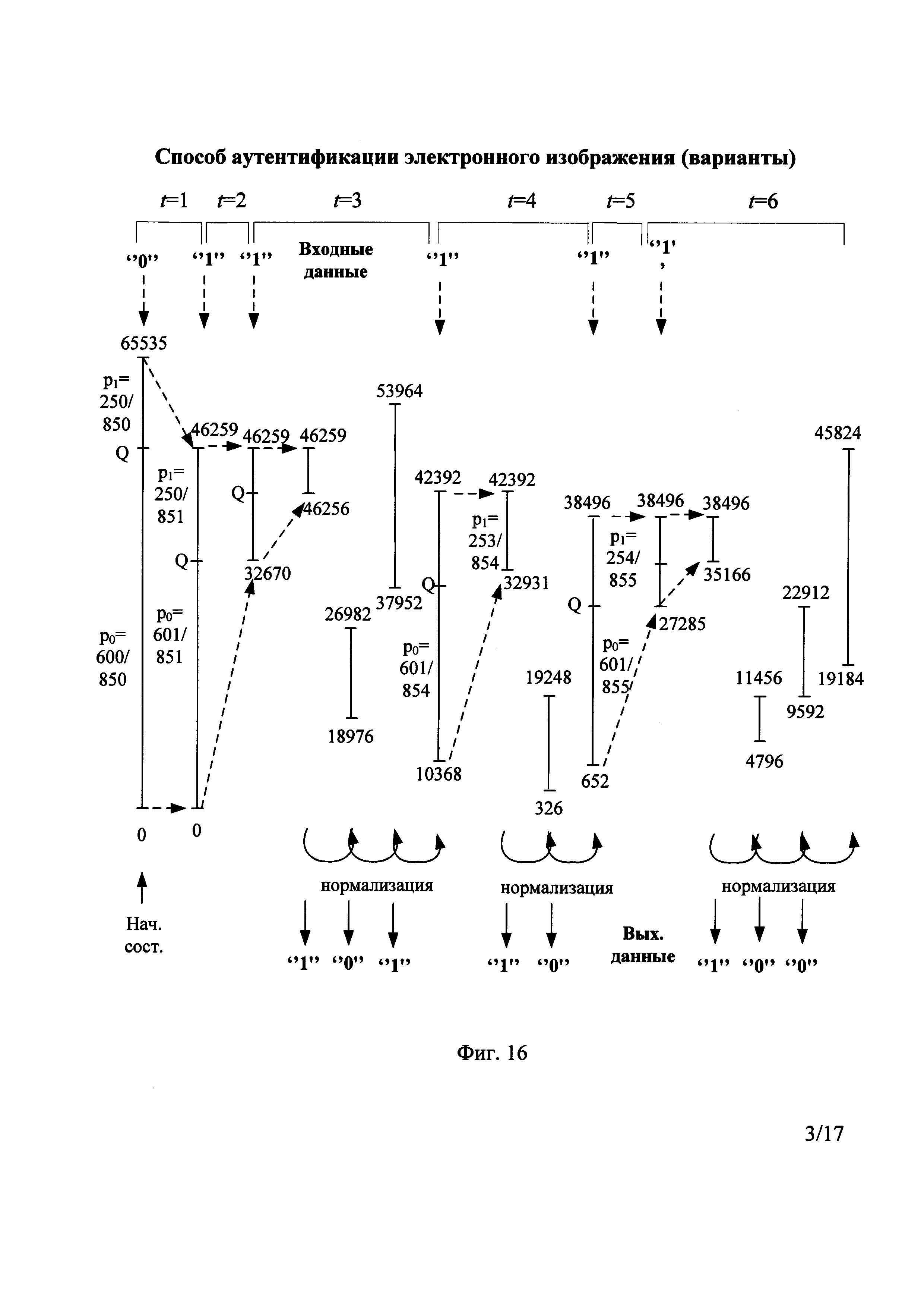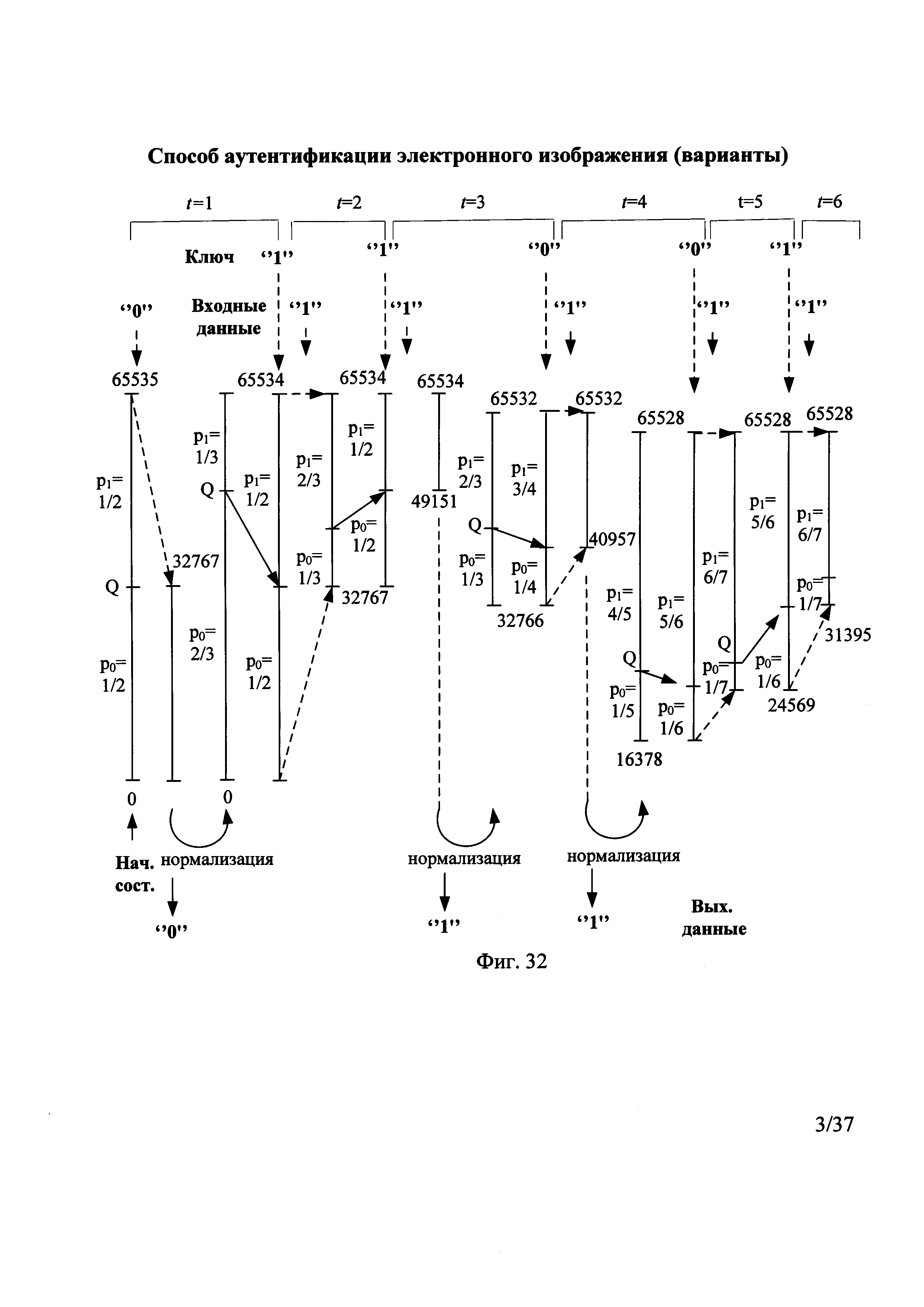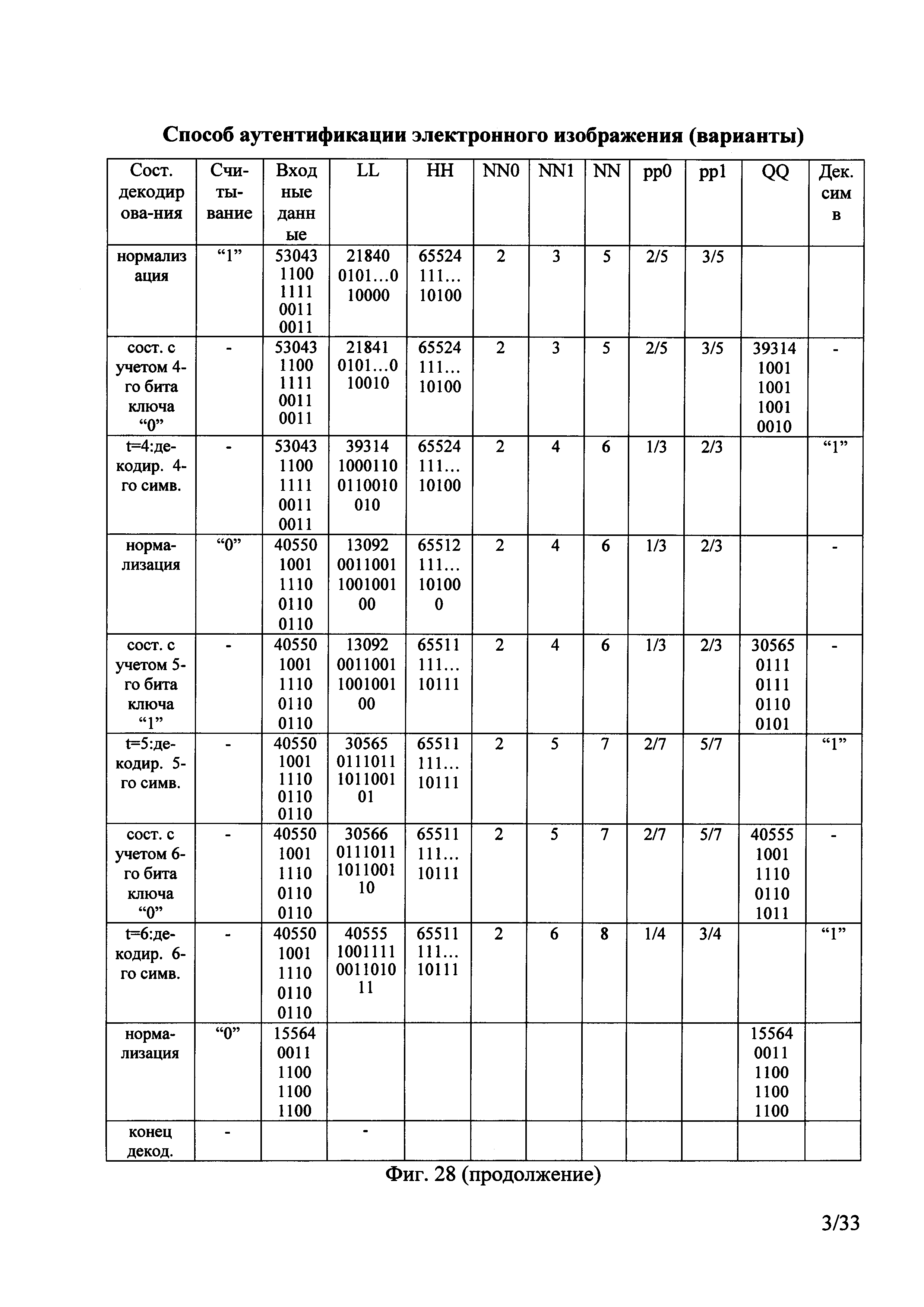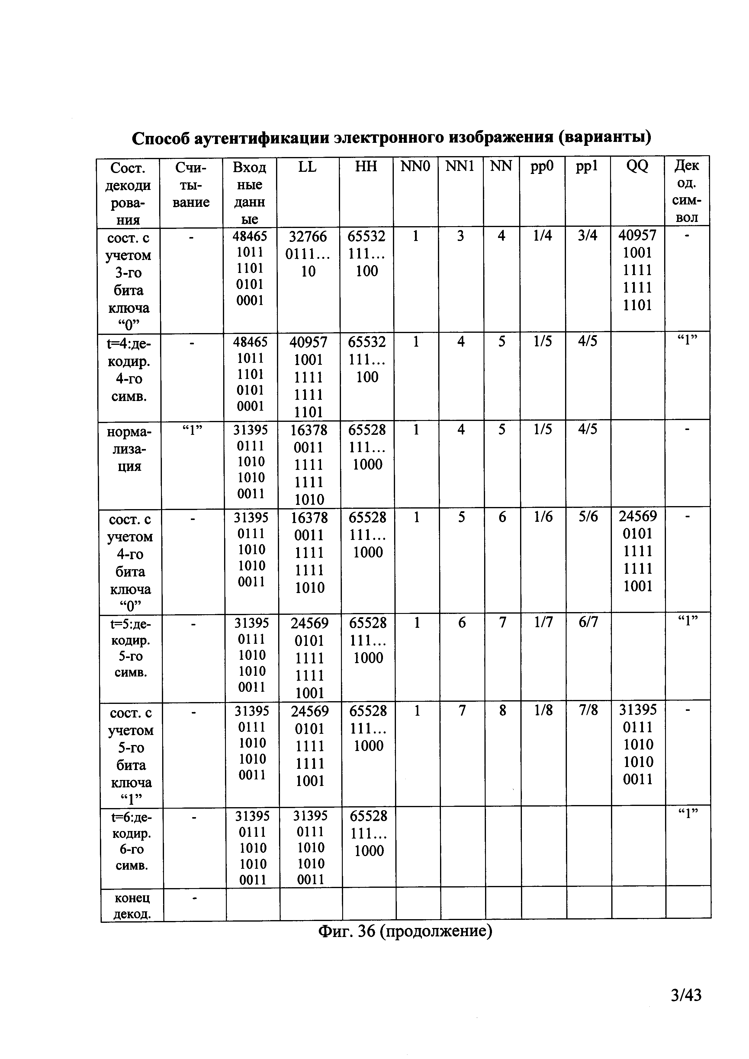 Заявленные технические решения объединены единым изобретательским замыслом и относятся к области электросвязи и информационных технологий, а именно к технике защиты подлинности электронных изображений (ЭИ), сжимаемых алгоритмами сжатия ЭИ, такими как JPEG2000, Н.264 и т.п., передаваемых отправителем получателю по общедоступным каналам передачи, в которых нарушитель может осуществлять действия по навязыванию получателю неподлинных ЭИ. Заявленные объекты изобретения могут быть использованы для обеспечения подлинности ЭИ, передаваемых в современных информационно-телекоммуникационных системах. Известны способы аутентификации ЭИ на основе вычисления отправителем и проверки получателем имитовставки двоичной последовательности (ДП) этого изображения. Эти способы относятся к криптографическим способам контроля подлинности ЭИ и описаны, например, в государственном стандарте 28147-89. Системы обработки информации. Защита криптографическая. Алгоритм криптографического преобразования. - М.: Госстандарт СССР. 1989, стр. 9-14. В данных способах ЭИ сжимают в соответствии с алгоритмом JPEG2000, предписанным международным стандартом ISO/IES 15444. Двоичную последовательность сжатого электронного изображения JPEG разделяют у отправителя на последовательные блоки длиной n бит, где обычно n=64. По криптографической функции формирования имитовставки с использованием заранее сформированной для отправителя и получателя двоичной последовательности (ДП) секретного ключа (СК) последовательно от каждого блока с учетом предыдущего зашифрованного блока формируют зашифрованный текущий блок до тех пор, пока поступает ДП ЭИ. Из последнего зашифрованного блока выделяют ДП имитовставки ЭИ длиной l<n бит.Затем ДП ЭИ и ДП имитовставки передают по каналу связи или записывают на электронные носители, например, CD или DVD диски. Принятое получателем ЭИ проверяют, для чего заново разделяют его ДП на последовательные принятые блоки длиной n бит, по криптографической функции формирования имитовставки с использованием ДПСК последовательно от каждого принятого блока с учетом предыдущего зашифрованного принятого блока формируют очередной зашифрованный принятый блок до тех пор, пока поступает ДП принятого ЭИ. Из последнего зашифрованного принятого блока выделяют длиной l<n бит ДП имитовставки принятого ЭИ и при полном совпадении заново сформированной и принятой имитовставок принятое ЭИ считают подлинным. Недостатками указанных аналогов являются: - невозможность проверки подлинности части аутентифицированного с использованием имитовставки ЭИ; - уменьшение пропускной способности каналов передачи или необходимость использования запоминающих устройств большой емкости из-за включения и последующей передачи по каналу связи имитовставки электронного изображения. Известны также способы аутентификации ЭИ на основе вычисления и встраивания цифровых водяных знаков (ЦВЗ) в электронное изображение. Эти способы относятся к стеганографическим способам контроля подлинности ЭИ и описаны, например, в способе аутентификации ЭИ по патенту США 7313696 МПК H04L 9/00 (2006.01) от 25.12.07. Данный способ аутентификации ЭИ заключается в предварительном формировании для отправителя и получателя ДП СК, криптографической функции хэширования и криптографической функции шифрования. У отправител