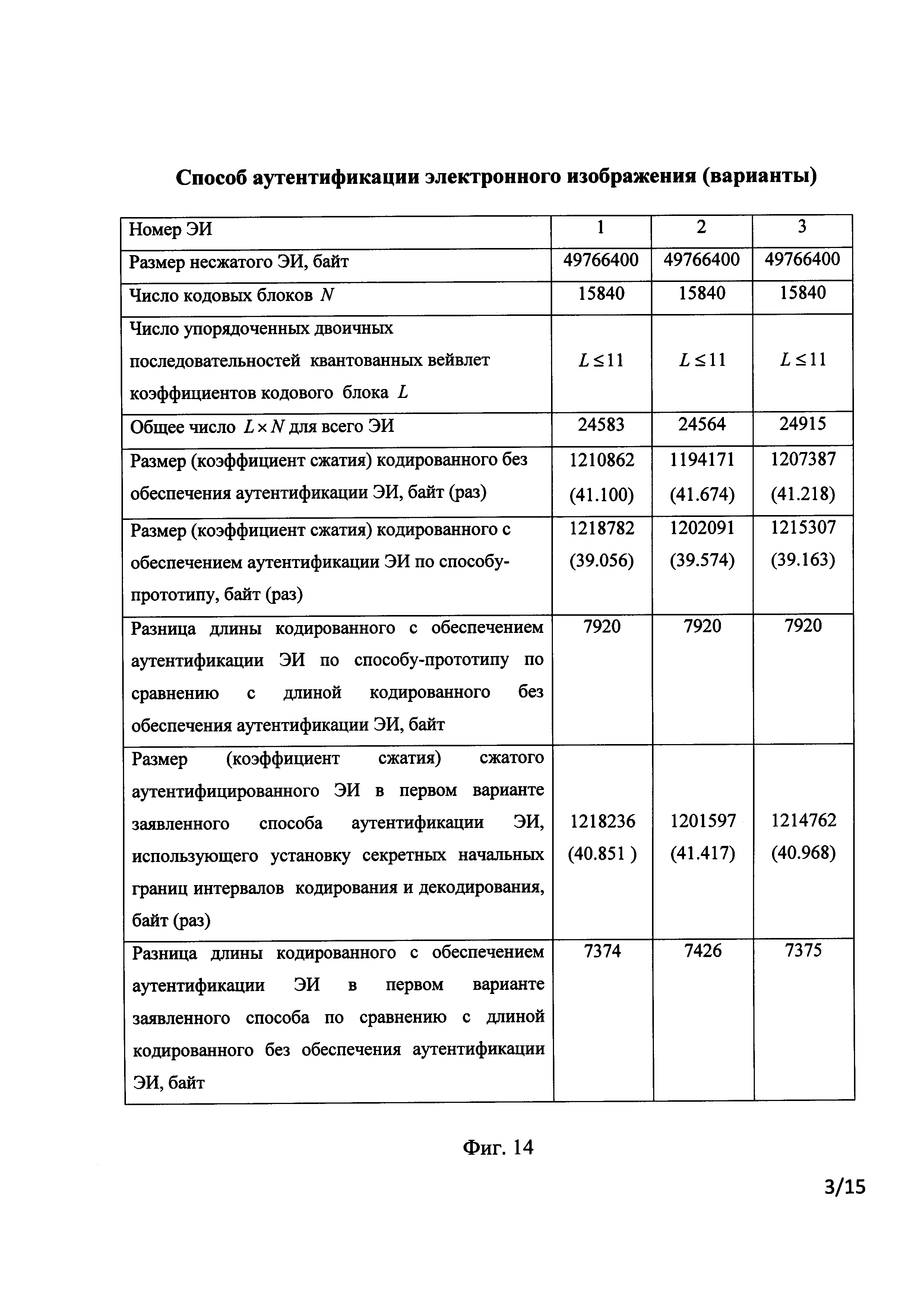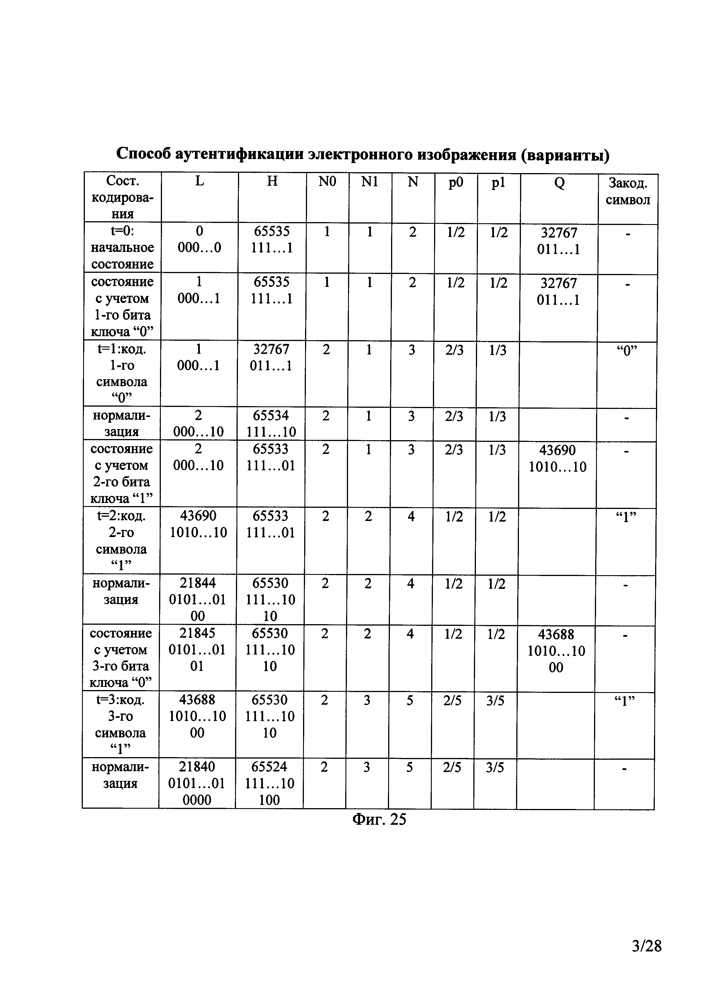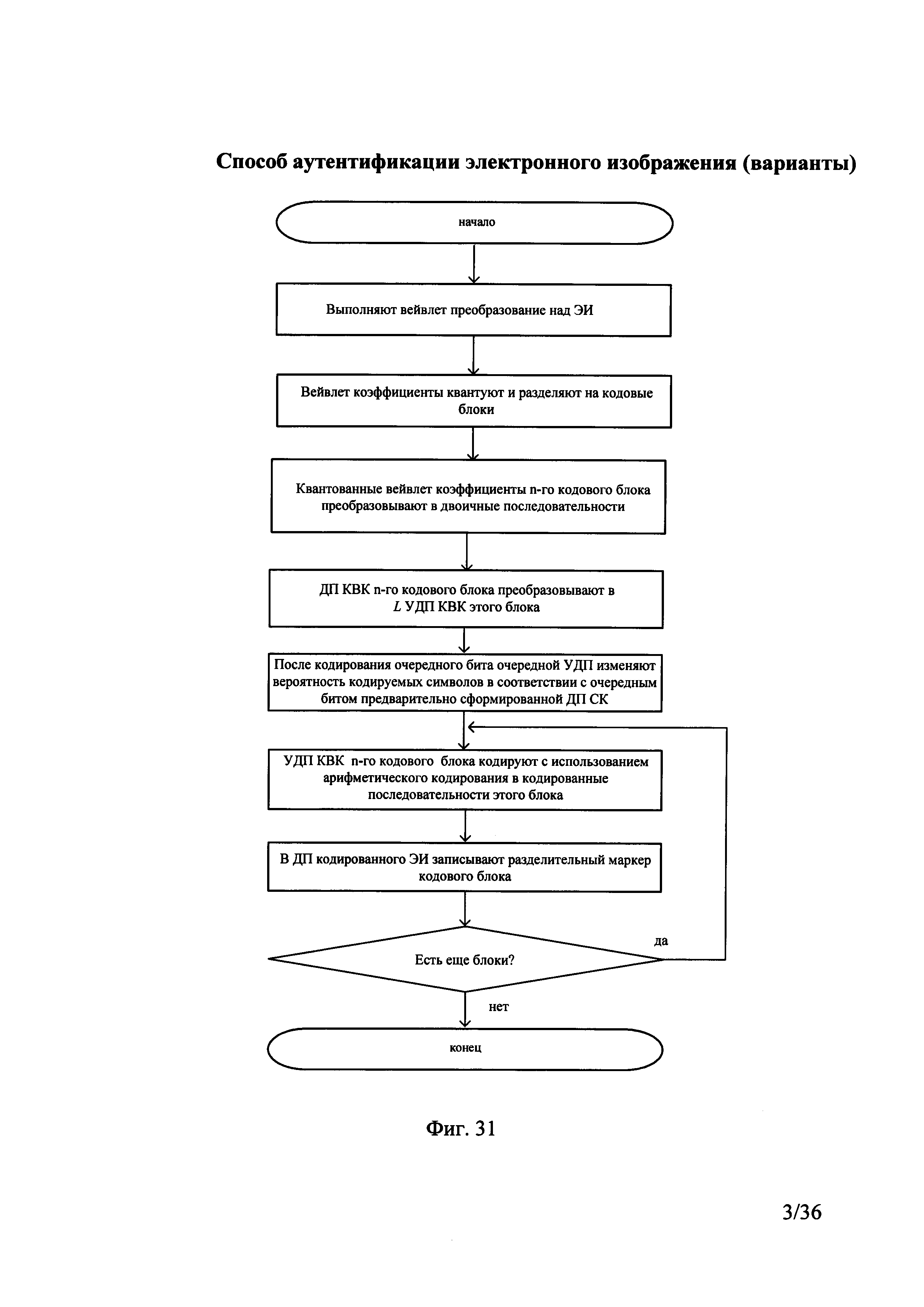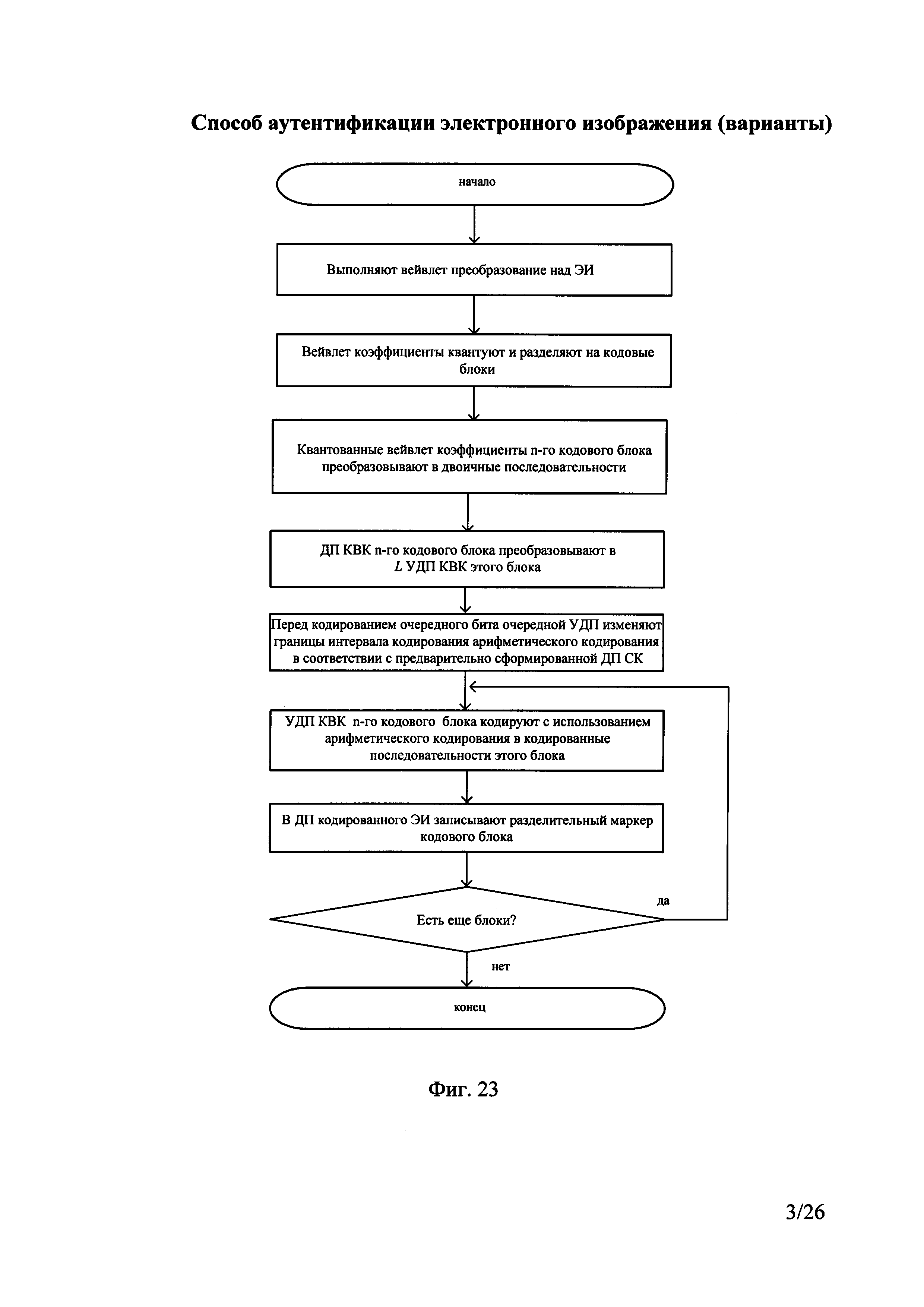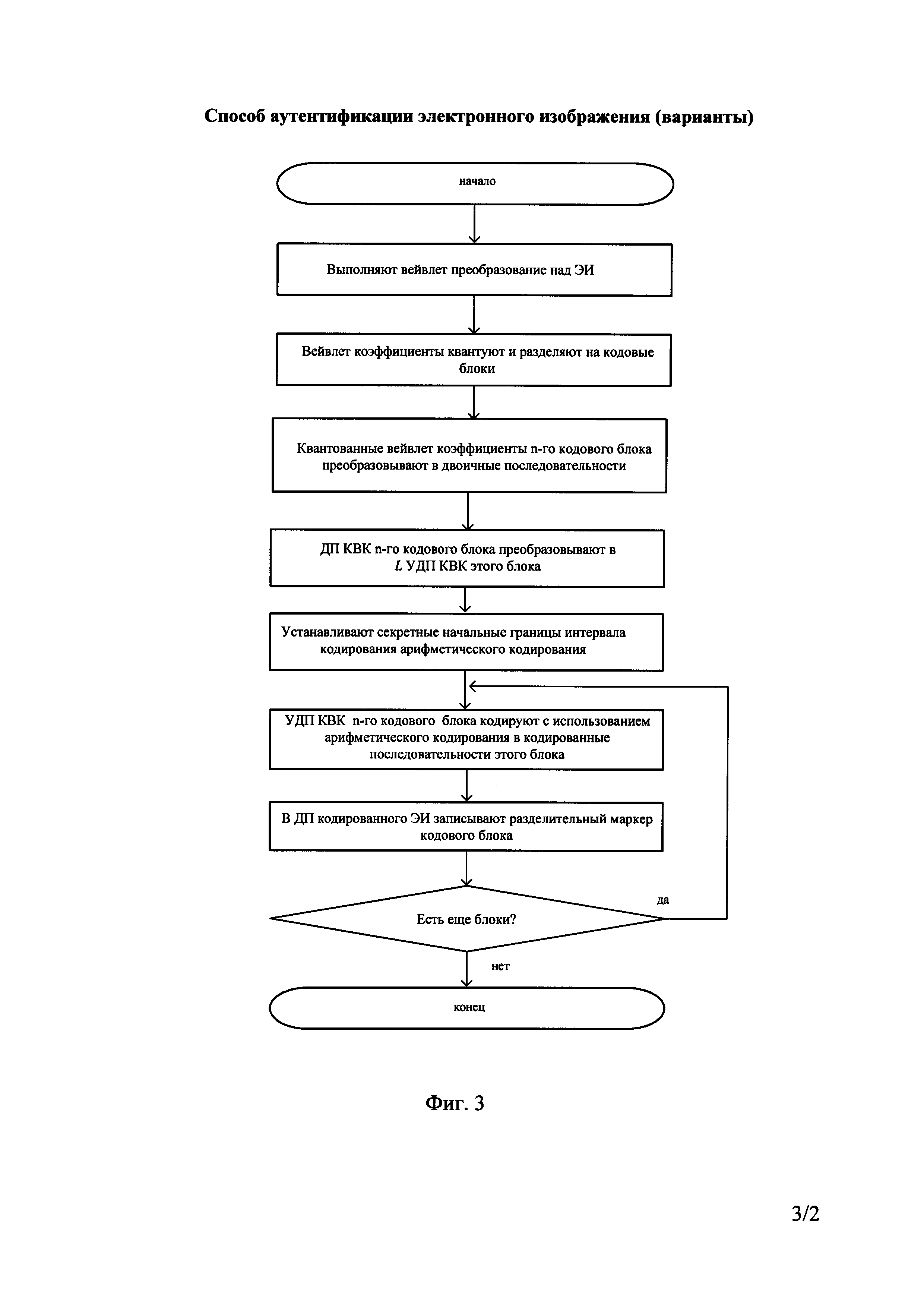 1. Способ аутентификации электронного изображения, заключающийся в том, что предварительно для отправителя и получателя формируют двоичную последовательность секретного ключа, у отправителя над электронным изображением выполняют вейвлет преобразование, полученные в результате преобразования вейвлет коэффициенты квантуют и разделяют на N≥2 кодовых блоков квантованных вейвлет коэффициентов каждый размером n1×n2 коэффициентов, где n1≥2 и n2≥2, квантованные вейвлет коэффициенты n-го, где n=1, 2, …, N, кодового блока квантованных вейвлет коэффициентов преобразуют в двоичные последовательности квантованных вейвлет коэффициентов n-го кодового блока, которые преобразуют в L≥2 упорядоченные двоичные последовательности квантованных вейвлет коэффициентов n-го кодового блока, упорядоченные двоичные последовательности квантованных вейвлет коэффициентов n-го кодового блока кодируют с использованием арифметического кодирования в кодированные последовательности этого блока, по окончании арифметического кодирования упорядоченных двоичных последовательностей квантованных вейвлет коэффициентов n-го кодового блока в двоичную последовательность кодированного электронного изображения записывают разделительный маркер кодового блока, причем действия по аутентификации у отправителя кодовых блоков повторяют до завершения их поступления, передают кодированное электронного изображения получателю, где проверяют подлинность принятого получателем электронного изображения, для чего разделяют двоичную последовательность принятого получателем электронного изображения на двоичные последовательности его принятых блоков с использованием разделительного маркера каждого кодового блока, которые разделяют на кодированные последовательности n-го принятого кодового блока, декодируют кодированные последовательности n-го принятого кодового блока с использованием арифметического декодирования в L упорядоченных двоичных последовательностей квантованных вейвлет коэффициентов n-го принятого кодового блока, повторяют действия по проверке подлинности принятых кодовых блоков до завершения их приема, принятое электронное изображение считают подлинным, если подлинными оказываются N принятых кодовых блоков, отличающийся тем, что предварительно для отправителя и получателя вычисляют длину упорядоченной двоичной последовательности квантованных вейвлет коэффициентов кодового блока, у отправителя перед кодированием упорядоченных двоичных последовательностей квантованных вейвлет коэффициентов n-го кодового блока с использованием арифметического кодирования устанавливают секретные начальные границы интервала кодирования арифметического кодирования в соответствии с предварительно сформированной двоичной последовательностью секретного ключа, у получателя перед декодированием кодированных последовательностей n-го принятого кодового блока с использованием арифметического декодирования устанавливают секретные начальные границы интервала декодирования арифметического декодирования в соответствии с предварительно сформированной двоичной последовательностью секретного ключа, а после декодирования упорядоченных двоичных последовательностей квантованных вейвлет коэффициентов n-го принятого кодового блока подсчи