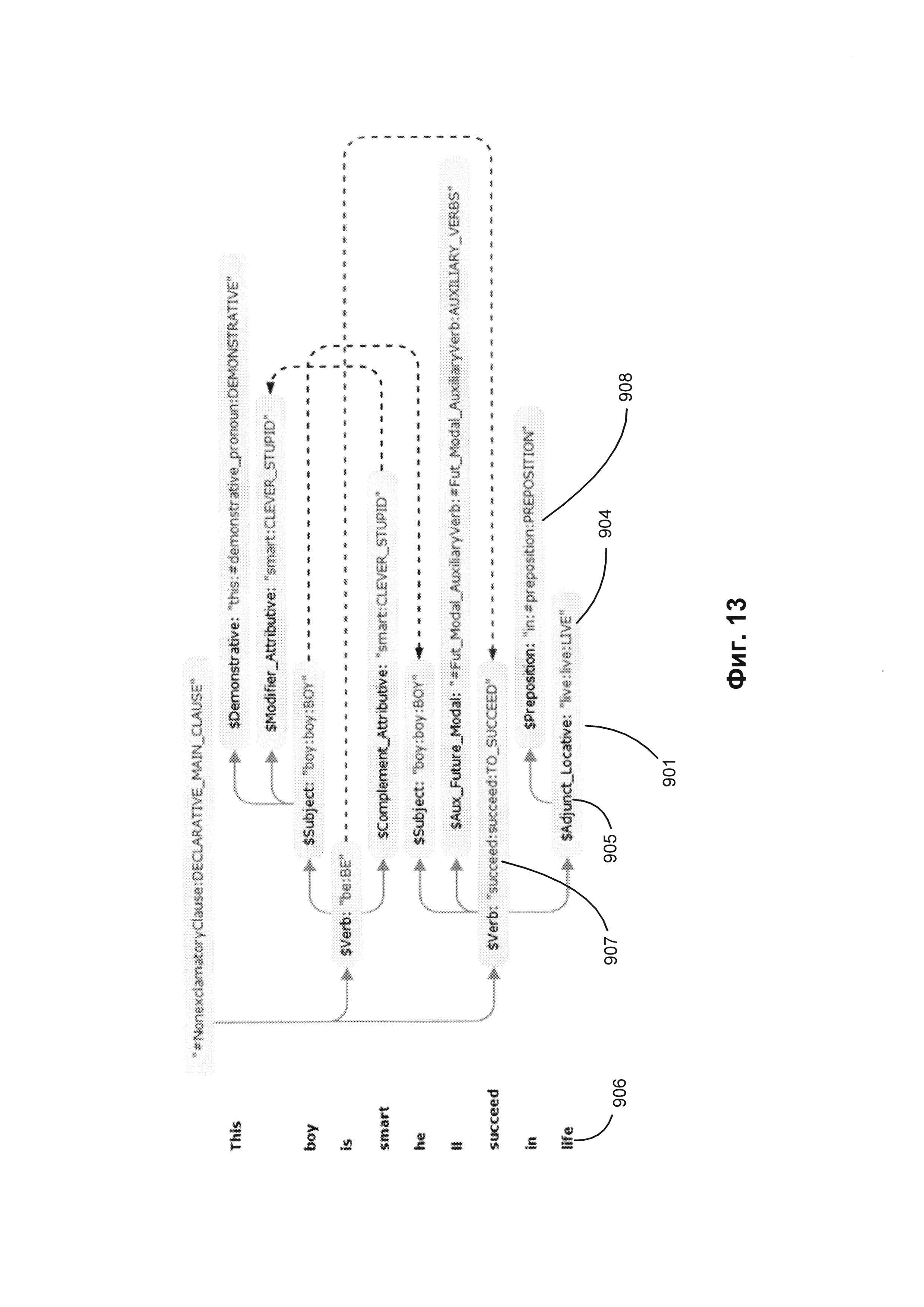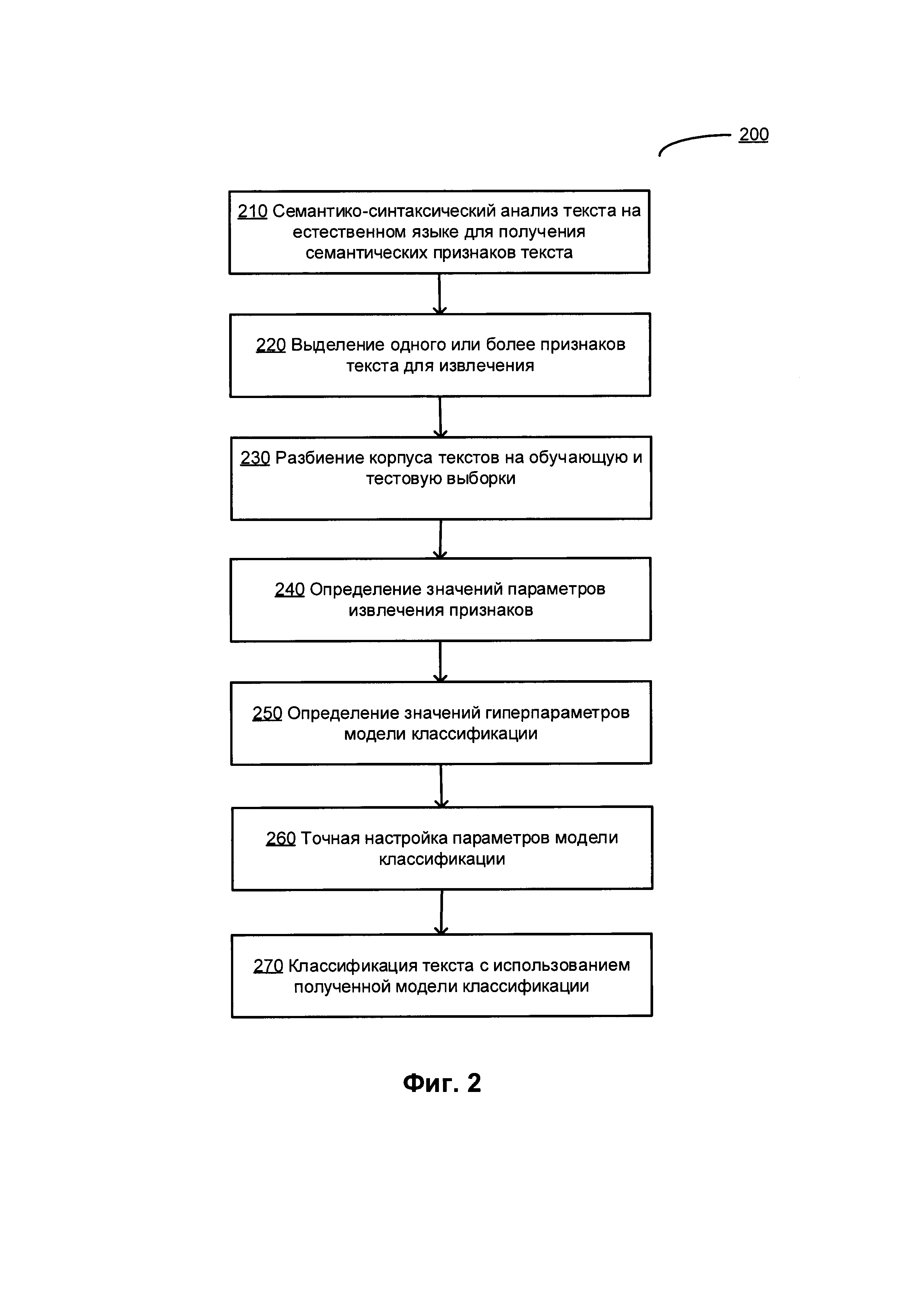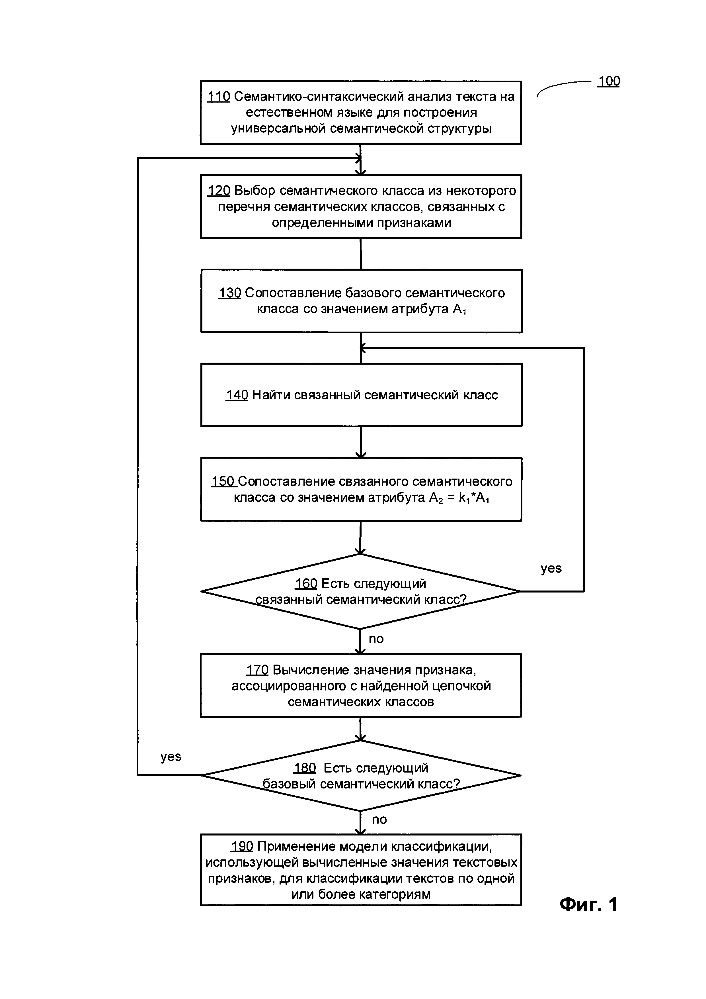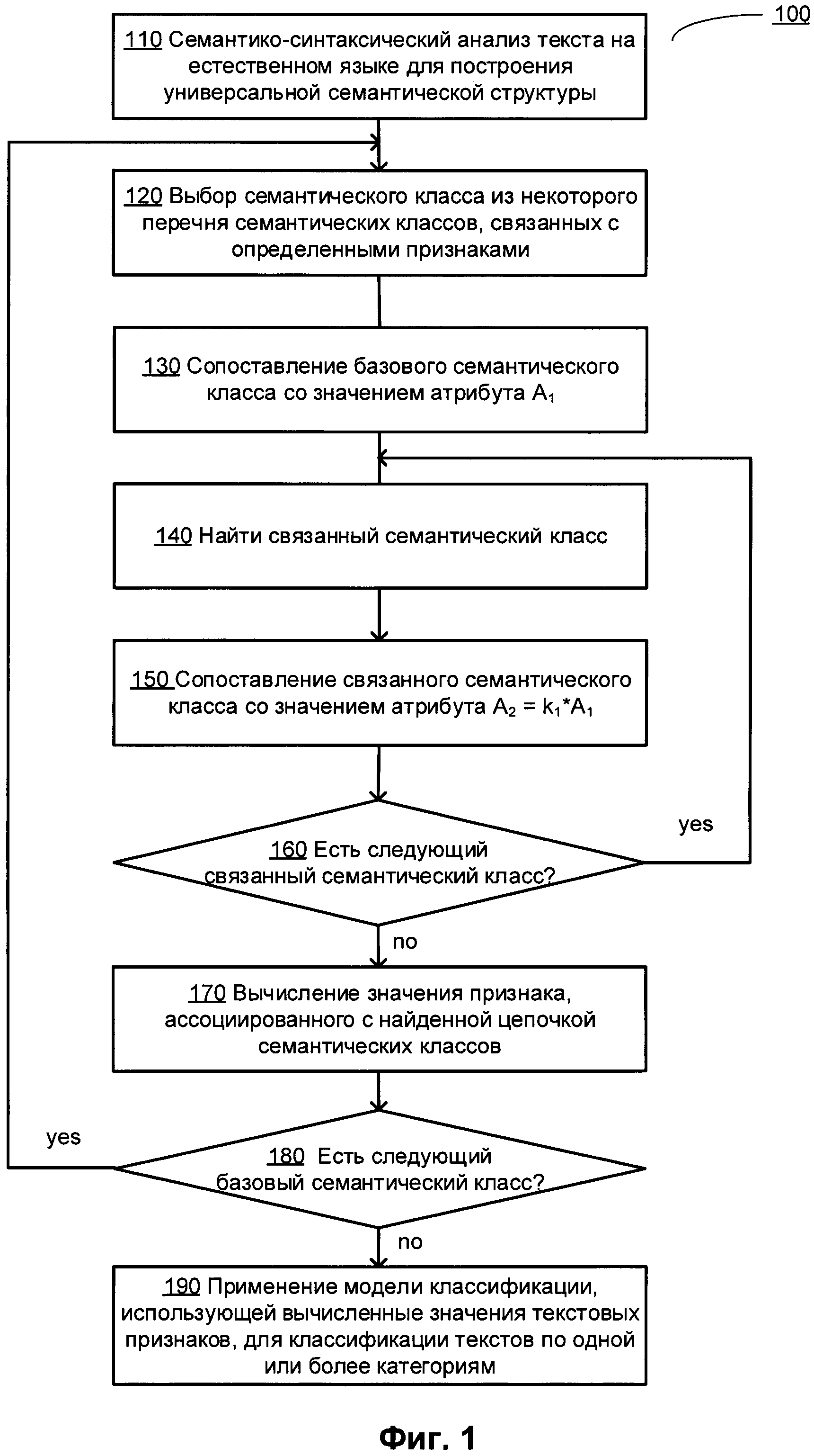 ОБЛАСТЬ ТЕХНИКИ [0001] Настоящее изобретение относится в целом к вычислительным системам, а точнее к системам и способам обработки естественного языка. УРОВЕНЬ ТЕХНИКИ [0002] Различные задачи обработки естественного языка могут включать классификацию текстов на естественном языке. К примерам таких задач относятся выявление семантического сходства, ранжирование результатов поиска, определение авторства текста, фильтрация спама, выбор текстов для контекстной рекламы и т.д. СУЩНОСТЬ ИЗОБРЕТЕНИЯ [0003] В соответствии с одним или более аспектами настоящего изобретения пример способа классификации текстов на естественном языке может включать выполнение с помощью вычислительной системы семантико-синтаксического анализа текста на естественном языке для создания семантической структуры, включающей набор семантических классов; связывание первого семантического класса из набора семантических классов с первым значением, отражающим значение некоторого атрибута семантического класса; выявление второго семантического класса, связанного с первым семантическим классом заданными семантическими отношениями; связывание второго семантического класса со вторым значением, отражающим указанный атрибут семантического класса, при этом второе значение определяется применением заданной трансформации к первому значению; вычисление признака текста на естественном языке на основе первого значения и второго значения; и определение с помощью модели классификатора с помощью вычисленного признака текста степени соотнесения текста на естественном языке с конкретной категорией из заданного набора категорий. [0004] В соответствии с одним или более аспектами настоящего изобретения пример системы классификации текстов на естественном языке может включать память и оперативно связанный с памятью процессор, настроенный на выполнение с помощью вычислительной системы семантико-синтаксического анализа текста на естественном языке для создания семантической структуры, включающей набор семантических классов; связывание первого семантического класса из набора семантических классов с первым значением, отражающим значение некоторого атрибута семантического класса; выявление второго семантического класса, связанного с первым семантическим классом заданными семантическими отношениями; связывание второго семантического класса со вторым значением, отражающим указанный атрибут семантического класса, при этом второе значение определяется применением заданной трансформации к первому значению; вычисление признака текста на естественном языке на основе первого значения и второго значения; и определение с помощью модели классификатора с помощью вычисленного признака текста степени соотнесения текста на естественном языке с конкретной категорией из заданного набора категорий. В соответствии с одним или более аспектами настоящего изобретения пример постоянного машиночитаемого носителя для классификации текстов на естественном языке может содержать исполняемые команды, которые при выполнении их вычислительной системой заставляют эту вычислительную систему выполнять семантико-синтаксического анализ текста на естественном языке для создания семантической структуры, включающей набор семантических классов; связывание первого 