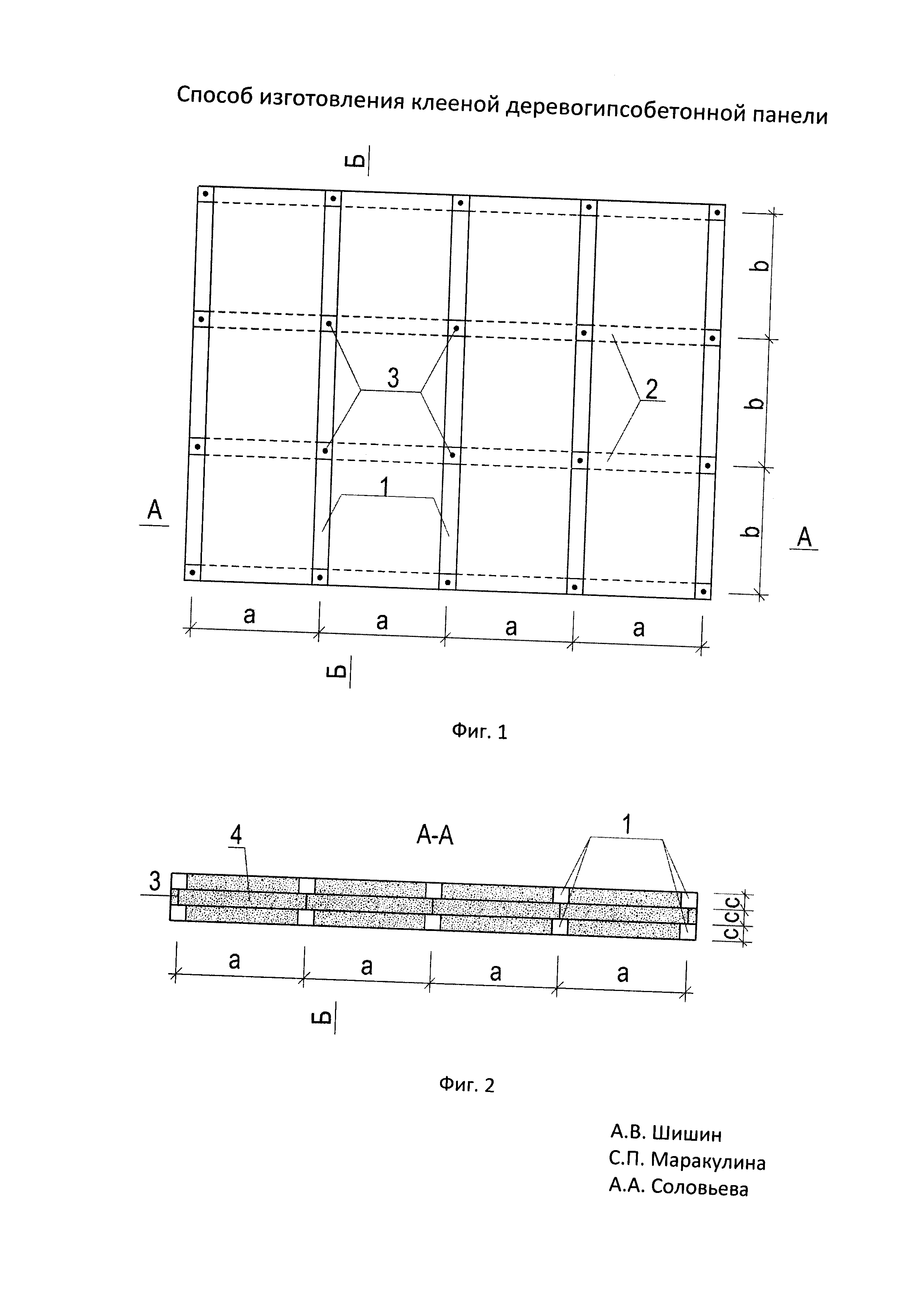 Изобретение относится к области изготовления строительных конструкций дополнительной наружной теплоизоляции стен малоэтажного здания, в частности клееных деревогипсобетонных панелей. Способ изготовления клееной деревогипсобетонной панели включает послойную сборку и склеивание по толщине трехслойной гипсобетонной плиты панели из готовых теплоизоляционных гипсобетонных плит, расположенных в слоях панели рядами между продольными и поперечными брусками каркаса с применением монтажного гипсового клея так, что исходные гипсобетонные плиты среднего слоя трехслойной панели, проходящие между двумя продольными брусками несущих ребер деревянного каркаса и соединенные с ними на клею, после твердения образуют жестко связанные с брусками бетонные прокладки. Технический результат состоит в исключении процесса, ведущего к повышению влажности брусков деревянного каркаса при бетонировании гипсобетонной панели. 3 ил.