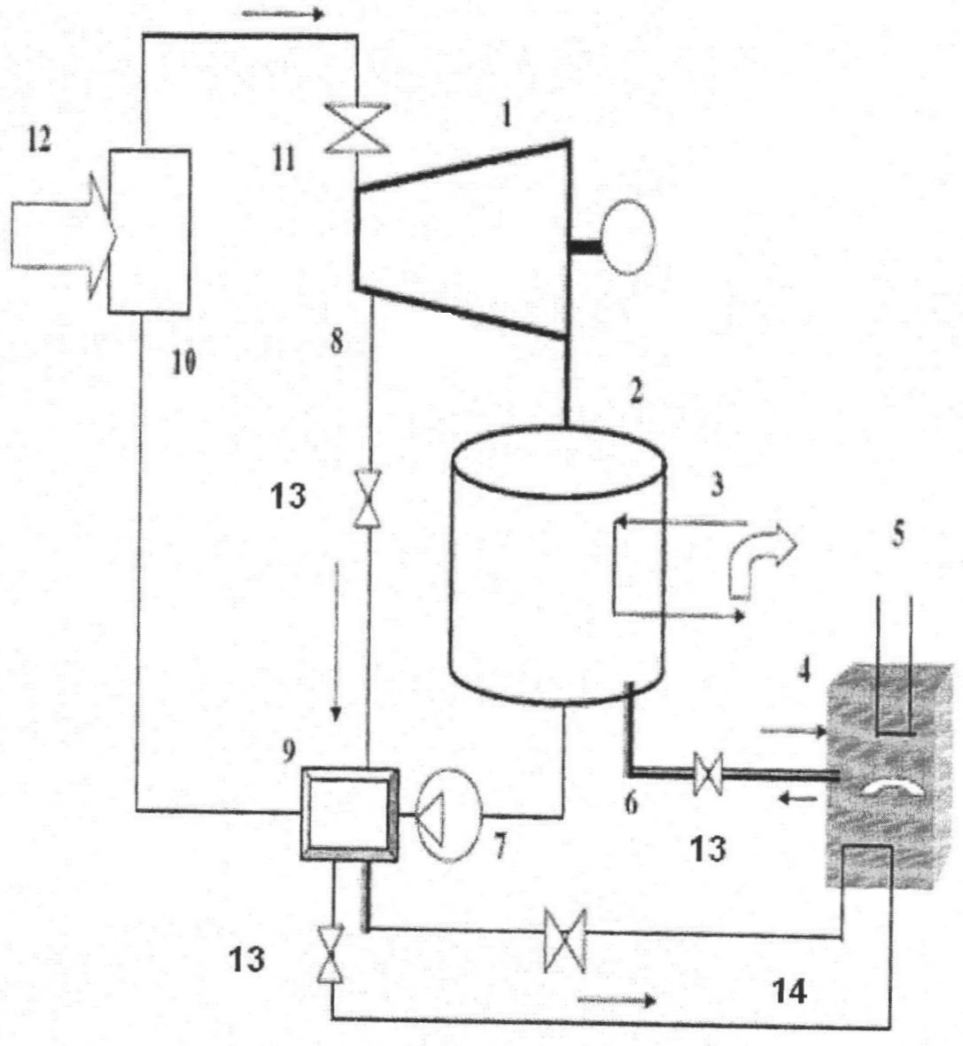 Изобретение относится преимущественно к способам преобразования тепловой энергии в механическую (электрическую), преимущественно к ядерным энергетическим установкам и системам энергообеспечения на их основе и предназначено для обеспечения тепловой и электрической энергией потребителей, имеющих неравномерную энергетическую нагрузку. Известны способы преобразования тепловой энергии в механическую, в том числе в ядерных энергоустановках, преобразующие первичную энергию в электрическую, которая запасается в электроаккумуляторах и затем по необходимости выводится различным потребителям электроэнергии. Значительный потенциал имеют ядерные энергоисточники, которые выгодно использовать при постоянной нагрузке, в то время как в энергосистеме существуют дневные пики и ночные провалы мощности. Из особенностей работы ядерных энергогенерирующих систем известна проблема поддержания работы ядерных реакторов на постоянной мощности при значительной разнице во временных графиках выработки и потребления энергии. Таким образом, возникает задача создания способов преобразования энергии, энергоаккумулирующих установок и систем, способных обеспечивать потребителя различными видами энергии в требуемом по условиям потребления неравномерном режиме вне зависимости от графика выработки первичной энергии. Выравнивание графика нагрузок энергоисточников за счет применения традиционных способов накопления электроэнергии или теплоаккумулирования увеличивает стоимость производства энергии и усложняет регламент работы. В частности, предложен способ работы электростанции с водородным аккумулированием энергии, заключающийся в том, что воду разлагают на кислород и водород, отличающийся тем, что с целью повышения эффективности создают замкнутый цикл, где воду нагнетают насосом в пароохладитель и электролизер, из которого водород и кислород, как компоненты разложения воды, собирают в резервуары для раздельного хранения, сжигают в камере сгорания, а продукты сгорания в виде перегретого водяного пара направляют в пароохладитель, где впрыскивают воду и охлаждают перегретый водяной пар, энергию которого посредством паровой турбины, генератора, конденсатора и электрокотла преобразуют в электрическую и тепловую энергию, а конденсат сливают в конденсатную емкость (заявка РФ на изобретение №99102865, дата публикации 2000.12.20). Недостатком данного решения является высокая стоимость и низкая эффективность аккумулирования энергии, что связано с большими затратами на создание и эксплуатацию электролизеров (до 3000 дол. США/кВт) и систем хранения водорода и кислорода, а также относительно низким кпд паротурбинного цикла. Более экономичное решение предложено в патенте РФ на изобретение №2023387 (дата публикации 1994.11.30), в котором перед подачей углекислого газа в теплицу осуществляют его многоступенчатое сжатие с промежуточным охлаждением в водоуглекислотных теплообменниках, аккумулирование сжиженного углекислого газа и его хранение, при этом после хранения осуществляют нагрев его в солнечном коллекторе для получения углекислотного пара, который направляют в углекислотную турбину с регулируемым давлением на выхлопе турбин. Недостатками данного решения являются относительно низкий кпд углекислотного цикла и необходимость подво