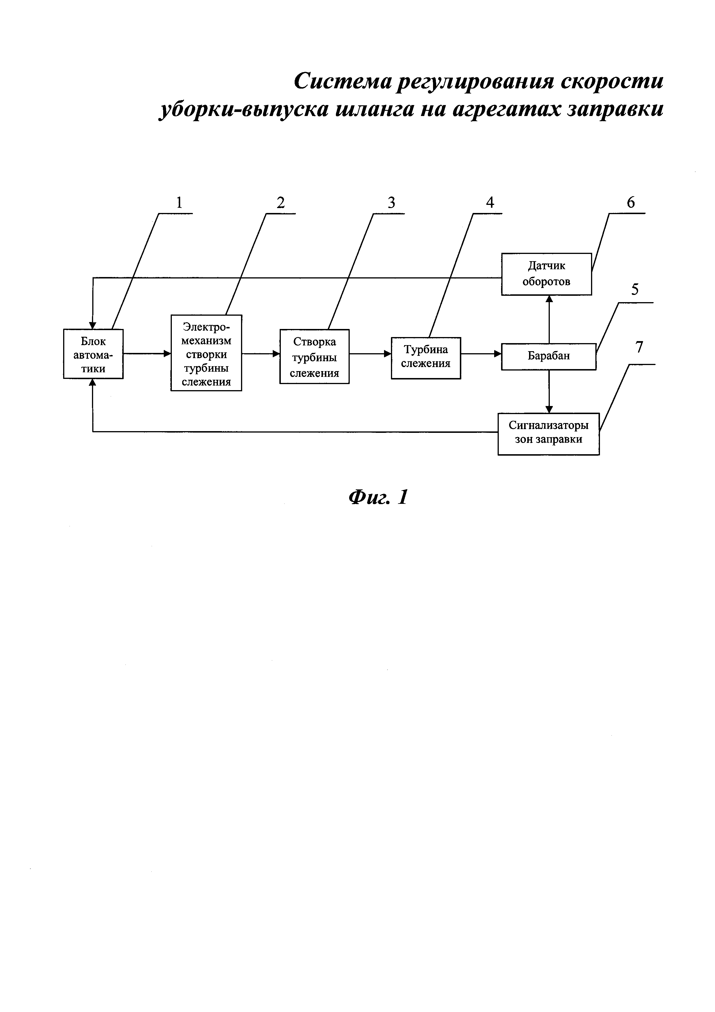 Изобретение относится к области авиации, а именно - к системам дозаправки летательных аппаратов топливом в полете. Известна система слежения, обеспечивающая выпуск и уборку шланга без регулирования скорости его движения («Подвесной агрегат заправки ПАЗ-МК». Руководство по технической эксплуатации М-7000-0 РЭ, ОАО «НПП «Звезда», 2012 г.), состоящая из блока автоматики агрегата заправки, турбины слежения со створкой, барабана со шлангом, датчика оборотов, сигнализатора зон заправки, гидроцилиндра управления створкой турбины слежения и трех электромагнитных кранов, управляющих гидроцилиндром. Система работает в соответствии с алгоритмом, заложенным в программу блока автоматики, позволяя открывать створку турбины слежения на фиксированный угол при уборке шланга и закрывать створку на режиме выпуска шланга. Существенным недостатком этой системы является следующее. На различных режимах полета (при разных высоте и скорости полета) скорость движения шланга изменяется в больших пределах. Гидроцилиндр управления створкой турбины слежения не имеет промежуточных положений в силу своих конструктивных свойств, поэтому отсутствует регулирование скорости движения шланга в зависимости от открытия створки турбины слежения. Увеличение скорости движения шланга на выпуске приводит к резкому рывку шланга при торможении на конце выпуска, что влияет на прочность шланга и уменьшает его ресурс. Увеличение скорости на уборке ограничено торможением с запоминанием состояния системы на уровне 40% от максимальной скорости, что приводит к лишним действиям оператора по снятию режима торможения. Задачей изобретения является обеспечение регулирования скорости выпуска и скорости уборки шланга в заданных пределах путем открытия створки турбины слежения на необходимый угол. Поставленная задача решается введением в состав системы вместо гидроцилиндра управления створкой турбины слежения электромеханизма поступательного действия и системы управления этим электромеханизмом по заданному алгоритму. Электромеханизм может открывать или закрывать створку турбины слежения на угол, при котором скорость движения шланга не будет выходить за заданные пределы. Структурная схема системы регулирования скорости уборки-выпуска шланга на подвесных агрегатах заправки представлена на фиг. 1. Заявляемая система регулирования скорости уборки-выпуска шланга на агрегатах заправки состоит из блока автоматики 1, электромеханизма 2 управления створкой турбины слежения, створки 3 турбины слежения, турбины слежения 4, барабана 5, на который намотан шланг, датчика оборотов 6, сигнализатора 7 зон заправки. Блок автоматики 1 выдает команды на электромеханизм 2 по алгоритму, заложенному в программу управления. Электромеханизм 2 створки турбины слежения позволяет открывать и закрывать створку 3 турбины слежения в зависимости от команд, поступающих с блока автоматики 1. Створка 3 турбины слежения изменяет крутящий момент на турбине слежения 4 в зависимости от набегающего потока воздуха. Турбина слежения 4 передает крутящий момент на барабан 5, и тем самым заставляет его вращаться в сторону намотки или размотки шланга с регулируемой скоростью. Датчик оборотов 6 определяет направление и скорость вращения барабана 5, т.е. скорость выпуска-уборки шланга. Сигнализатор 7 зон 