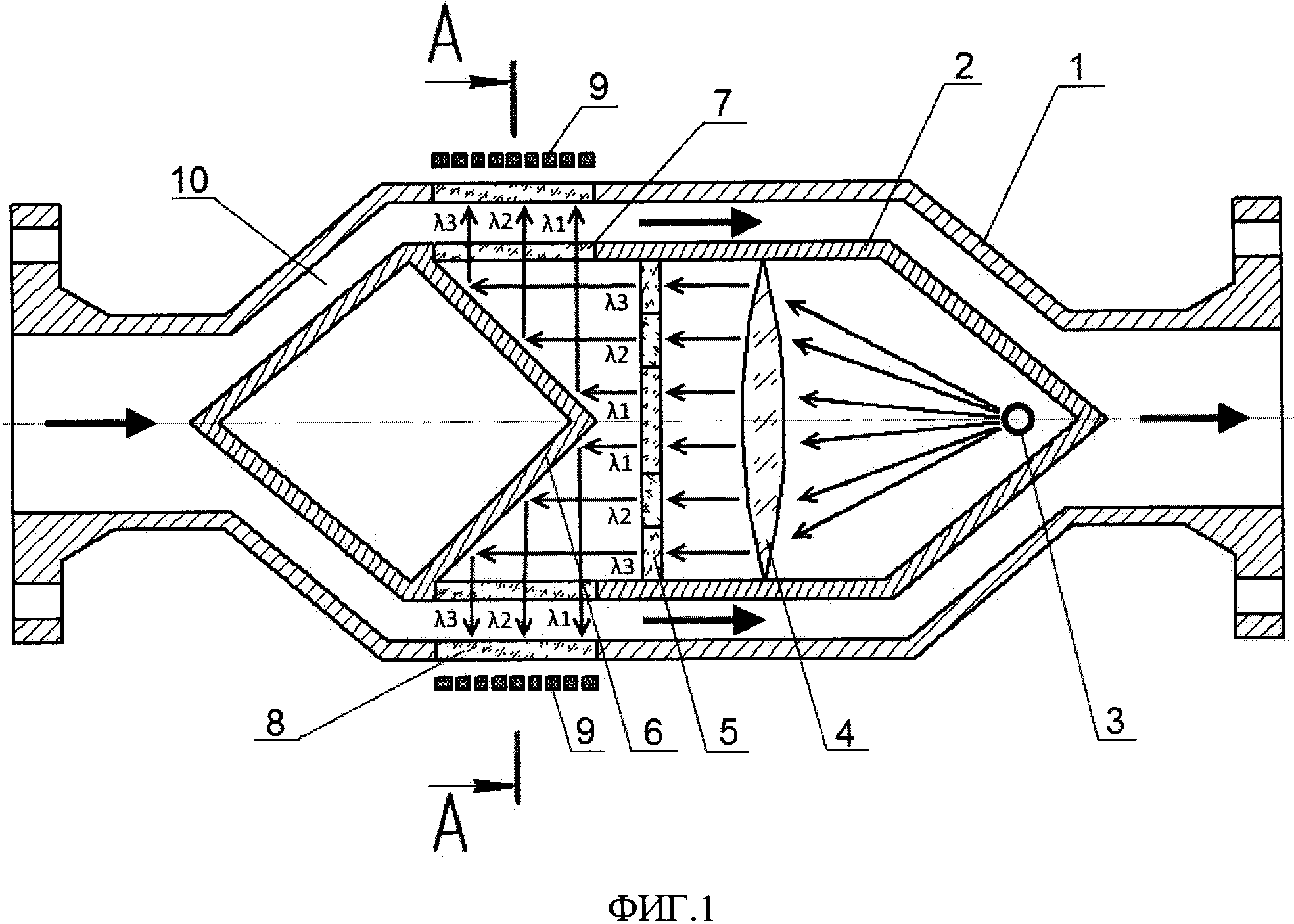 Изобретение относится к области нефтедобычи и может быть использовано в контрольно-измерительных установках для обеспечения непрерывного контроля обводненности продукции добывающих скважин и углеводородных смесей в трубопроводах для транспортировки нефти. Известен диэлькометрический поточный влагомер ВСН-АТ, содержащий первичный преобразователь и электронный блок. Первичный преобразователь состоит из высокочастотного цифрового генератора колебаний и подключенного к нему волновода. Волновод состоит из внешней трубы, являющейся корпусом влагомера, и центрального металлического электрода. В корпусе влагомера находится датчик температуры для коррекции показаний влагомера в зависимости от температуры измеряемой среды. Электронный блок обеспечивает преобразование измеренного комплексного сопротивления волновода и резонансной частоты в объемную долю воды в водно-нефтяной смеси и передачу этой информации на табло или на внешнее электронное оборудование, осуществляет температурную компенсацию и диагностику влагомера (http://www.all-pribors.ru/opisanie/62863-15-vsn-at-69049). Принцип действия влагомеров основан на измерении комплексного электрического сопротивления первичного преобразователя влагомера и резонансной частоты электрических колебаний, создаваемых высокочастотным генератором в зависимости от объемной доли воды в водно-нефтяной смеси. Недостатками влагомера являются ограничение по содержанию свободного газа в потоке газожидкостной эмульсии (его объемная доля не должна превышать 5%), существенная зависимость результатов измерений от солености воды и дисперсности эмульсии, а также высокие требования к однородности потока, особенно при прямом типе эмульсии «нефть в воде». Наиболее близким к предлагаемому устройству является семейство измерителей обводненности Red Eye, содержащих первичный преобразователь, включающий широкополосный источник ближнего инфракрасного (ИК) излучения, проточную ячейку, оптоволоконный коллиматор, оптические фильтры и фотодиоды, и электронный блок обработки информации, как например инфракрасный датчик по заявке США № US 2006/0186340 А1, публ.2006 г. В известном датчике контролируемая водонефтяная смесь проходит через проточную ячейку (длина оптического пути около 2 мм). Недостатком таких измерителей является их возможность измерения обводненности в очень узком диапазоне исследуемого потока. Однако в реальных водонефтегазовых потоках значение обводненности, измеренное в одной точке, может не соответствовать значению обводненности всего потока. Для получения достоверных результатов измерений обводненности в данном случае необходима гомогенная (равномерно перемешанная) структура потока. Измерители могут осуществлять измерения обводненности и при высоком содержании свободного газа, однако при объемной доле газа более 10% погрешности измерений превышают допустимые. Задачей заявленного технического решения является повышение точности измерения обводненности в потоке нефти путем обеспечения возможности проведения многоточечных измерений потока по всему сечению трубопровода. Технический результат достигается тем, что, поточный влагомер, содержащий основной корпус, широкополосный источник инфракрасного излучения, инфракрасные фильтры, инфракрасные детекторы, дополнительно содержи