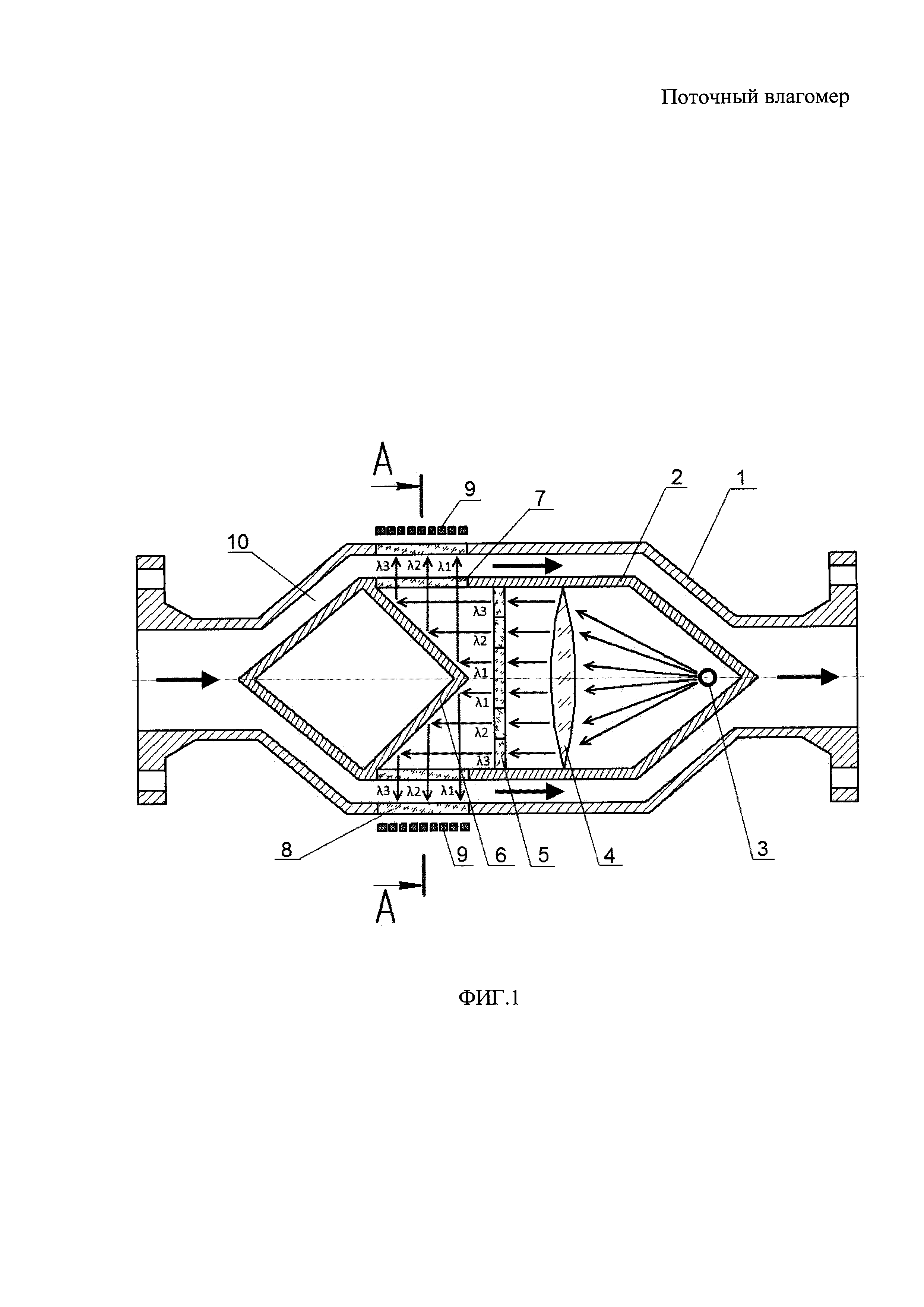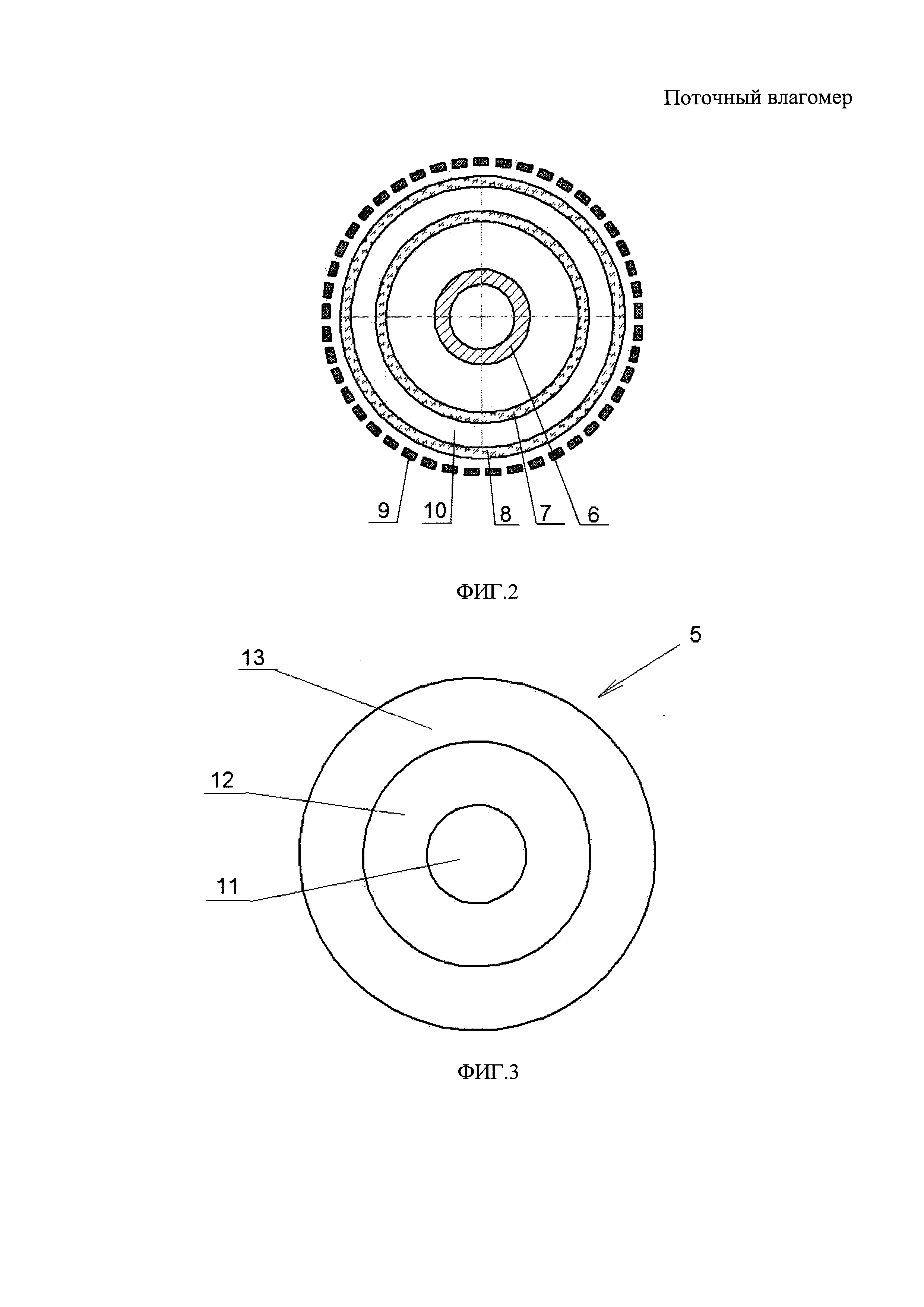 Поточный влагомер, содержащий основной корпус, широкополосный источник инфракрасного излучения, инфракрасные фильтры, инфракрасные детекторы, отличающийся тем, что он дополнительно содержит инфракрасную камеру, размещенную в основном корпусе с образованием между камерой и корпусом кольцевого канала, и установленные в инфракрасной камере коллиматорную линзу и отражатель, причем источник инфракрасного излучения и инфракрасные фильтры также размещены внутри инфракрасной камеры, при этом в инфракрасной камере и в основном корпусе выполнены кольцевые окна, а инфракрасные детекторы размещены снаружи основного корпуса напротив его кольцевых окон с возможностью регистрации интенсивности излучения, прошедшего через кольцевой канал.