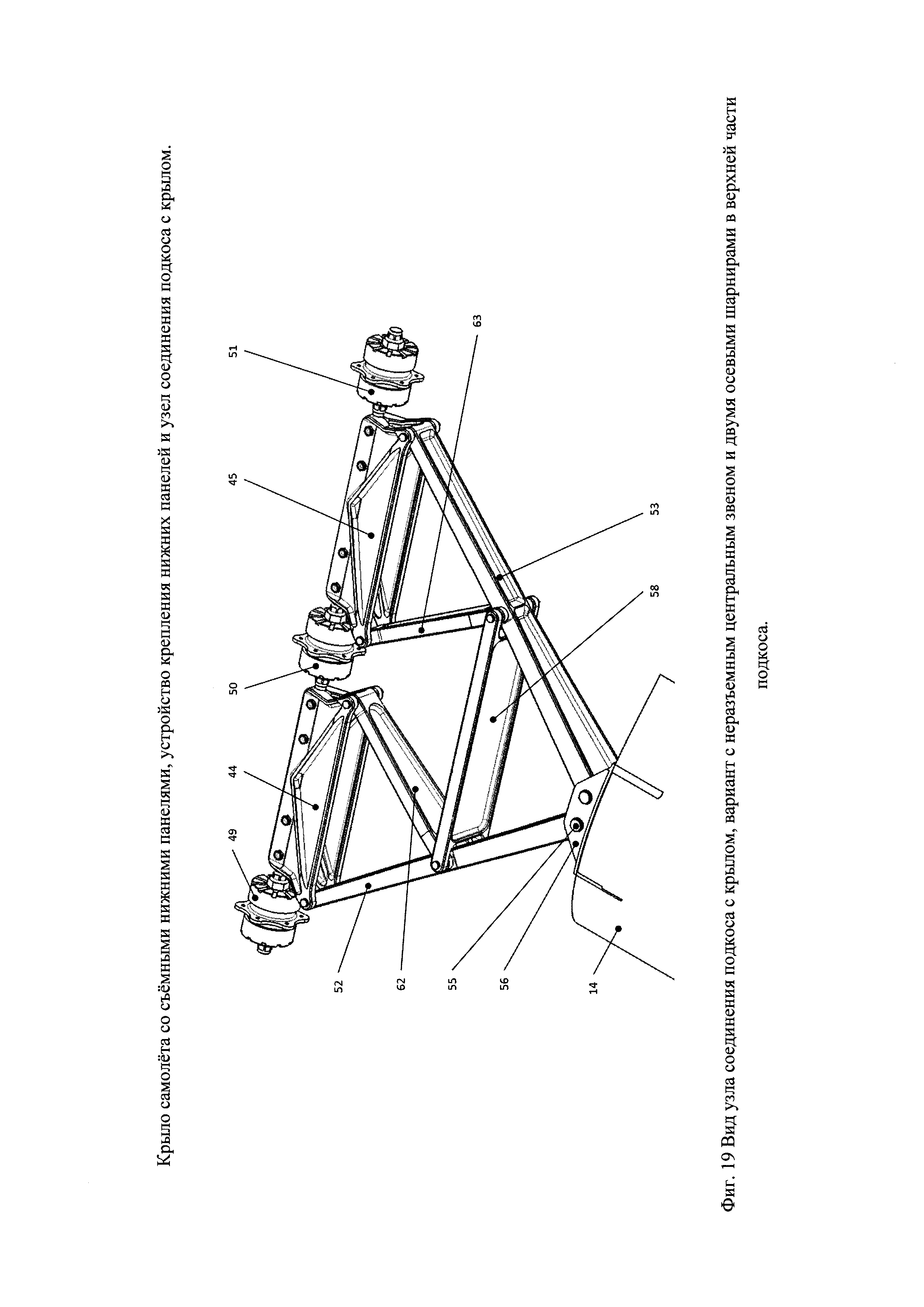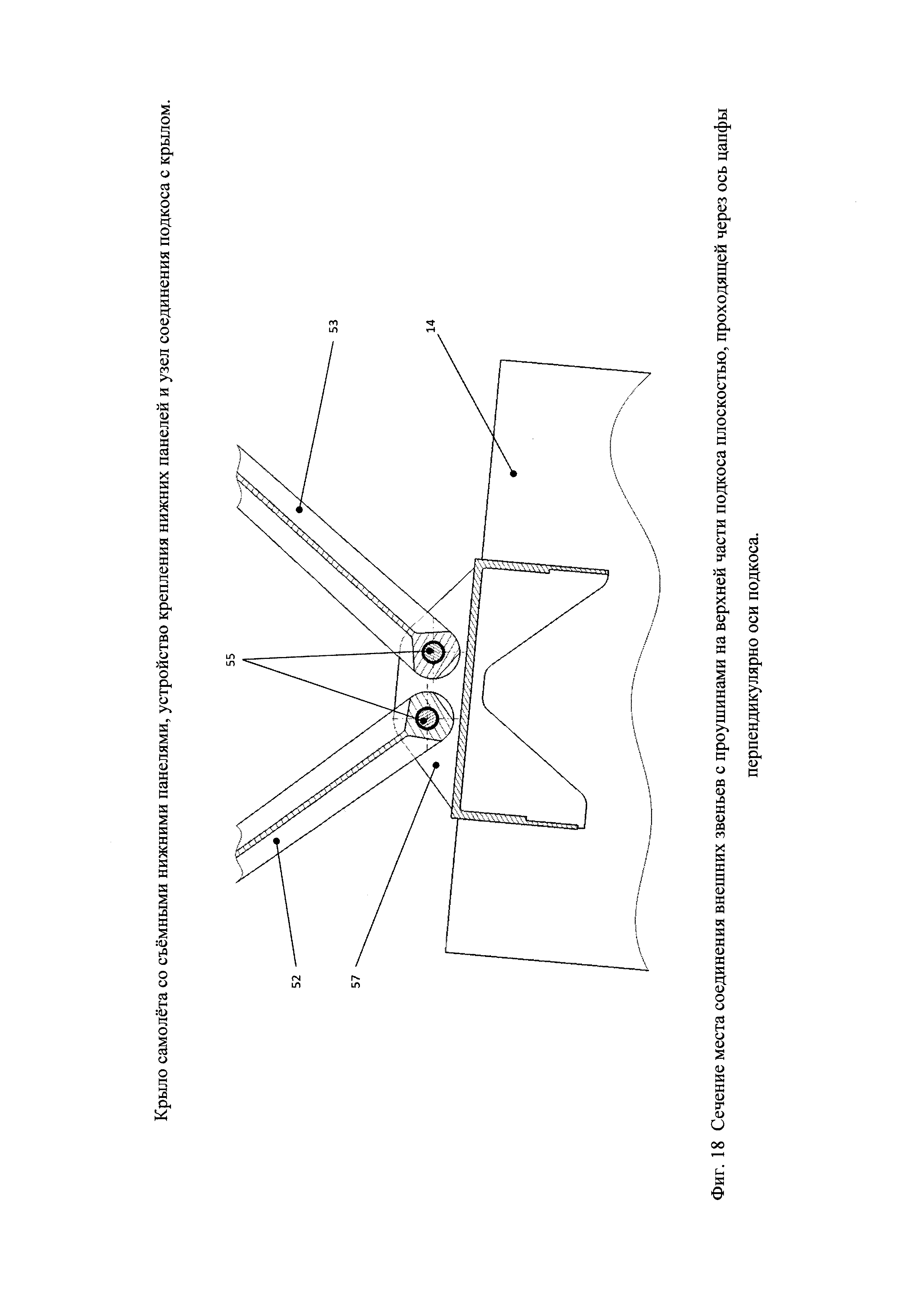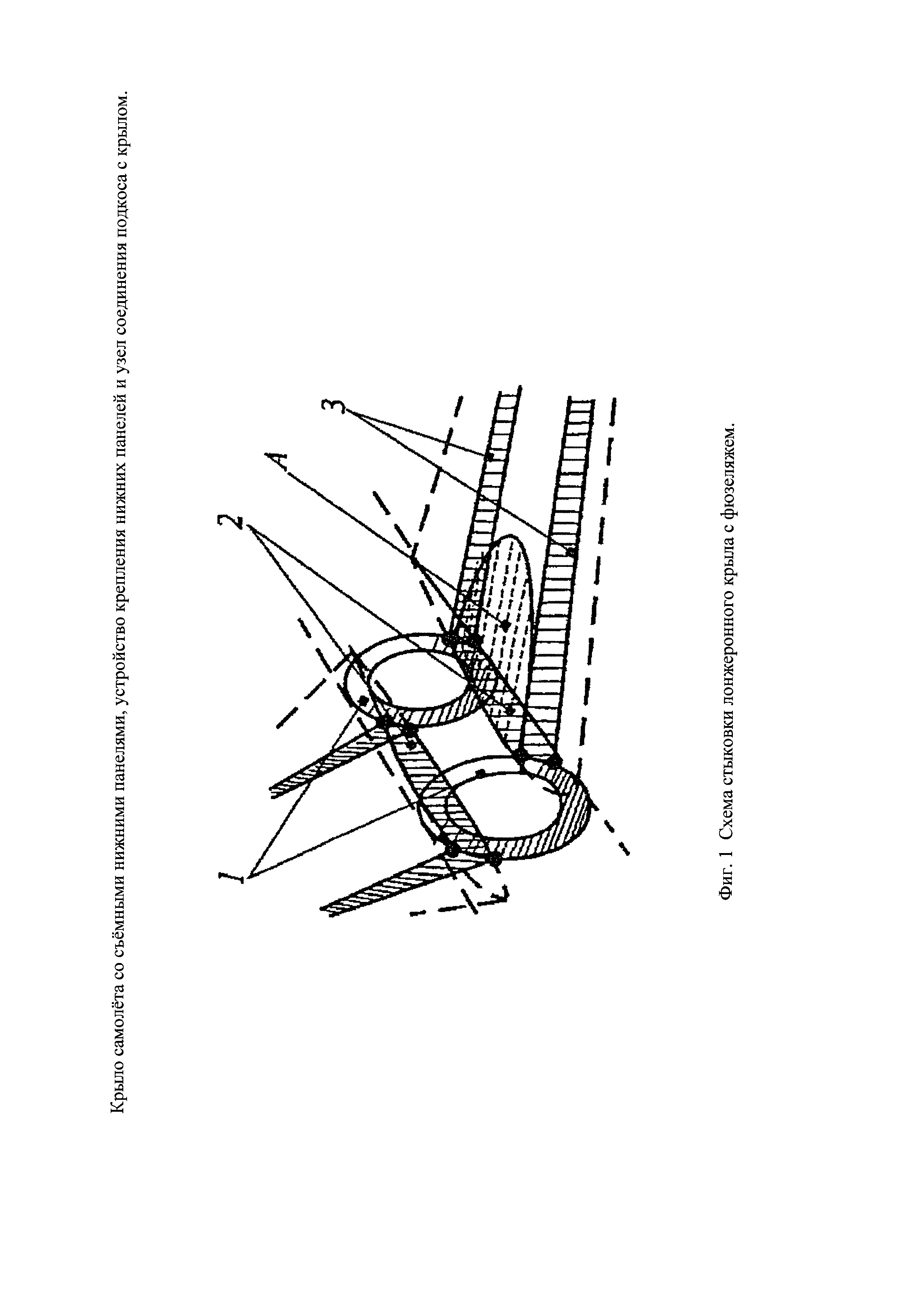Область техники Группа изобретений относится к авиации, а именно к конструкции крыльев самолетов и узлов крепления крыльев. Уровень техники Задача снижения себестоимости и увеличения дальности авиаперевозок продиктована современными требованиями, предъявляемыми к коммерческой авиации. Решением данной задачи является повышение качества весового проектирования и улучшение аэродинамики самолета, в том числе за счет применения аэродинамических профилей с ламинарным обтеканием. Известно, что в дозвуковом скоростном диапазоне полета самолета наибольшую выгоду дает применение под косного крыла с удлинением более 15-ти (описание патента US 2643076, www.uspto.gov). Однако для крыла с удлинением более 15-ти затруднительно обеспечить достаточную жесткость и прочность конструкции. Известна подкосная схема крыла самолета, в которой лонжероны работают как консольные балки, защемленные или шарнирно закрепленные у фюзеляжа. Сравнение подкосного и свободнонесущего монопланного крыльев с одинаковой площадью несущей поверхности показывает, что коэффициент сопротивления подкосной схемы на 10-11% больше, зато удельный вес подкосного крыла на 17-20% меньше. Кроме того, подкосное крыло вследствие присущей ему высокой жесткости более благополучно в отношении флаттера, чем свободнонесущее, у которого необходимая виброустойчивость достигается обычно за счет увеличения веса конструкции. К этому нужно добавить, что уменьшение веса планера самолета при применении подкосов позволяет, сохраняя нагрузку на 1 м2, уменьшить площадь крыла. Необходимо отметить, что в схеме с одним подкосом для каждой консоли, крыло самостоятельно воспринимает весь крутящий момент, а подкосы разгружают его при изгибе. При этом необходимо применение жесткой обшивки, работающей при кручении. Защемление концов подкосов вследствие их малой жесткости позволяет лишь незначительно разгрузить крыло от крутящего момента, поэтому, а также для облегчения монтажа и устранения возможности появления дополнительных усилий при наличии перекосов, концы подкосов крепятся с помощью шаровых шарниров. (Фомин Н.А., «Конструкция крыла современного самолета», ОБОРОНГИЗ НКАП, Главная редакция авиационной литературы, Москва, 1946 г., стр. 58, 59, 80-85). Другим решением, позволяющим повысить жесткость крыла, является применение конструктивно-силовой схемы (КСС) крыла с тремя лонжеронами. Известно трехлонжеронное крыло, конструктивно представляющее собой каркас из продольного и поперечного наборов, покрытый гладкой обшивкой (Шульженко М.Н., «Сборник иллюстраций по курсу конструкций самолетов», Оборонгиз, Москва, 1954 г., стр. 21, фиг. 34). Продольный набор такого крыла состоит из трех лонжеронов и системы стрингеров. Поперечный набор образован нервюрами. Нижние стрингеры и обшивка в между-лонжеронной зоне на большей части размаха вырезаны и образуют люки для монтажа топливных баков. Эти вырезы закрываются крышками, которые воспринимают все нагрузки, приходящиеся на вырезанные элементы центроплана. Размещение топливных баков в крыле выгодно в весовом отношении, так как приводит к разгрузке крыла. Верхние части рамных нервюр служат опорами для баков и установлены с небольшим шагом для обеспечения необходимой устойчивости обшивки верхней панели крыла при сдвиге и для сохранения формы профиля крыла. Наи