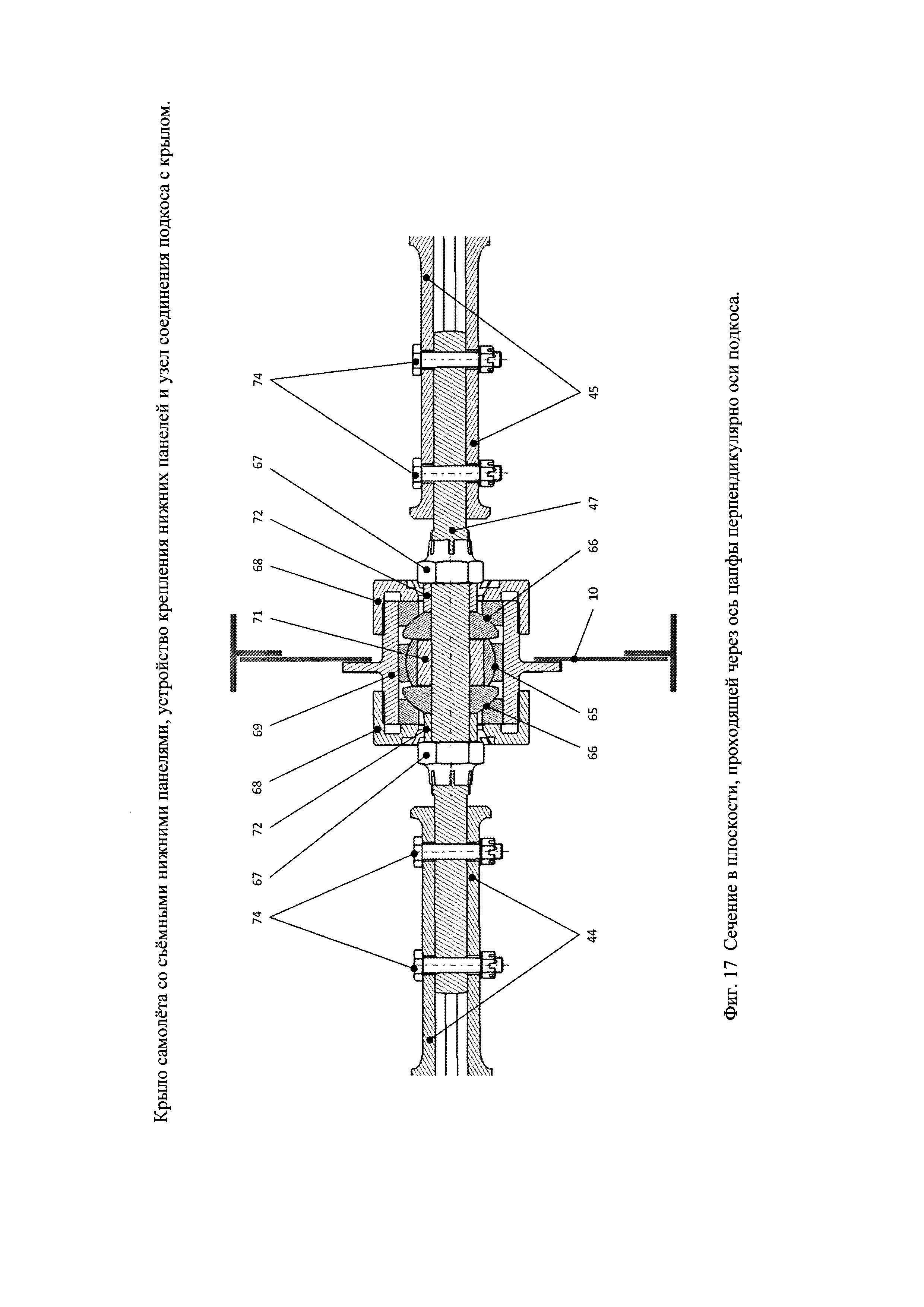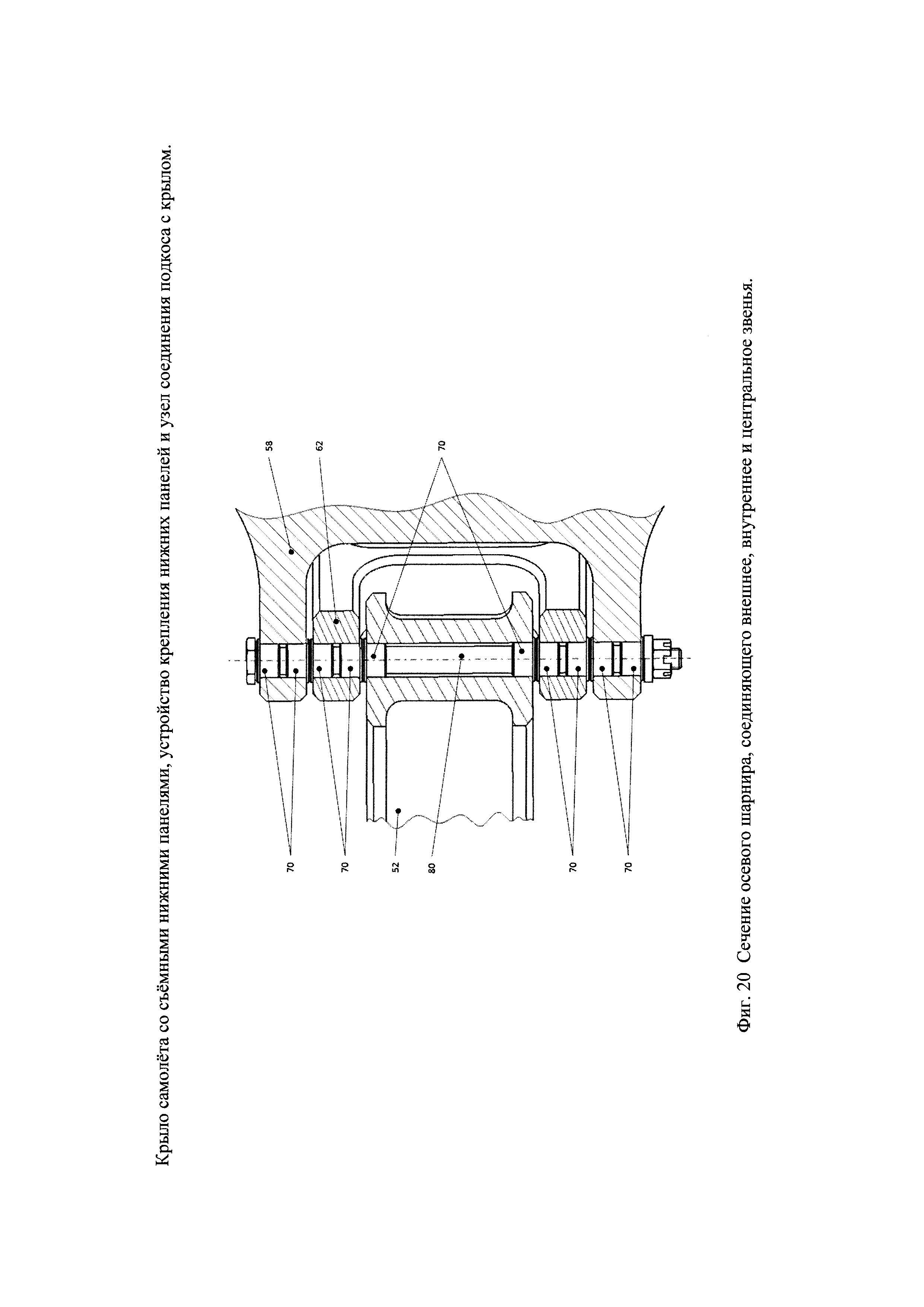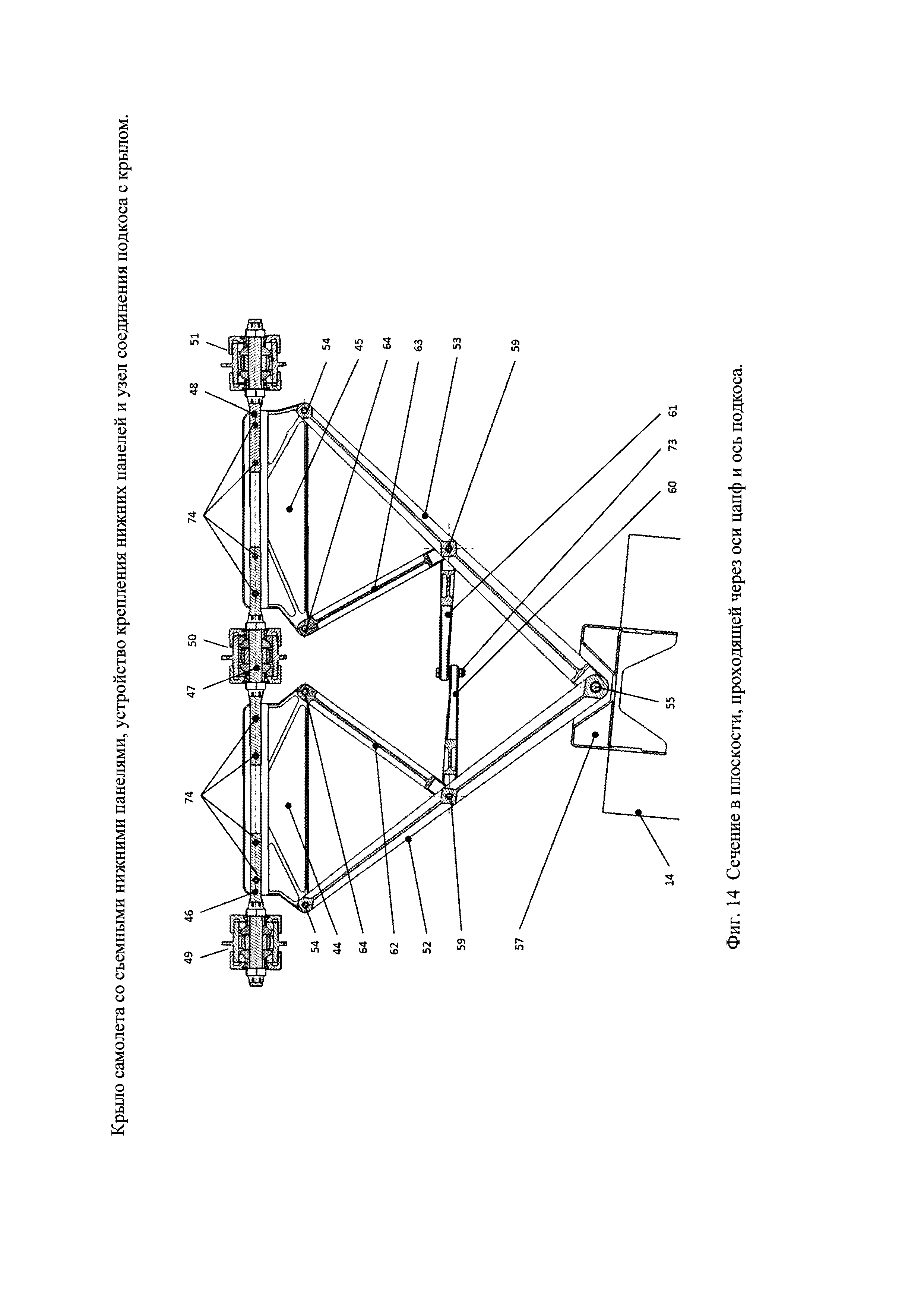 Область техники Группа изобретений относится к авиации, а именно к конструкции крыльев самолетов и узлов крепления крыльев. Уровень техники Задача снижения себестоимости и увеличения дальности авиаперевозок продиктована современными требованиями, предъявляемыми к коммерческой авиации. Решением данной задачи является повышение качества весового проектирования и улучшение аэродинамики самолета, в том числе за счет применения аэродинамических профилей с ламинарным обтеканием. Известно, что в дозвуковом скоростном диапазоне полета самолета наибольшую выгоду дает применение под косного крыла с удлинением более 15-ти (описание патента US 2643076, www.uspto.gov). Однако для крыла с удлинением более 15-ти затруднительно обеспечить достаточную жесткость и прочность конструкции. Известна подкосная схема крыла самолета, в которой лонжероны работают как консольные балки, защемленные или шарнирно закрепленные у фюзеляжа. Сравнение подкосного и свободнонесущего монопланного крыльев с одинаковой площадью несущей поверхности показывает, что коэффициент сопротивления подкосной схемы на 10-11% больше, зато удельный вес подкосного крыла на 17-20% меньше. Кроме того, подкосное крыло вследствие присущей ему высокой жесткости более благополучно в отношении флаттера, чем свободнонесущее, у которого необходимая виброустойчивость достигается обычно за счет увеличения веса конструкции. К этому нужно добавить, что уменьшение веса планера самолета при применении подкосов позволяет, сохраняя нагрузку на 1 м2, уменьшить площадь крыла. Необходимо отметить, что в схеме с одним подкосом для каждой консоли, крыло самостоятельно воспринимает весь крутящий момент, а подкосы разгружают его при изгибе. При этом необходимо применение жесткой обшивки, работающей при кручении. Защемление концов подкосов вследствие их малой жесткости позволяет лишь незначительно разгрузить крыло от крутящего момента, поэтому, а также для облегчения монтажа и устранения возможности появления дополнительных усилий при наличии перекосов, концы подкосов крепятся с помощью шаровых шарниров. (Фомин Н.А., «Конструкция крыла современного самолета», ОБОРОНГИЗ НКАП, Главная редакция авиационной литературы, Москва, 1946 г., стр. 58, 59, 80-85). Другим решением, позволяющим повысить жесткость крыла, является применение конструктивно-силовой схемы (КСС) крыла с тремя лонжеронами. Известно трехлонжеронное крыло, конструктивно представляющее собой каркас из продольного и поперечного наборов, покрытый гладкой обшивкой (Шульженко М.Н., «Сборник иллюстраций по курсу конструкций самолетов», Оборонгиз, Москва, 1954 г., стр. 21, фиг. 34). Продольный набор такого крыла состоит из трех лонжеронов и системы стрингеров. Поперечный набор образован нервюрами. Нижние стрингеры и обшивка в между-лонжеронной зоне на большей части размаха вырезаны и образуют люки для монтажа топливных баков. Эти вырезы закрываются крышками, которые воспринимают все нагрузки, приходящиеся на вырезанные элементы центроплана. Размещение топливных баков в крыле выгодно в весовом отношении, так как приводит к разгрузке крыла. Верхние части рамных нервюр служат опорами для баков и установлены с небольшим шагом для обеспечения необходимой устойчивости обшивки верхней панели крыла при сдвиге и для сохранения формы профиля крыла. Наи