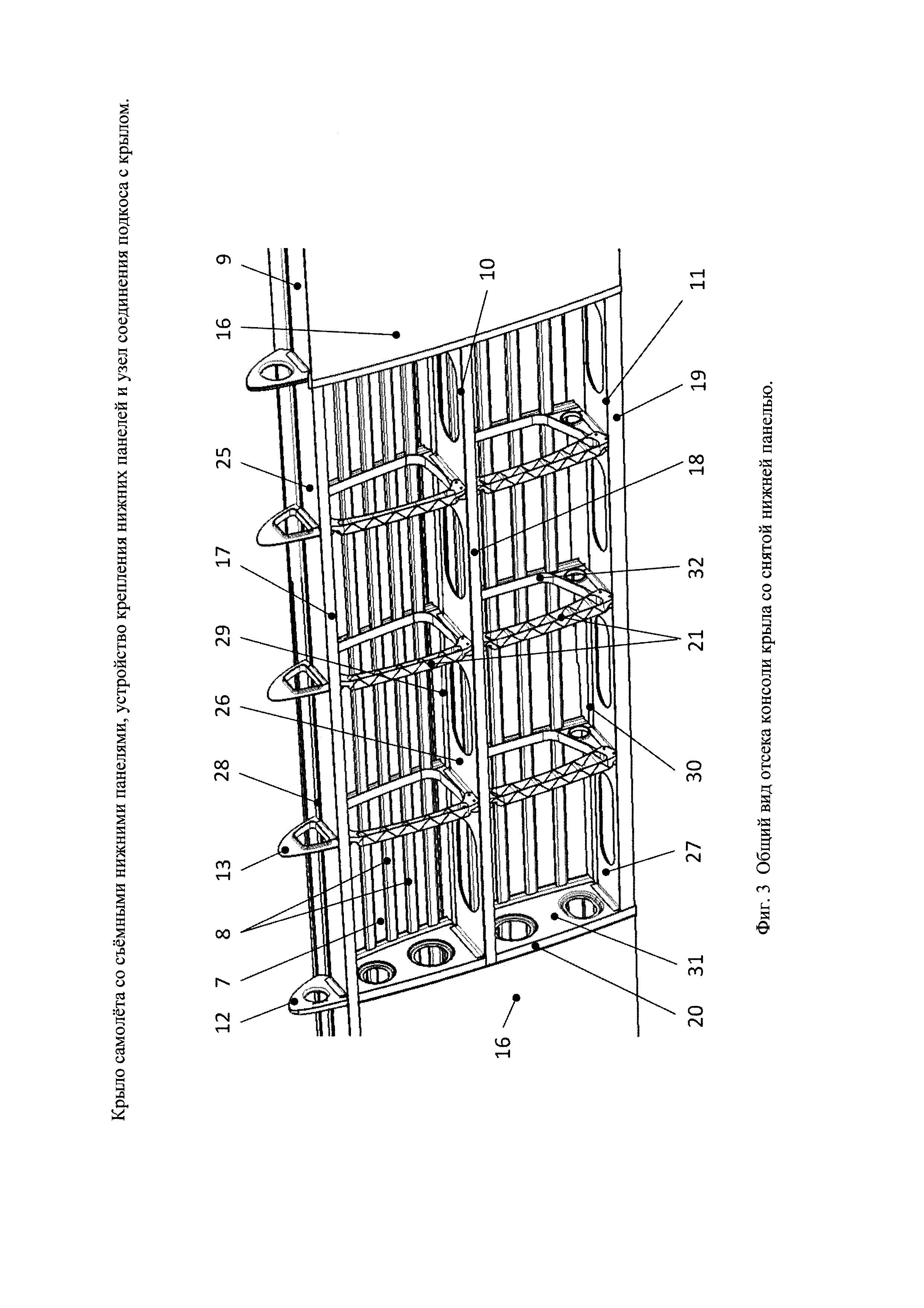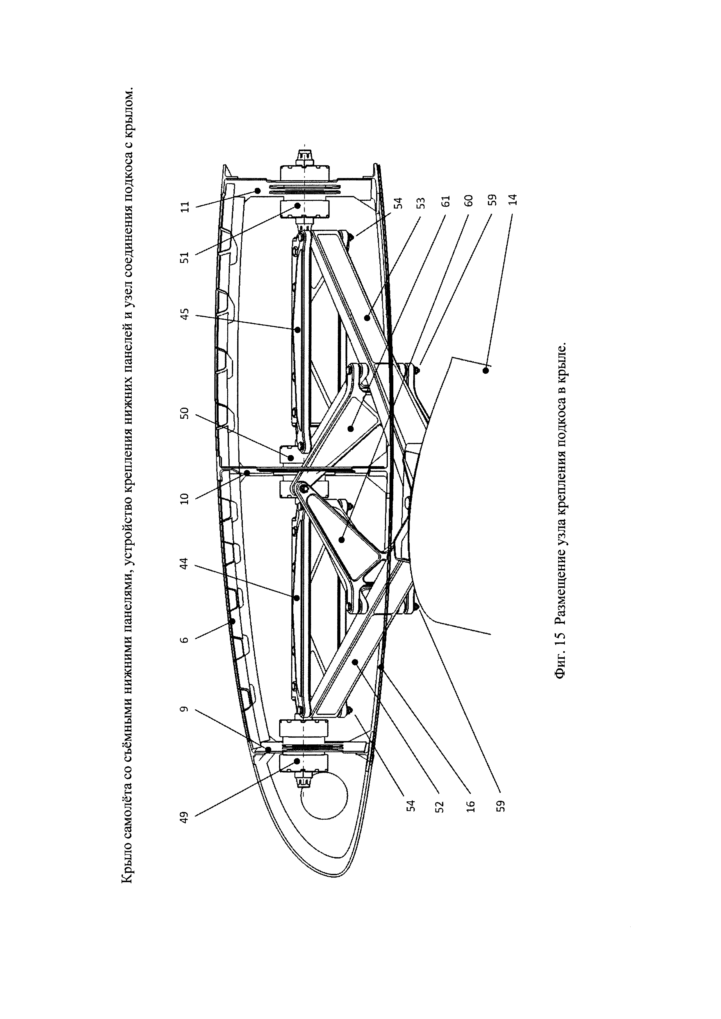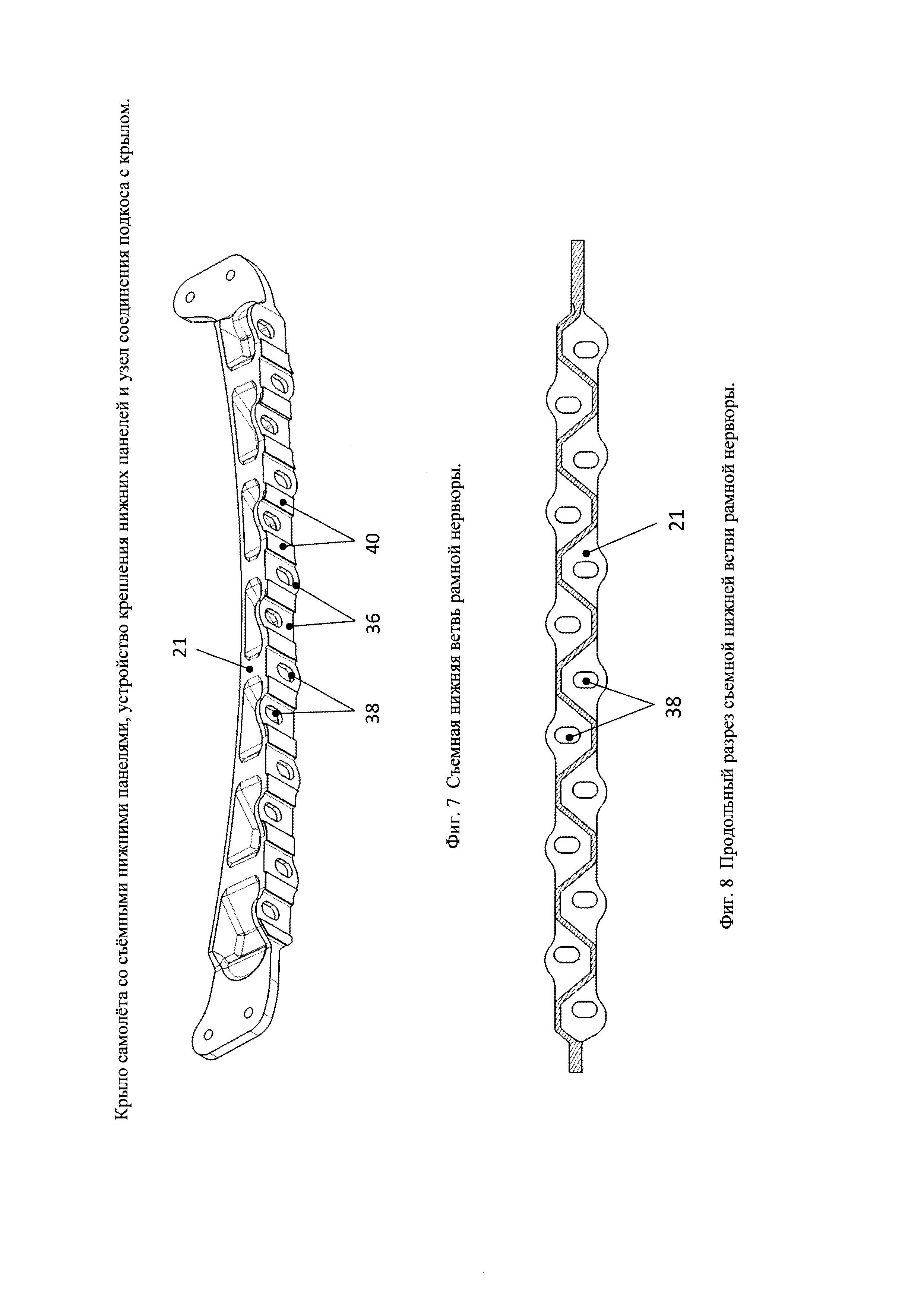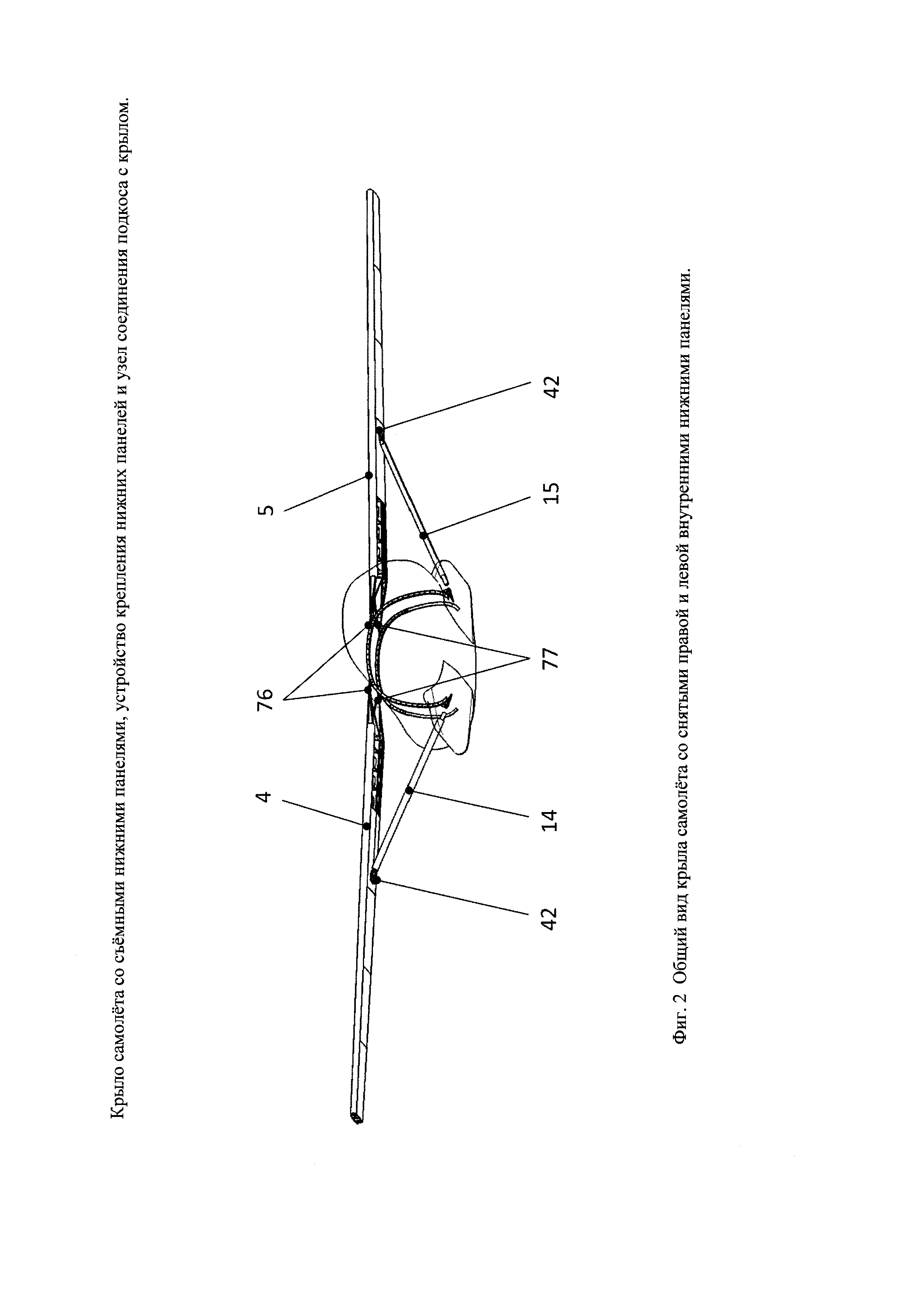 1. Крыло самолета, состоящее из двух соединенных с фюзеляжем консолей, каждая из которых подкреплена подкосом, шарнирно соединенным с лонжеронами крыла и с фюзеляжем, и содержит верхнюю панель, состоящую из несущей обшивки, подкрепленной стрингерами, передний, центральный и задний лонжероны, балочные и рамные нервюры, а также съемные нижние панели, соединенные с нижними поясами лонжеронов и нервюр и выполненные таким образом, что полная жесткость съемных нижних панелей при растяжении или сжатии в продольном направлении крыла летательного аппарата ниже, чем полная жесткость нижних поясов лонжеронов при растяжении или сжатии в указанном направлении, отличающееся тем, что рамные нервюры имеют съемные нижние ветви, а съемные нижние панели соединяются с нижними поясами лонжеронов и нервюр при помощи креплений, обеспечивающих ограниченную подвижность панелей в направлении вдоль крыла и работают на восприятие сдвиговых усилий от кручения крыла, центральный лонжерон крыла имеет Y-образную форму, разветвляется в направлении фюзеляжа на переднюю и заднюю ветви, которые соединяются с передним и задним лонжеронами соответственно. 2. Крыло самолета по п. 1, отличающееся тем, что съемные нижние ветви рамных нервюр выполнены в виде двутавровых балок с волнообразной стенкой. 3. Крыло самолета по п. 1, отличающееся тем, что консоли крепятся к центроплану. 4. Крыло самолета по п. 1, отличающееся тем, что верхняя панель, и/или нижние съемные панели, и/или передний, и/или центральный, и/или задний лонжероны, и/или балочные, и/или рамные нервюры, и/или подкосы выполнены из полимерных композиционных материалов. 5. Крыло самолета по п. 1, отличающееся тем, что верхняя панель, и/или нижние съемные панели и/или передний и/или центральный и/или задний лонжероны и/или балочные и/или рамные нервюры имеют сотовую конструкцию. 6. Устройство для крепления нижних панелей крыла, содержащее крепежные элементы в виде болтов, проходящих через сквозные цилиндрические отверстия в нижних панелях крыла и соединенных резьбовой частью с гайками, установленными на нижних поясах лонжеронов и нервюр, отличающееся тем, что гайки размещены в обоймах-прищепках, установленных в углублениях прямоугольной формы, выполненных в нижних поясах лонжеронов и нервюр со стороны нижних панелей; между щеками обойм-прищепок и поверхностями нижних поясов лонжеронов и нервюр установлены шайбы из металлофторопластовой ленты таким образом, что шайбы располагаются фторопластовым слоем к поверхности пояса лонжерона (нервюры) и металлической стороной к поверхности обоймы-прищепки; углубления, выполненные в поясах лонжеронов и нервюр, имеют глубину не менее суммарной толщины лапки обоймы-прищепки и металло-фторопластовой шайбы, установленной между лапкой обоймы-прищепки и поверхностью углубления на нижнем поясе лонжерона (нервюры), обращенной к нижней панели крыла, гайки, размещенные в обоймах-прищепках, выполнены плавающими и самоконтрящимися; сквозные цилиндрические отверстия в съемных нижних панелях выполнены с зенковкой с нижней стороны панелей, а болты, проходящие через сквозные цилиндрические отверстия в нижних панелях, выполнены с потайной головкой; в нижних поясах лонжеронов и нервюр выполнены сквозные пазы прямоугольной, скругленной на концах формы в плане, ориентирован