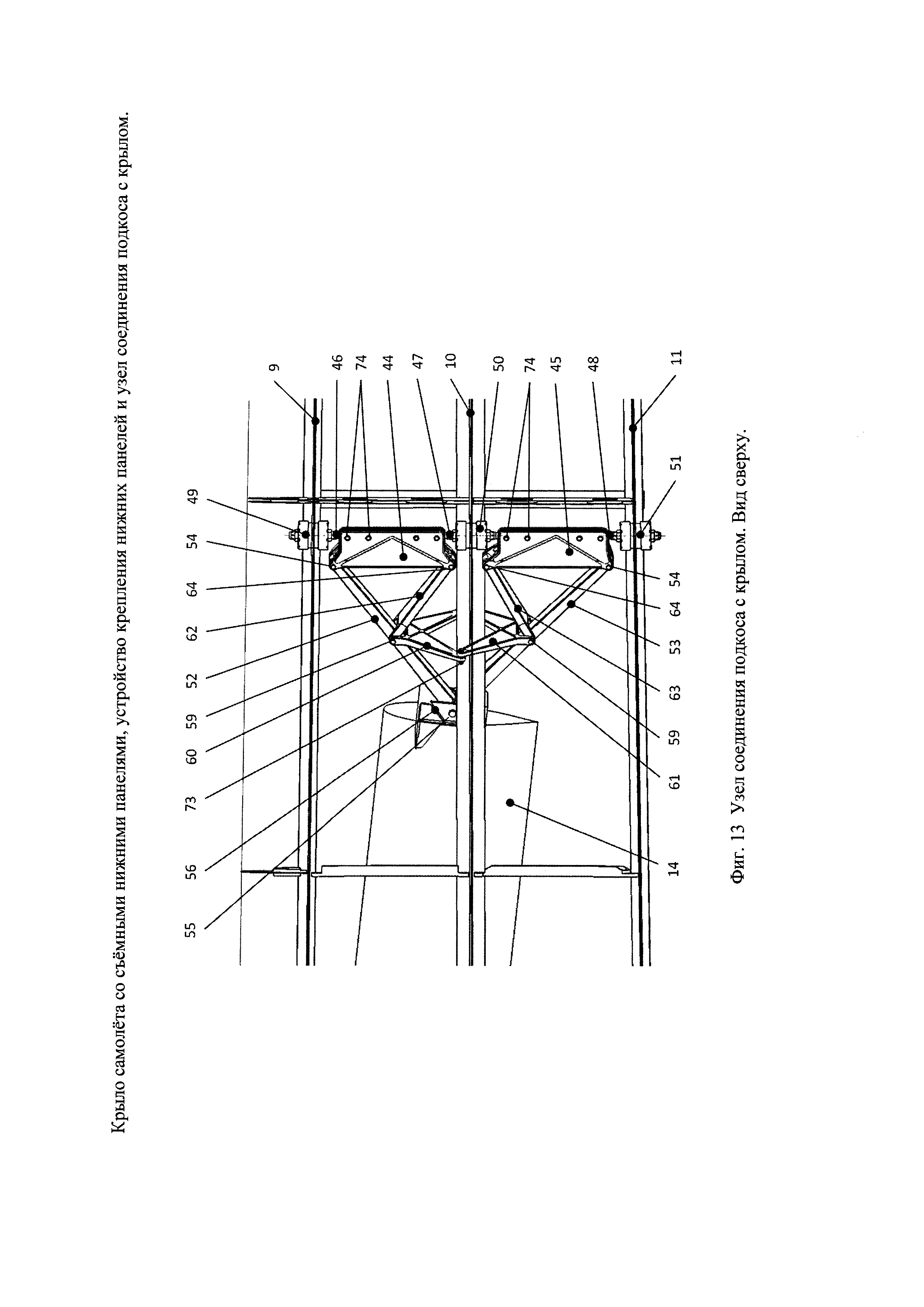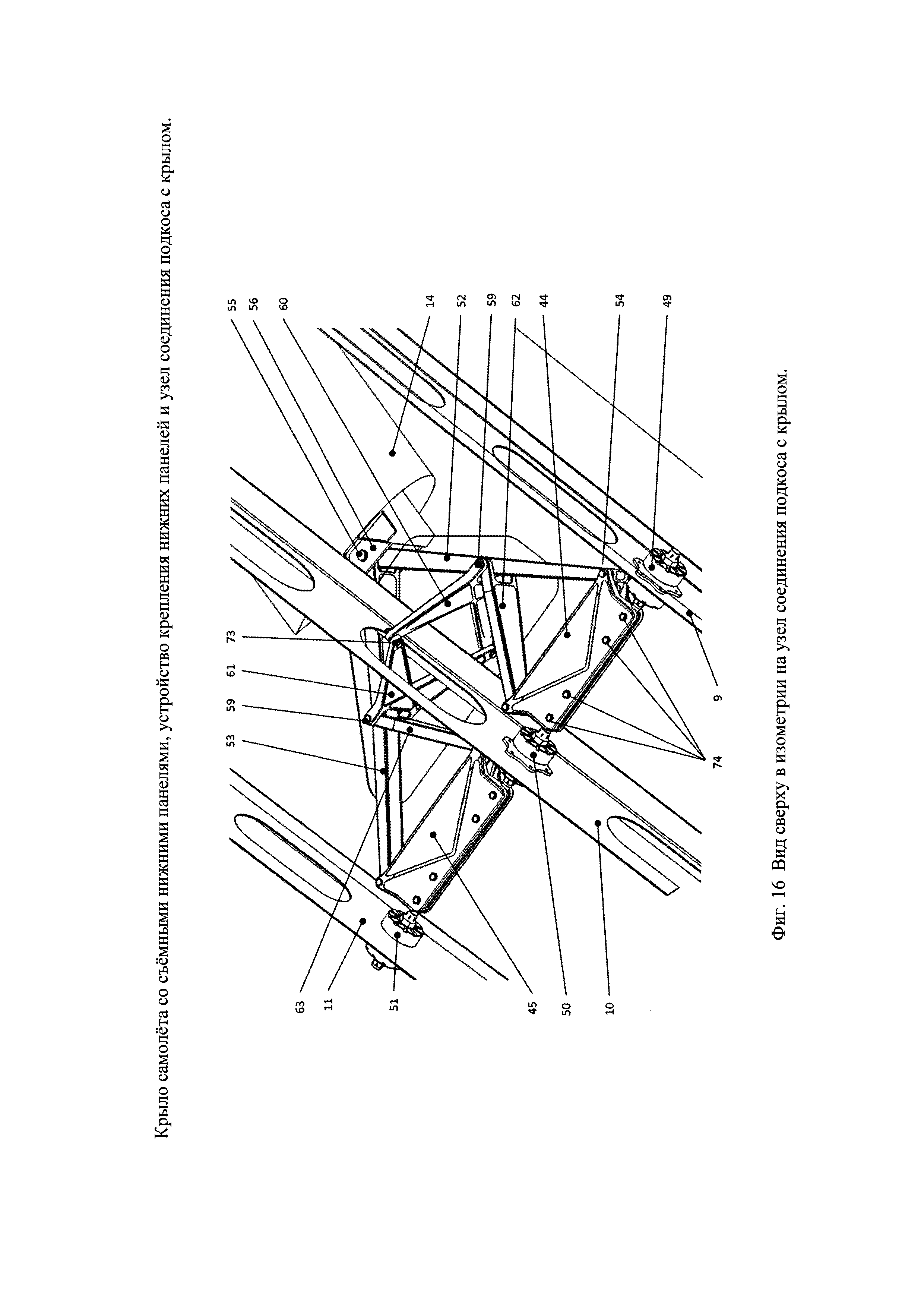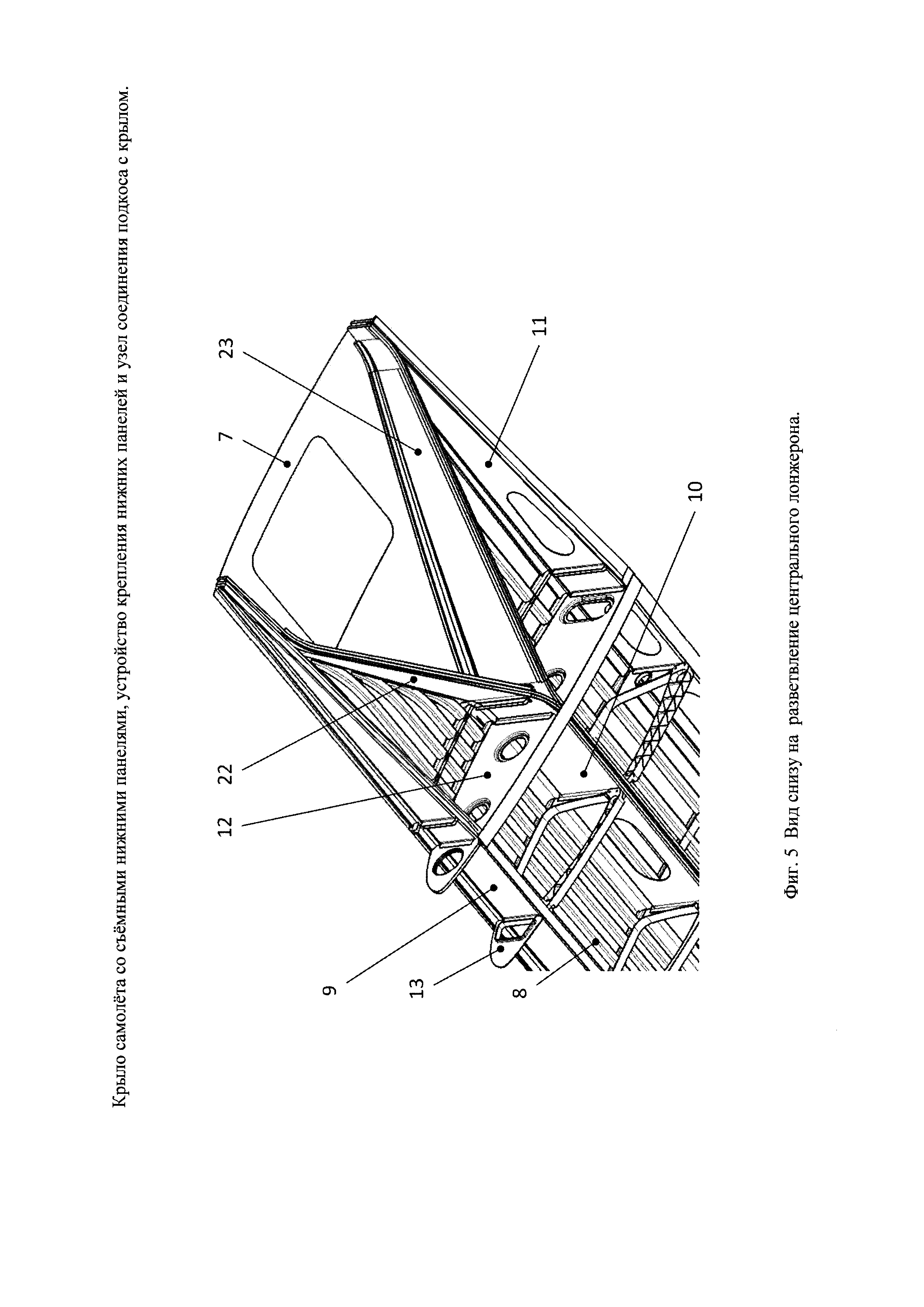 1. Крыло самолета, состоящее из двух соединенных с фюзеляжем консолей, каждая из которых подкреплена подкосом, шарнирно соединенным с лонжеронами крыла и с фюзеляжем, и содержит верхнюю панель, состоящую из несущей обшивки, подкрепленной стрингерами, передний, центральный и задний лонжероны, балочные и рамные нервюры, а также съемные нижние панели, соединенные с нижними поясами лонжеронов и нервюр и выполненные таким образом, что полная жесткость съемных нижних панелей при растяжении или сжатии в продольном направлении крыла летательного аппарата ниже, чем полная жесткость нижних поясов лонжеронов при растяжении или сжатии в указанном направлении, отличающееся тем, что рамные нервюры имеют съемные нижние ветви, а съемные нижние панели соединяются с нижними поясами лонжеронов и нервюр при помощи креплений, обеспечивающих ограниченную подвижность панелей в направлении вдоль крыла и работают на восприятие сдвиговых усилий от кручения крыла, центральный лонжерон крыла имеет Y-образную форму, разветвляется в направлении фюзеляжа на переднюю и заднюю ветви, которые соединяются с передним и задним лонжеронами соответственно. 2. Крыло самолета по п. 1, отличающееся тем, что съемные нижние ветви рамных нервюр выполнены в виде двутавровых балок с волнообразной стенкой. 3. Крыло самолета по п. 1, отличающееся тем, что консоли крепятся к центроплану. 4. Крыло самолета по п. 1, отличающееся тем, что верхняя панель, и/или нижние съемные панели, и/или передний, и/или центральный, и/или задний лонжероны, и/или балочные, и/или рамные нервюры, и/или подкосы выполнены из полимерных композиционных материалов. 5. Крыло самолета по п. 1, отличающееся тем, что верхняя панель, и/или нижние съемные панели и/или передний и/или центральный и/или задний лонжероны и/или балочные и/или рамные нервюры имеют сотовую конструкцию. 6. Устройство для крепления нижних панелей крыла, содержащее крепежные элементы в виде болтов, проходящих через сквозные цилиндрические отверстия в нижних панелях крыла и соединенных резьбовой частью с гайками, установленными на нижних поясах лонжеронов и нервюр, отличающееся тем, что гайки размещены в обоймах-прищепках, установленных в углублениях прямоугольной формы, выполненных в нижних поясах лонжеронов и нервюр со стороны нижних панелей; между щеками обойм-прищепок и поверхностями нижних поясов лонжеронов и нервюр установлены шайбы из металлофторопластовой ленты таким образом, что шайбы располагаются фторопластовым слоем к поверхности пояса лонжерона (нервюры) и металлической стороной к поверхности обоймы-прищепки; углубления, выполненные в поясах лонжеронов и нервюр, имеют глубину не менее суммарной толщины лапки обоймы-прищепки и металло-фторопластовой шайбы, установленной между лапкой обоймы-прищепки и поверхностью углубления на нижнем поясе лонжерона (нервюры), обращенной к нижней панели крыла, гайки, размещенные в обоймах-прищепках, выполнены плавающими и самоконтрящимися; сквозные цилиндрические отверстия в съемных нижних панелях выполнены с зенковкой с нижней стороны панелей, а болты, проходящие через сквозные цилиндрические отверстия в нижних панелях, выполнены с потайной головкой; в нижних поясах лонжеронов и нервюр выполнены сквозные пазы прямоугольной, скругленной на концах формы в плане, ориентирован