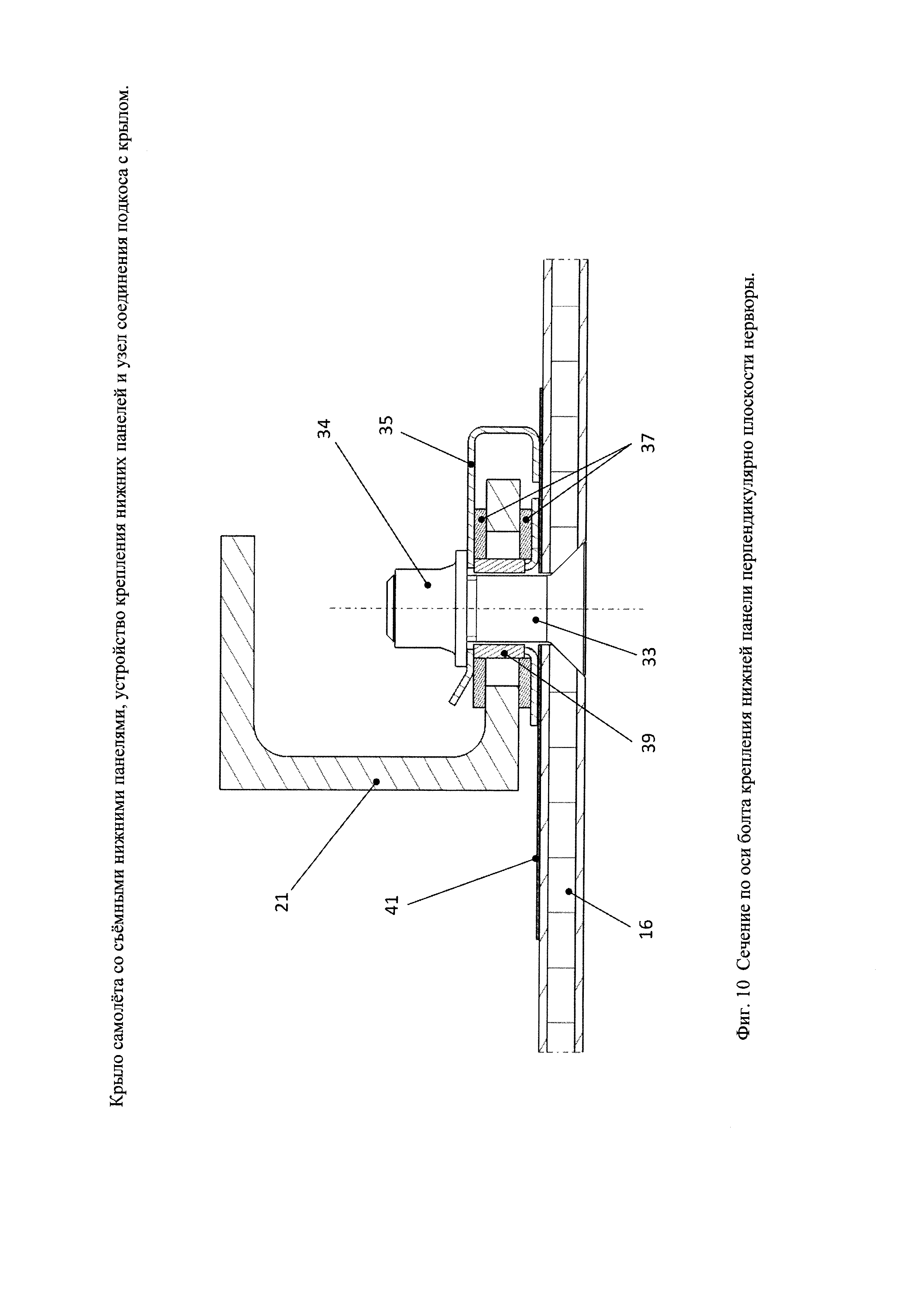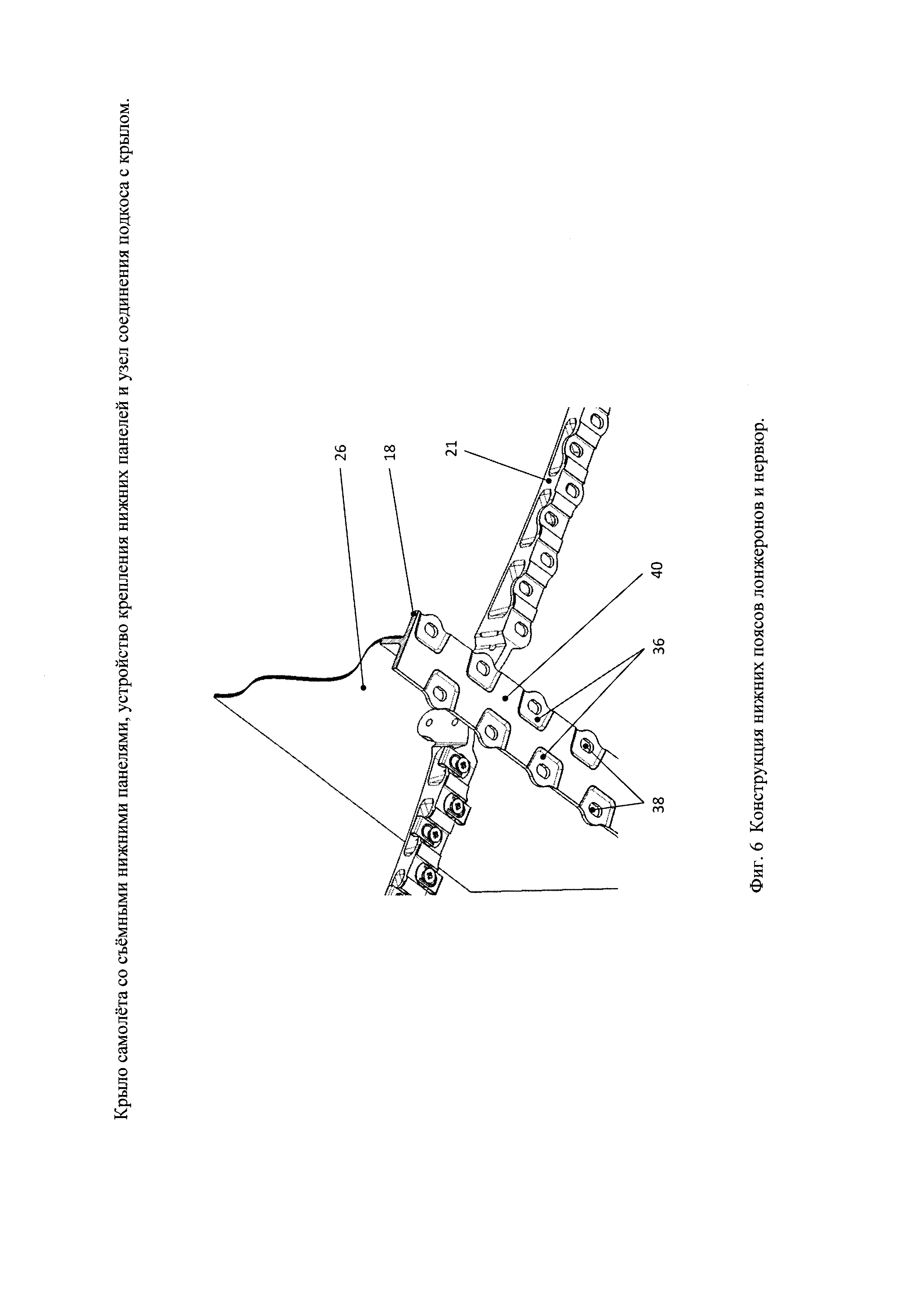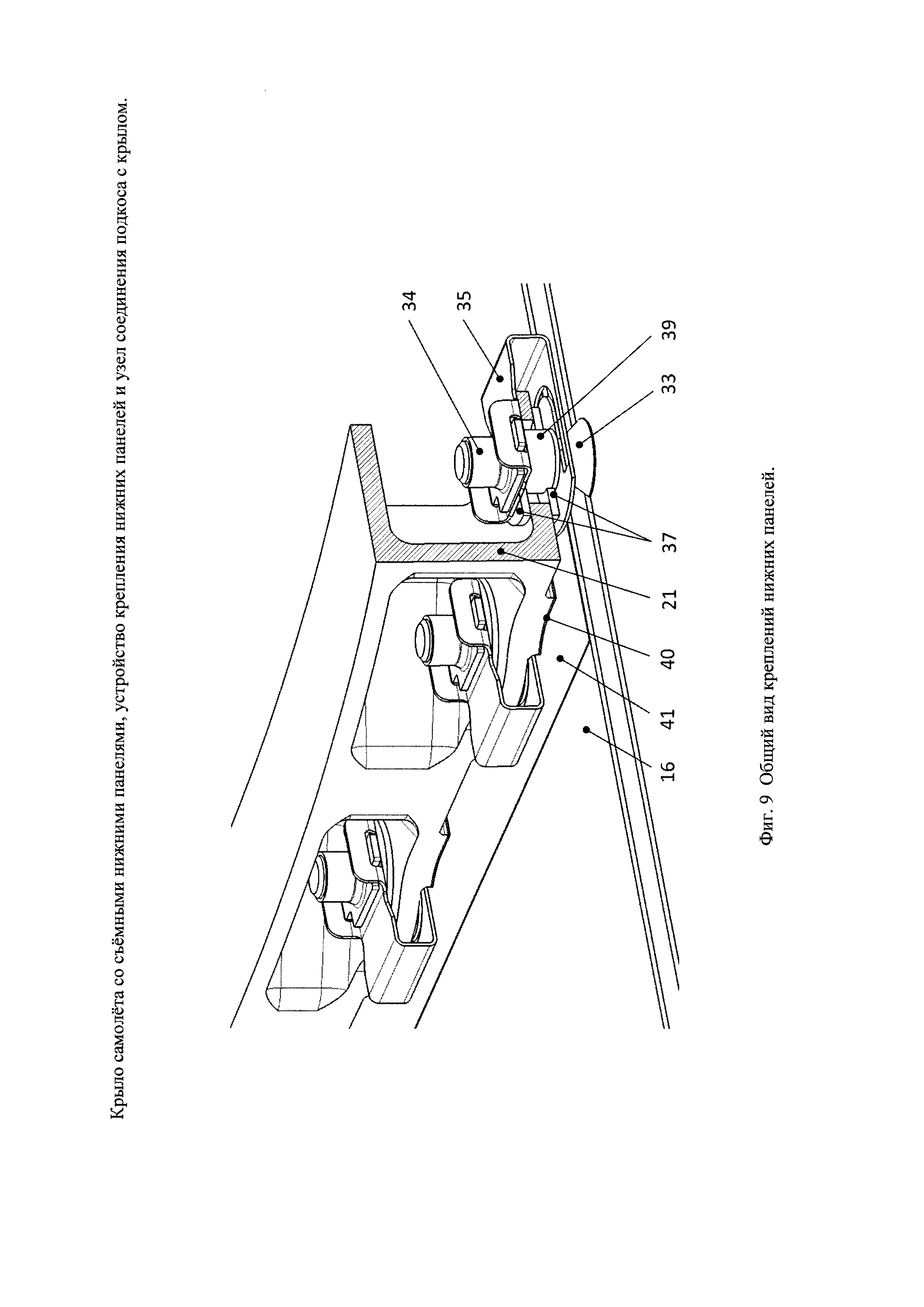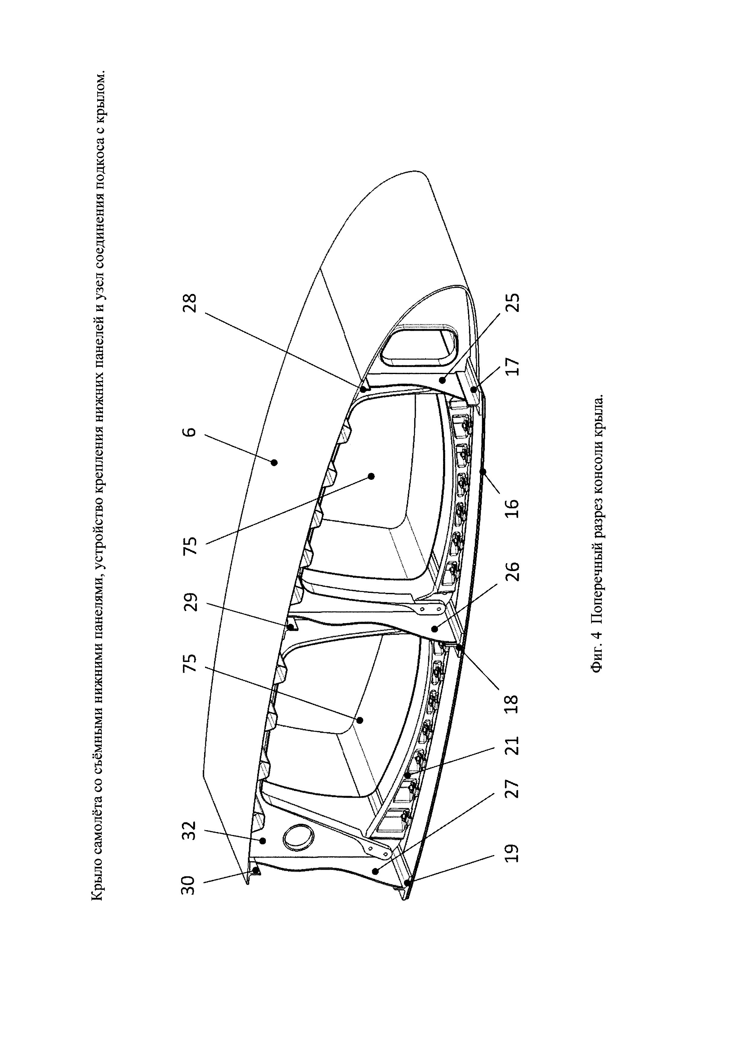 1. Крыло самолета, состоящее из двух соединенных с фюзеляжем консолей, каждая из которых подкреплена подкосом, шарнирно соединенным с лонжеронами крыла и с фюзеляжем, и содержит верхнюю панель, состоящую из несущей обшивки, подкрепленной стрингерами, передний, центральный и задний лонжероны, балочные и рамные нервюры, а также съемные нижние панели, соединенные с нижними поясами лонжеронов и нервюр и выполненные таким образом, что полная жесткость съемных нижних панелей при растяжении или сжатии в продольном направлении крыла летательного аппарата ниже, чем полная жесткость нижних поясов лонжеронов при растяжении или сжатии в указанном направлении, отличающееся тем, что рамные нервюры имеют съемные нижние ветви, а съемные нижние панели соединяются с нижними поясами лонжеронов и нервюр при помощи креплений, обеспечивающих ограниченную подвижность панелей в направлении вдоль крыла и работают на восприятие сдвиговых усилий от кручения крыла, центральный лонжерон крыла имеет Y-образную форму, разветвляется в направлении фюзеляжа на переднюю и заднюю ветви, которые соединяются с передним и задним лонжеронами соответственно. 2. Крыло самолета по п. 1, отличающееся тем, что съемные нижние ветви рамных нервюр выполнены в виде двутавровых балок с волнообразной стенкой. 3. Крыло самолета по п. 1, отличающееся тем, что консоли крепятся к центроплану. 4. Крыло самолета по п. 1, отличающееся тем, что верхняя панель, и/или нижние съемные панели, и/или передний, и/или центральный, и/или задний лонжероны, и/или балочные, и/или рамные нервюры, и/или подкосы выполнены из полимерных композиционных материалов. 5. Крыло самолета по п. 1, отличающееся тем, что верхняя панель, и/или нижние съемные панели и/или передний и/или центральный и/или задний лонжероны и/или балочные и/или рамные нервюры имеют сотовую конструкцию. 6. Устройство для крепления нижних панелей крыла, содержащее крепежные элементы в виде болтов, проходящих через сквозные цилиндрические отверстия в нижних панелях крыла и соединенных резьбовой частью с гайками, установленными на нижних поясах лонжеронов и нервюр, отличающееся тем, что гайки размещены в обоймах-прищепках, установленных в углублениях прямоугольной формы, выполненных в нижних поясах лонжеронов и нервюр со стороны нижних панелей; между щеками обойм-прищепок и поверхностями нижних поясов лонжеронов и нервюр установлены шайбы из металлофторопластовой ленты таким образом, что шайбы располагаются фторопластовым слоем к поверхности пояса лонжерона (нервюры) и металлической стороной к поверхности обоймы-прищепки; углубления, выполненные в поясах лонжеронов и нервюр, имеют глубину не менее суммарной толщины лапки обоймы-прищепки и металло-фторопластовой шайбы, установленной между лапкой обоймы-прищепки и поверхностью углубления на нижнем поясе лонжерона (нервюры), обращенной к нижней панели крыла, гайки, размещенные в обоймах-прищепках, выполнены плавающими и самоконтрящимися; сквозные цилиндрические отверстия в съемных нижних панелях выполнены с зенковкой с нижней стороны панелей, а болты, проходящие через сквозные цилиндрические отверстия в нижних панелях, выполнены с потайной головкой; в нижних поясах лонжеронов и нервюр выполнены сквозные пазы прямоугольной, скругленной на концах формы в плане, ориентирован