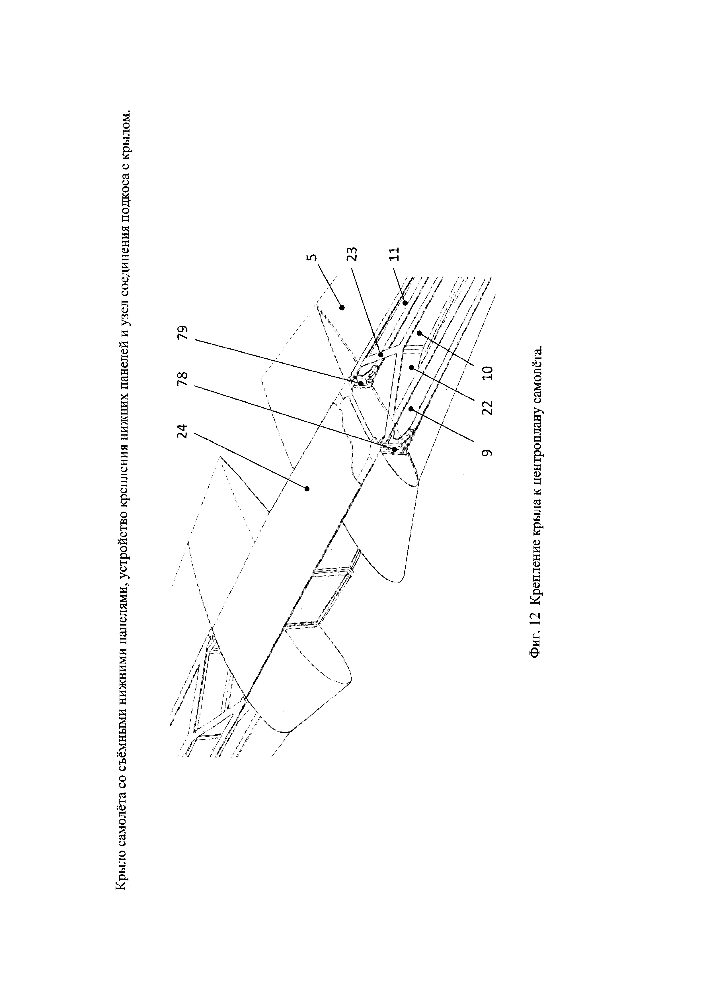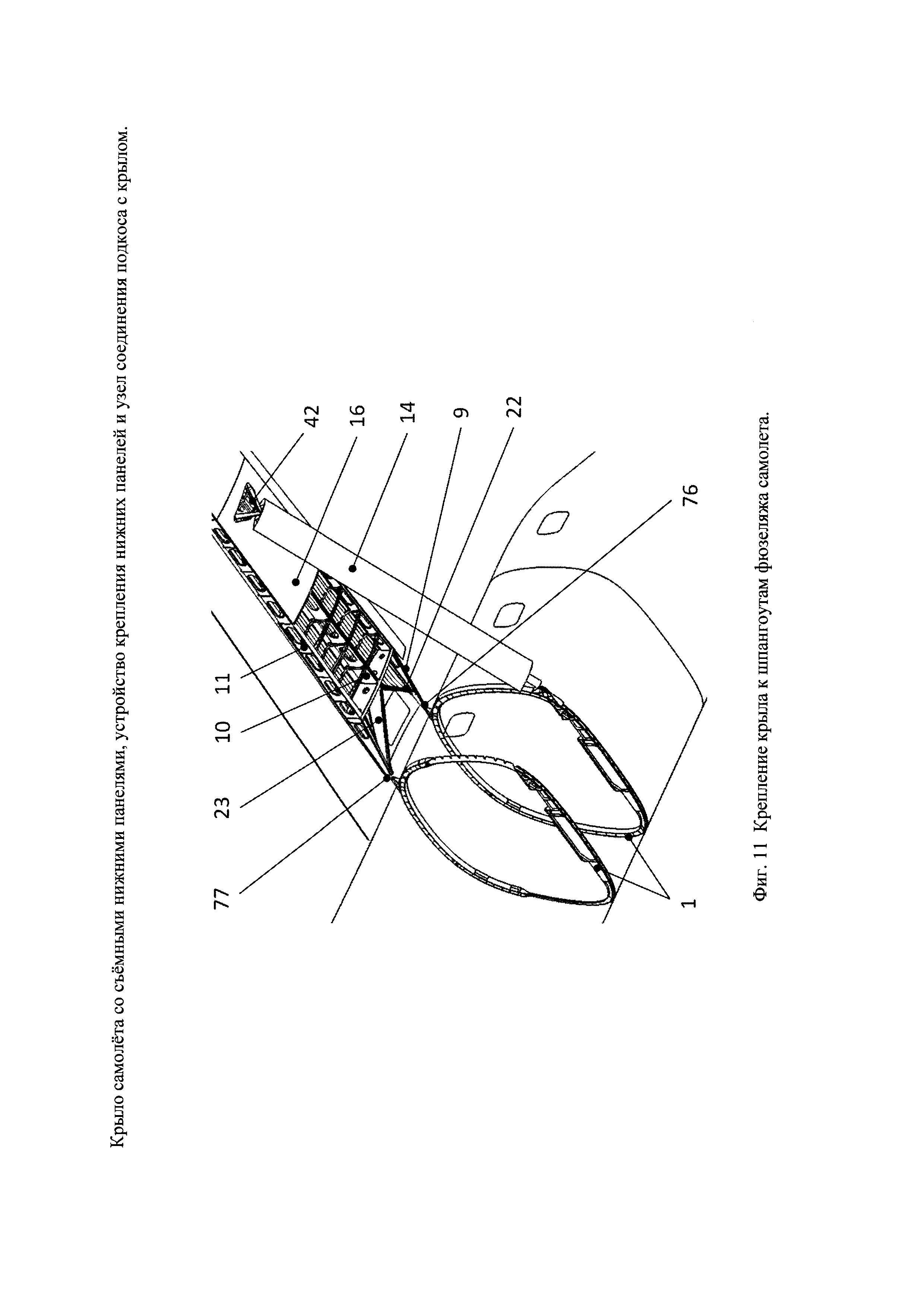 Крыло самолета состоит из двух соединенных с фюзеляжем консолей, каждая из которых подкреплена подкосом, и содержит верхнюю панель, передний, центральный и задний лонжероны, балочные и рамные нервюры, а также съемные нижние панели. Нижние панели соединяются с нижними поясами лонжеронов и нервюр при помощи креплений, обеспечивающих ограниченную подвижность панелей в направлении вдоль крыла. Рамные нервюры имеют съемные нижние ветви, центральный лонжерон разветвляется в направлении фюзеляжа на переднюю и заднюю ветви. Устройство для крепления нижних панелей крыла содержит болты, проходящие через отверстия в нижних панелях крыла, и сквозные пазы в нижних поясах лонжеронов и нервюр, соединенные с плавающими гайками, размещенными в обоймах прищепках, установленных в углублениях на нижних поясах лонжеронов и нервюр. Узел соединения подкоса с крылом содержит опорную балку с цапфами, закрепленными в передней, центральной и задней опорах на лонжеронах крыла, переднее и заднее внешние звенья, центральное звено, переднее и заднее внутренние звенья. Группа изобретений направлена на снижение массы крыла, обеспечение надежности и прочности конструкции крыла. 3 н. и 16 з.п. ф-лы, 20 ил.