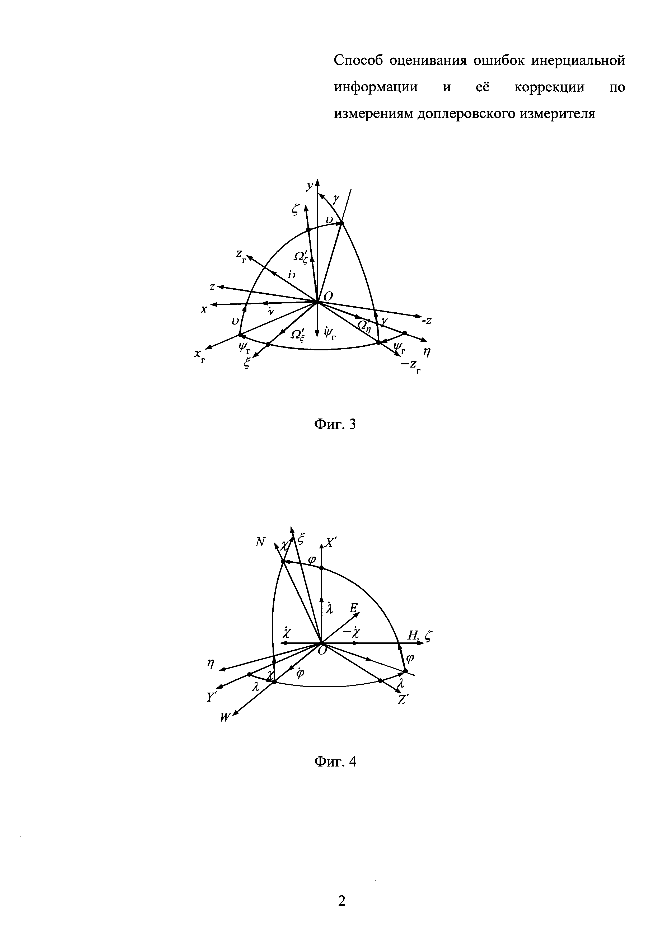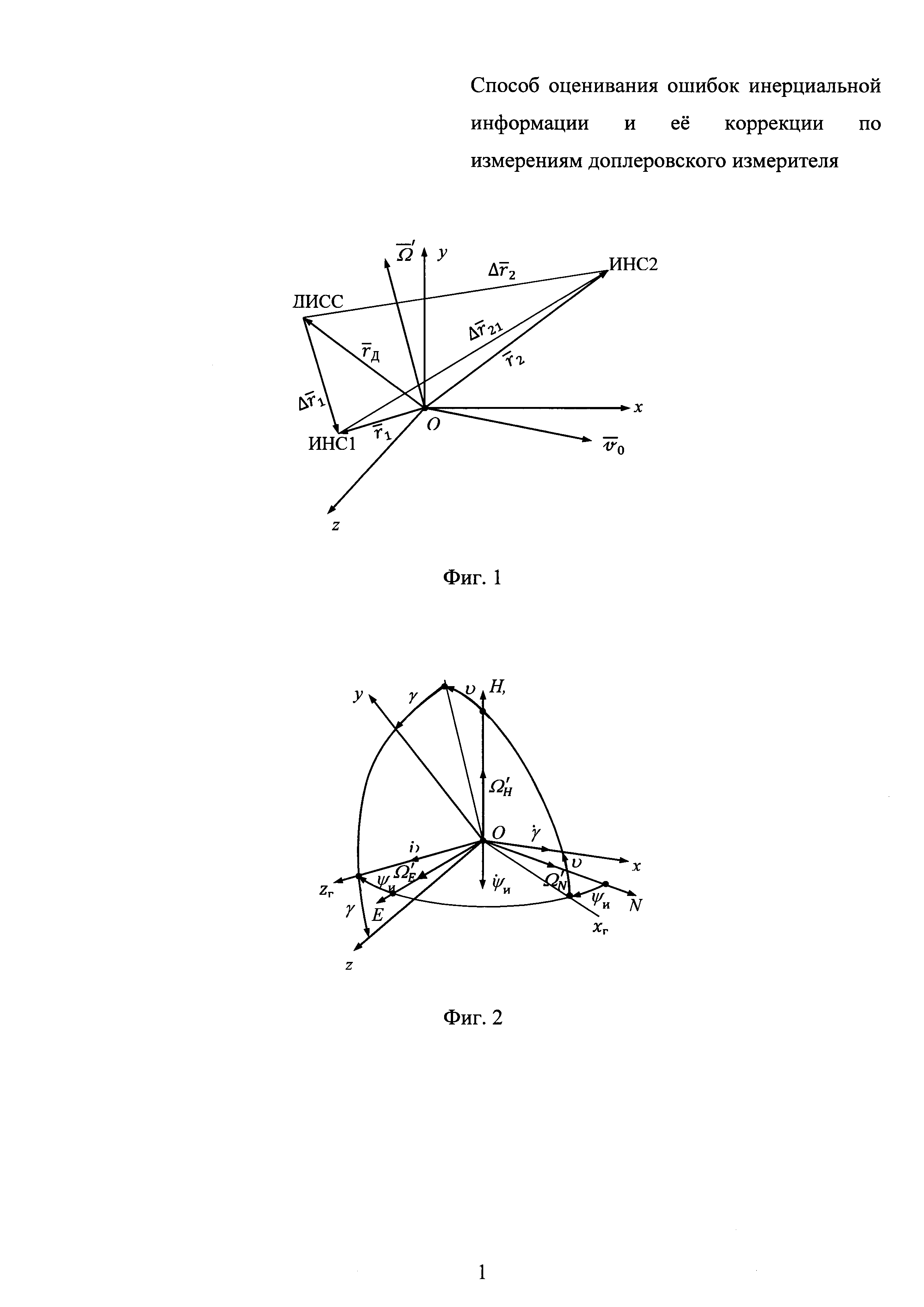 Изобретение относится к области комплексных навигационных систем управления и наведения летательных аппаратов (ЛА). Известен способ оптимального оценивания и коррекции инерциальной информации по измерениям горизонтальных составляющих абсолютной линейной скорости в проекциях на оси опорного трехгранника гироплатформы (ГП) инерциальной навигационной системы (ИНС). Его описание приведено в разделе «Дополнение к задаче выставки на подвижном основании», написанном Л.Г. Клибановым и В.Л. Леонидовым, известной монографии А. Липтона «Выставка инерциальных систем на подвижном основании», «Наука», М., 1971 г. [1]. В нем рассматривается редуцированная процедура оптимального оценивания в задаче согласования ГП двух ИНС - выставляемой и базовой. Рассмотрение ведется применительно к решению задачи начальной выставки ИНС ракеты по скоростной информации, измеряемой ИНС носителя. Однотипность измеряемых сигналов, полная адекватность математического описания модели ошибок ИНС и необходимость использования одних и тех же методических приемов повышения наблюдаемости делают рассматриваемый способ по своей технической сущности достаточно близким к предлагаемому способу коррекции по измерениям доплеровского измерителя составляющих скорости (ДИСС), что позволяет принять его в качестве наиболее близкого аналога. Формализуя приведенное в [1] его описание, приведем его в следующем виде: Способ оценивания ошибок инерциальной информации и ее коррекции по измерениям ДИСС основанный на процедуре оптимальной фильтрации и идентификации скоростных сигналов измерения, которые формируют путем сравнения горизонтальных составляющих абсолютной линейной скорости, измеренных ИНС, и аналогичных составляющих, сформированных по измерениям ДИСС, при этом само оценивание параметров состояния ИНС осуществляют посредством идентификации сигналов измерения, которую реализуют в соответствии с математическим описанием исходной системы, при этом полет организуют таким образом, что после 270 секунд горизонтального прямолинейного полета, осуществляют маневр, типа «змейки», координированного или боевого разворотов, после чего активную фазу процедуры оптимальной фильтрации и идентификации дискретной последовательности сигналов измерения приостанавливают и фильтр-идентификатор переводят в режим долгосрочного - до следующего сеанса коррекции, прогноза с начальными условиями, определяемыми значениями оценок на момент завершения активной фазы оценивания, и текущими значениями параметров модели сообщения, при этом коррекцию выходных параметров ИНС - составляющих абсолютной линейной скорости, вследствие закрытости и недоступности ключевых управленческих входов каналов коррекции ИНС, осуществляют в разомкнутой схеме с использованием текущих прогнозируемых значений оценок. Основными недостатками наиболее близкого аналога являются: - отсутствие в математической модели ошибок ИНС дифференциальных уравнений, описывающих геометрию относительного размещения комплексируемых систем; - при формировании матрицы наблюдения системы не учитываются погрешности Δϕ, Δλ, Δχ счисления основной тройки навигационных параметров в функции малых углов αх, αy, αz ухода реальной ГП ИНС; - при выполнении традиционных для рассматриваемого режима коррекции манев