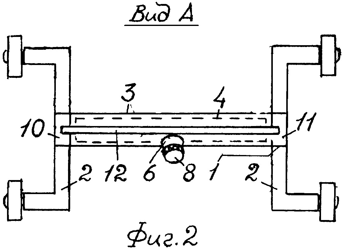 Изобретение относится к области защиты медицинского персонала от ионизированного излучения, а именно к устройствам наблюдения с защитой наблюдателя при рентгеновских исследованиях и в гамма-терапии. Известна ширма для защиты медицинского персонала от рассеянного рентгеновского излучения, содержащая рамку, закрытую экраном, изготовленного из материала, содержащего смесь тяжелых редкоземельных элементов. Рамка с экраном закреплена на подставке (Основы рентгено-диагностической техники. / Под ред. Н.Н.Блинова. - М.: Медицина, 2002, с.327) [1]. Недостатком известного устройства [1] является отсутствие смотрового окна. Известна также ширма со смотровым окном, изготовленная из просвинцованной резины, предназначенная для защиты медицинского персонала от рассеянного рентгеновского излучения (Медицинская техника для лучевой диагностики (Справочник). - М.: НПЦ «Интелфорум», 2004, с.85) [2]. Недостатком этого устройства [2] является небольшой размер смотрового окна, что ограничивает поле зрения рентгенолаборанта. Наиболее близким по конструкции к заявляемому объекту является защитная ширма фирмы Nuclear Associates, имеющая стальной корпус в виде прямоугольной рамки, закрытой экраном из материала, содержащего смесь тяжелых редкоземельных элементов. Основание рамки закреплено на тележке, а над верхней частью рамки установлено просмотровое просвинцованное стекло (http://www.inovision.com and http://www.nucl.com) [3]. Данное устройство [3] было выбрано нами в качестве прототипа. Известное устройство [3] предназначено для защиты медицинского персонала в процессе рентгеноскопии и не может быть использовано для защиты при гамма-терапевтических процедурах, когда рассеянное излучение содержит большое число жестких квантов, имеющих высокую проникающую способность. Целью настоящего изобретения является создание универсальной ширмы для защиты медицинского персонала как от рассеянного рентгеновского, так и рассеянного гамма-излучения, другими словами, расширение эксплуатационных возможностей устройства. Данная цель достигается тем, что в защитной ширме, содержащей металлический корпус прямоугольной формы, заполненный веществом с высоким атомным номером, основание которого закреплено на тележке, а верхняя часть соединена со смотровым стеклом, изготовленным из тяжелого флинта, корпус ширмы имеет полость в форме узкого прямоугольного параллелепипеда, заполненную шариками из материала с высоким атомным номером, причем на верхней и нижней стенках полости находятся входной и выходной патрубки, снабженные пробками, диаметр которых превышает диаметр шариков не менее чем на 5,0-6,0 мм. Проведенные исследования по патентным и научно-техническим информационным источникам показали, что конструкция предлагаемой защитной ширмы неизвестна и не следует явным образом из изученного уровня техники, т.е. соответствует критериям «новизна» и «изобретательский уровень». Предлагаемая защитная ширма несложна по конструкции, удобна в эксплуатации и может быть использована при рентгеноскопии и при гамма-терапии. Следовательно, заявляемое техническое решение является доступным для клинического применения. Далее предлагаемое изобретение поясняется чертежами, где на фиг.1 показана конструкция защитной ширмы, а на фиг.2 - ее вид сверху (по стрелке А фиг.1). Защитная ширма имеет стальную раму 