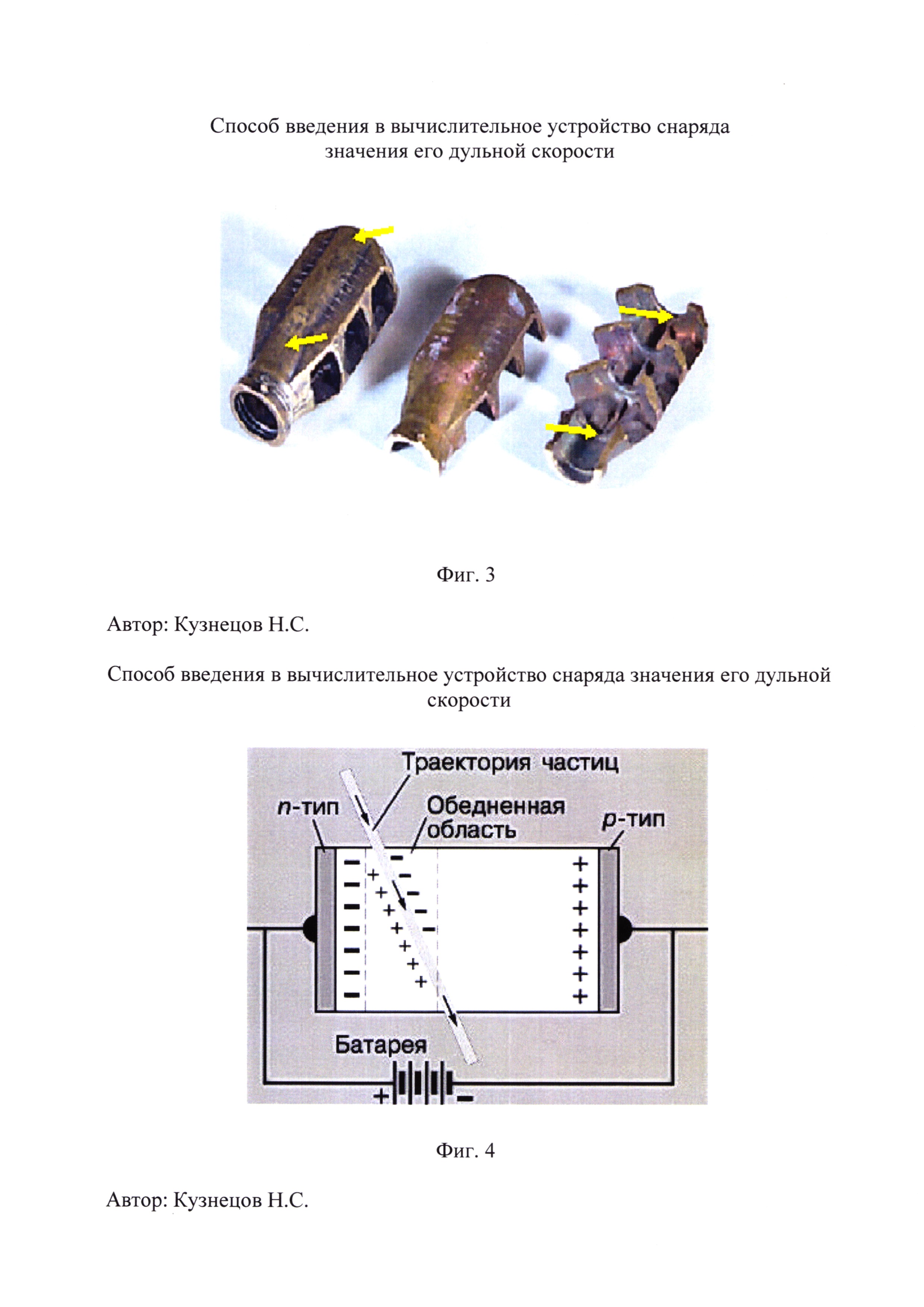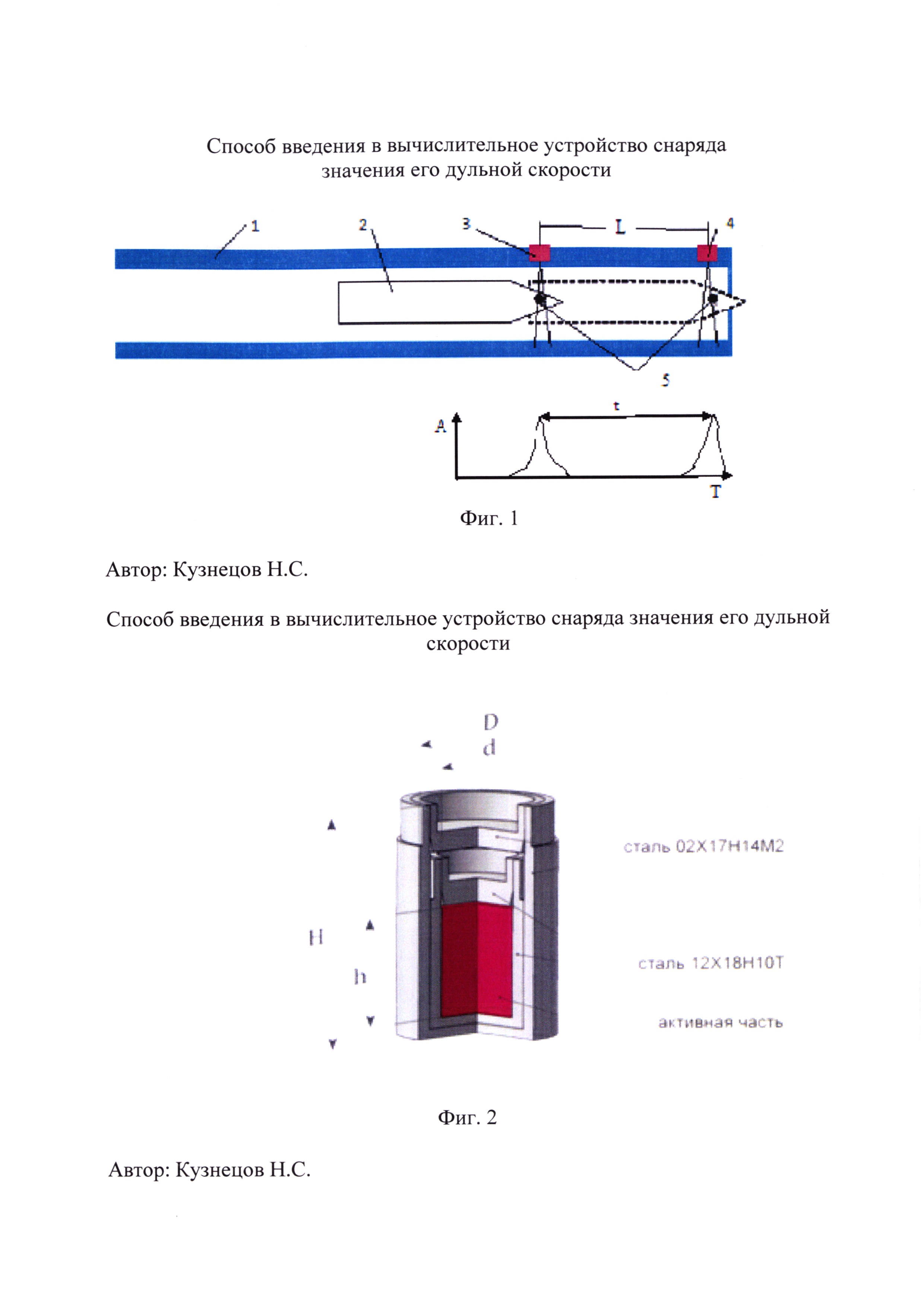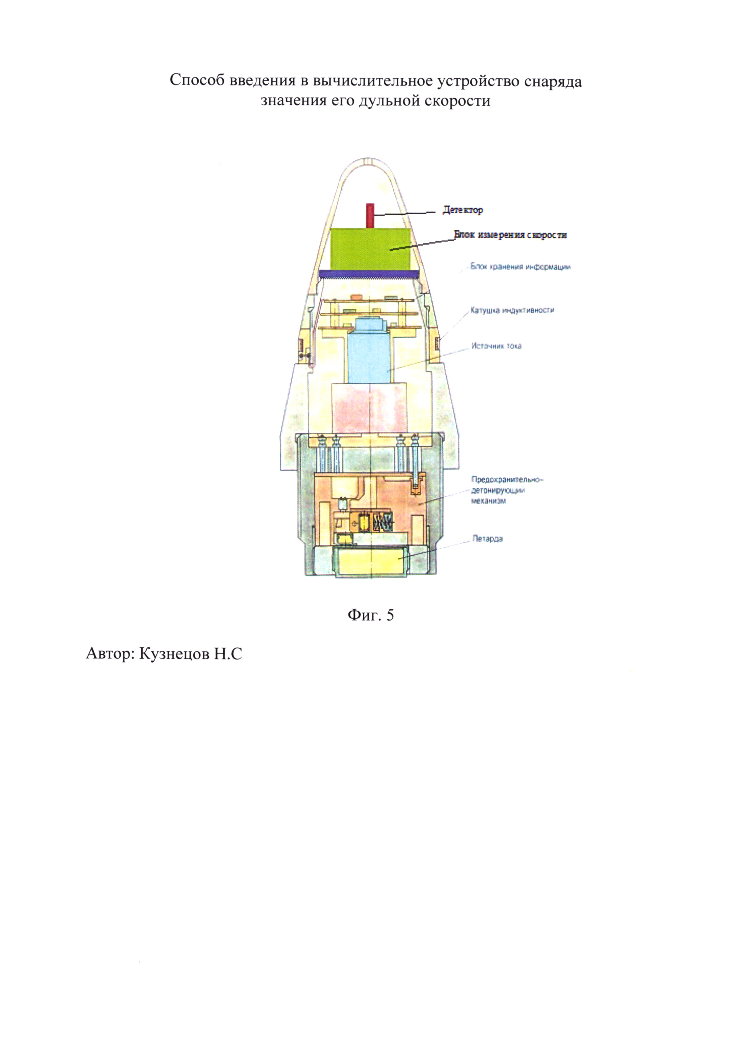 Способ введения в вычислительное устройство снаряда значения его дульной скорости V0, заключающийся в том, что измеряют промежуток времени t прохождения снарядом мимо фиксированных точек на конечном участке ствола орудия, расположенных на расстоянии L друг от друга, с помощью соотношения V0=L/t вычисляют начальную скорость, полученное значение скорости вводят в вычислительное устройство снаряда, отличающийся тем, что в качестве фиксированных точек на стволе орудия используют зоны ствола или дульного тормоза, в которые устанавливают локальные источники ионизирующего излучения, в качестве промежутка времени принимают промежуток времени между появлением электрического тока в устройстве для регистрации ионизирующего излучения, установленном в осевой зоне снаряда или взрывателя.