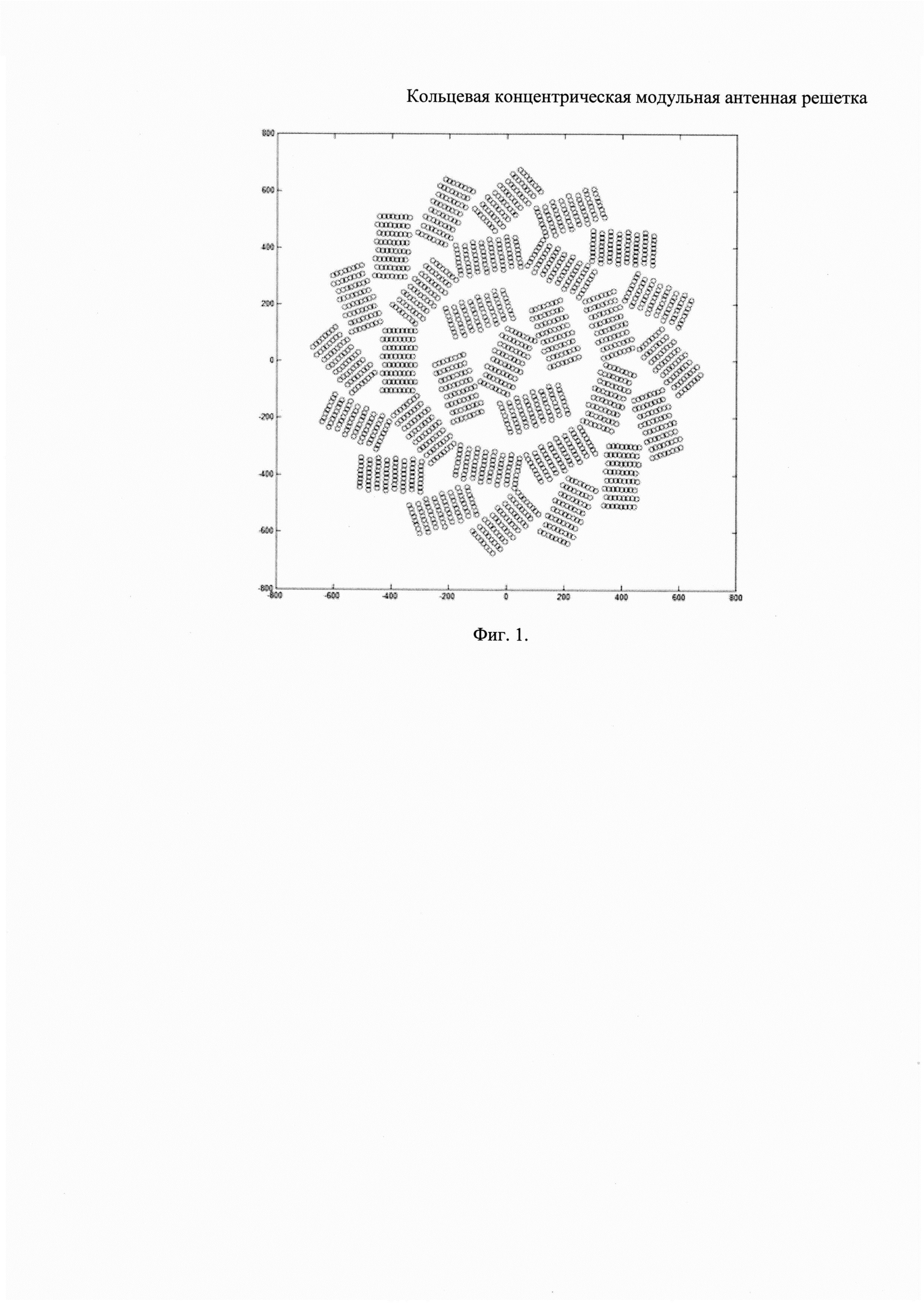 Изобретение относится к антенной технике, в частности к проектированию активных фазированных антенных решеток (АФАР) и цифровых антенных решеток (ЦАР). Изобретение может использоваться в качестве приемной или передающей антенны с управляемой диаграммой направленности в различных радиотехнических системах. Известна кольцевая фазированная антенная решетка, обеспечивающая широкодиапазонную работу при одном тракте питания. Кольцевая фазированная антенная решетка состоит из N плоских элементов (ПЭ), расположенных попарно симметрично по диагоналям апертуры КФАР /1/. Приведены соотношения размеров элементов, при которых реализуется наибольшая диапазонность КФАР при ее питании от одного фидерного тракта. К недостаткам антенной решетки можно отнести малое количество элементов и невозможность сканирования в широком диапазоне углов. Известна кольцевая антенная решетка, состоящая из круглых подрешеток, расположенных через одинаковое угловое расстояние по одной окружности /2/. Основным недостатком данной решетки является то, что использование одного кольца не позволяет достичь низкого уровня боковых лепестков и широкого сектора сканирования. Известна кольцевая концентрическая антенная решетка /3/. Представленная кольцевая концентрическая антенная решетка содержит излучатели, располагающиеся по концентрическим окружностям, при этом - на верхней стенке радиального волновода, на входе которого установлена поляризационная секция, размещены излучатели с согласующими ступенчатыми трансформаторами, а расстояние между стенками волновода составляет четверть длины волны, при этом для снижения уровня бокового излучения с внутренней стороны антенной решетки по окружности проложена радиопоглощающая ткань и определена схема размещения излучателей в антенной решетке. Недостатком данной антенной решетки является конструктивная сложность, сложность изменения расположения элементов для достижения минимального УБЛ. Известна активная фазированная антенная решетка, содержащая излучатели, размещенные на экране и соединенные соответственно с приемопередающими модулями, при этом излучатели расположены равномерно не эквидистантно, а приемопередающие модули выполнены с возможностью цифровой обработки сигнала на несущей частоте, причем излучатели могут располагаться по концентрическим окружностям /4/. Основными недостатками этой антенной решетки являются усложненная распределительная система, достаточно высокое боковое и обратное излучением, увеличенные габаритные размеры антенного полотна и увеличенную массу, небольшую вибропрочность. Наиболее близкой по достигаемому результату и технической сущности является фазированная антенная решетка, позволяющая увеличить расстояние между излучателями, не ухудшив направленные свойства при сканировании, а, следовательно, и характеристики разрешения всей радиосистемы /5/. Антенная решетка содержит N антенн, N-канальный управляемый фазовращатель и сумматор, причем N антенн выполнены всенаправленными и расположены эквидистантно. Представлены формулы для расчета положения фазовых центров каждой из N антенн. Однако, в рассматриваемой схеме построения антенной решетки, возможен обзор пространства только в азимутальной плоскости. Она также обладает достаточно высоким боко