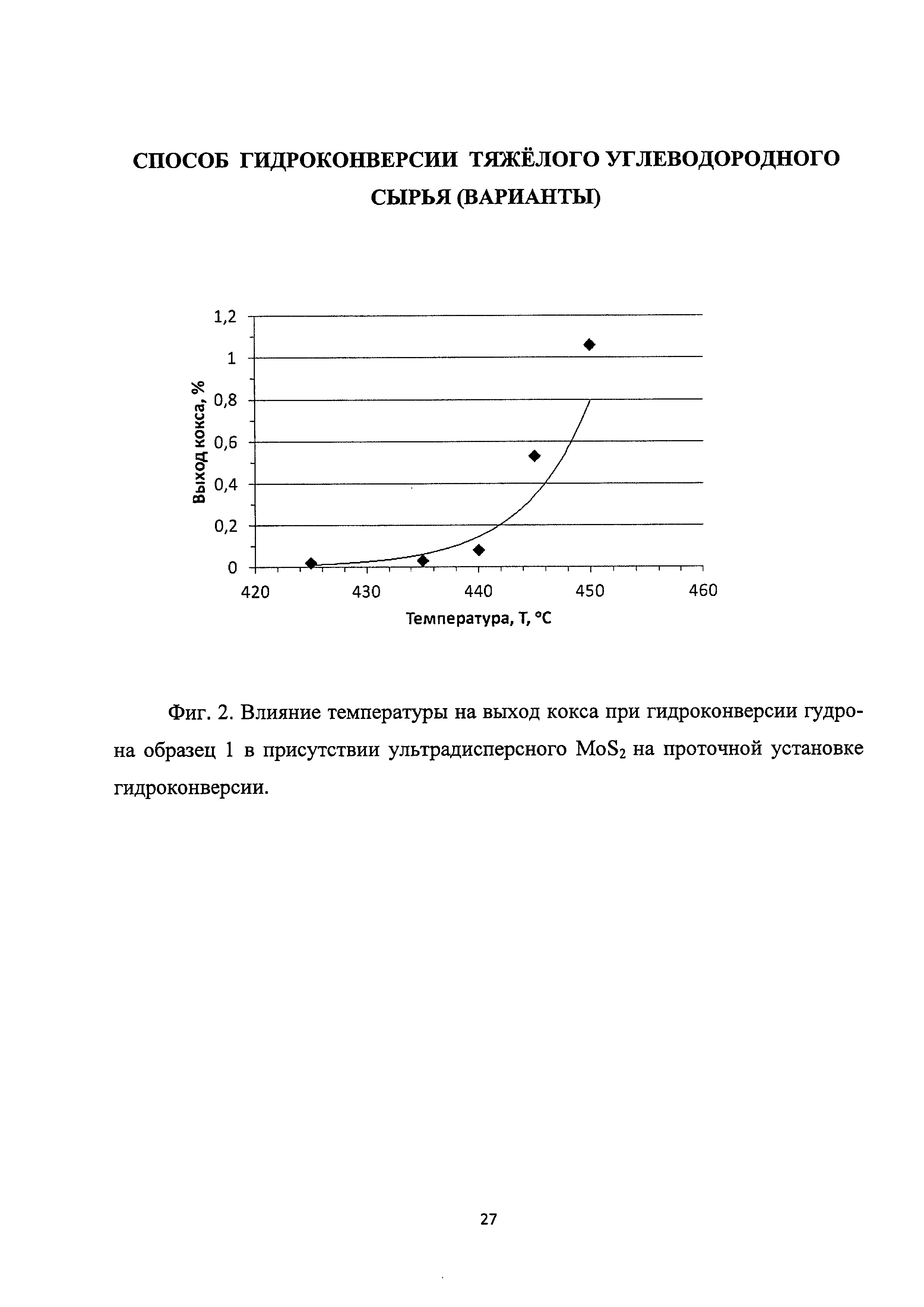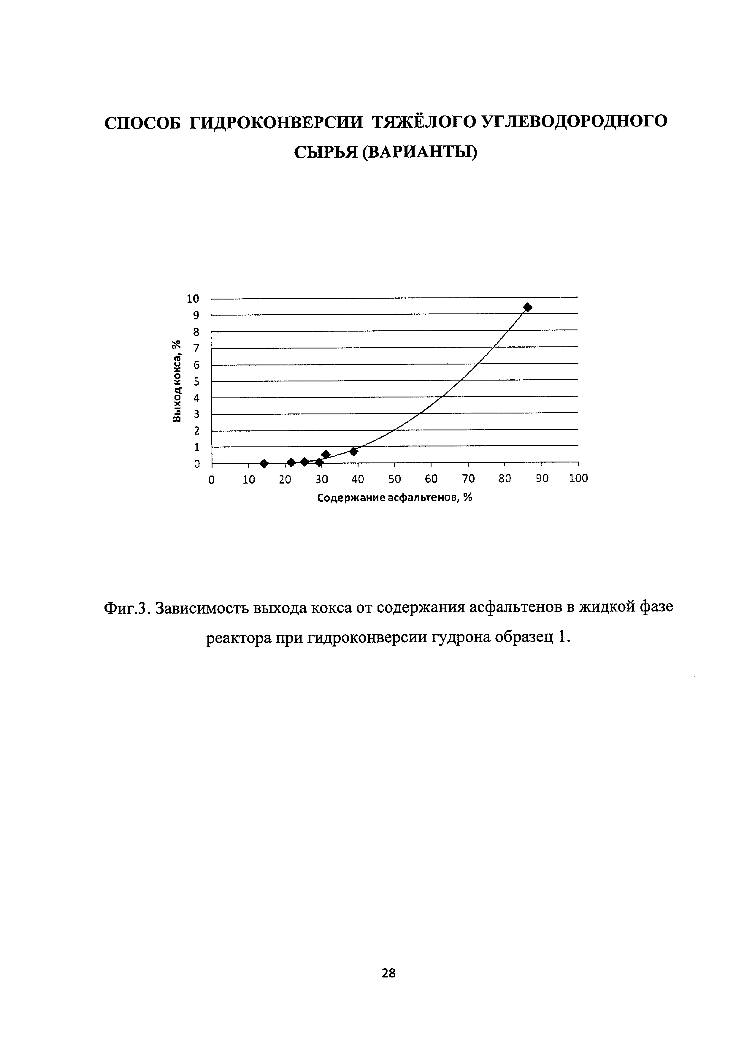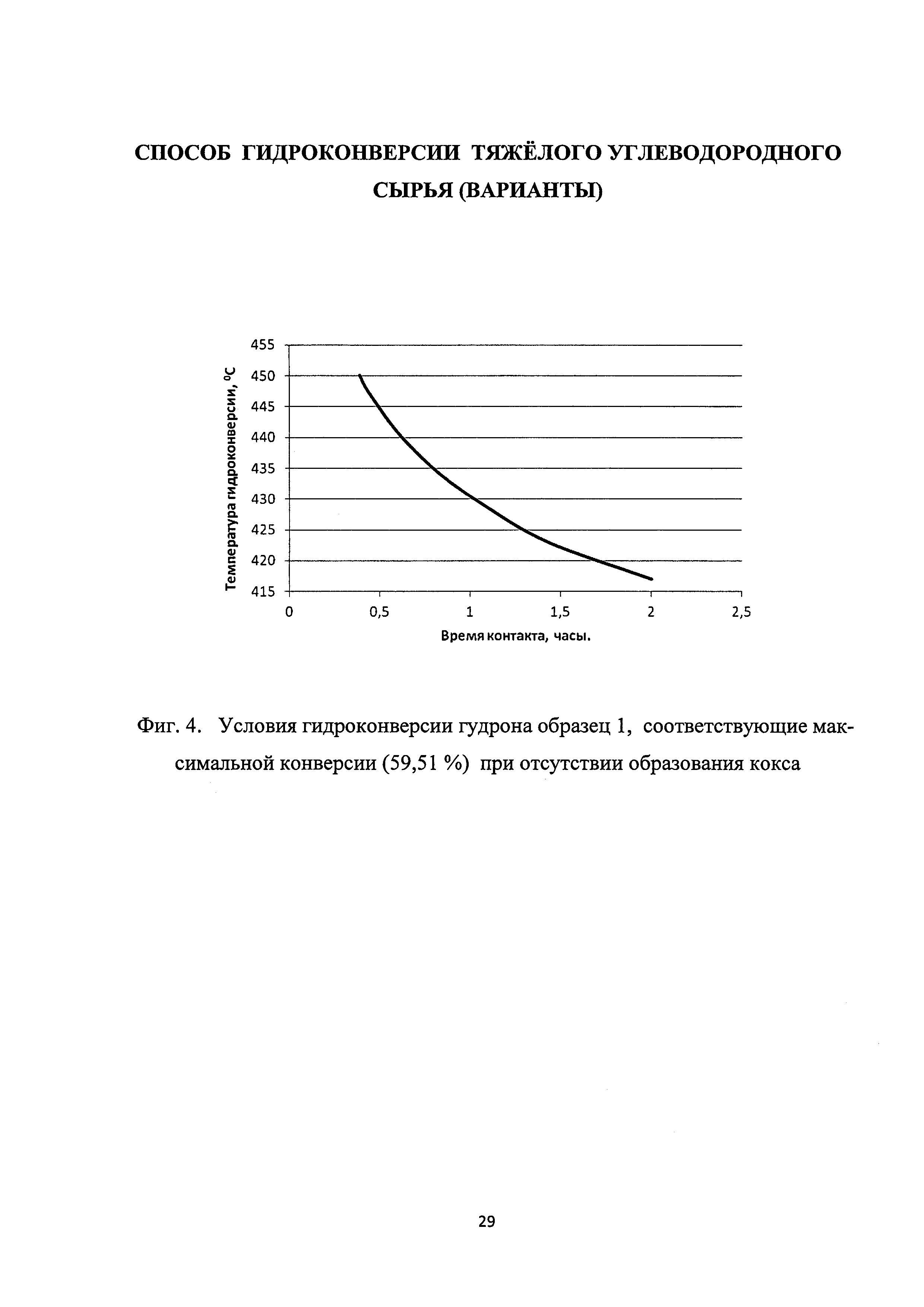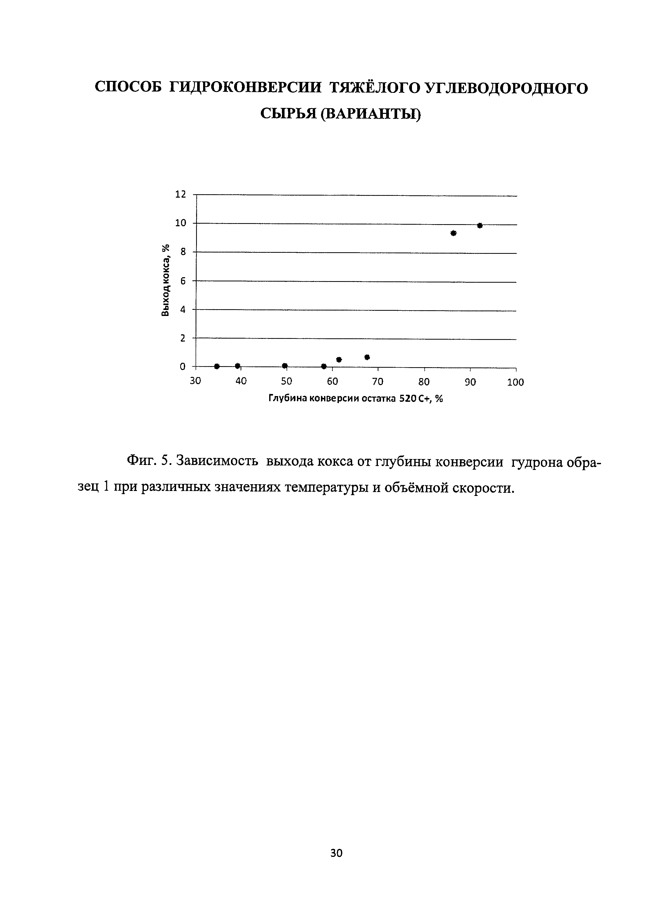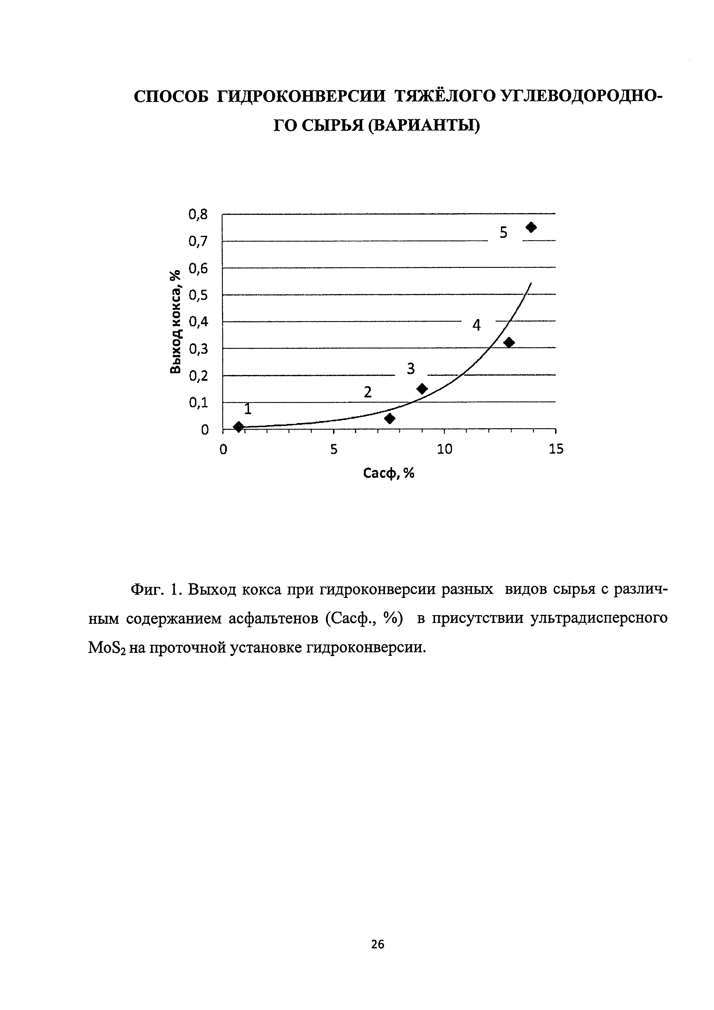 Настоящее изобретение относится к способам переработки углеводородных масел в атмосфере водорода в присутствии дисперсных катализаторов и может быть использовано при переработке тяжелого углеводородного сырья (ТУС) в жидкие углеводородные продукты с более низкой температурой кипения, чем исходное сырье. Для гидроконверсии ТУС с получением жидких углеводородных смесей готовят водный раствор прекурсора катализатора на основе соединения молибдена, эмульгируют его в ТУС, смешивают подготовленное сырье, содержащее эмульгированный прекурсор катализатора, с водородсодержащим газом, нагревают полученную смесь до сульфидирования прекурсора катализатора, проводят гидроконверсию в восходящем потоке сырья и разделяют полученные продуктов в системе сепараторов. Предварительно определяют содержание в сырье остатка вакуумной дистилляции с температурой начала кипения в интервале 500-540°С - С, содержание С, Н, N, S, О в сырье и С, H, N, S, Oв асфальтенах, % мас. Исходя из полученных значений, рассчитывают объемную скорость сырья V, с, и температуру Т, К, по следующим формулам:, F=-2,2961ϕ+91,565, где F- предельное критическое значение глубины конверсии, при превышении которого гидроконверсия сопровождается образованием кокса, % мас., А - предэкспоненциальный множитель в уравнении Аррениуса, τ - время контакта, с, рассчитываемое по формуле: τ=1/V, Е- энергия активации, Дж/моль, ϕ - характеристика сырья, рассчитываемая по формуле: ϕ=(δ- δ)C, δи δ- параметры растворимости Гильдебранда асфальтенов и среды соответственно, МПа, рассчитываемые по уравнениям: δ=-0,0004 β+ 0,022 β+ 20,34, δ=-0,0004 β+ 0,022 β+ 20,34, β= 50(Н-0,125О- 0,2143N-0,0625S)/(0,0833C-1), β= 50(H- 0,125O- 0,2143N-0,0625S)/(0,0833C-1). Для определения энергии активации Епроводят два опыта гидроконверсии при двух различных значениях температуры Т1 и Т2, К, определяют содержание остатка вакуумной дистилляции с температурой начала кипения в интервале 500-540°С в продуктах гидроконверсии при температуре Т1 и Т2 - Cи Ссоответственно, % мас., рассчитывают константы скорости kи k: k=(lnC- lnC)/τ, k=(lnC- lnC)/τ, и рассчитывают энергию активации по формуле: Е=R (lnk- lnk)/(1/T- 1/Т), где R - универсальная газовая постоянная. Затем проводят гидроконверсию сырья при выбранных значениях V и Т, соответствующих F. В варианте осуществления изобретения содержание С, H, N, S, Oв асфальтенах не определяют, βне рассчитывают, а δпринимают равным 20,3, рассчитывая ϕ по формуле: ϕ=(20,3 - δ)C. Коксовое число Cмогут определять расчетом по формулам: C= 0,7998 α- 8,1347 α+ 35,698 α - 43,251, α = С/6 - Н+N/14. Технический результат - достижение максимальной степени конверсии при минимальном коксообразовании простым способом с проведением малого числа опытов. 2 н. и 2 з.п. ф-лы, 9 табл., 4 пр., 5 ил.