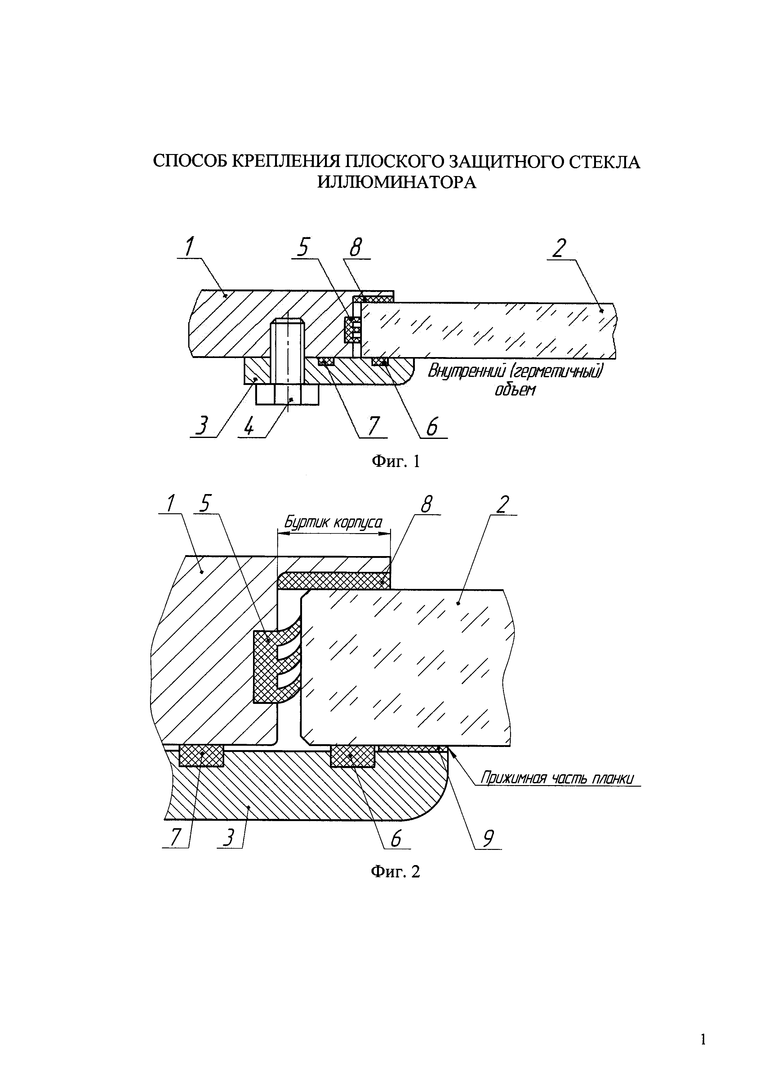 1. Способ крепления плоского защитного стекла иллюминатора, включающий установку стекла в оправу, его фиксацию по контуру планкой, герметизацию, отличающийся тем, что оправой защитного стекла иллюминатора при его установке на летательный аппарат служит корпус летательного аппарата, при этом на буртики корпуса изнутри наносят слой герметика или изолирующего покрытия толщиной не более 3 мм, стекло устанавливают в корпус изнутри до упора в буртики и фиксируют изнутри съемной контурной планкой с плоской прижимной частью, а герметизацию стыков между стеклом, корпусом и планкой осуществляют с помощью упругих прокладок и герметика. 2. Способ крепления плоского защитного стекла иллюминатора по п. 1, отличающийся тем, что съемной контурной планкой одновременно фиксируют не менее двух расположенных рядом защитных стекол. 3. Способ крепления плоского защитного стекла иллюминатора по п. 1, отличающийся тем, что съемную контурную планку закрепляют изнутри корпуса с помощью винтов. 4. Способ крепления плоского защитного стекла иллюминатора по п. 1, отличающийся тем, что герметизацию осуществляют посредством упругой прокладки, которую размещают между боковой поверхностью защитного стекла и корпусом. 5. Способ крепления плоского защитного стекла иллюминатора по п. 4, отличающийся тем, что упругая прокладка содержит лабиринтное уплотнение, которое ориентируют в сторону защитного стекла. 6. Способ крепления плоского защитного стекла иллюминатора по п. 1, отличающийся тем, что герметизацию осуществляют посредством упругой прокладки, которую размещают между внутренней плоской поверхностью защитного стекла и прижимной частью контурной планки. 7. Способ крепления плоского защитного стекла иллюминатора по п. 6, отличающийся тем, что дополнительно герметизацию осуществляют посредством упругой прокладки, которую размещают между внутренней поверхностью корпуса и прижимной частью контурной планки, при этом винты крепления планки к корпусу располагают снаружи пояса герметизации. 8. Способ крепления плоского защитного стекла иллюминатора по п. 1, отличающийся тем, что герметизацию осуществляют посредством герметика, который размещают между защитным стеклом и буртиками корпуса, прижимную часть которых выполняют параллельно плоскости фаски или внешней поверхности стекла. 9. Способ крепления плоского защитного стекла иллюминатора по пп. 1, 8, отличающийся тем, что герметик размещают между защитным стеклом и прижимной частью контурной планки. 10. Способ крепления плоского защитного стекла иллюминатора по пп. 1, 8, 9, отличающийся тем, что герметик размещают между боковой поверхностью защитного стекла и корпусом. 11. Способ крепления плоского защитного стекла иллюминатора по п. 1, отличающийся тем, что размещение герметика производят при его жидком состоянии с последующим отверждением и удалением натеков.