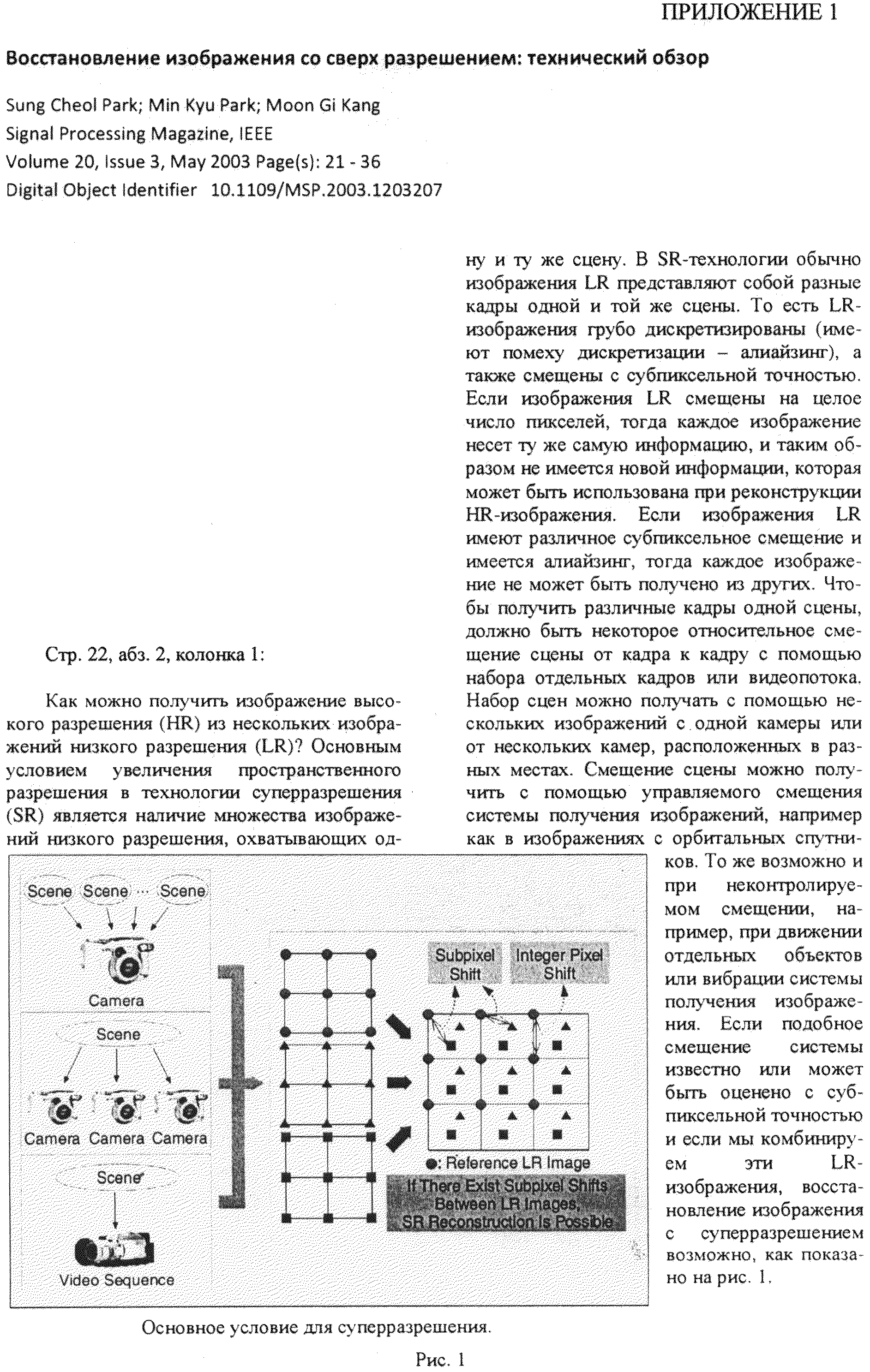 Предлагаемое изобретение может быть использовано в системах передачи телевизионных изображений, например, с помощью приборов, выполненных на основе твердого тела с электрической разверткой и с электрическим сканированием. Известен способ повышения разрешающей способности видеосистем (см., например, патент США №4038690 «Система формирования видеосигнала на ПЗС», МПК H04N 3/14, опубл. 26.07.1977 г. ), включающий использование двух матриц ПЗС, выполненных с зазорами между пикселями, взаимное расположение которых предусматривает возможность смещения по горизонтали пикселей одной из матриц относительно другой на половину ширины пикселя. Известный способ потенциально обеспечивает возможность повышения разрешающей способности такой телевизионной камеры по горизонтали вдвое по сравнению с телекамерой на одной матрице ПЗС, однако при практической ее реализации возникает проблема поддержания высокой точности относительного смещения двух матриц ПЗС, а кроме того, наличие зазоров между элементами в матрицах ПЗС вызывает потери части воспринимаемого матрицами светового потока и, следовательно, уменьшение чувствительности телекамеры. Наиболее близким аналогом-прототипом является способ повышения разрешающей способности видеосистем, основанный на использовании субпиксельного сдвига в соседних кадрах изображения одного и того же объекта (см., например, Восстановление изображения со сверх разрешением: технический обзор (Park S.Ch., Park М.K. Kang M.Gi. Super-resolution image reconstruction: a technical overview. Signal Processing Magazine. IEEE. Volume 20. Issue 3. May 2003. Page(s): 21-23. Digital Object Identifier 10.1109/MSR. 2003.12003207), см. также приложение 1). Данный способ обеспечивает возможность повышения разрешения и по горизонтали, и по вертикали, однако при его использовании возникает целый ряд заранее не решаемых вопросов: как получать смещенные изображения, сколько кадров необходимо, как определить величину смещения между кадрами, как бороться с шумом, возникающим от дублирования информации, не теряя получаемую детальность, какова будет кратность увеличения разрешения и т.д. Задача изобретения состоит в разработке способа, обеспечивающего двукратное повышение разрешающей способности видеосистем и снимающего поставленные выше вопросы. Сущность изобретения состоит в том, что в способе повышения разрешающей способности видеосистем, основанном на использовании субпиксельного сдвига матричного изображения в соседних кадрах при съеме информации, четные кадры снимают со сдвигом по диагонали на полпикселя относительно нечетных кадров и снятые кадры запоминают, после чего размеры этих кадров увеличивают путем введения в их матричную структуру нулевых столбцов и строк и эти увеличенные кадры тоже запоминают, а потом производят формирование последовательности выходных сигналов путем одновременного или последовательного считывания данных каждого увеличенного нечетного и соответствующего увеличенного четного кадров, при этом снимаемые выходные сигналы обрабатывают с помощью трехмерного интерполяционного пространственно-временного фильтра нижних частот (ФНЧ), который выполняют с областью пропускания в виде октаэдра. При этом, если четные кадры снимают со сдвигом слева направо сверху вниз по диагонали на полпикселя относительно нечетных кадров, то размеры снятых кадров видеоизображения увеличивают 