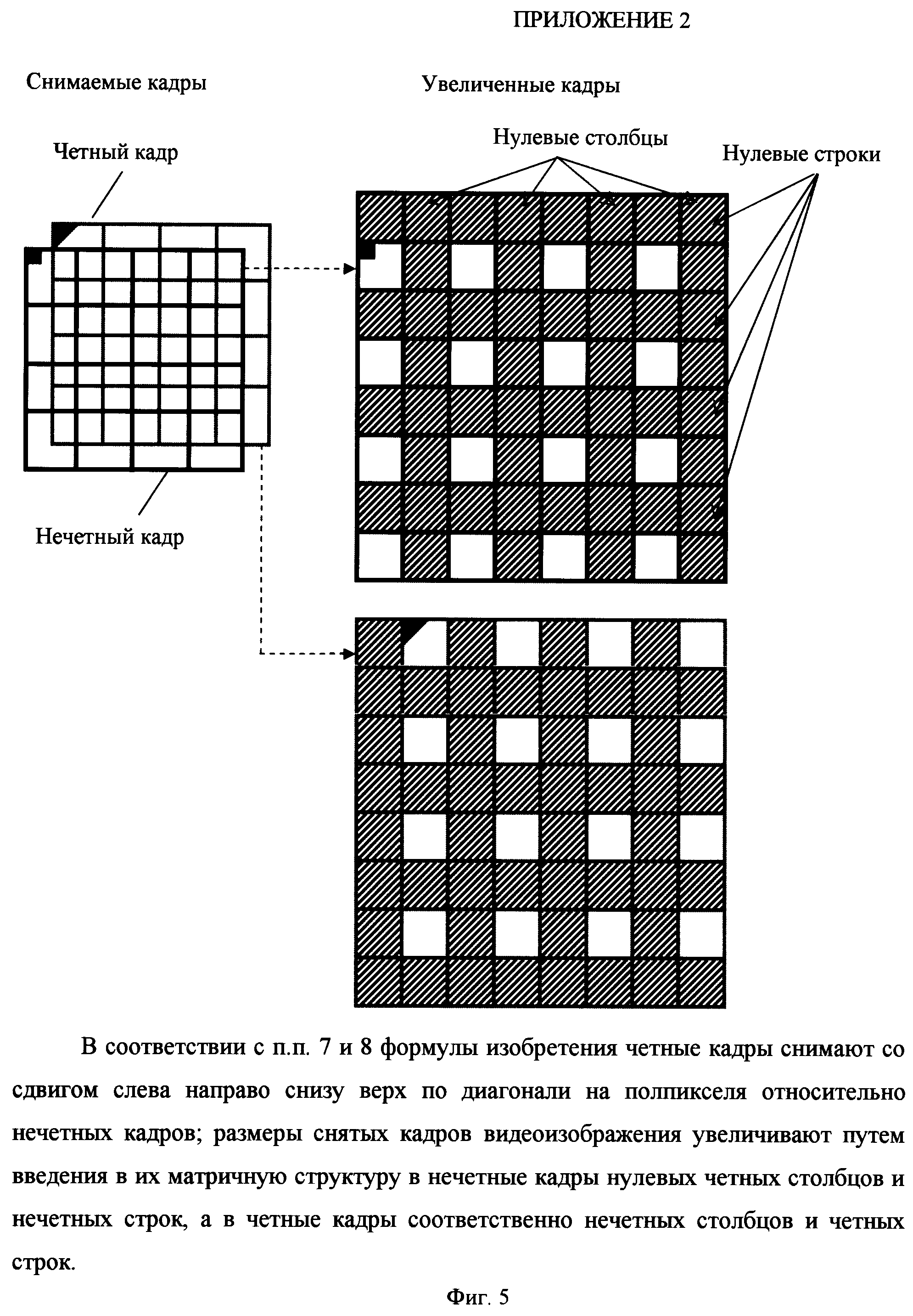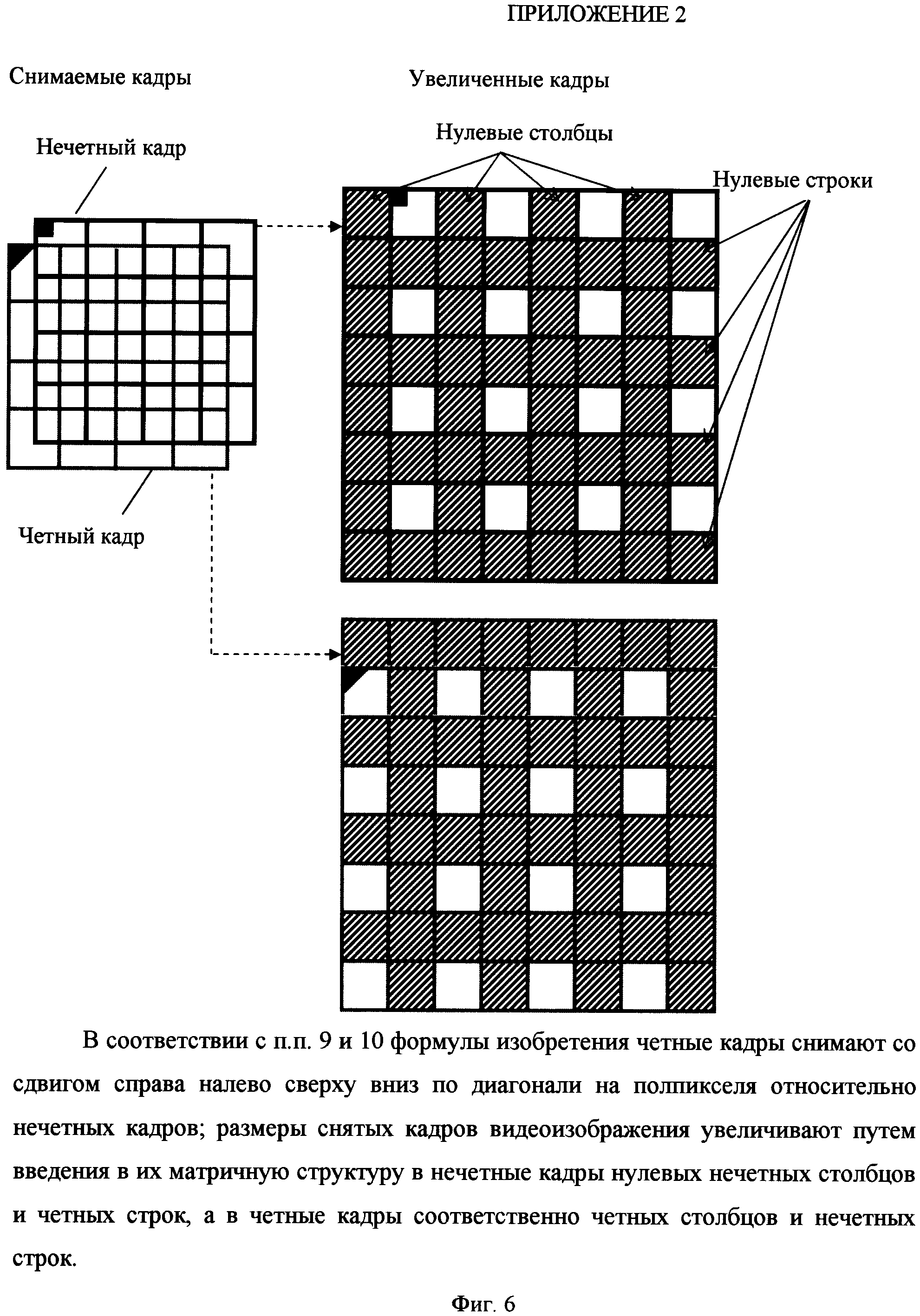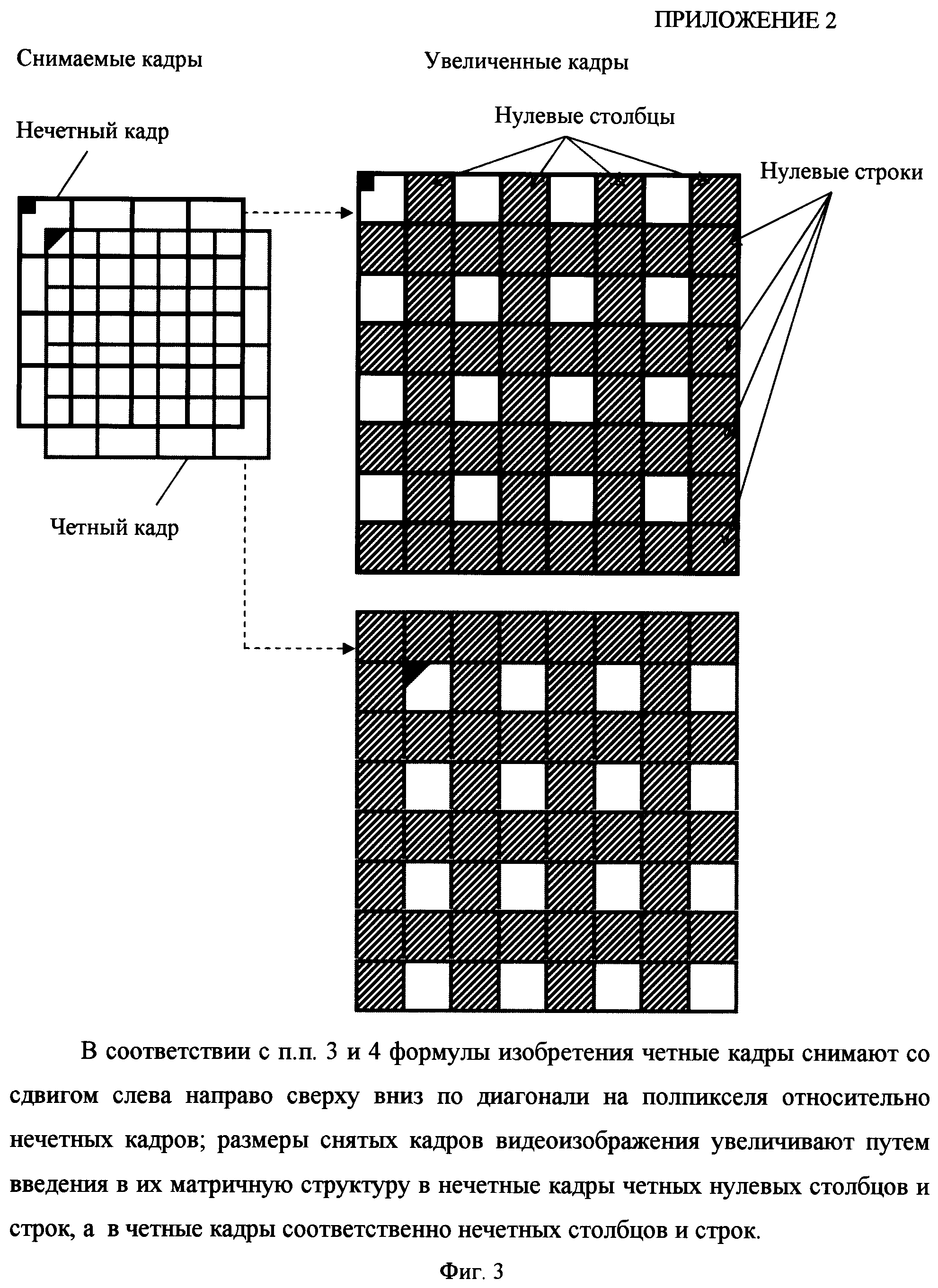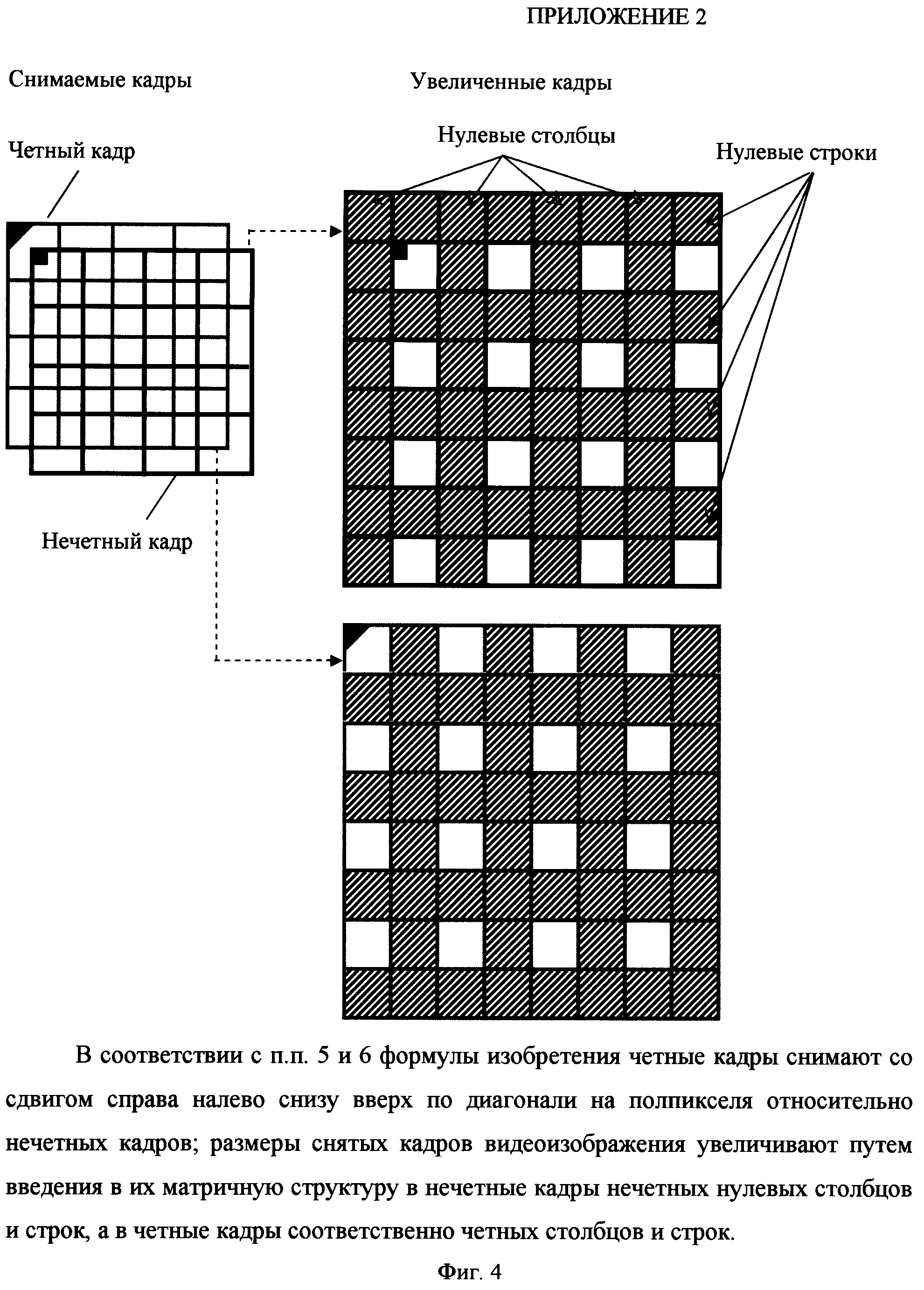 1. Способ повышения разрешающей способности видеосистем, основанный на использовании субпиксельного сдвига матричного изображения в соседних кадрах при съеме информации, характеризующийся тем, что четные кадры снимают со сдвигом по диагонали на полпикселя относительно нечетных кадров и снятые кадры запоминают, после чего размеры этих кадров увеличивают путем введения в их матричную структуру нулевых столбцов и строк и эти увеличенные кадры тоже запоминают, а потом производят формирование последовательности выходных сигналов путем одновременного или последовательного считывания данных каждого увеличенного нечетного и соответствующего увеличенного четного кадров, при этом снимаемые выходные сигналы обрабатывают с помощью трехмерного интерполяционного пространственно-временного фильтра нижних частот. 2. Способ повышения разрешающей способности видеосистем по п.1, отличающийся тем, что трехмерный интерполяционный пространственно-временной фильтр нижних частот выполняют с областью пропускания в виде октаэдра. 3. Способ повышения разрешающей способности видеосистем по п.1, отличающийся тем, что четные кадры снимают со сдвигом слева направо сверху вниз по диагонали на полпикселя относительно нечетных кадров. 4. Способ повышения разрешающей способности видеосистем по п.1 или 3, отличающийся тем, что размеры снятых кадров видеоизображения увеличивают путем введения в их матричную структуру в нечетные кадры четных нулевых столбцов и строк, а в четные кадры соответственно нечетных столбцов и строк. 5. Способ повышения разрешающей способности видеосистем по п.1, отличающийся тем, что четные кадры снимают со сдвигом справа налево снизу вверх по диагонали на полпикселя относительно нечетных кадров. 6. Способ повышения разрешающей способности видеосистем по п.1 или 5, отличающийся тем, что размеры снятых кадров видеоизображения увеличивают путем введения в их матричную структуру в нечетные кадры нечетных нулевых столбцов и строк, а в четные кадры соответственно четных столбцов и строк. 7. Способ повышения разрешающей способности видеосистем по п.1, отличающийся тем, что четные кадры снимают со сдвигом слева направо снизу верх по диагонали на полпикселя относительно нечетных кадров. 8. Способ повышения разрешающей способности видеосистем по п.1 или 7, отличающийся тем, что размеры снятых кадров видеоизображения увеличивают путем введения в их матричную структуру в нечетные кадры нулевых четных столбцов и нечетных строк, а в четные кадры соответственно нечетных столбцов и четных строк. 9. Способ повышения разрешающей способности видеосистем по п.1, отличающийся тем, что четные кадры снимают со сдвигом справа налево сверху вниз по диагонали на полпикселя относительно нечетных кадров. 10. Способ повышения разрешающей способности видеосистем по п.1 или 9, отличающийся тем, что размеры снятых кадров видеоизображения увеличивают путем введения в их матричную структуру в нечетные кадры нулевых нечетных столбцов и четных строк, а в четные кадры соответственно четных столбцов и нечетных строк.