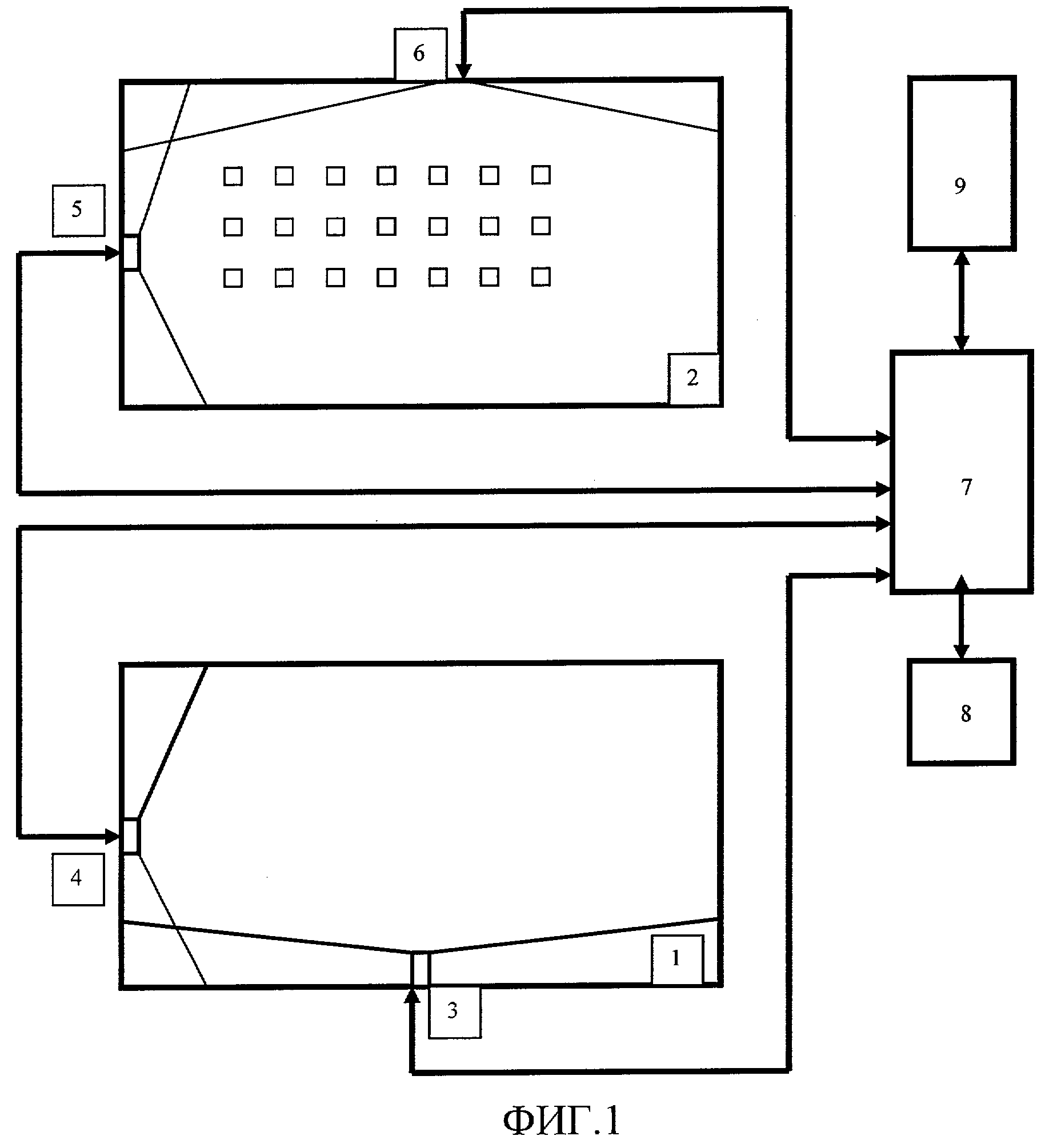 Видеокамеры электрически через интерфейс соединены с сервером 7, предназначенным для обработки видеопотоков, поступающих с этих видеокамер. Сервер 7 соединен электрически с компьютером 8,
