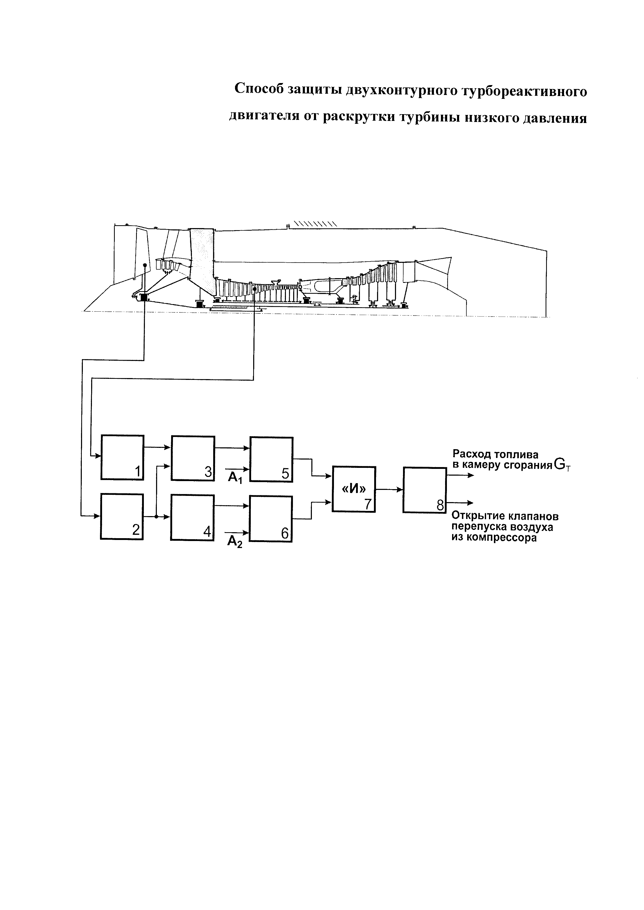 Изобретение относится к области газотурбинного двигателестроения, а именно к системам автоматической защиты газотурбинного двигателя от раскрутки турбины при ее отсоединении от вала компрессора. Известен способ автоматической защиты газотурбинного двигателя, сущность которого заключается в том, что с помощью блока защиты двигателя измеряют частоту вращения n турбины двигателя, сравнивают измеренное значение с наперед заданным предельным значением, и при увеличении частоты вращения n турбины выше наперед заданного значения формируют управляющий сигнал на прекращение подачи топлива в камеру сгорания газотурбинного двигателя (патент RU №2493393, МПК F02C 9/46, опубл. 20.09.2013). Недостатком известного способа является недостаточное быстродействие системы, а также необходимость создания и применения автономного блока защиты, что увеличивает стоимость двигателя и усложняет его конструкцию, т.к. подобные автономные блоки, как правило, оснащаются отдельным комплектом датчиков частоты вращения, которые не используются в штатной системе автоматического управления или системе диагностики двигателя. Известны способы автоматической защиты газотурбинного двигателя от раскрутки, в которых для повышения быстродействия системы в части выявления факта раскрутки турбины, предусматривается дополнительное определение первой производной Недостатком известного способа является то, что при использовании параметра частоты вращения n и его производной Наиболее близким к заявляемому является способ защиты двухконтурного турбореактивного двигателя от раскрутки турбины низкого давления, включающий измерение частоты вращения турбокомпрессора, частоты вращения турбины низкого давления, приводящей во вращение вентилятор, определение технического состояния двигателя на основании измеренных параметров, уменьшение или полное прекращение подачи топлива в двигатель в случае обнаружения отсоединения турбины низкого давления от вала вентилятора газотурбинного двигателя (патент RU №2376487, МПК F02C 9/46, опубл. 20.12.2009). Система, реализующая известный способ, содержит магнитно-индукционные датчики частоты вращения в системах контроля технического состояния и управления двигателем, а также датчик давления системы измерения крутящего момента. Момент нарушения целостности трансмиссии диагностируют одновременно датчиками частоты вращения разноименных роторов двигателя. Датчики частоты вращения разноименных роторов являются стандартно комплектуемыми (штатными) датчиками частоты вращения свободной турбины и частоты вращения турбокомпрессора, используются в электронной системе управления двигателем. При этом в случае превышения предельного значения частоты вращения ротора силовой турбины система защиты выдает команду на исполнительный механизм насоса-регулятора для снижения подачи топлива Gт в двигатель. В случае превышения критического значения предельных оборотов частоты вращения силовой турбины электронная система управления формирует команду на полное прекращение подачи топлива в двигатель (Gт=0). Недостатком известного способа, принятого за прототип, является необходимость применения специальной системы измерения крутящего момента, в т.ч. датчика давления. В целом это приводит к усложнению конструкции двигателя и к снижени