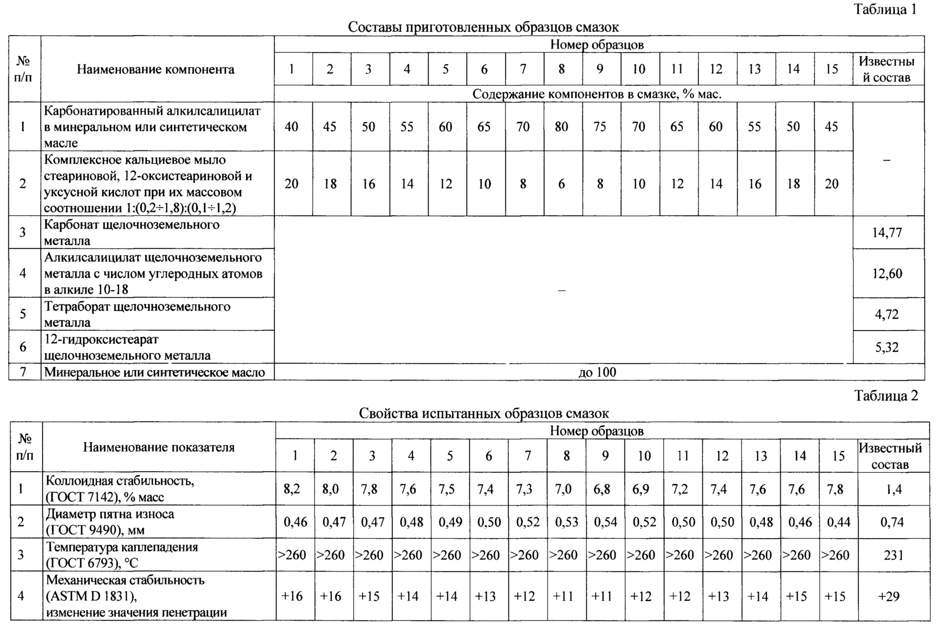 Пластичная смазка, содержащая минеральное или синтетическое масло, комплексное кальциевое мыло в виде смеси кальциевого мыла стеариновой кислоты, кальциевого мыла 12-оксистеариновой кислоты и кальциевого мыла уксусной кислоты при их массовом соотношении 1:(0,2÷1,8):(0,1÷1,2) соответственно и карбонатированный алкилсалицилат кальция с щелочным числом 100-600 мг КОН/г при следующем соотношении компонентов, мас. %:карбонатированный алкилсалицилат кальция с щелочным числом 100-600 мг КОН/г 40-80 комплексное кальциевое мыло 6-20 минеральное или синтетическое масло остальное до 100