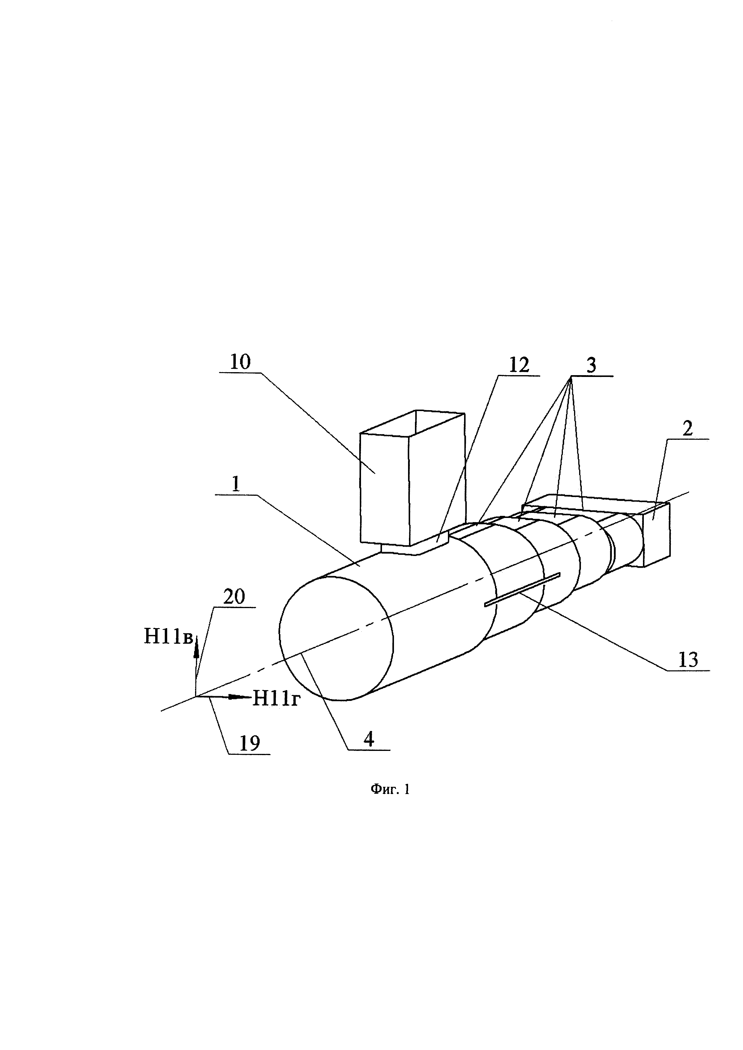 Изобретение относится к радиотехнике, а именно, к технике СВЧ и может быть использовано в волноводных трактах антенных систем для возбуждения и поляризационной селекции двух основных ортогонально поляризованных волн Н11, распространяющихся в круглых волноводах. Преимущественной областью применения изобретения являются волноводные тракты с полосой рабочих частот 19-21%, в которых во всех волноводных каналах поляризационных селекторов распространяются только основные типы волн. Известен волноводный поляризационный селектор (смотри патент US 2961618, НО IP 1/161, опубликован 22.11.1960), содержащий волноводный тройник с отрезком круглого волновода и отрезком бокового прямоугольного волновода. В отрезке круглого волновода установлена диаметральная продольная металлическая пластина, продольное металлическое ребро и две пары противолежащих металлических стержней. В месте сопряжения с отрезком круглого волновода в отрезке бокового прямоугольного волновода установлены диафрагмы и треугольные металлические пластины. К плечу отрезка круглого волновода за диаметральной продольной металлической пластиной может быть подключен дополнительный соосный переход на отрезок прямоугольного волновода. Также известен волноводный поляризационный селектор (смотри монографии Модель A.M. «Фильтры СВЧ в радиорелейных системах», Москва, Издательство «Связь», 1967, стр. 250-252; Метрикин А.А. «Антенны и волноводы РРЛ», Москва, Издательство «Радио и Связь», 1977, стр. 113-116; Бородич СВ. «Справочник по радиорелейной связи», Москва, Издательство «Радио и Связь», 1981, стр. 73-75; Кантор Л.Я. «Спутниковая связь и вещание», Москва, Издательство «Радио и Связь», 1997, стр. 271-273), содержащий волноводный тройник с отрезком круглого волновода и отрезком бокового прямоугольного волновода. В отрезке круглого волновода установлена диаметральная продольная металлическая пластина и сквозной металлический стержень. В месте сопряжения с отрезком круглого волновода в отрезке бокового прямоугольного волновода установлены диафрагмы и треугольные металлические пластины. К плечу отрезка круглого волновода за диаметральной продольной металлической пластиной может быть подключен дополнительный соосный переход на отрезок прямоугольного волновода. Недостатком известных устройств является сложность конструкции для диапазона частот «Ки» и более высоких частотных диапазонов. Кроме того, поперечные размеры отрезка круглого волновода допускают распространение высших типов волн, что может приводить к резонансным эффектам в волноводных трактах. Известен волноводный поляризационный селектор типа 1а (смотри статью A.M. Boifot ((Classification of Ortho-Mode Transducers)), ELAB-RUNIT, N-7034, Trondheim, Norway, volume 2, №5, 1991, page 506), содержащий волноводный тройник с отрезком круглого волновода и отрезком бокового прямоугольного волновода. В отрезке круглого волновода установлена диаметральная продольная металлическая пластина. К отрезку круглого волновода за диаметральной продольной металлической пластиной подключен соосный плавный переход на отрезок прямоугольного волновода. В плавном переходе параллельно диаметральной продольной металлической пластине установлена дополнительная диаметральная продольная поглощающая пластина с согласующими элементами типа «ласточкин хвост» на концах. Недостатком известного уст