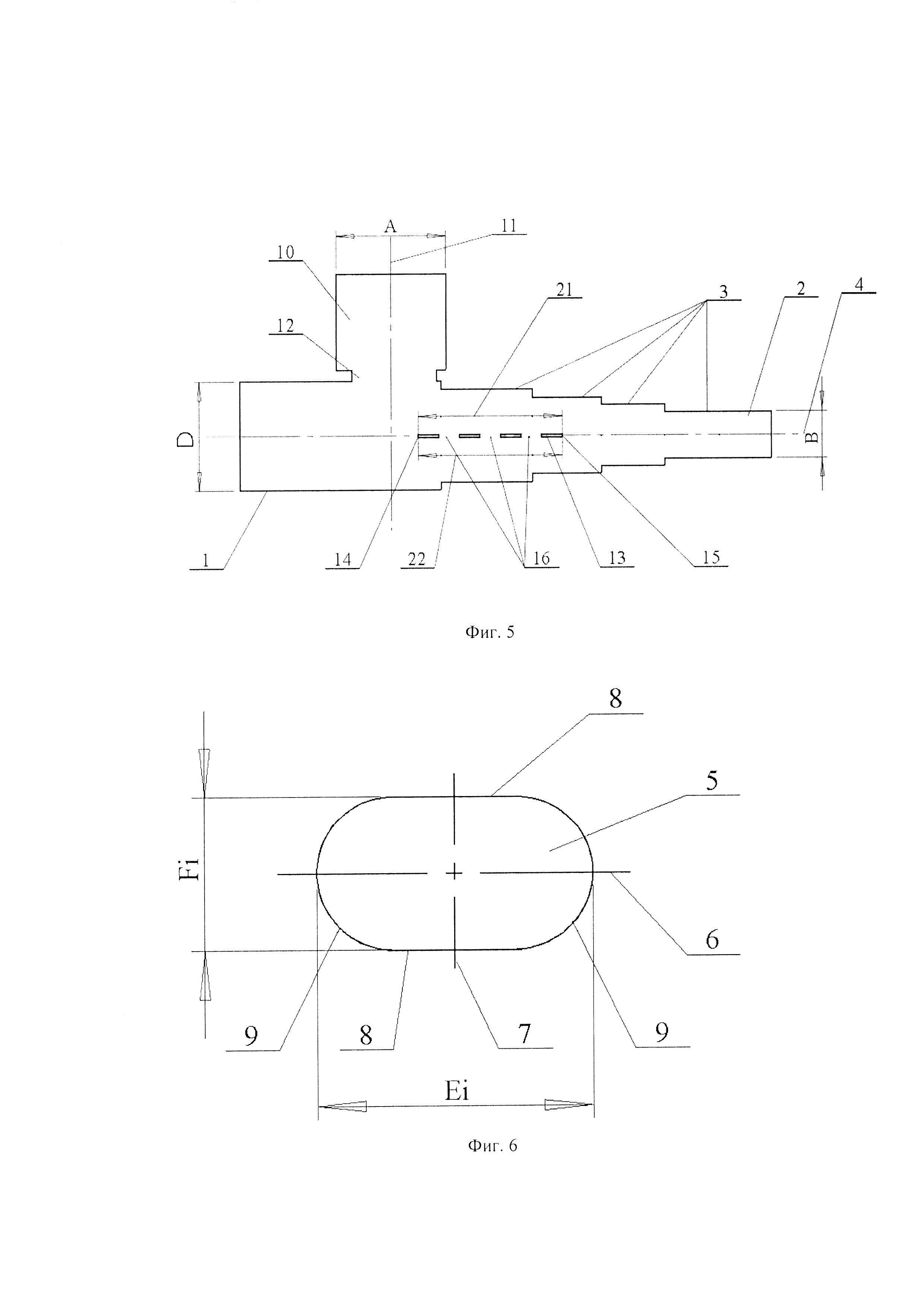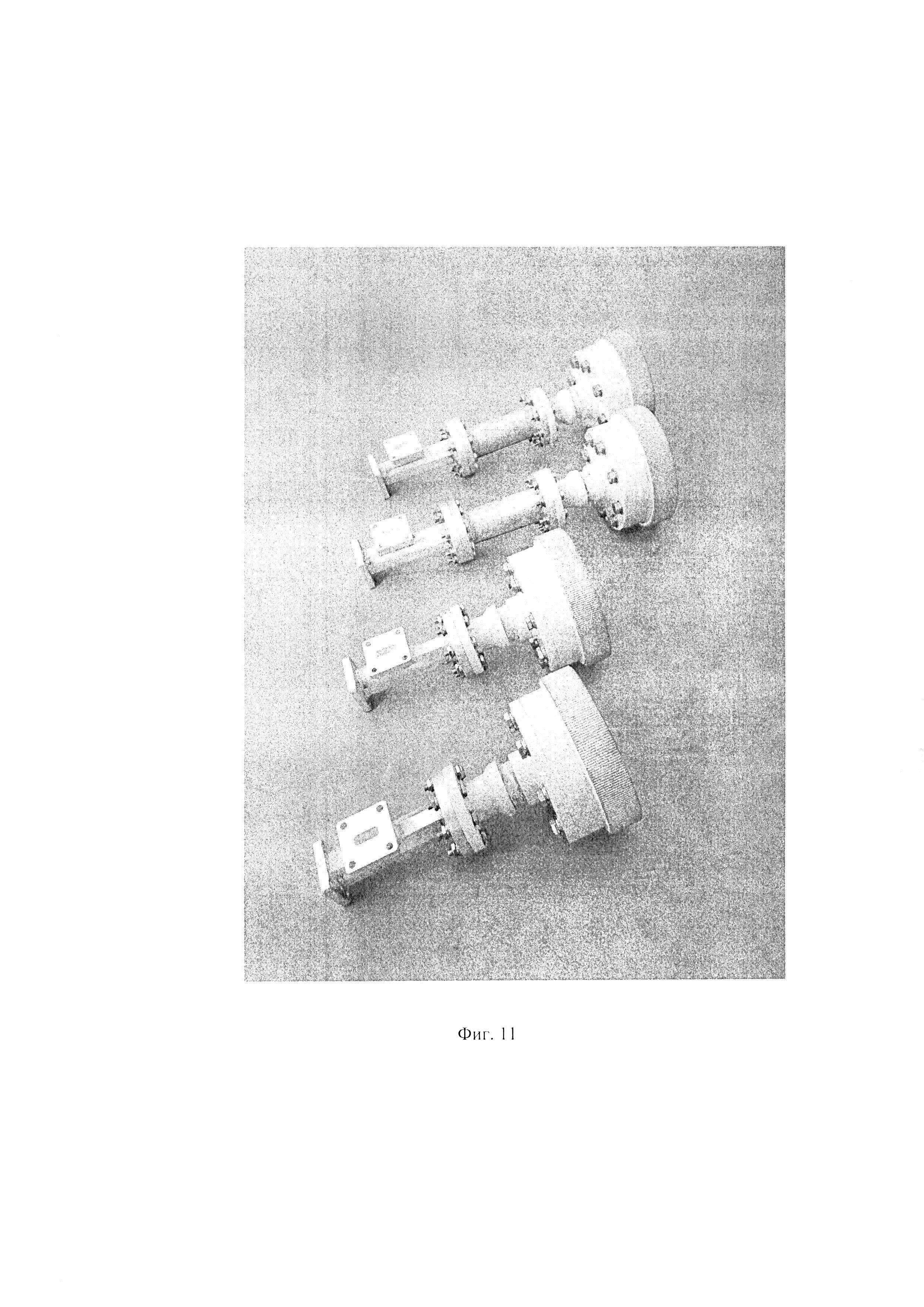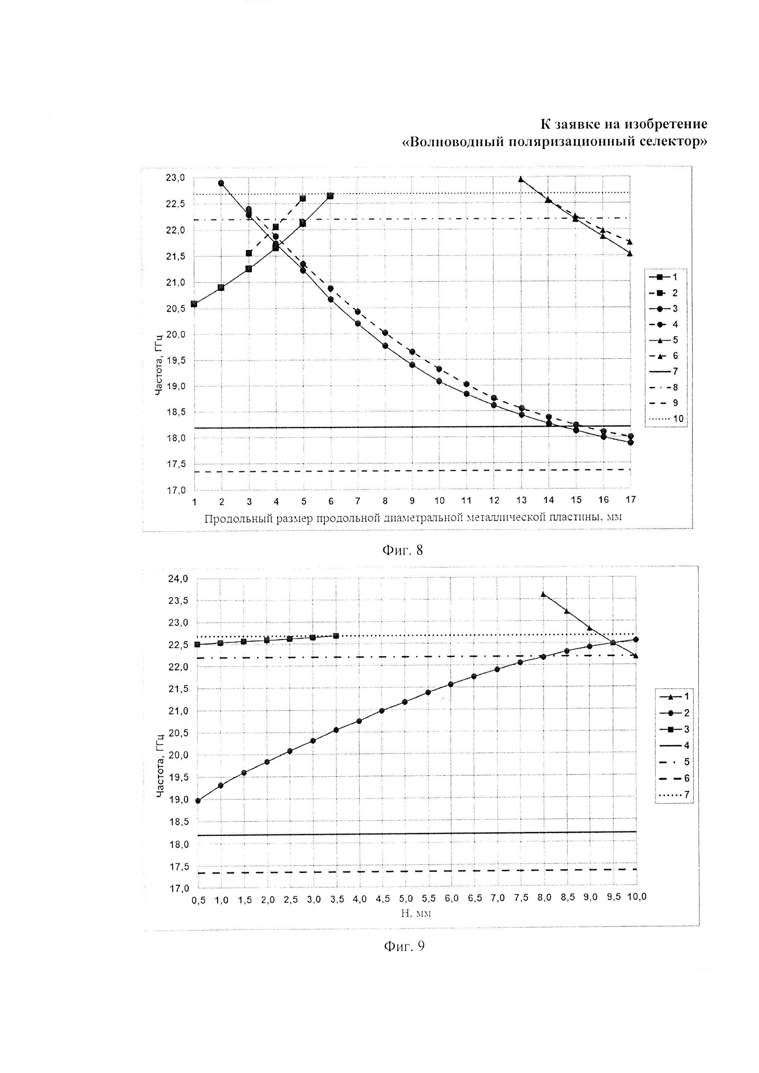 1. Волноводный поляризационный селектор, содержащий отрезок круглого волновода диаметром D; первый отрезок прямоугольного волновода с поперечным размером широких стенок A>D и поперечным размером узких стенок B<D; волноводный переход, имеющий N ступеней, расположенный между ними и имеющий с ними общую продольную ось; второй отрезок прямоугольного волновода, продольная ось которого перпендикулярна, а широкие стенки параллельны упомянутой общей продольной оси; диафрагму, установленную в месте соединения второго отрезка прямоугольного волновода с отрезком круглого волновода; продольную диаметральную металлическую пластину, установленную параллельно широким стенкам первого отрезка прямоугольного волновода, одна поперечная грань которой расположена в отрезке круглого волновода, а другая - в волноводном переходе; в котором каждая из N ступеней волноводного перехода выполнена с поперечным сечением, имеющим форму овала с длиной большой оси Ei и длиной малой оси Fi, которые удовлетворяют соотношениям: D≤Ei≤A, B≤Fi<D, где i=1…N; отличающийся тем, что в продольной диаметральной металлической пластине выполнены овальные отверстия, малые оси которых совпадают с упомянутой общей продольной осью, а большие оси - перпендикулярны ей, причем овальные отверстия выполнены одного размера с длиной большой оси G и длиной малой оси Н, удовлетворяющих соотношениям: 0,7D≤G≤D, 0,15D≤H≤0,4D, и расстоянием S между ними, удовлетворяющим соотношению: 0,1D≤S≤0,25D. 2. Селектор по п. 1, отличающийся тем, что каждое из овальных отверстий образовано двумя отрезками прямых, параллельных большой оси, и двумя полуокружностями, диаметр которых равен длине малой оси Н. 3. Селектор по п. 1 или 2, отличающийся тем, что каждая из N ступеней волноводного перехода выполнена с поперечным сечением, имеющим форму овала, образованного двумя отрезками прямых, параллельных большой оси, и двумя полуокружностями, диаметр которых равен длине малой оси. 4. Селектор по п. 1 или 2, отличающийся тем, что первая ступень волноводного перехода выполнена с длиной большой оси D≤E1≤A и длиной малой оси F1≤B, а остальные ступени выполнены с длинами больших осей Ei=D, где i=2…N.