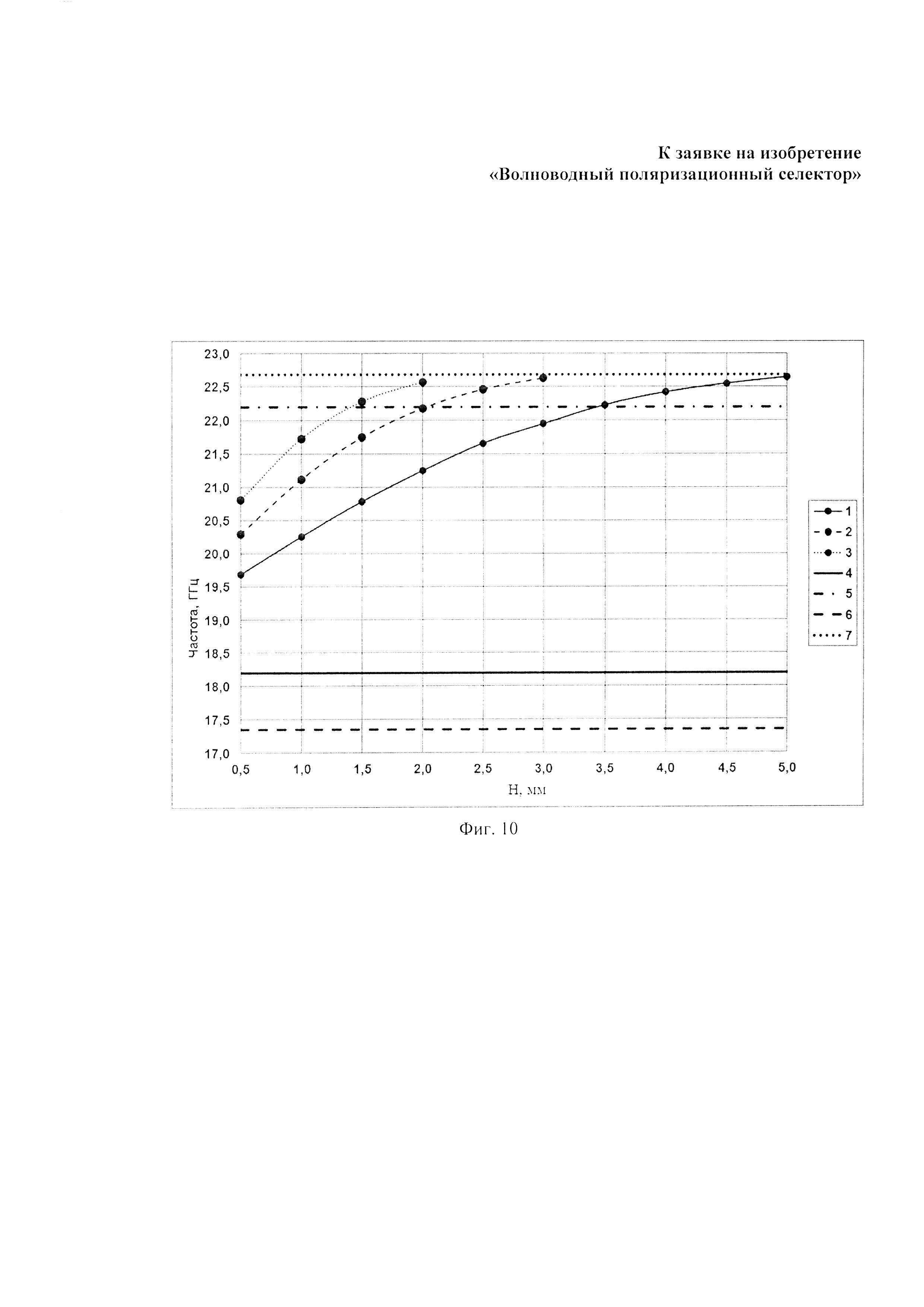 Изобретение относится к радиотехнике, а именно к технике СВЧ. Волноводный поляризационный селектор содержит отрезок круглого волновода диаметром D, первый отрезок прямоугольного волновода с поперечным размером широких стенок A>D и поперечным размером узких стенок B<D, волноводный переход, имеющий N ступеней, расположенный между ними и имеющий с ними общую продольную ось, второй отрезок прямоугольного волновода, продольная ось которого перпендикулярна, а широкие стенки параллельны упомянутой общей продольной оси, диафрагму, установленную в месте соединения второго отрезка прямоугольного волновода с отрезком круглого волновода, и продольную диаметральную металлическую пластину, установленную параллельно широким стенкам первого отрезка прямоугольного волновода, одна поперечная грань которой расположена в отрезке круглого волновода, а другая - в волноводном переходе. Каждая из N ступеней волноводного перехода выполнена с поперечным сечением, имеющим форму овала с длиной большой оси Eи длиной малой оси F, которые удовлетворяют соотношениям: D≤E≤A, B≤F<D, где i=1…N. В продольной диаметральной металлической пластине выполнены овальные отверстия, малые оси которых совпадают с упомянутой общей продольной осью, а большие оси - перпендикулярны ей. Овальные отверстия выполнены одного размера с длиной большой оси G и длиной малой оси Н, удовлетворяющими соотношениям:0,7D≤G≤D,0,15D≤H≤0,4D,и расстоянием S между ними, удовлетворяющим соотношению:0,1D≤S≤0,25D.Использование изобретения позволяет расширить диапазон рабочих частот волноводного поляризационного селектора до величины 19-21% при одномодовом режиме работы всех волноводных каналов. 3 з.п. ф-лы, 15 ил.