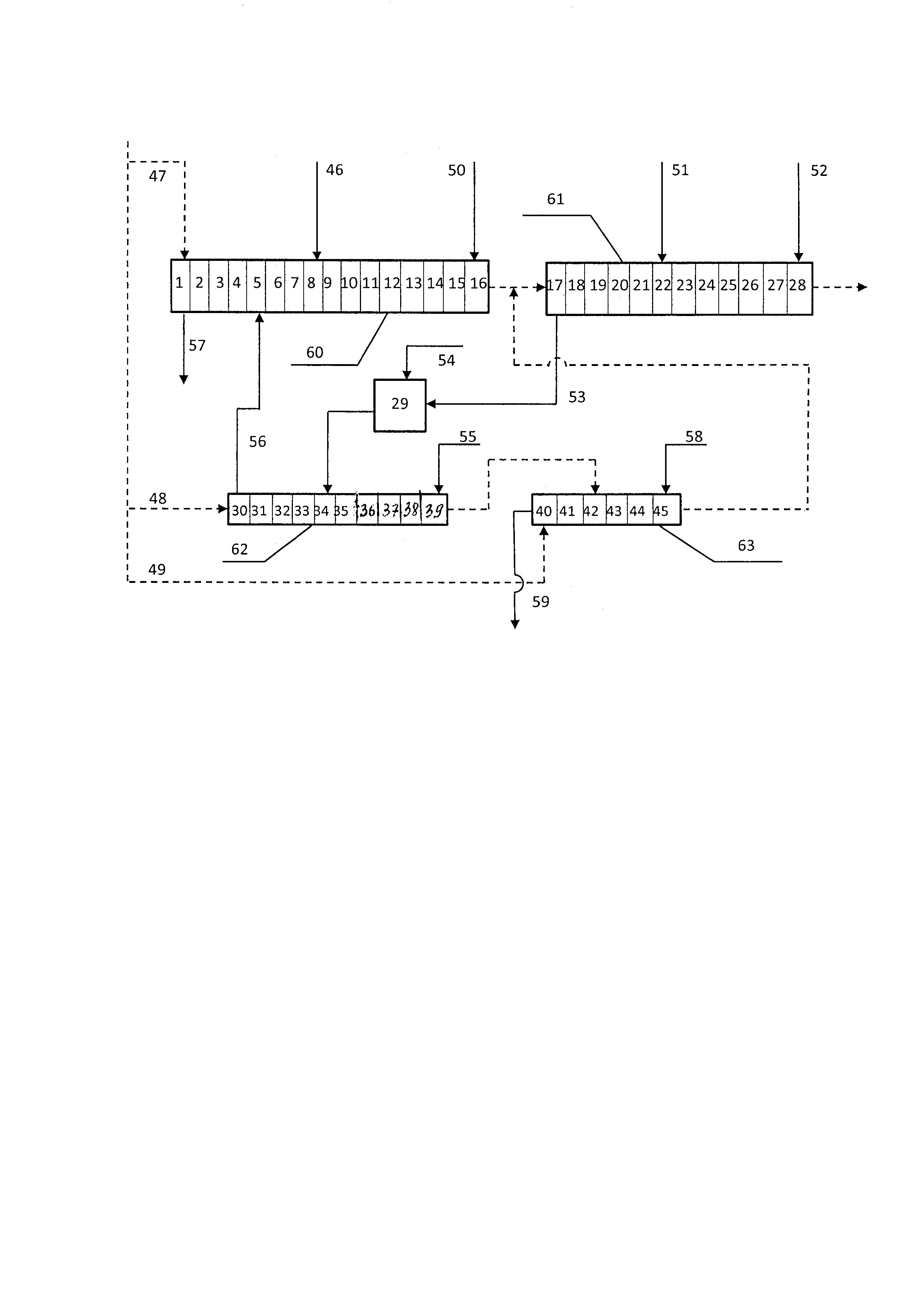 Изобретение относится к радиохимической переработке отработавшего ядерного топлива (ОЯТ), конкретно - к экстракционному аффинажу плутония. Аффинажный цикл в линии плутония является необходимым переделом в процессе переработки ОЯТ, выполняя задачи доочистки и концентрирования плутония перед оксалатным осаждением. Простейшая структура аффинажного цикла включает операции экстракции, промывки экстракта и реэкстракции плутония, при этом степень концентрирования плутония определяется отношением величин потока питания и реэкстрагирующего раствора. Такая структура принята для заводов UP-3 и Thorp (см., например, Ревенко Ю.А., Подойницын С.В., Колупаев Д.Н. Радиохимические технологии для регенерации делящихся материалов из отработавшего ядерного топлива. Изд-во Томского политехнического университета, стр. 160-170, 2014 г.). Степень концентрирования в таких схемах, как правило, невысока. Существенно выше степень концентрирования в экстракционных циклах, работающих в режиме рефлакс-процесса (Землянухин В.И., Ильенко Е.И., Кондратьев А.Н., Лазарев Л.Н., Царенко А.Ф., Царицына Л.Г. Радиохимическая переработка ядерного топлива АЭС. М., Энергоатомиздат, стр. 110, 1983 г.). Главный отличительный признак рефлакс-процесса - деление реэкстракта плутония на поток, выводимый из цикла, и на поток, возвращаемый (рефлаксируемый) в экстракционный цикл. Возврат производится после корректировки состава (проточной или в отдельном аппарате), позволяющей проводить экстракцию из возвратного потока, а ступень ввода возвратного потока выбирается исходя из конкретной структуры цикла в зоне экстракции или в зоне промывки. В рефлакс-процессе степень концентрирования определяется соотношением величин потока и выводимой из цикла доли потока реэкстракта, что существенно выше, чем в безрефлаксном процессе. Недостаток рефлакс-процесса - протяженная зона накопления плутония в экстракционном каскаде. Это большой объем незавершенного производства, что нежелательно для делящегося материала. Кроме того, при отклонении режима работы каскада от регламентного зона накопленного плутония будет смещаться либо в рафинат, либо в блок регенерации экстрагента, что недопустимо. Наиболее близким является способ экстракционного противоточного концентрирования элементов (Авт. свид. СССР №1588428, опубл. 30.08.1990 г., бюл. №32), согласно которому экстракционный цикл состоит из двух субциклов (извлекающего и концентрирующего), обслуживаемых единым потоком оборотного экстрагента. Способ включает экстракцию выделяемого элемента, промывку экстракта, реэкстракцию, корректировку состава реэкстракта и повторную экстракцию, промывку и реэкстракцию, при этом оборотный экстрагент разделяют на два потока, больший по величине поток направляют на экстракцию концентрируемого элемента из потока питания, реэкстракт, получаемый при последующей обработке этого раствора, направляют на корректировку состава и последующую повторную экстракцию меньшим по величине потоком оборотного экстрагента. Затем реэкстрагируют концентрируемый элемент из малого потока (реэкстракт является продуктовым потоком процесса), после чего меньший поток объединяют с основным потоком экстракта Перечисленные особенности способа - последовательный перенос продукта в уменьшающиеся по величине потоки, двойной перенос в фа