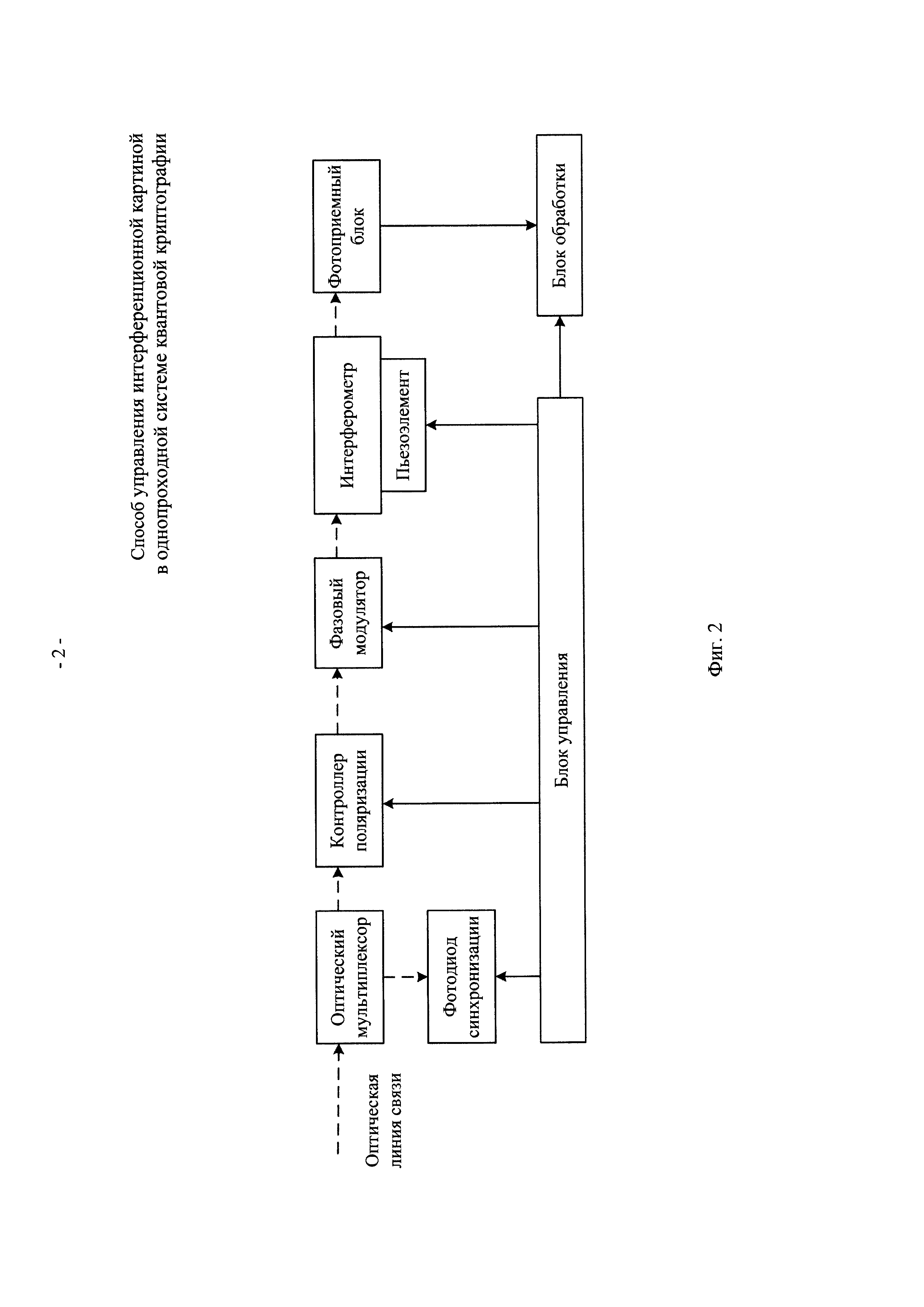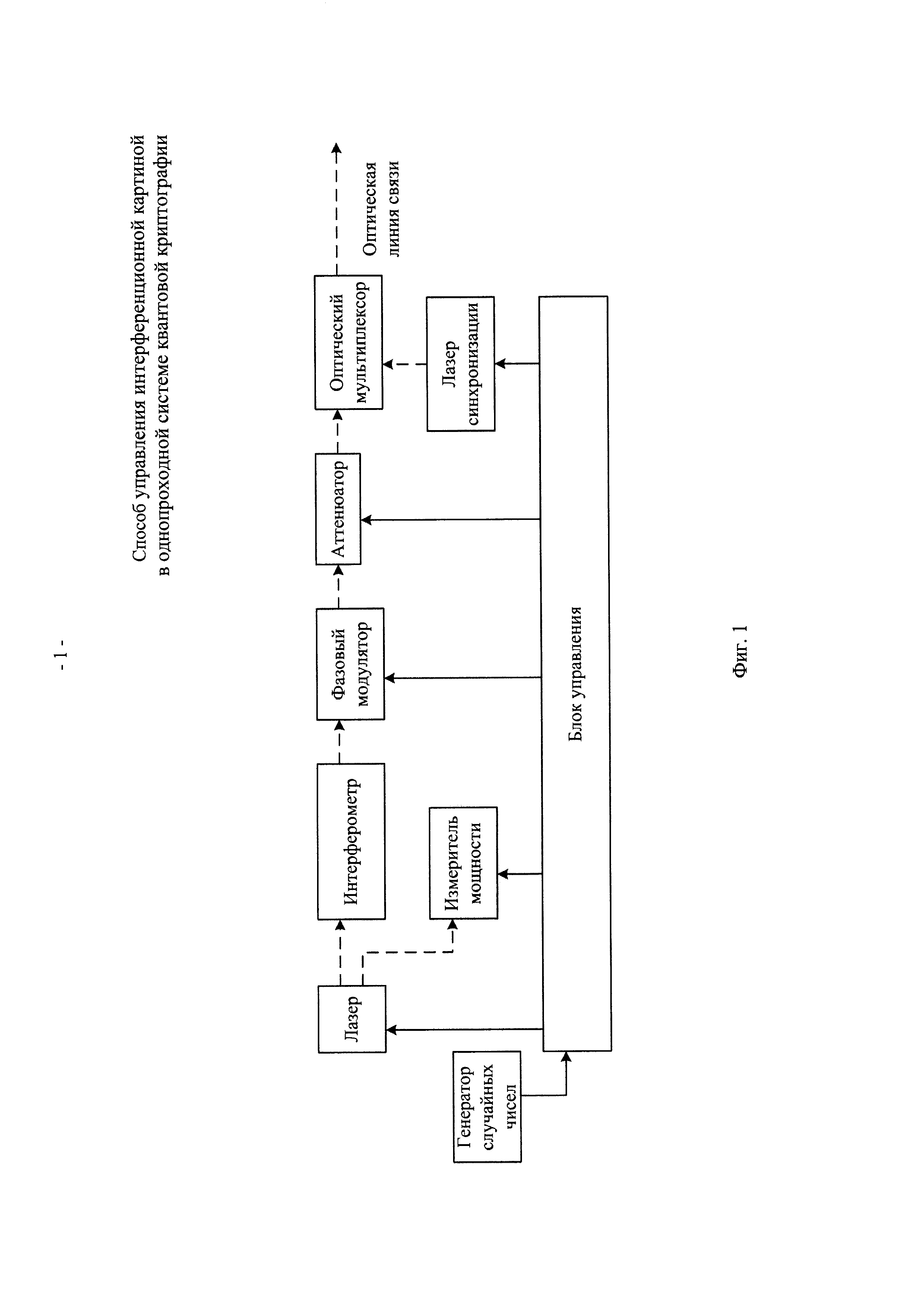 Способ управления интерференционной картиной в однопроходной системе квантовой криптографии, включающей передающую часть, содержащую генератор случайных чисел, лазер, интерферометр, блок управления; принимающую часть, содержащую интерферометр, фотоприемный блок, блок обработки, блок управления; линию связи, выполненную в виде одномодового оптического волокна и соединяющую передающую и принимающую части; способ заключается в том, что генерируют случайную последовательность нулей и единиц с помощью генератора случайных чисел в передающей части; генерируют на основании последовательности нулей и единиц последовательность квазиоднофотонных состояний в передающей части; разделяют каждое квазиоднофотонное состояние с помощью интерферометра передающей части на пару пространственно разнесенных квазиоднофотонных когерентных состояний; передают полученные пространственно разнесенные квазиоднофотонные когерентные состояния из передающей части в принимающую часть с помощью линии связи; принимают пространственно разнесенные квазиоднофотонные когерентные состояния в принимающей части; получают интерференционную картину от пространственно разнесенных квазиоднофотонных когерентных состояний на выходе интерферометра принимающей части; регистрируют последовательность квазиоднофотонных состояний после прохождения интерферометра принимающей части в фотоприемном блоке в виде последовательности нулей и единиц в зависимости от видности полученной интерференционной картины для каждого квазиоднофотонного состояния; определяют сигнал ошибки в блоке обработки принимающей части на основании сравнения принятой и переданной последовательностей нулей и единиц, при этом в качестве сигнала ошибки применяется величина, пропорциональная числу несовпадений в позициях принятой и переданной последовательностей единиц и нулей; и регулируют видность интерференционной картины, полученной на выходе интерферометра принимающей части, посредством компенсации относительной разности хода в интерферометре принимающей части на основании принятого сигнала ошибки.