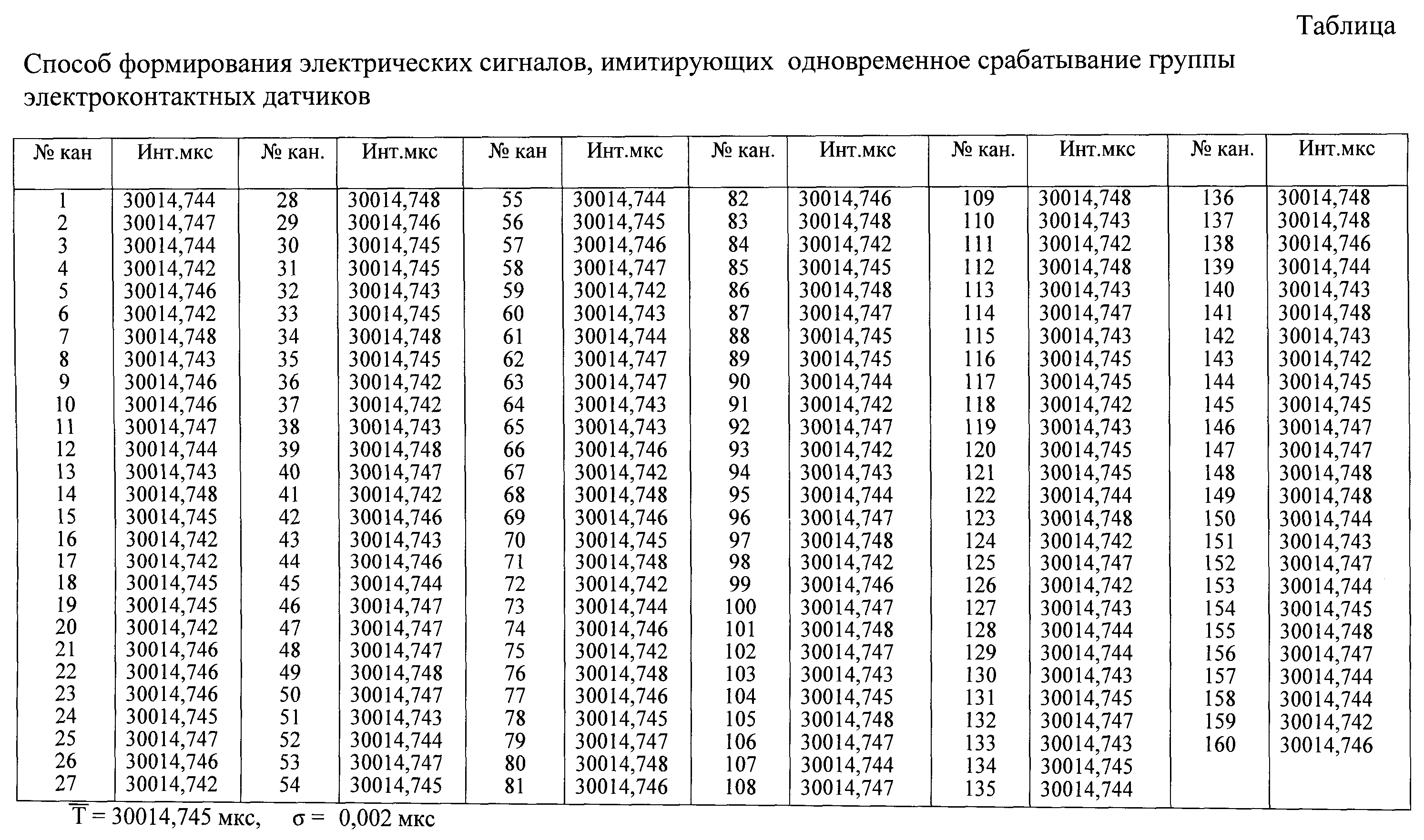 Способ формирования электрических сигналов, имитирующих одновременное срабатывание группы электроконтактных датчиков, заключающийся в том, что электрические сигналы получают путем кратковременного замыкания в измерительных каналах жил кабельных линий, заряженных до заданного отрицательного потенциала, с оплетками кабельных линий, соединенными с общей шиной (землей), отличающийся тем, что сигналы, имитирующие срабатывание электроконтактных датчиков, формируют одновременно по всем каналам путем кратковременного замыкания двух групп проводников, одна из которых состоит из соединенных между собой жил кабельных линий измерительных каналов, заряженных отрицательным напряжением, вторая - из оплеток кабельных линий измерительных каналов, соединенных с общей шиной (землей), замыкание осуществляют с помощью электронного коммутатора с задержкой относительно сигнала, инициирующего исследуемый процесс и являющегося пусковым для устройств регистрации интервалов времени, величину задержки выбирают равной расчетному времени развития исследуемого процесса, электрические сигналы с выходов устройств формирования подают на соответствующие информационные входы устройств измерения интервалов времени и по всем измерительным каналам определяют интервал времени между пусковым сигналом и сигналами, имитирующими одновременное срабатывание электроконтактных датчиков.
