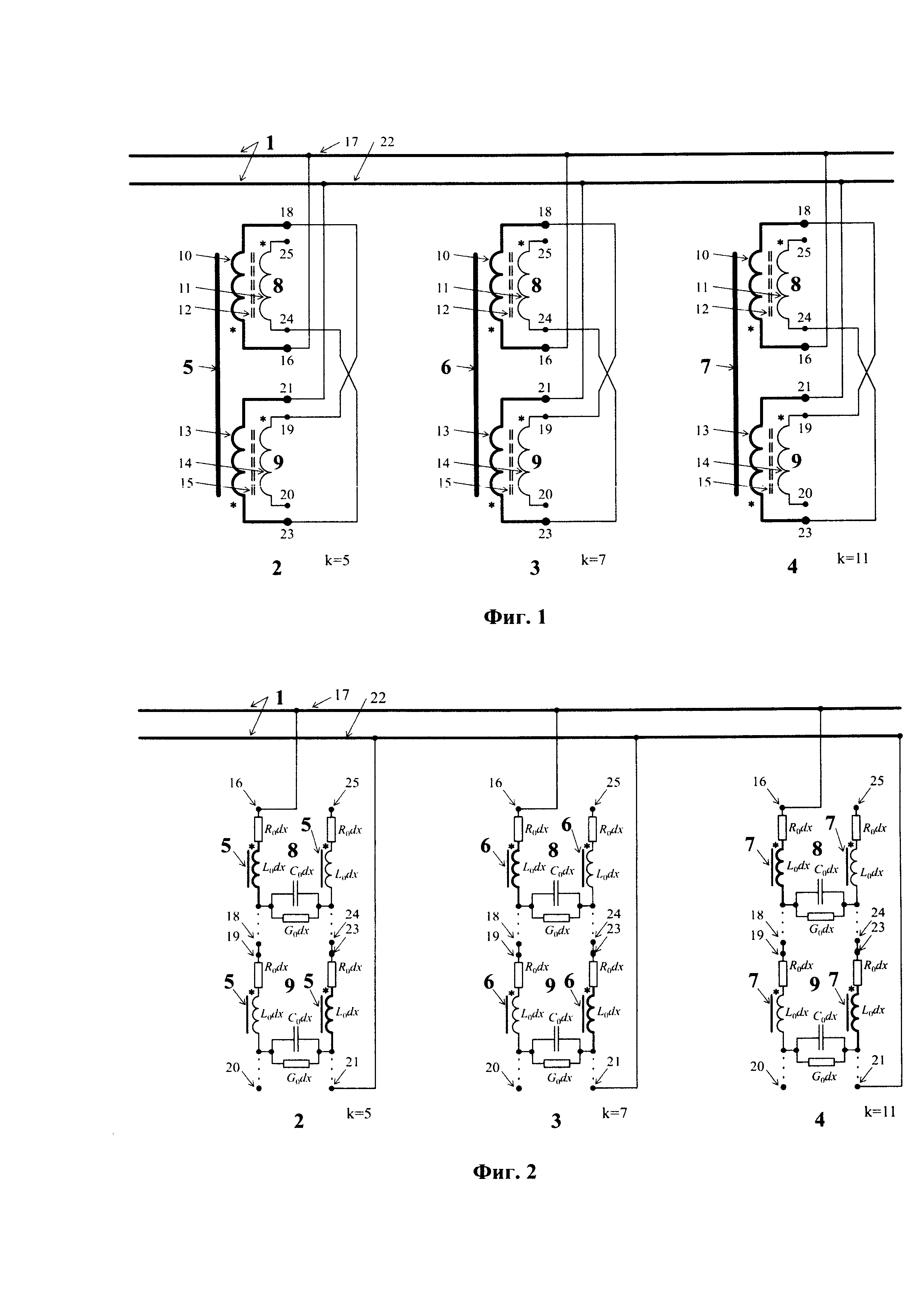 Изобретение относится к области электротехники и может быть использовано в системах компенсации реактивной мощности, в гребенчатых фильтрах высших гармоник напряжения питания электрических сетей. Структура предлагаемой фильтрокомпенсирующей установки определяется совокупностью фильтрокомпенсирующих устройств. Известно фильтрокомпенсирующее устройство системы электроснабжения [RU U1167845, МПК H02J 3/01 опубл. 10.01.2017], которое содержит реактор, выполненный в виде магнитопровода из двух П-образных стержней, конденсатор, выполненный в виде последовательно-согласно намотанных на стержни магнитопровода двухзаходных проводов обмоток из фольги, отличающийся тем, что конденсатор выполнен в виде четырех отдельных секций, попарно размещенных на стержнях магнитопровода, обмотки каждой секции изолированы друг от друга диэлектриком, при этом первая, вторая и третья секции соединены согласно последовательно, выводы сети подключены к началу первого провода первой секции и к концу второго провода третьей секции, конец первого и начало второго проводов разомкнуты, начало первого провода четвертой секции и конец второго провода четвертой секции подключены к выводам сети, конец первого и начало второго проводов разомкнуты. Недостатками такого устройства являются большие потоки рассеяния, низкая добротность колебательных контуров в резонансных режимах, сложность выбора параметров и настройки устройства для подавления нескольких гармонических составляющих напряжения сети. Наиболее близким по технической сущности к предлагаемому изобретению является фильтрокомпенсирующее устройство [RU U1128033, МПК H02J 3/01 опубл. 10.05.2013]. Фильтрокомпенсирующее устройство содержит реактор, выполненный в виде магнитопровода из П-образных стержней, конденсатор, выполненный в виде последовательно-согласно намотанных на П-образных стержнях магнитопровода двухзаходных обмоток из двух изолированных проводов в виде фольги и компенсируемую сеть, подключаемую к началу первого провода и концу второго, при этом конец первого и начало второго разомкнуты. Для компенсации высших гармоник в устройстве используется режим резонанса напряжений, резонансная частота которого определяется его емкостью и индуктивностью. На промышленной частоте компенсируемой сети реализуется повышение коэффициента мощности. Недостатками прототипа являются невозможность компенсации одновременно нескольких высших гармоник сети, высокий уровень потерь электроэнергии в устройстве и меньший положительный эффект при больших массогабаритных показателях. Технической задачей предлагаемого изобретения является снижение уровня необратимых потерь электроэнергии, уменьшение массогабаритов, повышение коэффициента мощности и снижение коэффициентов гармонических составляющих напряжения электрической сети путем полигармонической компенсации высших гармоник. Технический результат предлагаемого изобретения заключается в повышении коэффициента мощности и снижении коэффициентов гармонических составляющих напряжения и суммарного коэффициента гармонических составляющих напряжения сети за счет компенсации реактивной мощности и полигармонической фильтрации высших гармоник при одновременном повышении надежности и уменьшении массогабаритных показателей устройства. Это