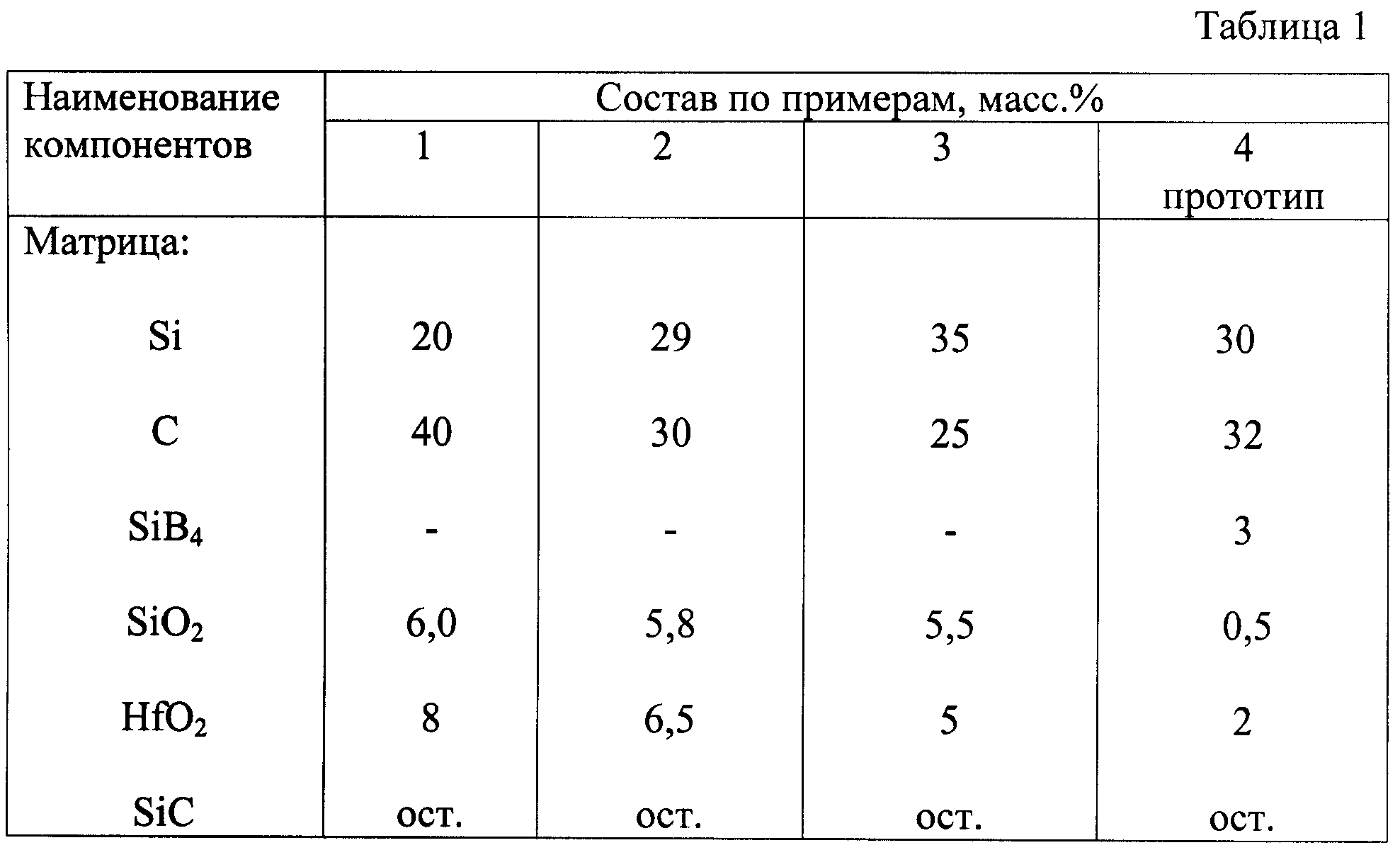 Керамический композиционный материал, содержащий углеродные волокна и матрицу, включающую кремний, углерод, диоксид кремния, диоксид гафния, карбид кремния, отличающийся тем, что исходная композиция матрицы имеет следующий химический состав, мас.%:Si 20-35 С 25-40 SiO2 5,5-6,0 НfO 5-8 SiC остальное
