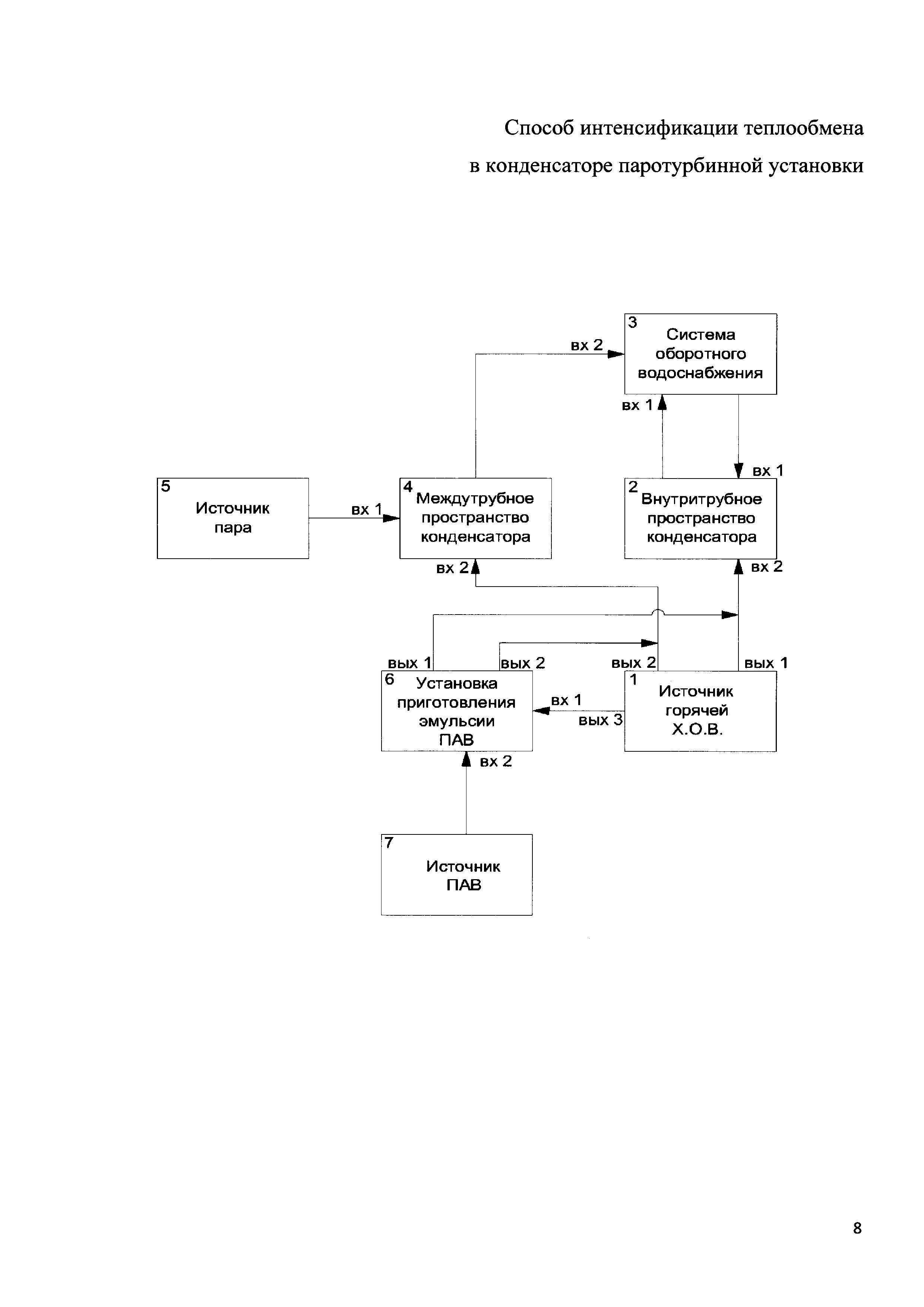 1. Способ интенсификации теплообмена в конденсаторе паротурбинной установки, заключающийся в том, что при эксплуатации паротурбинной установки, характеризующейся чередующимися режимами работы и простоя, в период простоя конденсатор с межтрубным и внутритрубным пространствами и очищенными от отложений латунными трубками отключают от системы оборотного водоснабжения и подключают к внутритрубному пространству конденсатора внешний источник горячей химически обессоленной воды, к межтрубному пространству конденсатора источник пара, подключают к установке приготовления эмульсии поверхностно-активного вещества (ПАВ) источник ПАВ и источник горячей химически обессоленной воды, отличающийся тем, что подключают источник горячей химически обессоленной воды к межтрубному пространству конденсатора, подают в межтрубное и внутритрубное пространства конденсатора горячую химически обессоленную воду и высококонцентрированную эмульсию ПАВ, выдерживают эмульсию с концентрацией 20÷60 мг/кг в квазистатических условиях в течение 8÷12 часов и ее дренируют. 2. Способ по п. 1, отличающийся тем, что подают пар в межтрубное пространство конденсатора в процессе выдержки эмульсии ПАВ, которым ее нагревают, поддерживают температуру на уровне 75÷95°С и перемешивают. 3. Способ по п. 1, отличающийся тем, что подают эмульсию ПАВ после ее выдержки в конденсаторе в систему оборотного водоснабжения.
