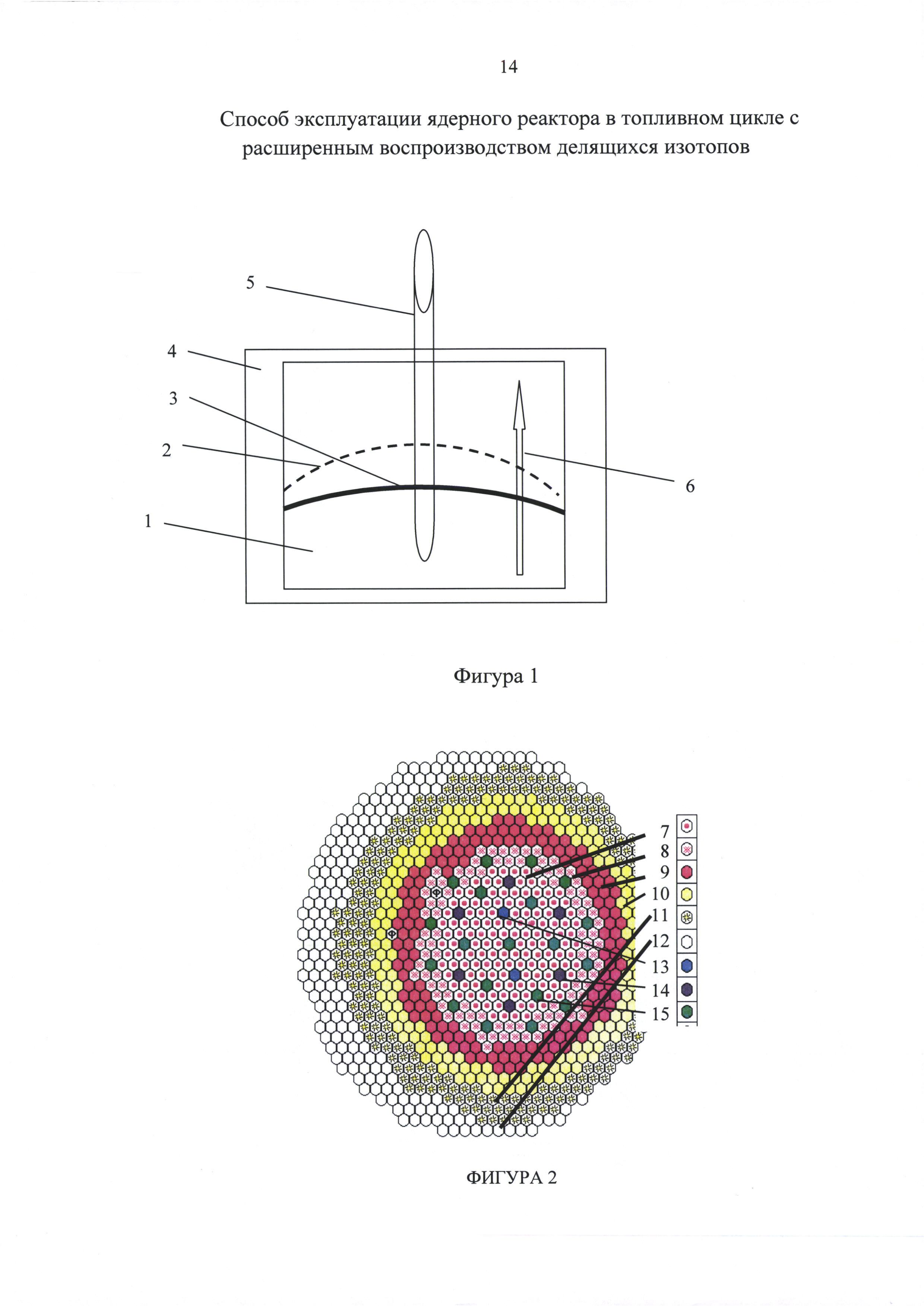 Изобретение относится к способам эксплуатации ядерных реакторов, предназначенных для наработки делящихся химических элементов. Способ эксплуатации ядерного реактора в топливном цикле с расширенным воспроизводством делящихся изотопов включает первоначальную загрузку активной зоны топливными сборками, содержащими делящийся материал и сырьевые изотопы, формирование интенсивности нейтронного потока и его энергетического распределения, при которых сырьевые изотопы переходят в способные к ядерному делению изотопы, управление работой реактора на мощности путем удержания его в критическом состояния, обеспечивая баланс между вырабатывающимися нейтронами и поглощением нейтронов. При снижении мощности реактора формирование интенсивности нейтронного потока и его энергетического распределения осуществляют путем уменьшения энерговыделения в центральной части активной зоны с увеличением нейтронного потока на периферии активной зоны. Активная зона окружена отражателем или бланкетом, содержащим изотопы урана, и/или плутония, и/или тория. 6 з.п. ф-лы, 2 табл., 2 ил.