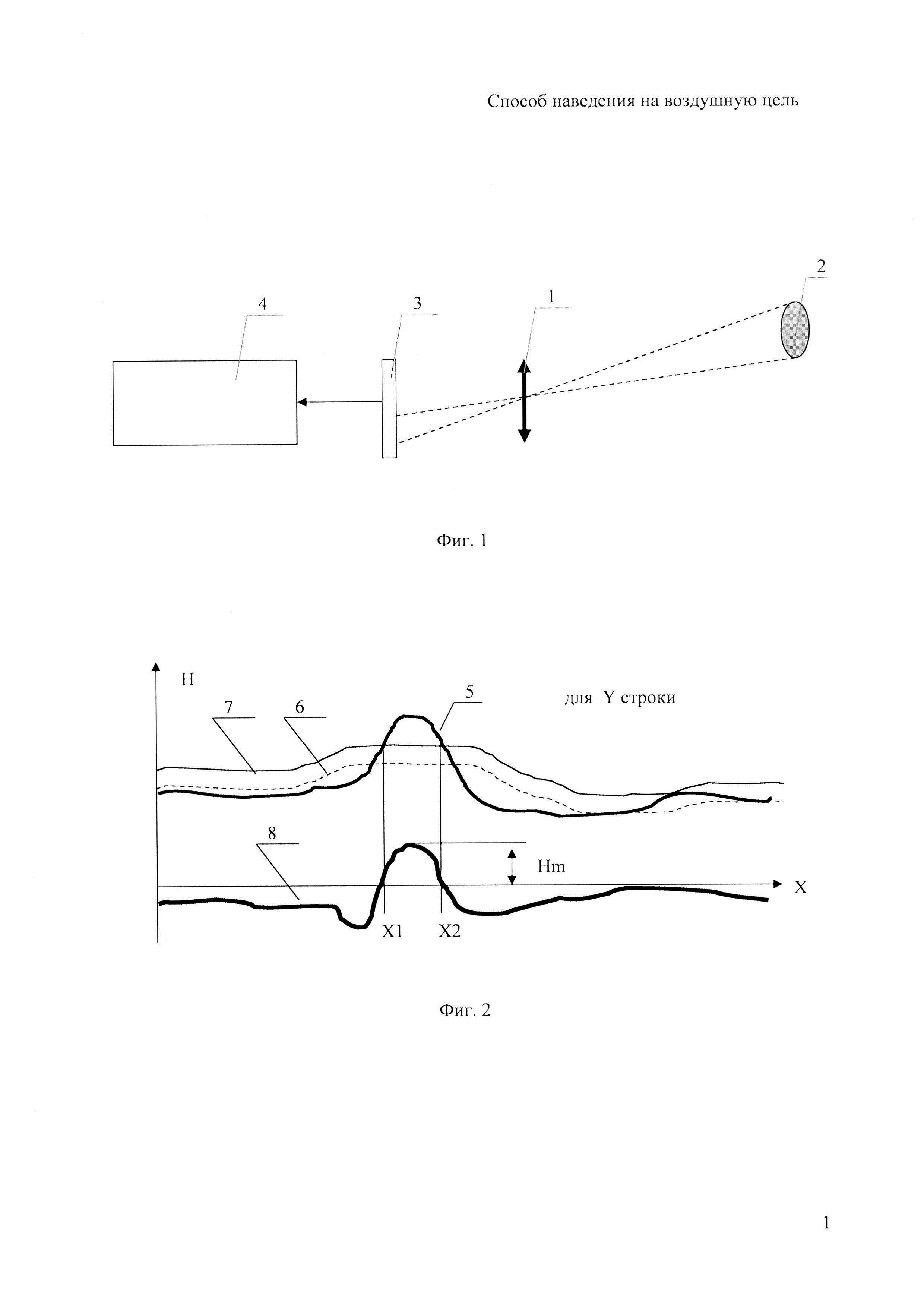 1. Способ наведения на воздушную цель, включающий определение координат цели по индуцируемым в поле зрения оптической головки самонаведения (ОГС) точкам цели, отличающийся тем, что построчно регистрируют и записывают сигналы от пикселей фоточувствительной матрицы, регистрирующей текущее изображение поля зрения ОГС, начиная с первой строки матрицы, обрабатывают сигналы от пикселей, одновременно с обработкой сигналов от пикселей в текущей строке записывают сигналы от пикселей в следующей строке, в процессе обработки сигналов в текущей строке проводят усреднение значения сигналов от каждого пикселя с заданного количества окружающих его пикселей, полученные усредненные значения сигналов преобразуют в зависимости от яркости цели относительно яркости окружающего ее фона и определяют разность Н усредненного и неусредненного сигналов, начиная с начала текущей строки определяют номер пикселя X1, для которого значение Н становится положительным, максимальное положительное значение Hm, номер пикселя Х2, после которого значение Н в текущей строке не является положительным, номер текущей строки Y, записывают в память X1, Hm, X2, Y, обрабатывают следующую строку матрицы, определяют в ней значения X1, Hm, X2, Y, и в случае превышения величины Hm значения, записанного для предыдущей строки, перезаписывают в память новые значения X1, Hm, X2, Y, по окончании обработки сигналов всех строк матрицы определяют координаты цели как (Х1+Х2)/2 и Y и выдают соответствующие управляющие сигналы на исполнительные устройства носителя. 2. Способ наведения на воздушную цель по п. 1, отличающийся тем, что при яркости цели превышающей яркость окружающего ее фона, полученные усредненные значения сигналов увеличивают на заданную величину, полученные в результате увеличенные усредненные значения сигналов от каждого пикселя вычитают из значения сигналов, полученных от соответствующих пикселей, получают значение Н разности сигналов. 3. Способ наведения на воздушную цель по п. 1, отличающийся тем, что при яркости цели меньше яркости окружающего ее фона, полученные усредненные значения сигналов уменьшают на заданную величину, из полученных уменьшенных усредненных значений сигналов от каждого пикселя вычитают сигналы, полученные от соответствующих пикселей, получают значение Н разности сигналов. 4. Способ наведения на воздушную цель по п. 1, отличающийся тем, что в процессе обработки пикселей в текущей строке при повторном выявлении группы смежных пикселей с положительным значением Н, повторно определяют значение Hm и в случае его превышения над ранее определенным в текущей строке перезаписывают значения X1, Hm, X2, Y. 5. Способ наведения на воздушную цель по п. 1, отличающийся тем, что при достижении значения Х2-Х1 заранее известной величины выдают управляющий сигнал на исполнительные устройства носителя о достижении заданной дистанции до цели известного размера. 6. Способ наведения на воздушную цель по п. 1, отличающийся тем, что определяют и запоминают минимальное Y1 и максимальное значение Y2 строк, вне которых нет положительных значений Н, при достижении значения (Y2-Y1) заранее известной величины выдают сигнал на исполнительные устройства носителя о достижении заданной дистанции до воздушного объекта известного размера. 7. Способ наведения на воздушную цель по п. 1, отличающ