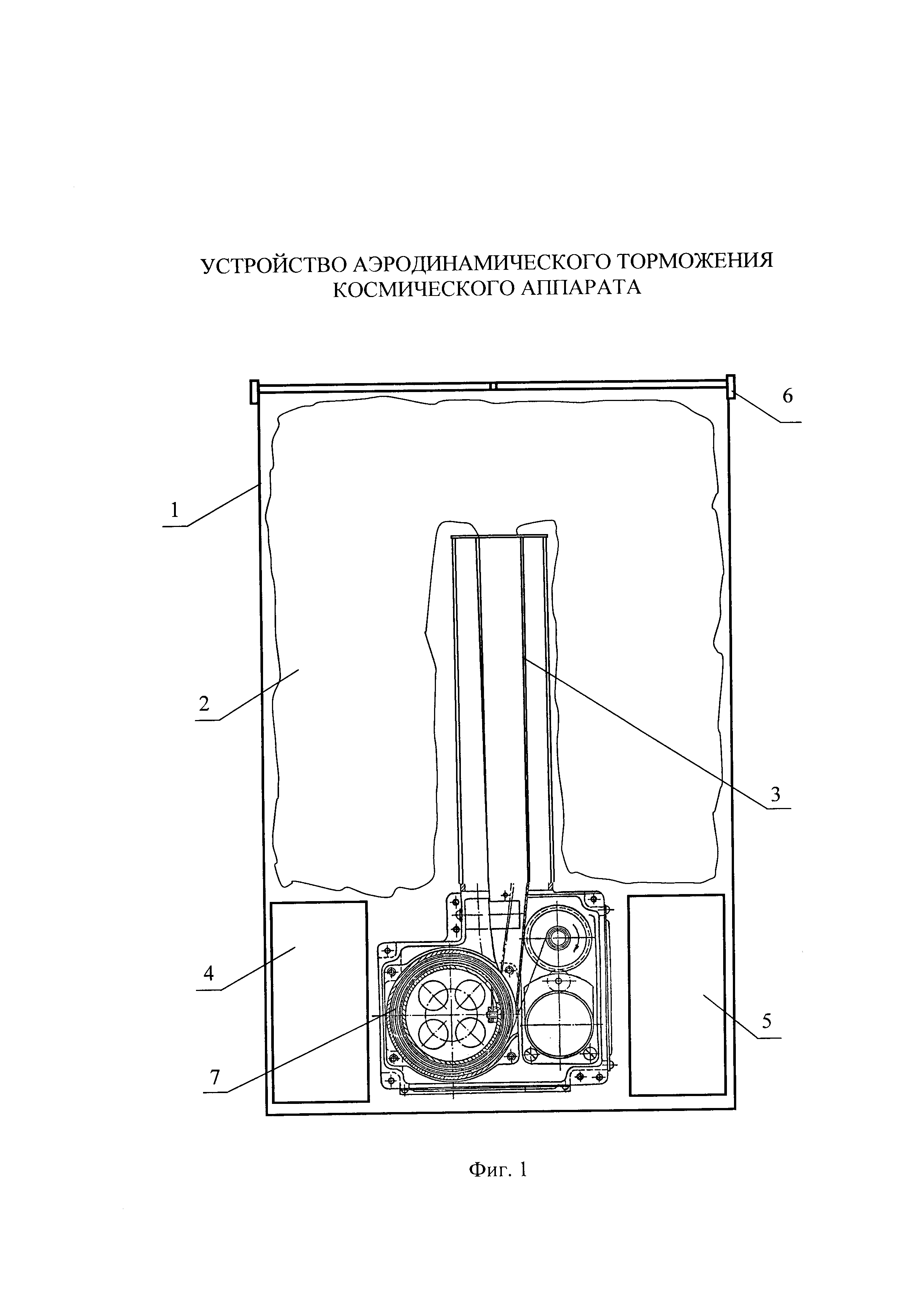 1. Устройство аэродинамического торможения космического аппарата (КА), включающее контейнер с надувной конструкцией из эластичной оболочки, механизм ее крепления к контейнеру, выталкивания и раскрытия, отличающееся тем, что в контейнере установлена автономная система электропитания, автономные или связанные с КА спецвычислитель и радиолиния управления механизмом раскрытия, выключенная при штатной работе КА, механизм выталкивания и крепления к контейнеру надувной конструкции выполнен в виде раздвижной штанги телескопического типа или из упругой металлической ленты с длиной в раскрытом виде, превышающей максимальный габарит КА, эластичная оболочка выполнена из материала изменяемой под воздействием солнечного излучения ультрафиолетового диапазона жесткости и закреплена на торце раздвижной штанги, оболочка выполнена светопроницаемой для солнечного излучения и заполнена газифицируемым под действием ультрафиолетового диапазона солнечного излучения порошковым материалом, с обеспечением наддува оболочки до площади миделя, превышающей площадь миделя КА не менее чем в три раза, при этом контейнер выполнен из непрозрачного для ультрафиолетового солнечного излучения материала. 2. Устройство по п. 1, отличающееся тем, что контейнер установлен на торце раздвижной штанги телескопического типа. 3. Устройство по любому из пп. 1, 2, отличающееся тем, что эластичная оболочка связана гибким шлангом с газовым баллоном, размещенным в контейнере или корпусе КА.
