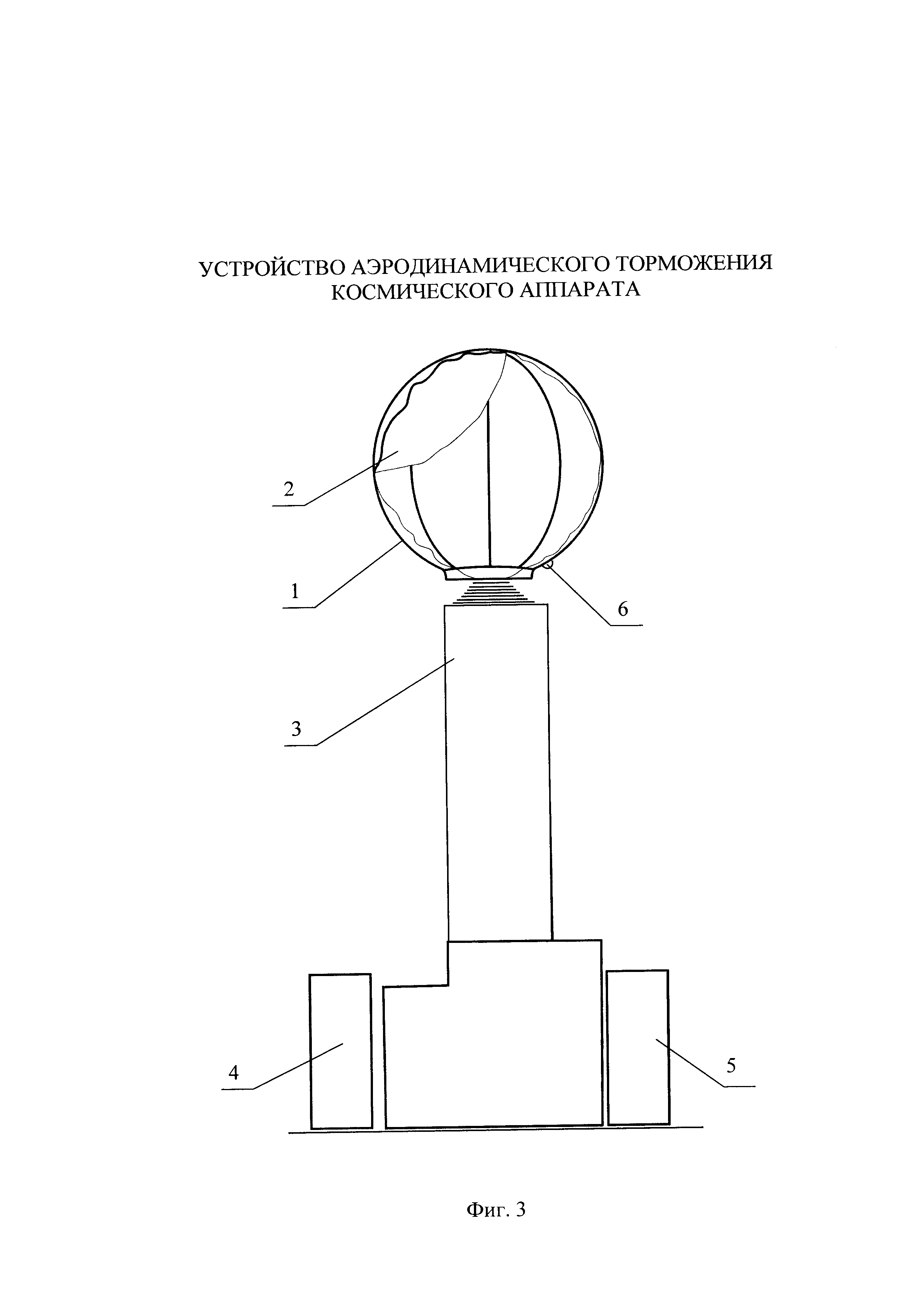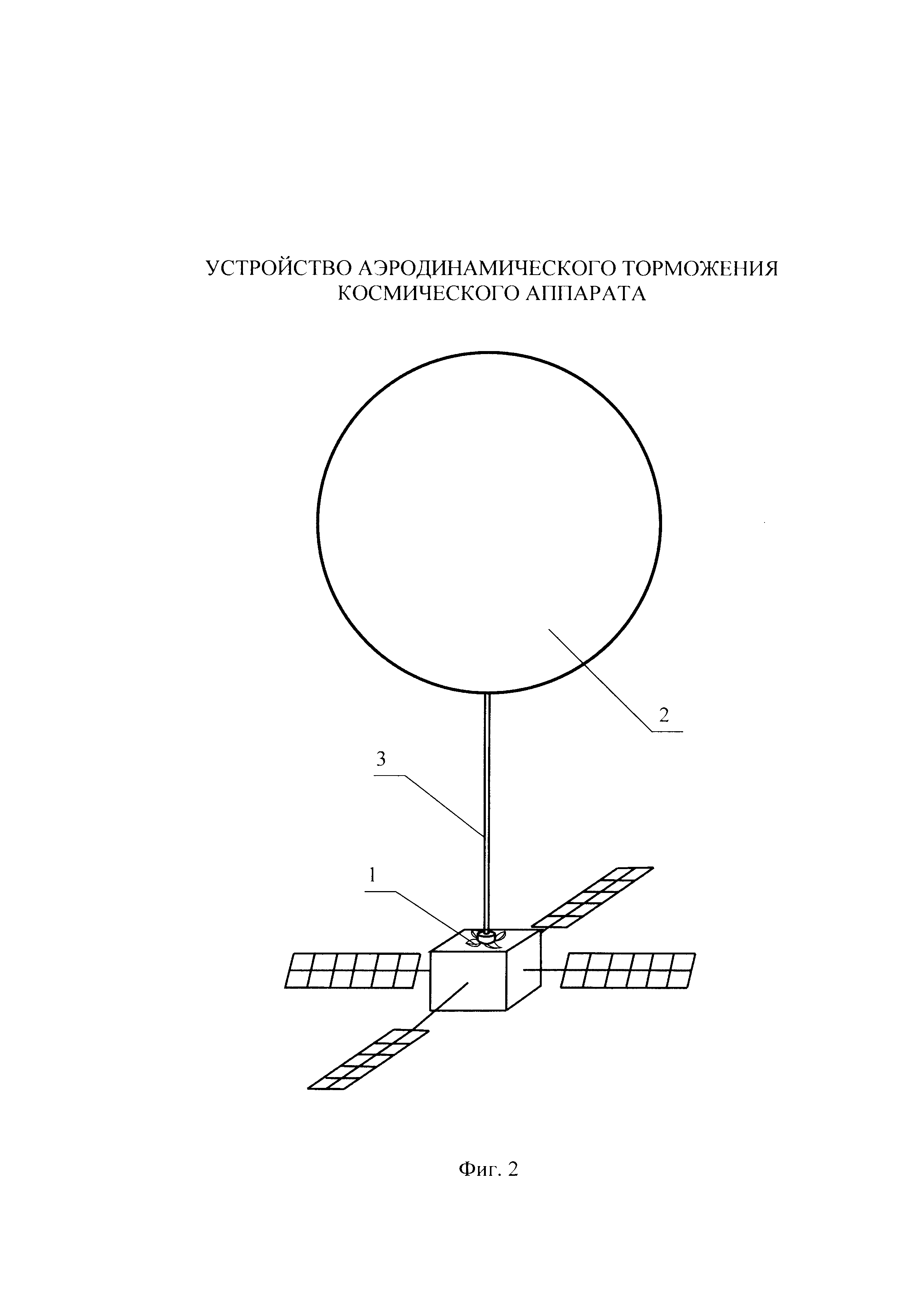 Изобретение относится к средствам увода с орбиты выработавших свой ресурс или отказавших автоматических космических аппаратов (КА). Устройство содержит контейнер (1) с надувной конструкцией в виде эластичной оболочки (2), механизм ее крепления к контейнеру, выталкивания и раскрытия. Данный механизм включает в себя раздвижную телескопическую штангу (3) или упругую ленту с длиной в раскрытом состоянии, превышающей максимальный габарит КА. В контейнере, который может быть установлен на торце штанги (3), размещены системы автономного электропитания, радиосвязи и др. Оболочка (2) выполнена из материала с жесткостью, изменяемой под действием солнечного ультрафиолетового излучения, и заполнена порошком, газифицируемым под действием указанного излучения. Оболочка (2) может быть также связана гибким шлангом с газовым баллоном, размещенным в контейнере или корпусе КА. Площадь миделя оболочки (2) в рабочем состоянии не менее чем в три раза превышает площадь миделя КА. Техническим результатом является повышение автономности устройства аэродинамического торможения КА и возможности его применения при любой ориентации КА. 2 з.п. ф-лы, 3 ил.