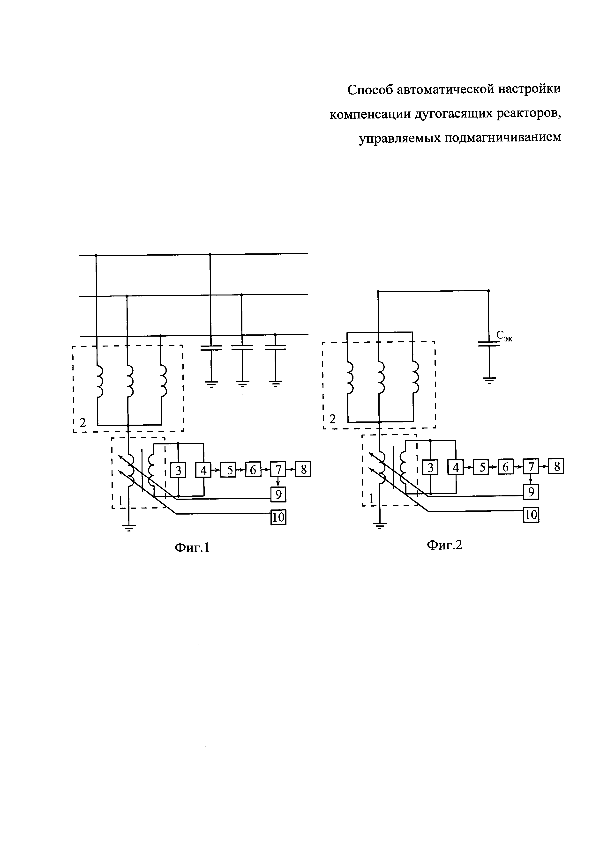 Способ автоматической настройки компенсации дугогасящих реакторов, управляемых подмагничиванием, заключающийся в формировании в контуре нулевой последовательности сети переходного процесса с помощью импульсного источника опорного тока большой скважности, измерении напряжения на сигнальной обмотке реактора и выделении свободной составляющей переходного процесса, на основании параметров которого вычисляют емкость сети по нулевой последовательности и, соответственно, необходимый ток компенсации, отличающийся тем, что к напряжению, измеренному на сигнальной обмотке реактора, применяют вейвлет-преобразование, и определяют временные зависимости вейвлет-коэффициентов, выбирают коэффициент с максимальной амплитудой, соответствующей частоте свободных колебаний контура нулевой последовательности, при этом при попадании максимального вейвлет-коэффициента в диапазон частот 35-70 Гц осуществляют управление подмагничиванием ДГР, изменяющее его индуктивность до тех пор, пока частота собственных колебаний контура не выйдет за пределы указанного диапазона, по найденной частоте определяют емкость сети и необходимый ток компенсации.