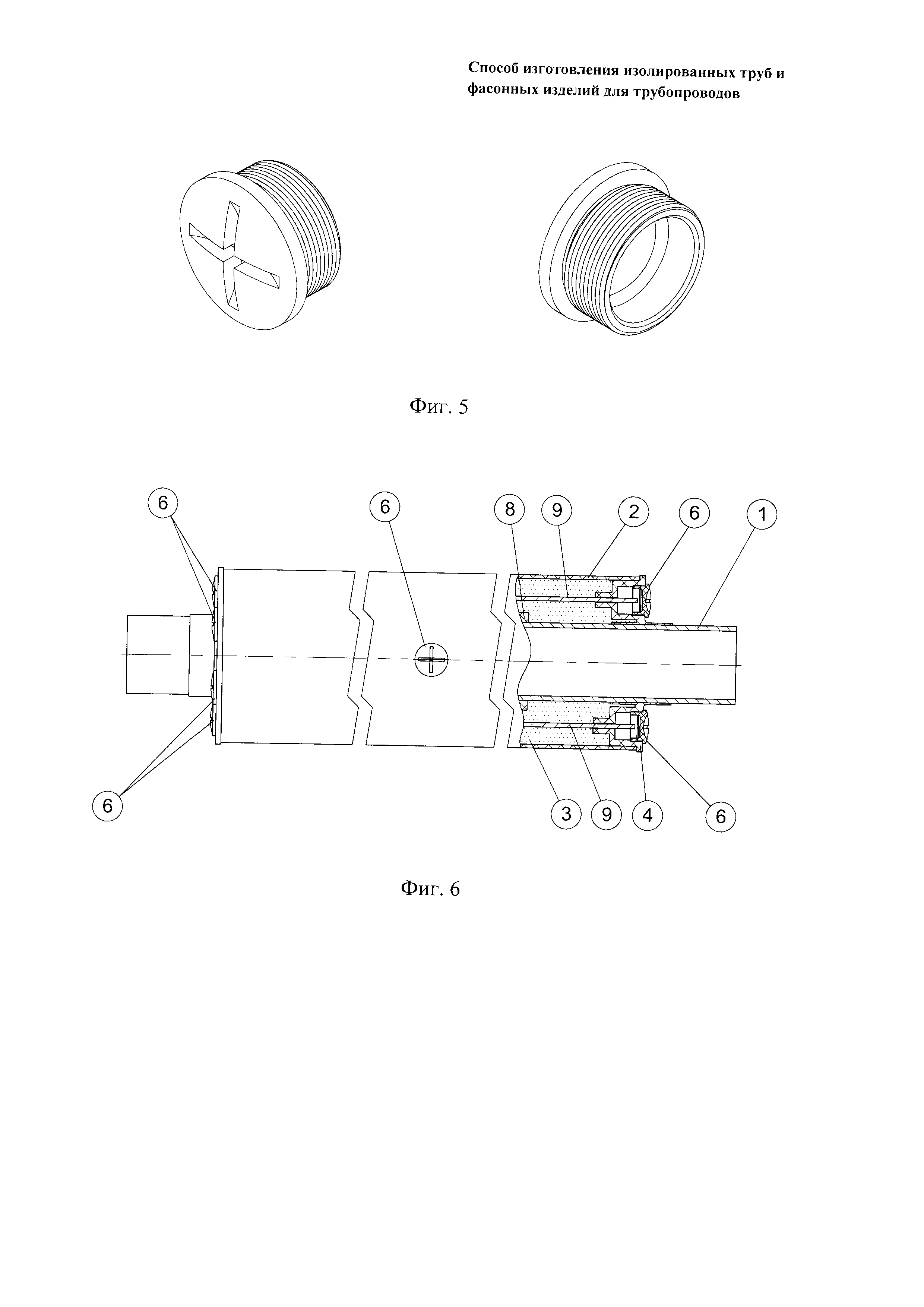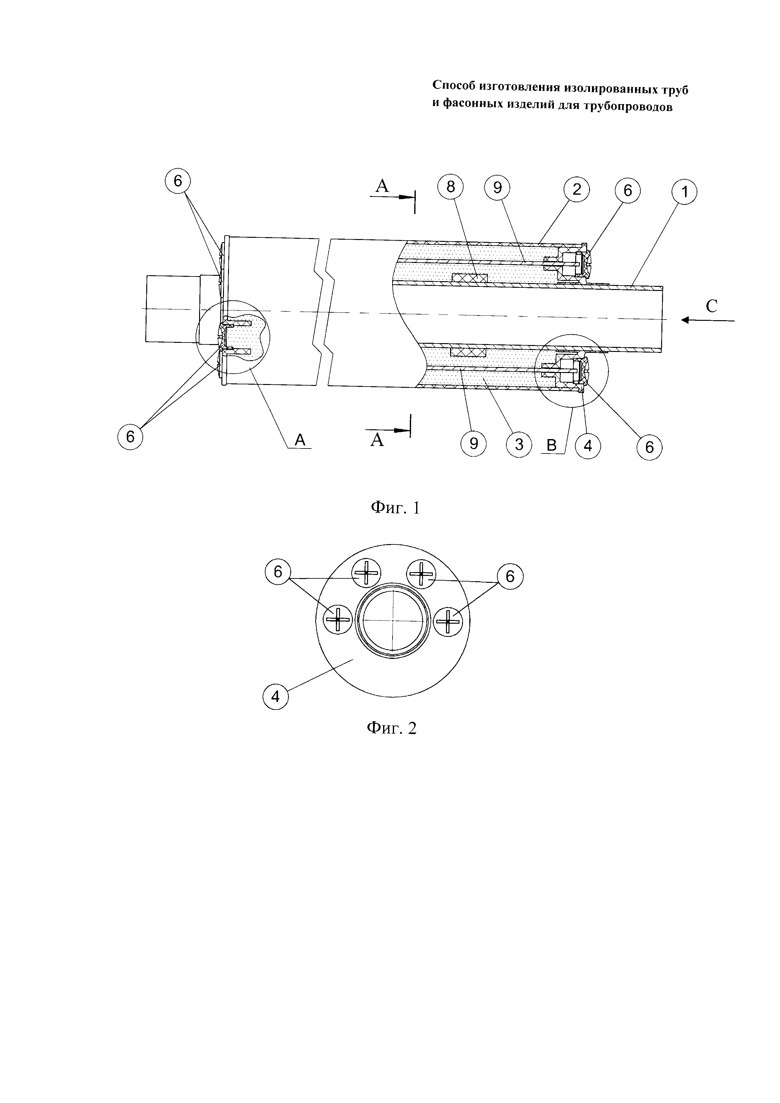 1. Способ изготовления изолированных труб или фасонных изделий для трубопроводов, включающий концентричное размещение рабочей трубы с центрирующими элементами внутри трубы-оболочки с образованием конструкции «труба в трубе», герметизацию образовавшейся кольцевой полости конструкции «труба в трубе» торцевыми заглушками и заполнение кольцевой полости вспенивающимся теплоизоляционным материалом, отличающийся тем, что перед заполнением кольцевой полости вспенивающимся теплоизоляционным материалом, торцевые заглушки неразъемно соединяют, как минимум, с одной из труб конструкции «труба в трубе», производят подачу вспенивающегося теплоизоляционного материала через технологическое отверстие или отверстия в одной из торцевых заглушек, после окончания подачи вспенивающегося теплоизоляционного материала технологическое отверстие или отверстия в торцевых заглушках герметизируют, при этом вывод газов, создающих избыточное давление в кольцевой полости, производят через перфорированный участок на торцевой заглушке, выполненной с диаметром отверстий перфорации 0,1 ÷ 3,0 мм. 2. Способ по п. 1, отличающийся тем, что неразъемное соединение торцевой заглушки с гидрозащитной трубой-оболочкой выполнено сваркой или клеевым соединением. 3. Способ по п. 1, отличающийся тем, что технологическое отверстие в торцевой заглушке герметизируют резьбовой пробкой, при этом технологическое отверстие в торцевой заглушке выполнено с отбортовкой с внутренней резьбой под резьбовую пробку. 4. Способ по п. 3, отличающийся тем, что гидрозащитная труба-оболочка, торцевые заглушки и резьбовые пробки выполнены из полимерных материалов. 5. Способ по п. 1, отличающийся тем, что в кольцевой полости между трубой-оболочкой и рабочей трубой до заполнения кольцевой полости вспенивающимся теплоизоляционным материалом устанавливают элементы системы мониторинга слоя теплоизоляции, при этом одна или обе торцевые заглушки выполнены с отверстиями для выхода проводов указанной системы. 6. Способ по п. 1 или 3, отличающийся тем, что торцевая заглушка выполнена монолитной или составной из нескольких сборных частей. 7. Способ по п. 1 или 2, отличающийся тем, что перфорированный участок в торцевой заглушке герметизируют резьбовой пробкой, при этом торцевая заглушка в зоне перфорированного участка выполнена с отбортовкой с внутренней резьбой под резьбовую пробку. 8. Способ по п. 3 или 7, отличающийся тем, что резьбовая пробка выполнена с пазом под отвертку и унифицирована для всех отверстий и перфорированного участка. 9. Способ по п. 1, отличающийся тем, что в процессе заполнения кольцевой полости между трубой-оболочкой и рабочей трубой вспенивающимся теплоизоляционным материалом конструкцию «труба в трубе» располагают под углом к горизонту, отличным от 0°. 10. Способ по п. 1, отличающийся тем, что в процессе заполнения кольцевой полости между трубой-оболочкой и рабочей трубой вспенивающимся теплоизоляционным материалом конструкцию «труба в трубе» располагают в горизонтальном положении. 11. Способ по п. 1, отличающийся тем, что торцевые заглушки и резьбовые пробки после окончания эксплуатации подлежат вторичной переработке.