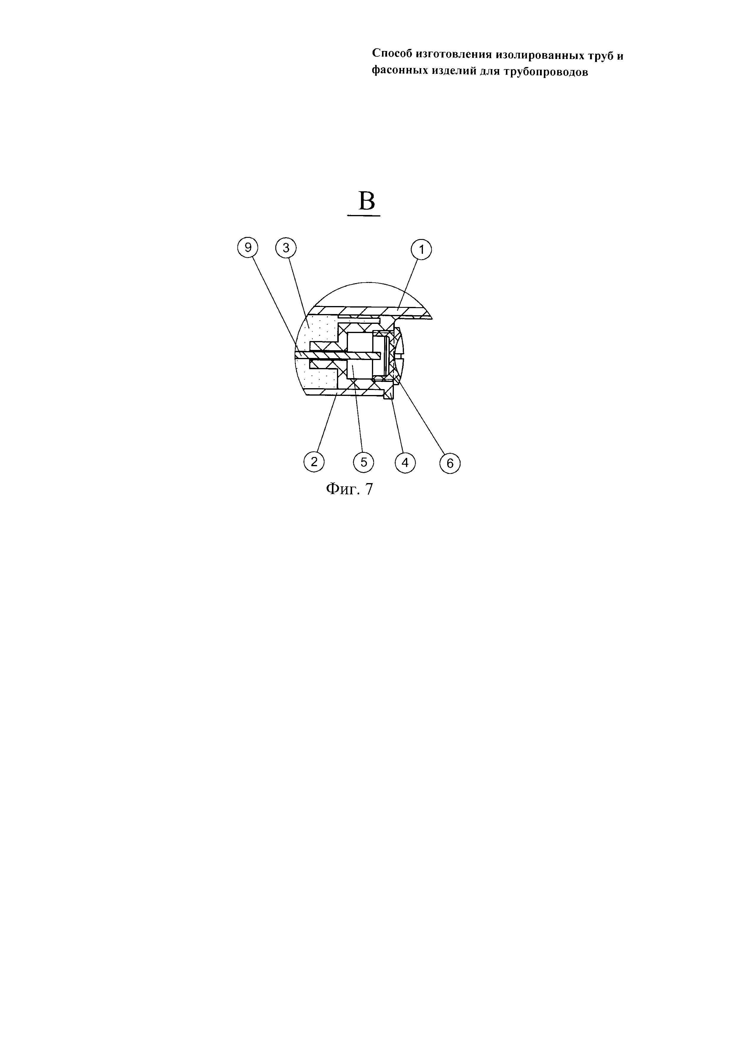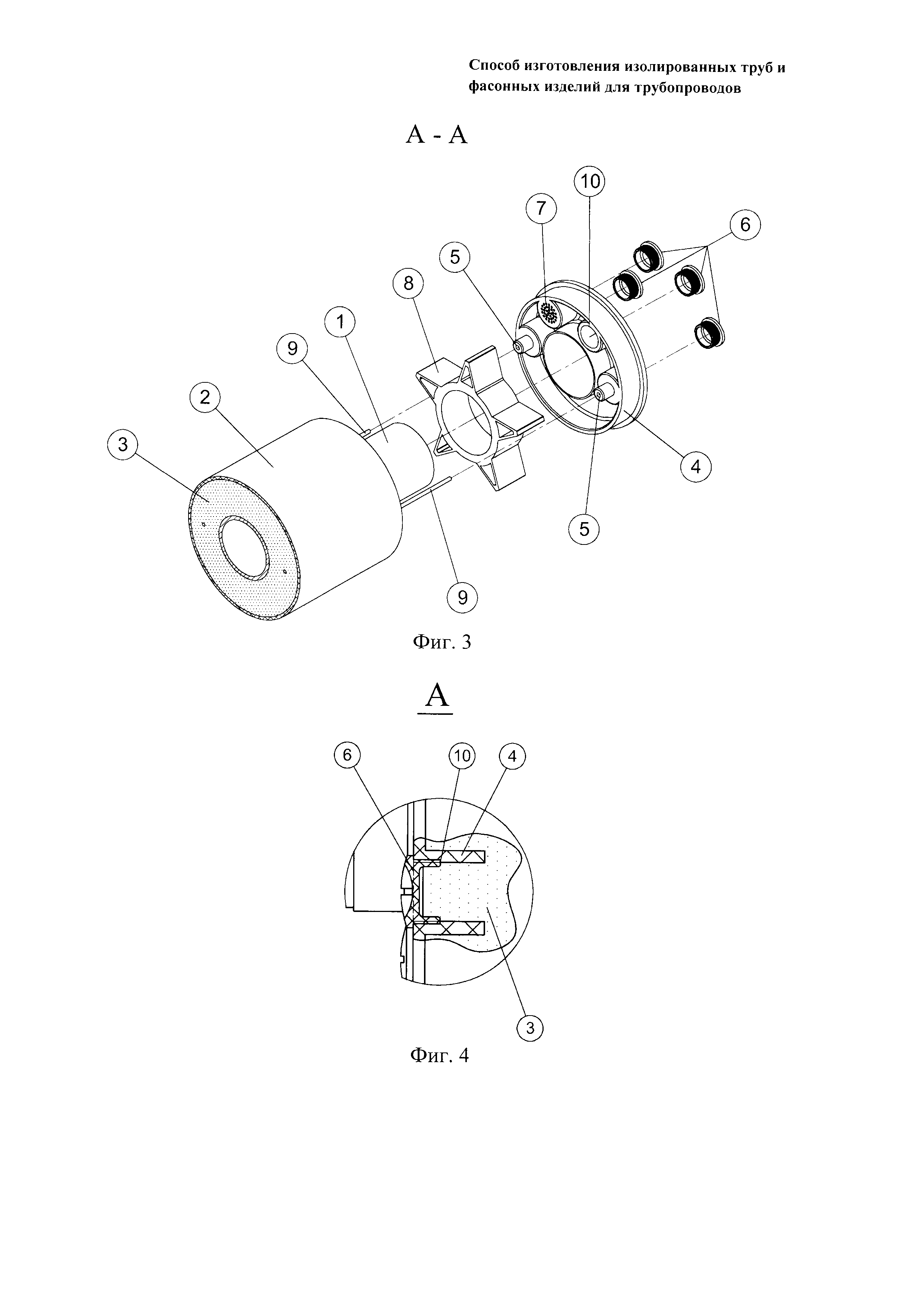 Область техники, к которой относится изобретение Изобретение относится к трубопроводной технике, в частности к способу изготовления предварительно теплоизолированных труб и фасонных изделий для трубопроводов, в которых в качестве теплоизоляционного покрытия выступает вспенивающийся материал, например пенополиуретан. Указанные трубы и фасонные изделия применяются при строительстве трубопроводных систем для различных отраслей промышленности. Предварительно изолированная труба преимущественно представляет собой единую конструкцию «труба в трубе», состоящую из: внутренней рабочей (металлической или полимерной) трубы с установленными центрирующими опорами, нанесенного на нее слоя теплоизоляции, системы мониторинга состояния слоя теплоизоляции в виде системы оперативно дистанционного контроля (СОДК) или системы обнаружения утечек (СОУ) и внешней гидрозащитной трубы-оболочки. В качестве компонентов образования слоя теплоизоляции выступают материалы, образующие пенополимеры различных типов: пенопласты; поропласты; сотопласты и др. Предварительно изолированные фасонные изделия для трубопроводов (далее - фасонные изделия) обладают аналогичной конструкцией и предназначены для обеспечения изменения направления, слияния или деления, расширения или сужения потока теплоносителя, выступающего в качестве рабочей среды. В качестве фасонных изделий используются отводы, переходы, тройники и другие элементы, необходимые для полноценной работы трубопровода или трубопроводной системы. Известен способ изготовления теплоизолированной трубы (патент РФ RU 2273787, 2006 г.), в соответствии с которым наружные и внутренние поверхности герметизируют съемными заглушками, к рабочей трубе прикрепляют центраторы, количество которых, а также расстояние между смежными центраторами выбирают исходя из условия несминаемости оболочки частью массы трубы, приходящейся на один центрирующий элемент. Приводят установку в горизонтальное положение, устанавливают на ложе емкости внешнюю оболочку из оцинкованной листовой стали, покрытую теплоотражающим материалом, и устанавливают на ложе емкости с упором. Подают в емкость жидкость (техническую воду) и за счет ее выталкивающей силы добиваются соосности рабочей трубы и трубы-оболочки. Далее рабочую трубу вводят в трубу-оболочку путем проталкивания. После установки рабочей трубы в трубу-оболочку емкость освобождают от жидкости и удаляют влагу путем сушки. Затем кольцевой зазор между трубами со стороны торцов герметизируют заглушками, выполненными в виде усеченного конуса с наружной и внутренней конусностью соответственно, большими основаниями направленными противоположно, предварительно покрыв герметизирующим составом сопрягаемые поверхности заглушек. При использовании в качестве теплоизоляции вспенивающегося материала (пенополиуретана), с помощью дискообразного приспособления с направляющей хвостовой частью плотно герметизируют кольцевые зазоры на торцах заглушками, после чего фиксируют стопорными болтами. Затем через отверстие трубы-оболочки кольцевой зазор между рабочей трубой и трубой-оболочкой заполняют вспенивающимся теплоизолирующим материалом. В случае использования в качестве теплоизоляционного материала воздуха, в оболочку монтируют компенсационный клапан для 