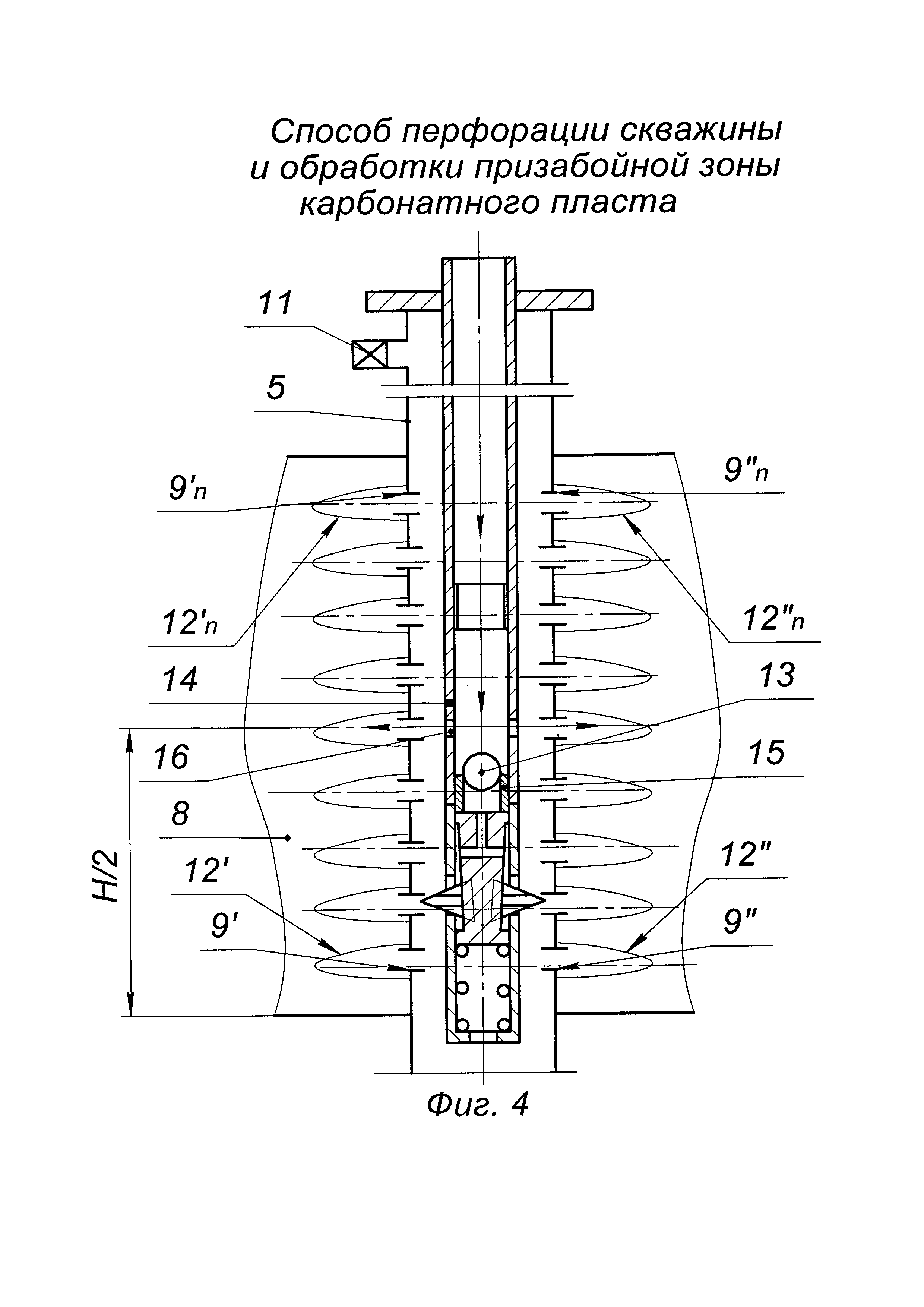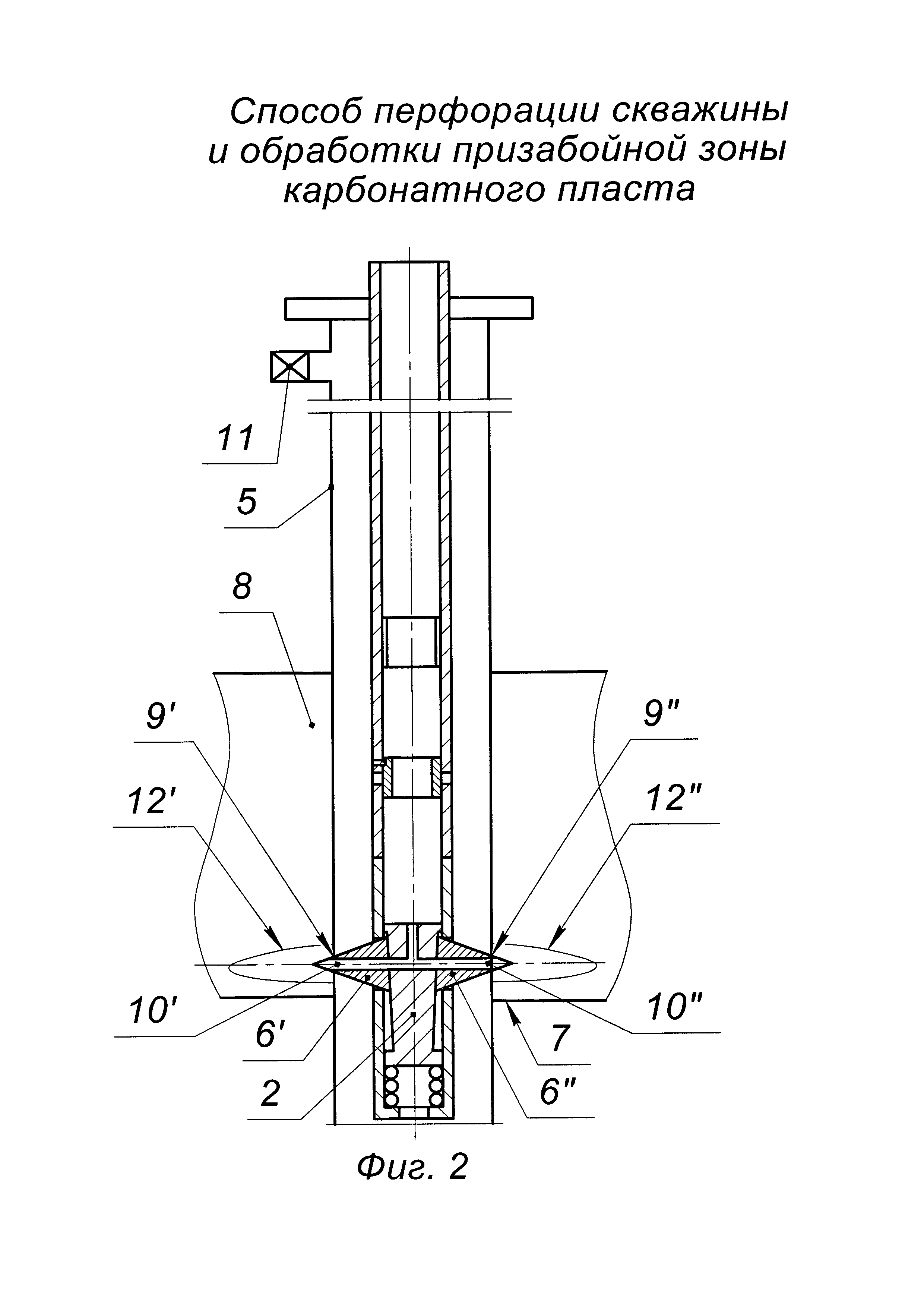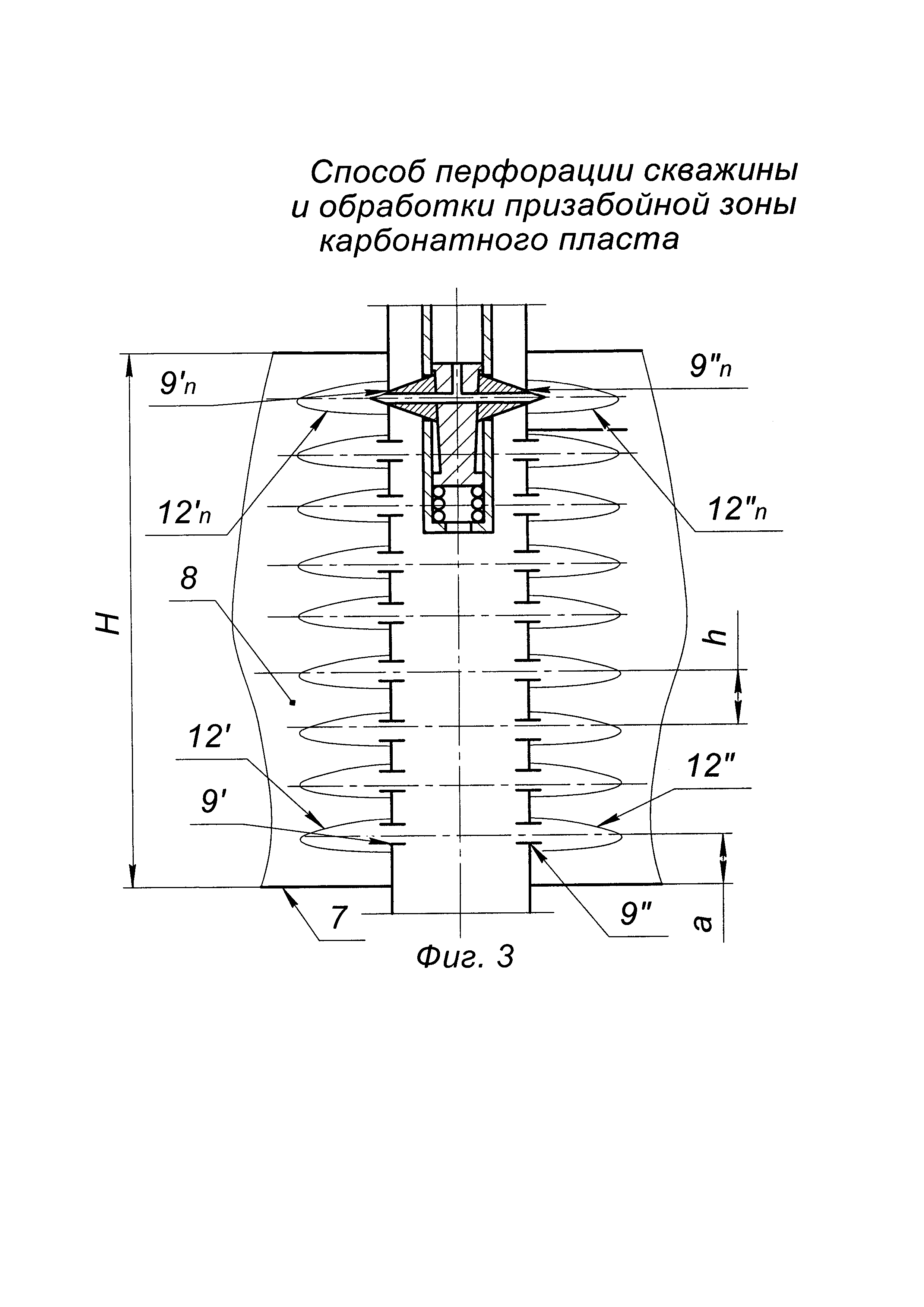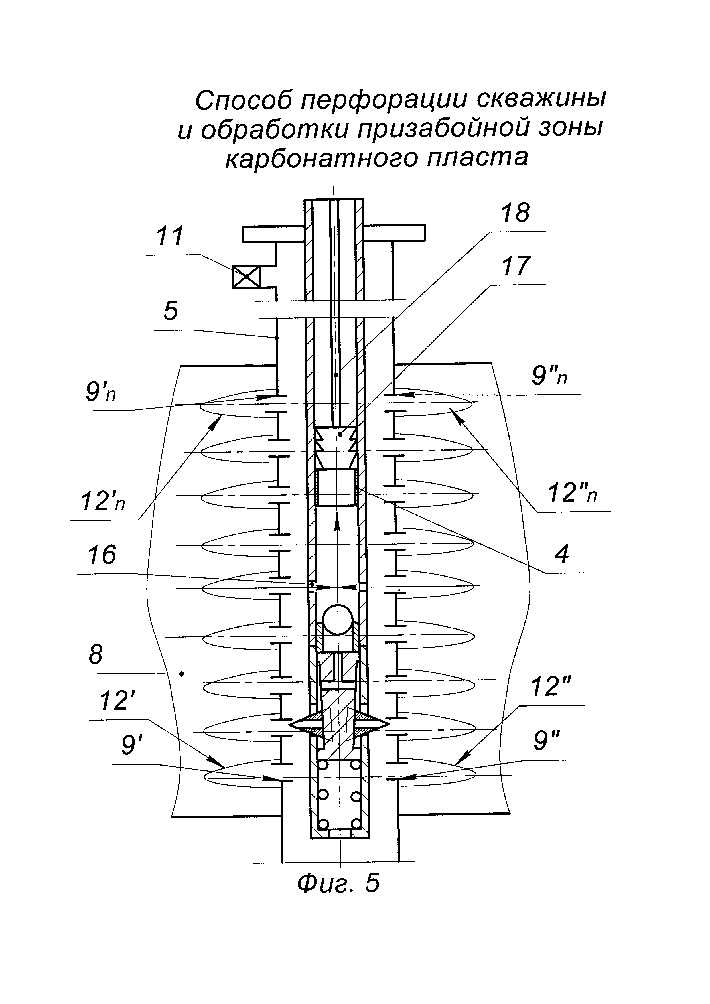 Изобретение относится к нефтегазодобывающей промышленности, к области эксплуатации скважин, а именно к способам вторичного вскрытия и обработки призабойной зоны карбонатных пластов. Способ включает спуск колонны НКТ с гидромеханическим прокалывающим перфоратором на нижнем конце в эксплуатационную колонну, вскрытие эксплуатационной колонны путем подачи в перфоратор под давлением рабочей жидкости с прокалыванием пробойниками перфорационных отверстий в эксплуатационной колонне, размытие каверн путем подачи рабочей жидкости в сформированные перфорационные отверстия эксплуатационной колонны через гидромониторные каналы пробойников перфоратора. На устье скважины на нижний конец колонны НКТ снизу вверх собирают компоновку: гидромеханический прокалывающий перфоратор, циркуляционный клапан и свабный ограничитель, спускают компоновку на колонне НКТ в эксплуатационную колонну так, чтобы пробойники перфоратора находились на 0,2 м выше подошвы продуктивного пласта. Производят ступенчатую прокалывающую гидромеханическую перфорацию - ПГМП с намывом каверн снизу вверх в продуктивном пласте с шагом 0,2 м. На каждой ступени в колонне НКТ и перфораторе ступенчато создают давление 5,0 - 8,0 - 10,0 - 12,0 МПа с выдержкой 10 сек при достижении каждого значения. Пробойники перфоратора прокалывают два симметричных отверстия в эксплуатационной колонне, расположенных под углом 180° в интервале продуктивного пласта. Не извлекая пробойники перфоратора из перфорационных отверстий в эксплуатационной колонне, доводят давление закачки до 15,0 МПа и через гидромониторные каналы пробойников перфоратора производят размыв каверн рабочей жидкостью в течение 15 мин. Сбрасывают давление в колонне НКТ и перфораторе до нуля, затем все вышеописанные технологические операции, начиная с создания давления и заканчивая сбросом давления, повторяют в зависимости от высоты продуктивного пласта. По окончании ступенчатой ПГМП с размывом каверн производят обработку пласта и извлекают продукты реакции, для этого доспускают колонну НКТ в эксплуатационную колонну так, чтобы циркуляционный клапан находился посередине продуктивного пласта, сбрасывают шар в колонну НКТ, повышают давление в колонне НКТ до открытия отверстий в циркуляционном клапане, затем при открытой затрубной задвижке закачивают в колонну НКТ 15%-ный водный раствор соляной кислоты в объеме из расчета 1,5 мна 1 м высоты продуктивного пласта, доводят 15%-ный водный раствор соляной кислоты до интервала вскрытия, закрывают затрубную задвижку и продавливают 15%-ный водный раствор соляной кислоты через каверны в призабойную зону пласта, спускают сваб в колонну НКТ и свабированием по колонне НКТ извлекают продукты реакции 15%-ного водного раствора соляной кислоты с породой пласта и осваивают скважину. Обеспечивается повышение эффективности обработки призабойной зоны карбонатного пласта; повышение качества очистки призабойной зоны карбонатного пласта, повышение надежности реализации способа, снижение материальных затрат на реализацию способа. 5 ил.