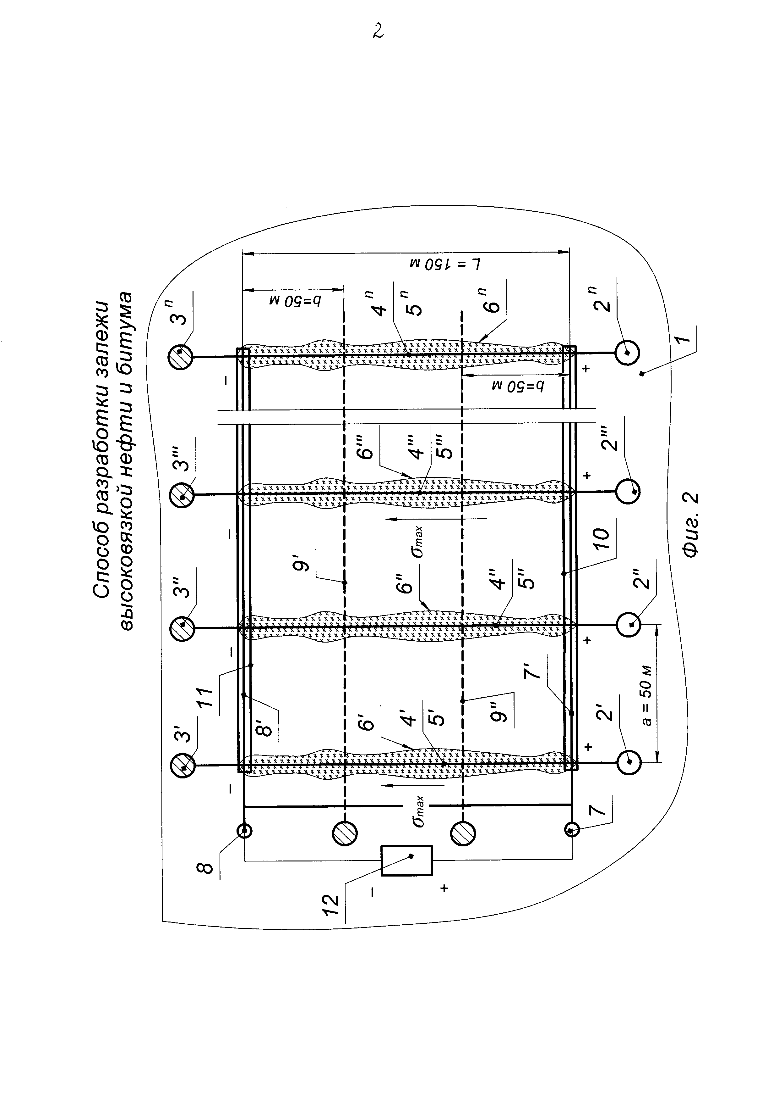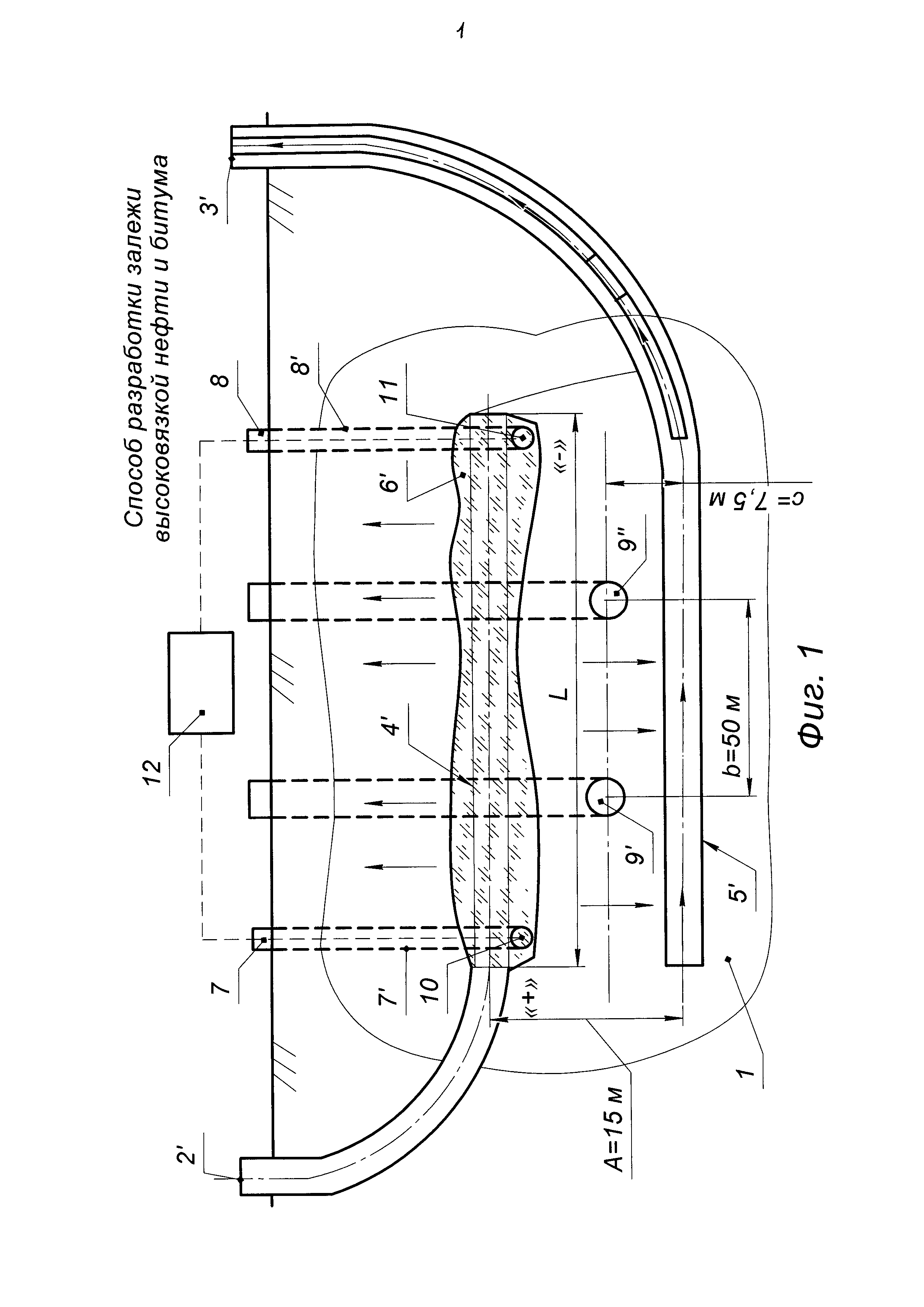 Предложение относится к нефтегазодобывающей промышленности и предназначено для разработки залежи высоковязкой нефти и битума путем нагревания. Известен способ разработки залежи высоковязкой нефти и битума (Вахитов Г.Г., Симкин Э.М. Использование физических полей для извлечения нефти из пластов. - М.: Недра, 1985, с. 192-194), включающий воздействие электрическим полем на пласт через скважины. Недостатком способа является низкая эффективность разработки залежи высоковязкой нефти и битума из-за недостаточного охвата пласта электрическим полем и прогреванием. Известен способ разработки залежи высоковязкой нефти и битума (патент RU №2418163, МПК E21B 43/24, опубл. 10.05.2011 г., бюл. №13), включающий строительство скважины с подземной емкостью, вскрытие пласта горизонтальными скважинами, устья которых обвязаны через дистанционно управляемые задвижки и коллектор с подземной емкостью, прогрев пласта, сбор продукции в подземной емкости и ее откачку на поверхность насосами, при этом прогрев пласта для приведения его продукции в текучее состояние осуществляют комбинированным воздействием электромагнитных и акустических полей, создаваемых излучателями, помещенными в горизонтальные скважины с возможностью периодического перемещения и соединенными через устьевые уплотнители и соответствующие линии передач внутри скважины с наземными генераторами высокочастотных и акустических колебаний, причем прогрев участков пласта начинают согласно принятой технологии добычи от устья горизонтальных скважин до забоя для попутного прогрева в последующем неохваченных полями участков пласта теплом протекающей продукции, оптимальной температуры которой достигают регулированием дебита дистанционно управляемыми задвижками, при этом продукция пласта в гравитационном режиме и под действием пластового давления поступает в подземную емкость, а насосы для откачки продукции помещают в дополнительную скважину, соединенную с наземной системой улавливания легких фракций и перфорированную в зоне подземной емкости, при этом генераторы высокочастотных и акустических колебаний помещают в зоне пласта в скважине, а на разрабатываемом месторождении строят скважины, охватывая всю его площадь, а расстояния между ними выбирают больше двойных длин горизонтальных скважин. Недостатками способа являются: - во-первых, сложный технологический процесс реализации способа; - во-вторых, дороговизна осуществления способа, связанная с применением большого количества технологического оборудования (наземных генераторов высокочастотных и акустических колебаний, излучателей, подземной емкости и т.д.) и строительством дополнительной скважины. Эти затраты повышают себестоимость добычи нефти; - в-третьих, небольшой охват тепловым воздействием залежи и, как следствие, низкие коэффициенты охвата и нефтеотдачи залежи высоковязкой нефти и битума. Наиболее близким по технической сущности является способ разработки залежи высоковязкой нефти и битума (патент RU №2085715, МПК E21B 43/24, опубл. 27.07.1997 г., бюл. №21), включающий разбуривание залежи двумя технологическими скважинами и добывающей скважиной с горизонтальными стволами, направленными параллельно друг другу, при этом в горизонтальные стволы технологических скважин устанавливают электроды, а на устье скважины соединяют электро