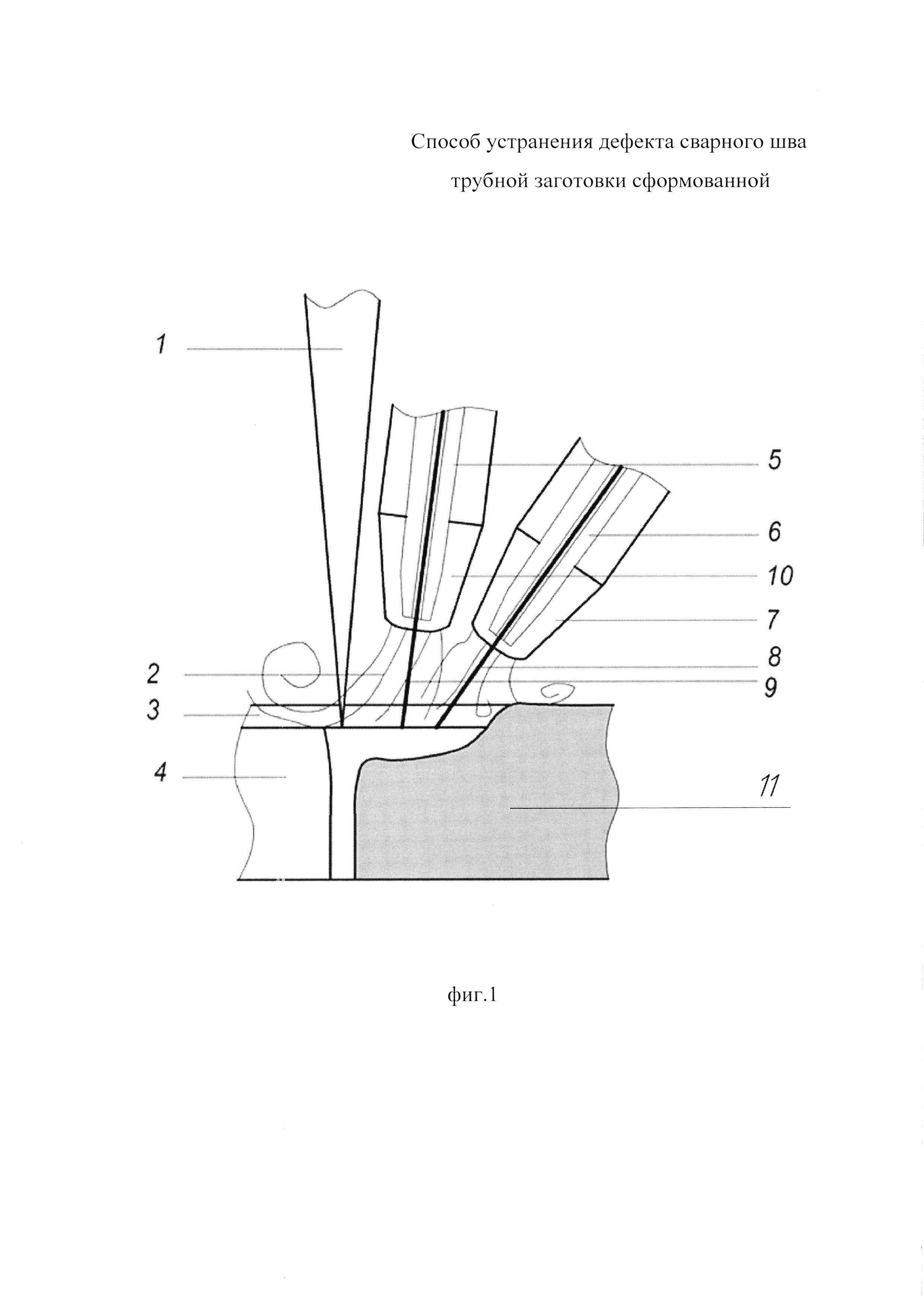 1. Способ устранения дефекта сварного шва трубной сформованной заготовки, выполненного с использованием лазера, включающий обнаружение дефекта, обозначение границ дефекта, выборку дефектного участка в пределах обозначенных границ и заполнение его наплавкой, отличающийся тем, что выборку дефектного участка выполняют лазерной резкой, а его заполнение выполняют гибридной лазерно-дуговой сваркой с использованием по меньшей мере одной сварочной дуговой горелки с плавящимся электродом на обратной полярности, при этом для выборки дефектного участка формируют сфокусированный лазерный луч, который устанавливают перпендикулярно обрабатываемой поверхности, причем позади луча формируют струю воздуха высокого давления, направленную в сторону движения луча по поверхности шва, а для осуществления наплавки формируют расфокусированный лазерный луч, который устанавливают на кромки выборки перед электродом сварочной дуговой горелки, причем лазерный луч и дугу сварочной горелки располагают с образованием общей сварочной ванны, а сварку ведут с увеличенным вылетом электрода сварочной горелки из условия выполнения наплавки за один проход. 2. Способ по п. 1, отличающийся тем, что выборку дефекта выполняют в форме трапеции в продольном сечении. 3. Способ по п. 1, отличающийся тем, что при заполнении наплавкой дефектного участка используют две независимые сварочные дуговые горелки.