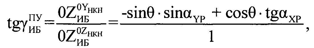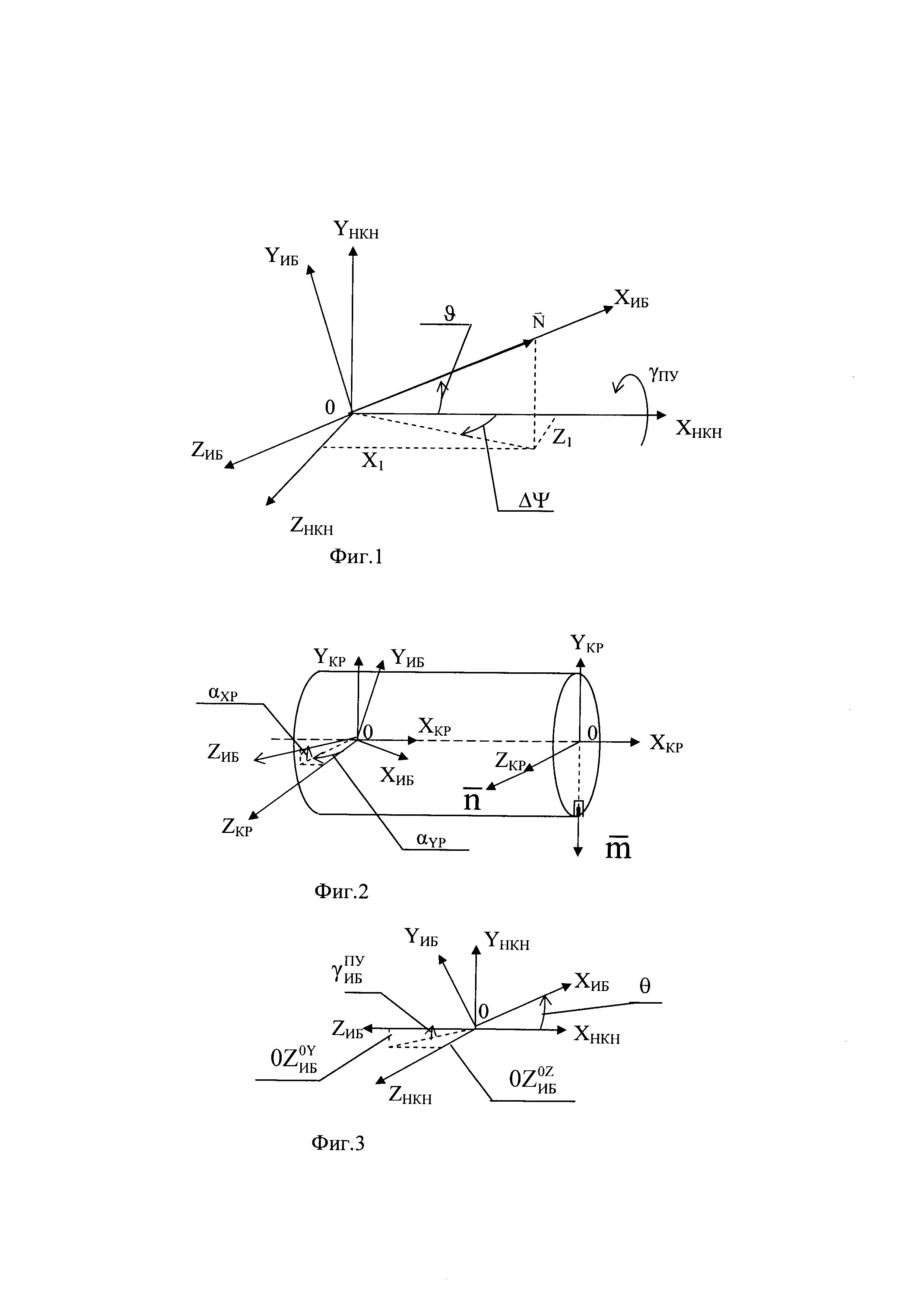 Изобретение относится к военной технике и может найти применение для прицеливания наклонных пусковых установок крылатых ракет, размещаемых на надводных и подводных носителях. Необходимым условием выведения крылатой ракеты (далее - КР) в заданный район (расчетную точку) для последующего самонаведения КР на цель является прицеливание КР, т.е. определение начального азимутального положения осей инерциального блока (далее - ИБ) изделия относительно направления истинного меридиана, до начала проведения режима предстартовой подготовки КР. Погрешность прицеливания КР складывается из целого ряда погрешностей, с которыми изготовлены КР, пусковая установка (далее - ПУ) и др. Например, при установке КР на морском носителе погрешность прицеливания зависит от погрешности положения ИБ относительно внешних узлов КР, стыкуемых с ПУ, погрешности установки ПУ на носителе и погрешности установки навигационного комплекса носителя (далее - НКН). В настоящее время известны способы измерения угловых рассогласований и ближайшим аналогом является способ прицеливания крылатых ракет, базирующихся на самоходной пусковой установке (патент на изобретение №2549215, заявка №2014103975 от 06.02.2014) При прицеливании КР наклонного старта проводятся измерения угловых рассогласований между элементами комплекса по всем трем осям (курс, крен, тангаж). По результатам этих измерений рассчитывается курсовой угол между осями ИБ КР и НКН. Угловые отклонения осей ИБ КР относительно внешних стыковочных узлов на КР, фиксирующих ее положение в ПУ, измеряются на заводе-изготовителе КР, вводятся в бортовой вычислительный комплекс и являются индивидуальными для каждой КР. Параметры, характеризующие угловое положение посадочного места под КР на ПУ относительно НКН измеряются после установки ПУ на морском носителе и являются постоянными на длительный период эксплуатации. Очевидно, что вследствие соотношения длины КР к ее диаметру, достигающему 10:1, измерения углового положения посадочного места КР на ПУ по курсу и тангажу относительно НКН проводятся с более высокой точностью, чем измерение углового положения фиксационного узла ПУ по крену. Например, при линейной погрешности равной ±1 мм, включающей в себя фиксирование контрольных элементов (шкал, рисок, штифты и др.), погрешности имитаторов и методов измерений, угловая погрешность измерения курса и тангажа составляет 30 угл. секунд (для длины КР≅6000 мм), а погрешность измерения крена составит 5 угл. мин (для диаметра КР≅600 мм). Рассмотрим влияние кренового разворота фиксационного узла ПУ, стыкуемого с КР, на курсовое положение ИБ КР относительно НКН. Вывод формулы, описывающий влияние крена ПУ (γПУ) при фиксированном тангажном угле ПУ (ϑ) на курсовое положение ИБ КР (Δψ) приведен ниже. При отсутствии углового разворота ПУ относительно НКН по крену единичный вектор Наличие углового разворота ПУ, а вместе с ней и ИБ в КР, по крену относительно НКН на угол γПУ эквивалентно развороту единичного вектора Тогда дополнительное курсовое рассогласование (угол Δψ) между ИБ КР и НКН будет равен: Или, ввиду малости углов Таким образом, при достаточно больших углах тангажа ϑ (на практике эти углы лежат в диапазоне 15°÷45°) между продольной осью КР и НКН разворот по крену вносит существенное влияние на курсовое положение ИБ КР относительно Н