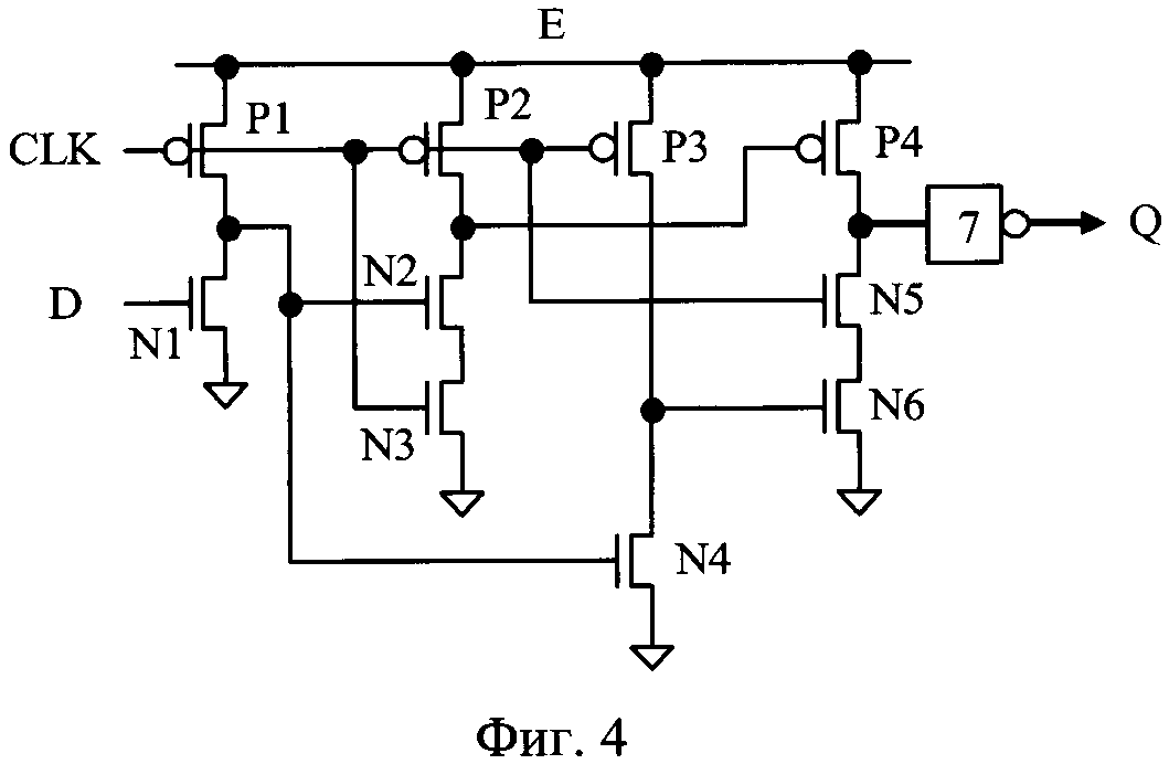 1. Динамический D-триггер, содержащий четыре p-канальных транзистора, шесть n-канальных транзисторов и инвертор, причем затворы первого и второго p-канальных транзисторов, а также третьего n-канального транзистора подключены к входу синхронизации D-триггера, затвор первого n-канального транзистора является информационным входом D-триггера, выход инвертора является прямым информационным выходом D-триггера, истоки всех p-канальных транзисторов подключены к шине питания D-триггера, истоки первого, третьего, четвертого и шестого n-канальных транзисторов подключены к шине "земля" D-триггера, сток первого p-канального транзистора, а также затворы второго и четвертого n-канальных транзисторов подключены к стоку первого n-канального транзистора, сток второго и затвор четвертого p-канальных транзисторов подключены к стоку второго n-канального транзистора, исток второго n-канального транзистора соединен со стоком третьего n-канального транзистора, сток третьего p-канального транзистора соединен со стоком четвертого n-канального транзистора, стоки четвертого p-канального и пятого n-канального транзисторов подключены к входу инвертора, исток пятого n-канального транзистора соединен со стоком шестого n-канального транзистора, отличающийся тем, что затворы третьего p-канального транзистора и пятого n-канального транзистора подключены к входу синхронизации D-триггера, затвор шестого n-канального транзистора соединен со стоком четвертого n-канального транзистора. 2. Динамический D-триггер, содержащий четыре p-канальных транзистора, шесть n-канальных транзисторов и инвертор, причем затворы первого и второго p-канальных транзисторов подключены к входу синхронизации D-триггера, затвор первого n-канального транзистора является информационным входом D-триггера, выход инвертора является инверсным информационным выходом D-триггера, истоки всех p-канальных транзисторов подключены к шине питания D-триггера, истоки первого, четвертого и шестого n-канальных транзисторов подключены к шине "земля" D-триггера, сток первого p-канального транзистора, а также затвор второго n-канального транзистора подключены к стоку первого n-канального транзистора, сток второго p-канального транзистора соединен со стоком второго n-канального транзистора, стоки четвертого p-канального транзистора и пятого n-канального транзистора подключены к входу инвертора, исток пятого n- канального транзистора соединен со стоком шестого n-канального транзистора, отличающийся тем, что затворы третьего p-канального, четвертого n-канального и пятого n-канального транзисторов подключены к входу синхронизации D-триггера, исток второго n-канального транзистора подключен к шине "земля" D-триггера, сток второго n-канального транзистора соединен с затвором третьего n-канального транзистора, сток третьего и затвор четвертого p-канальных транзисторов подключены к стоку третьего n-канального транзистора, исток которого соединен со стоком четвертого n-канального транзистора, затвор шестого n-канального транзистора подключен к стоку первого n-канального транзистора.