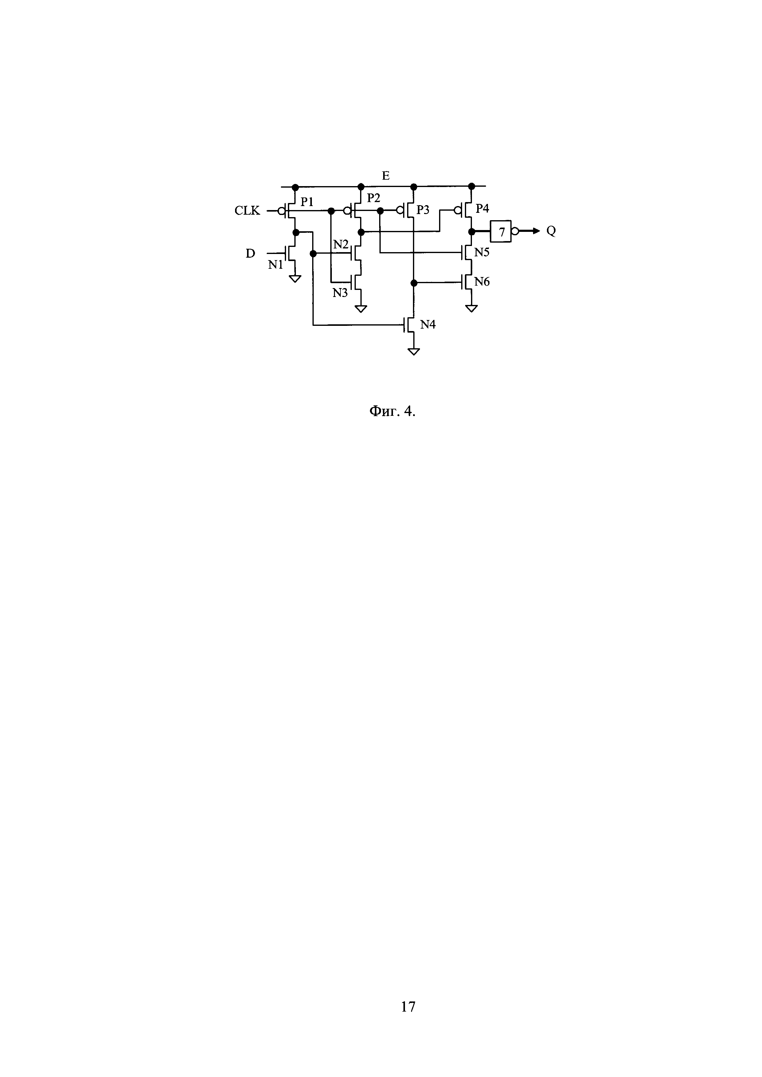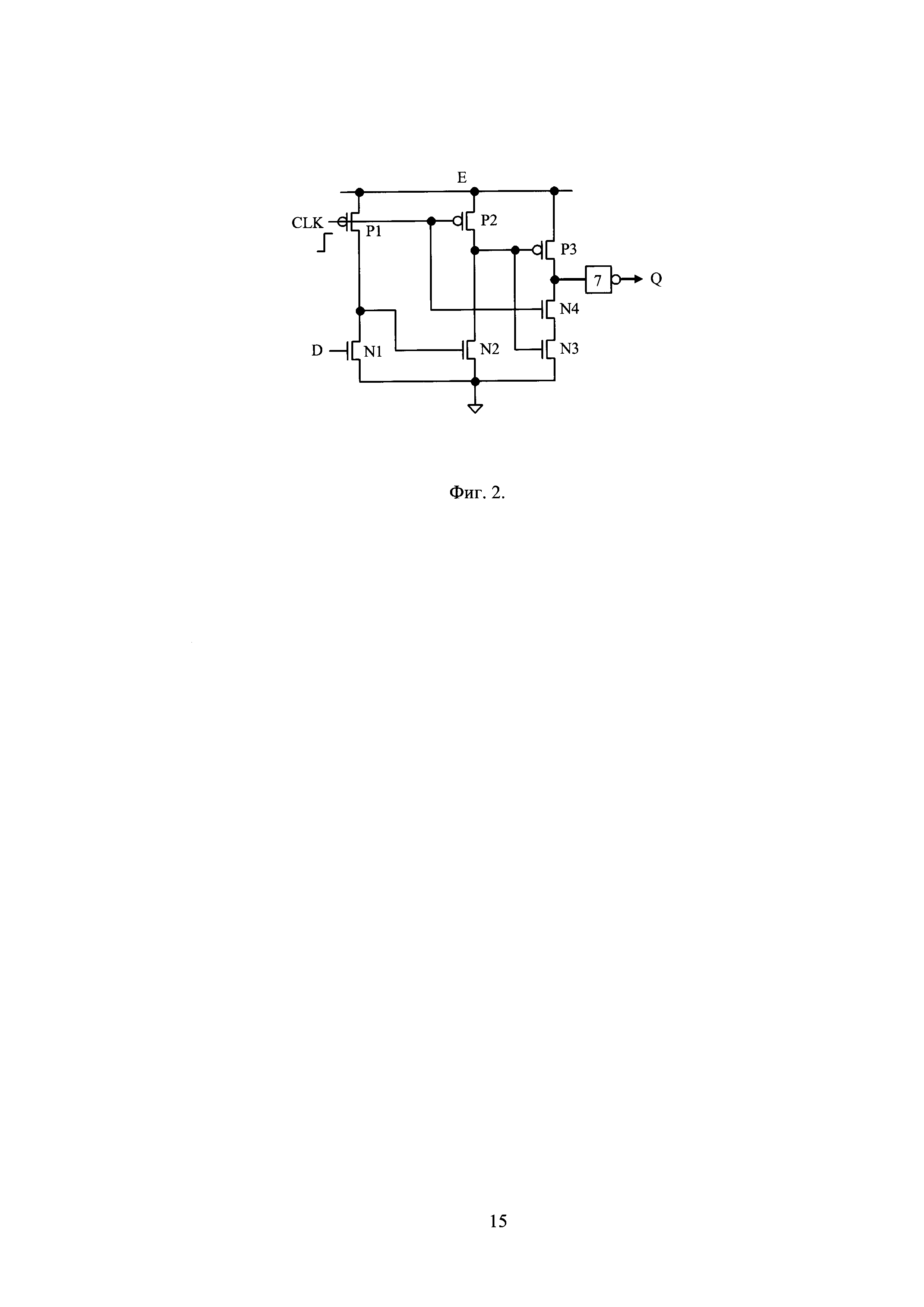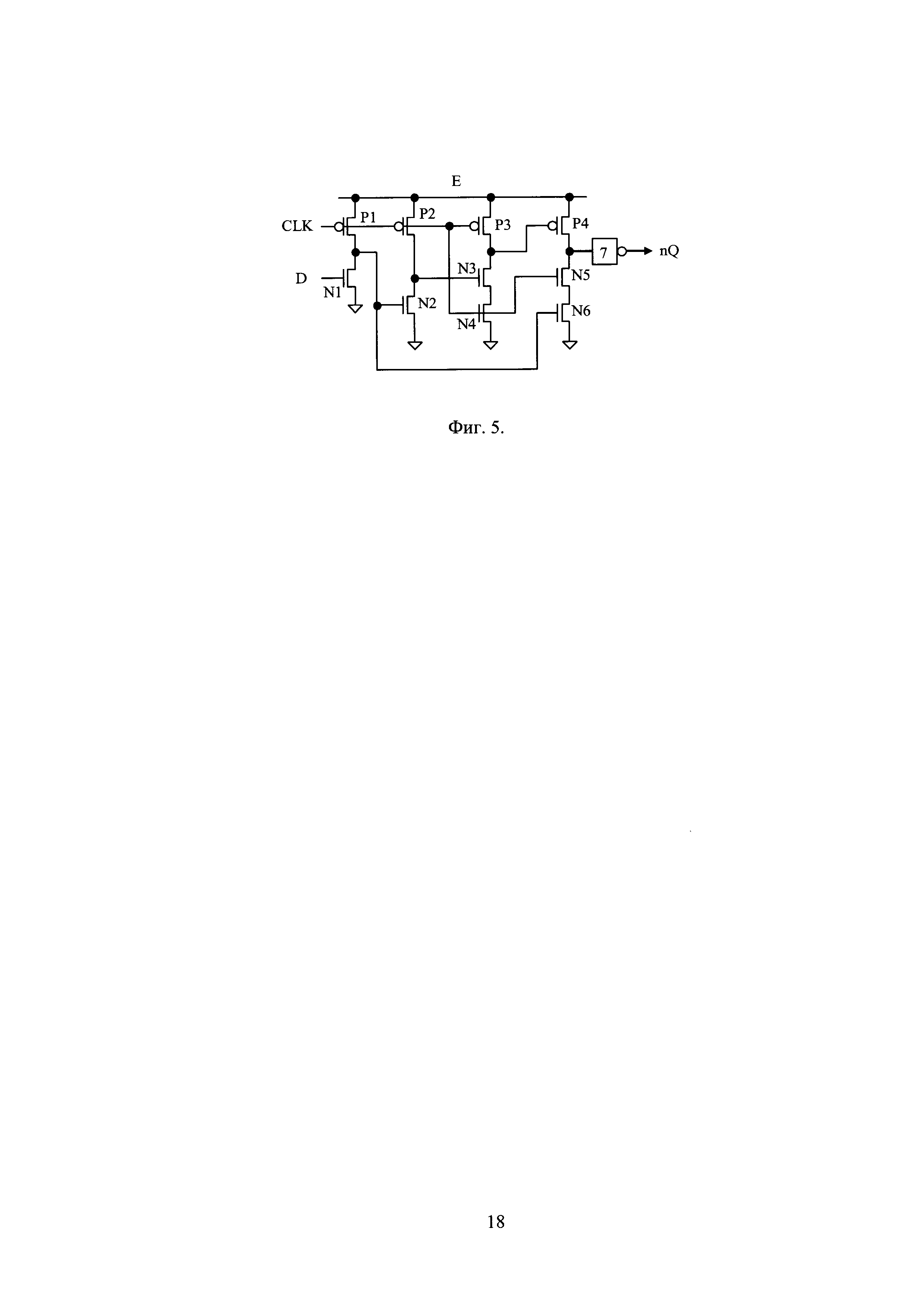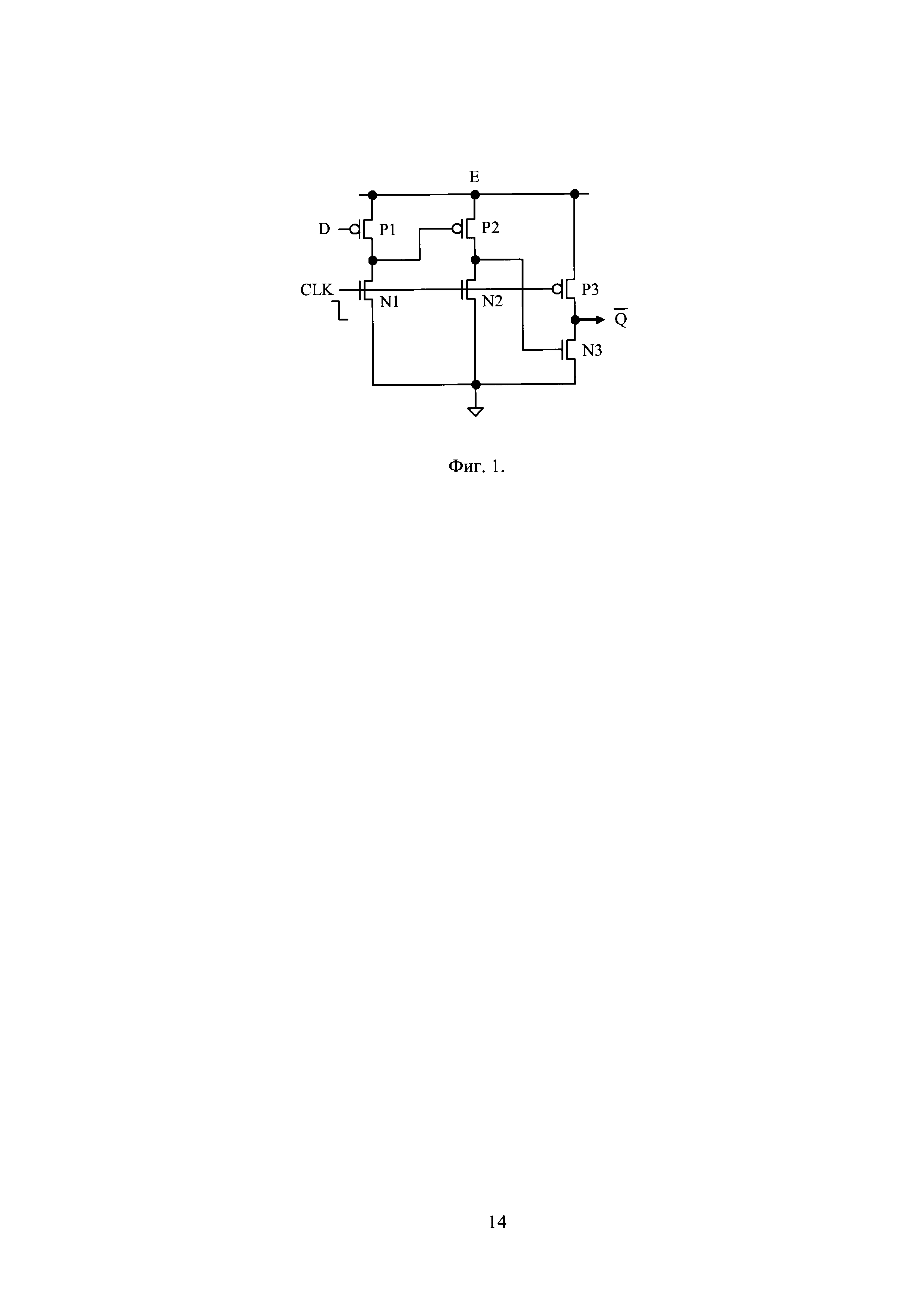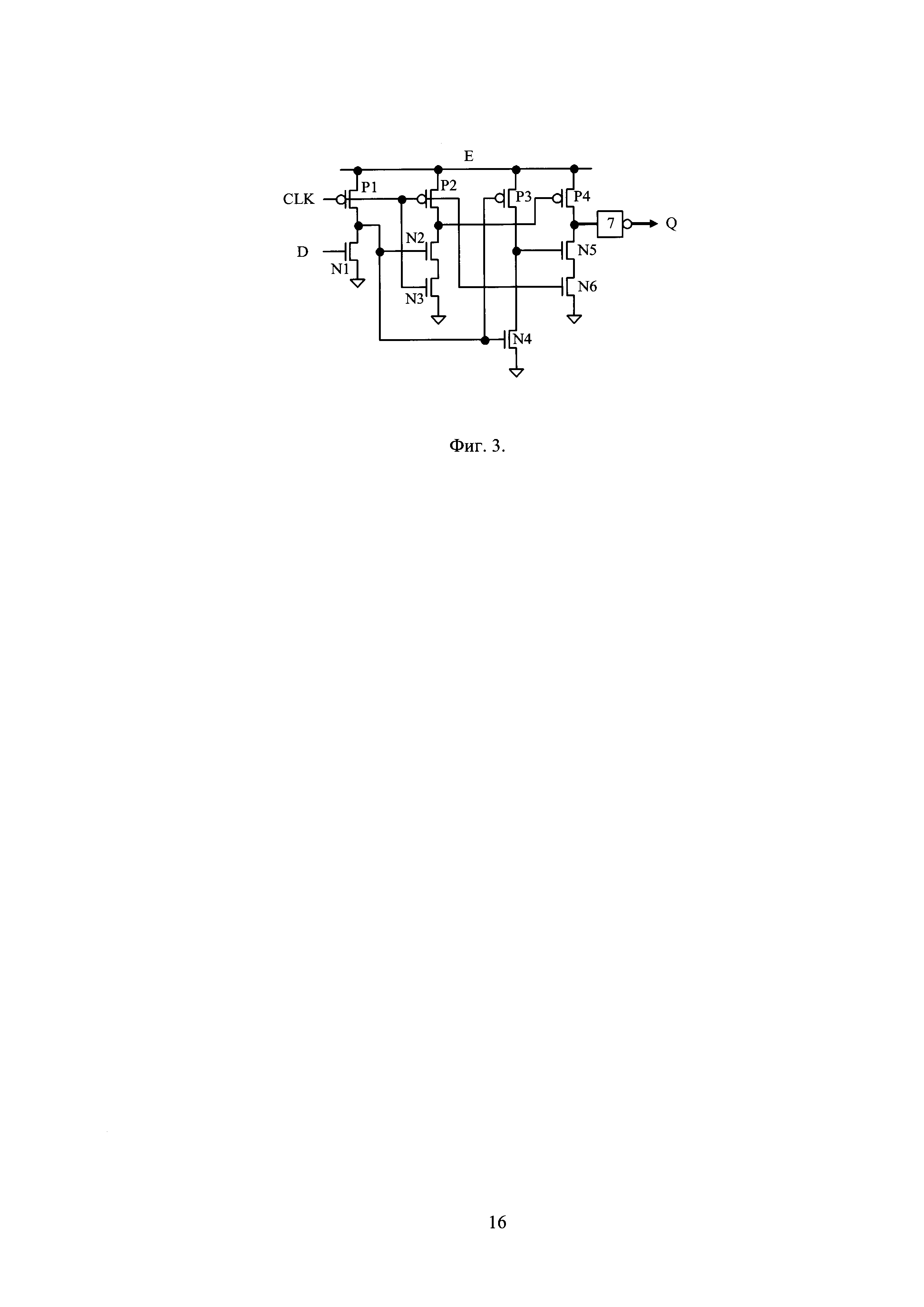 Изобретение относится к области цифровой микроэлектроники, а именно к динамическим D-триггерам, и предназначено для использования в качестве конструктивного элемента быстродействующих цифровых интегральных схем. Например, в качестве цифрового библиотечного элемента в системах автоматизированного проектирования аналого-цифровых устройств. Триггер синхронизируется тактовым сигналом CLK и выполняет автоматную функцию задержки на 1 такт: Qt+1=Dl, где D - информационный вход, Q - выход триггера. Входной D и выходной Q сигналы изменяются по положительному перепаду CLK. Высокие скоростные характеристики динамических триггеров обусловлены динамическим хранением информации на "паразитных" емкостях - в сочетании с каскадами "сквозного" тока (с "отношением крутизн"). Наличие нижней граничной частоты исключает применение динамического триггера в качестве элемента длительного хранения информации. Важными характеристиками для оценки конструкции динамического триггера являются его быстродействие и площадь на кристалле. Данные характеристики взаимно обратимы: при постоянной нагрузке увеличение площади способствует повышению быстродействия. Объективная информация для оценки содержится в принципиальной (электрической) схеме триггера. Стандартный интегральный КМОП транзистор с n-каналом характеризуется током, превышающим приблизительно в 3 раза ток p-канального КМОП транзистора равных размеров. Соответственно, для выравнивания времени разряда "паразитной" емкости через n-канал и времени заряда через p-канал в ключевой схеме требуется отношение размеров Wp/Wn≈3. Совокупная характеристика "быстродействие/площадь" существенно ухудшается в зарядной цепи с последовательно соединенными p-канальными транзисторами. Для поддержания нагрузочной способности (быстродействия) двухтранзисторной последовательной цепи требуется вдвое увеличить размер каждого транзистора, и т.п. Площадь такой p-канальной конструкции равна площади двенадцати одиночных n-канальных транзисторов. Пропорциональное увеличение нагрузочной емкости попутно снижает динамику n-канальной цепи разряда. Для ключевых каскадов с "отношением крутизн" характерны статические состояния со "сквозным" током: одновременно открыты зарядная (p) и разрядная (n) цепи. Логическое значение выхода зависит от доминации: 0 - доминирует n-канал, 1 - доминирует p-канал (отклонение логических уровней не превышает порогового напряжения транзистора). Для доминации n-канала достаточно равных размеров пир транзисторов: эквивалентный ток разряда равен 2/3 тока In (n-канал). Аналогичная доминация p-канала требует Wp/Wn«9, что отрицательно сказывается на характеристиках "быстродействие/площадь". В общем случае "сквозной" ток (в том числе динамический) снижает быстродействие каскада. Каскад с раздельным управлением транзисторами n, p позволяет исключить сквозной ток, что обеспечивает максимальное быстродействие ключа и преимущество даже перед обычным инвертором. Зарядно-разрядное время в отдельных каскадах триггера ограничивается длительностью полутакта (логические CLK=0 или CLK=1). В существующих конструкциях имеются каскады, требующие переключения на интервале задержки входного перепада D относительно CLK, что может быть значительно меньше полутакта и критически отражается на быстродействии. Указанные осо
