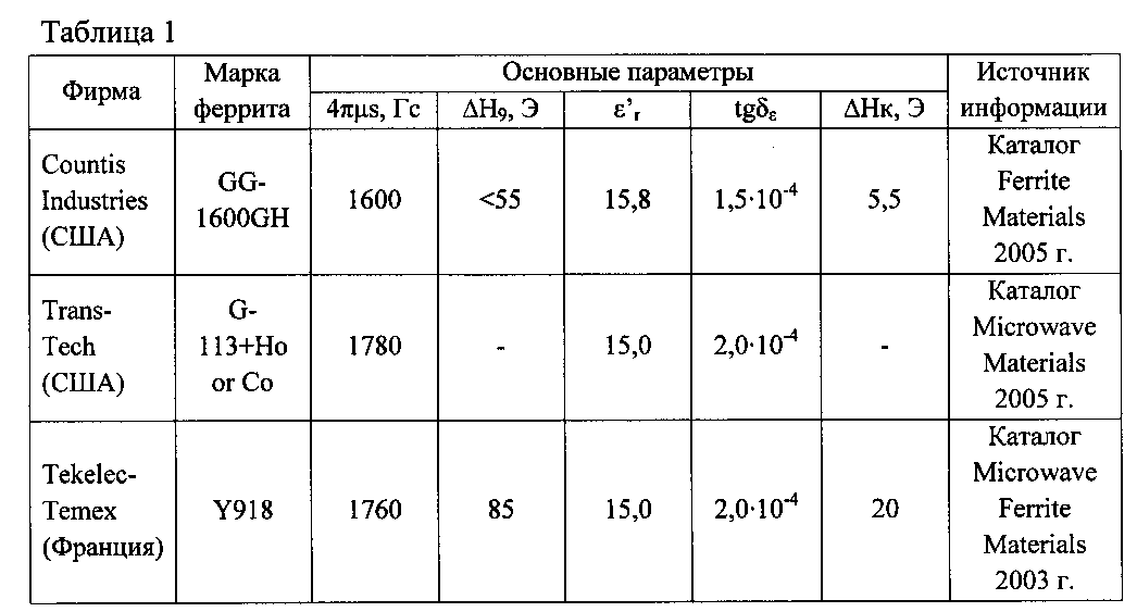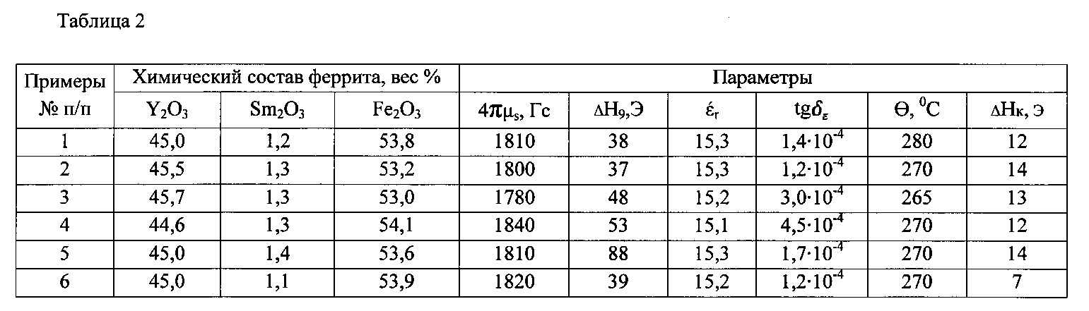 Ферритовый материал с большой величиной линии спиновых волн, содержащий в качестве базового состава оксиды иттрия, железа, отличающийся тем, что он дополнительно содержит оксид самария при следующем соотношении компонентов, вес. %:оксид иттрия (Y2O3) 45,0÷45,5 оксид самария (Sm2O3) 1,2÷1,3 оксид железа (Fe2O3) остальное