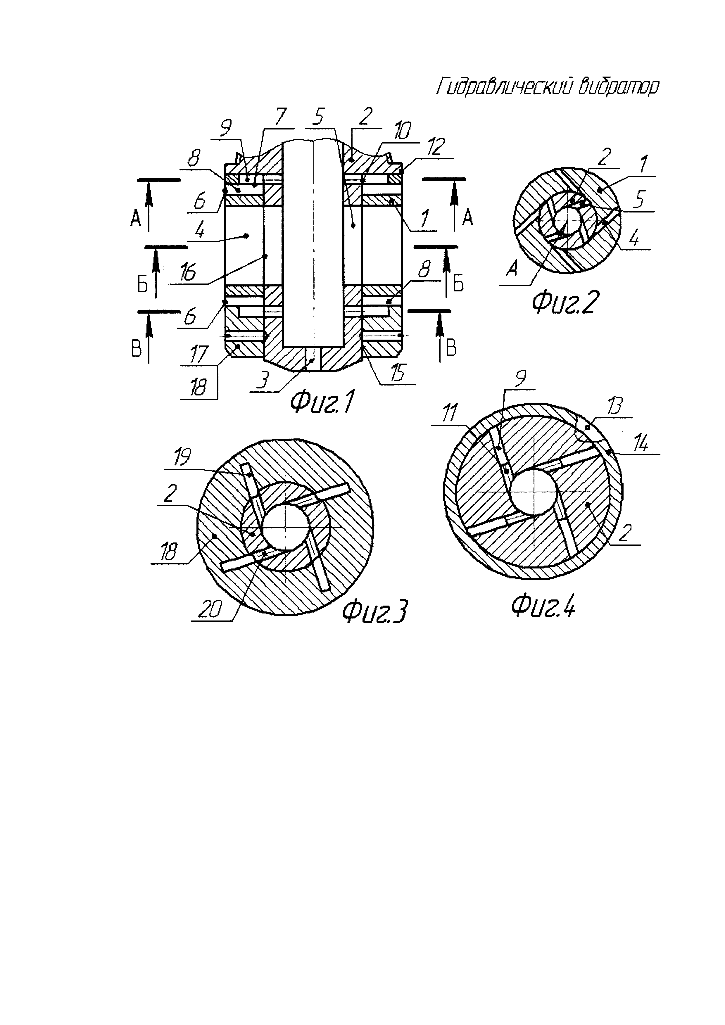 Гидравлический вибратор, содержащий золотник и ствол с донным отверстием, причем ствол и золотник выполнены с щелевыми прорезями, расположенными под углом к их образующей, причем щелевые прорези золотника расположены в противоположном направлении к щелевым прорезям ствола, отличающийся тем, что на обоих торцах золотника имеется цилиндрический выступ, наружная и внутренняя стенки которого примыкают к соответствующим стенкам золотника, при этом с открытых торцов каждого выступа напротив щелевых прорезей золотника выполнены канавки, причем с торца ствола, расположенного напротив верхнего выступа золотника, выполнены углубления, каждое из которых расположено напротив щелевых прорезей ствола и направление каждого из них совпадает с направлением этих прорезей ствола, причем с вертикально расположенной стенки каждого углубления ствола просверлено отверстие, причем с наружной боковой стенки ствола напротив углублений выполнена цилиндрическая расточка, снабженная кольцом, наружный диаметр которого выбран равным наружному диаметру золотника, а высота равна глубине углубления ствола, причем нижний конец ствола под золотником выполнен с наружной боковой цилиндрической стенкой, примыкающей к наружной стенке ствола, куда посажен золотник, причем на нижнем конце ствола имеется опора для золотника, выполненная в виде втулки, которая своим отверстием неподвижно с помощью стопорных винтов посажена на нижний конец ствола, причем с верхнего торца втулки напротив каждой щелевой прорези ствола выполнены углубления, расположенные по направлению щелевых прорезей ствола, причем каждое углубление втулки не доходит до наружной стенки втулки и открыто к внутренней стенке втулки, причем напротив каждого углубления втулки просверлено отверстие, расположенное по направлению углубления втулки, причем золотник между кольцом ствола и втулкой установлен в стволе с возможностью вращения.